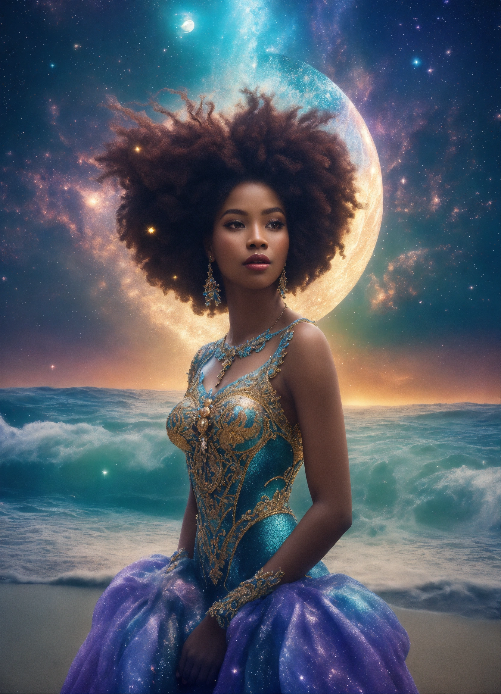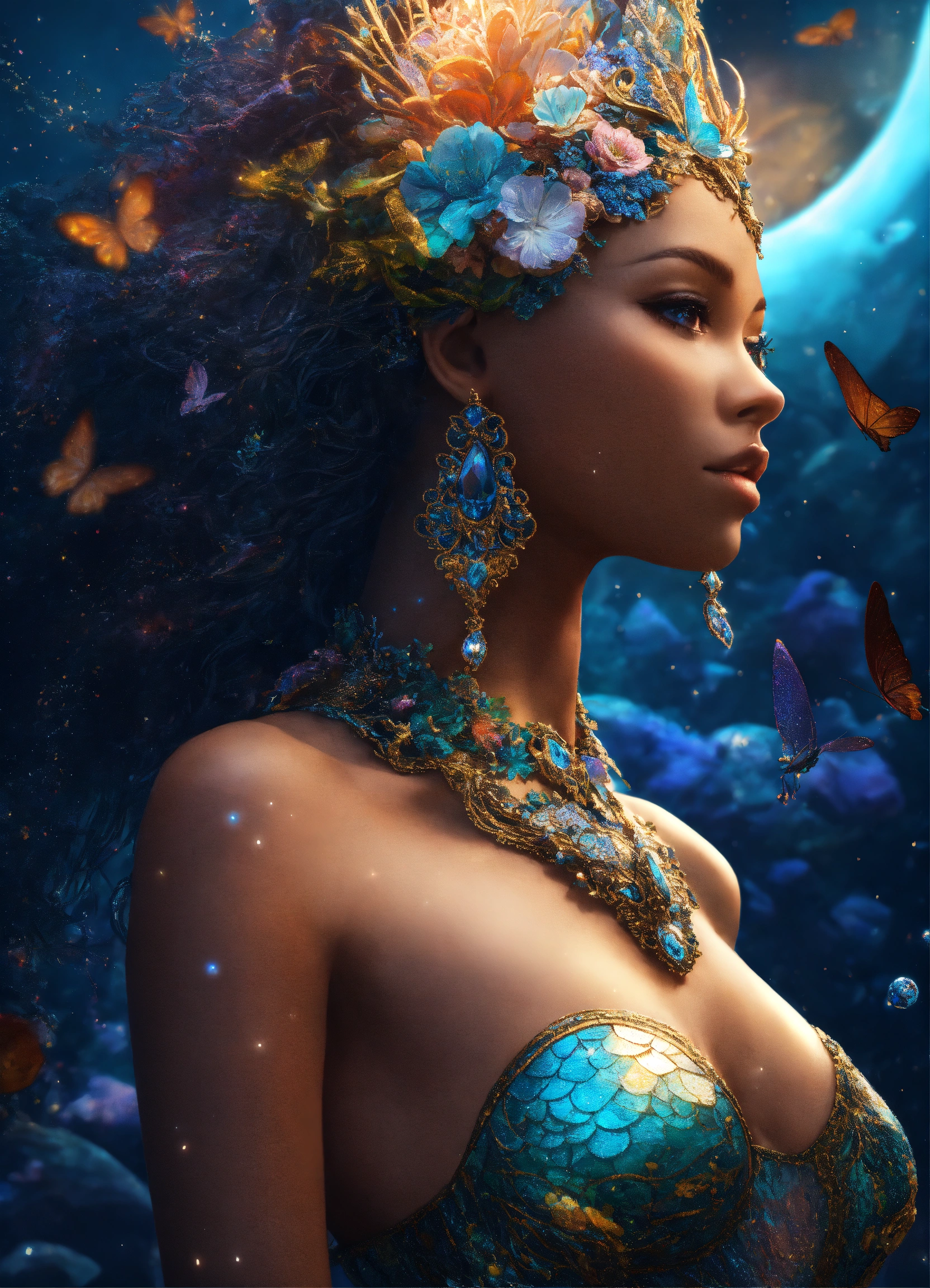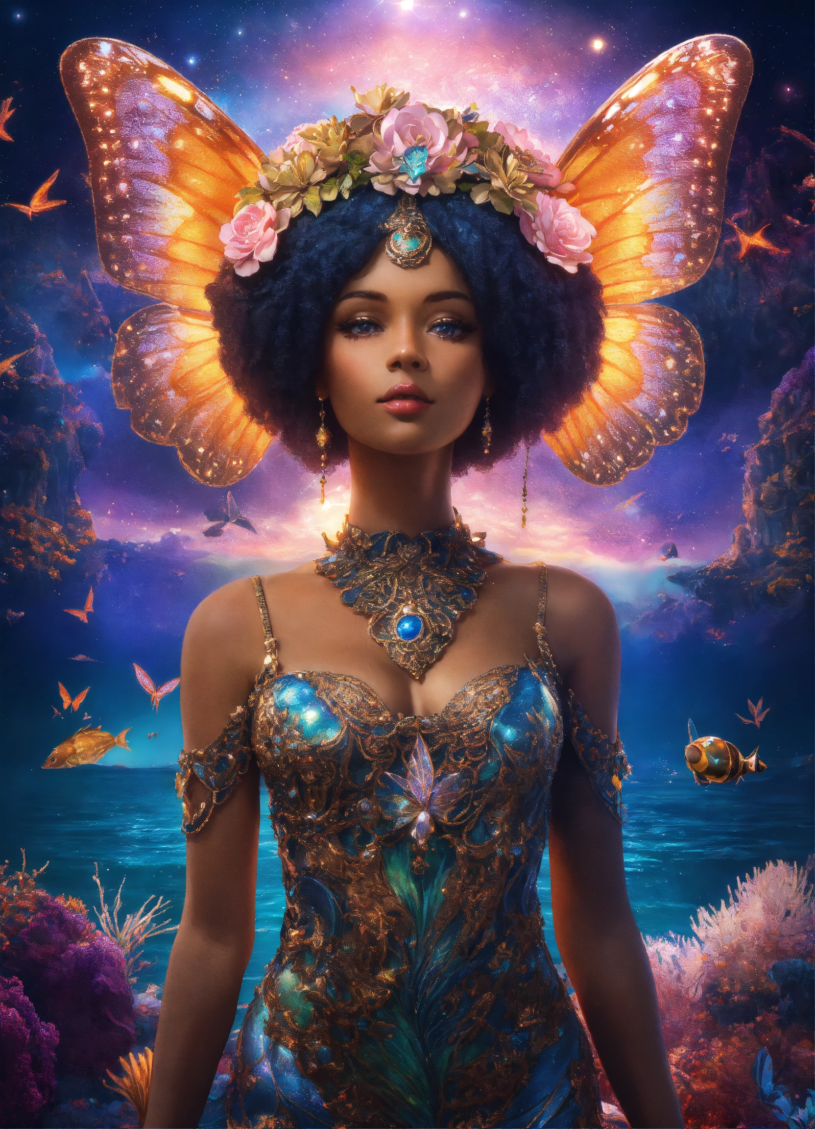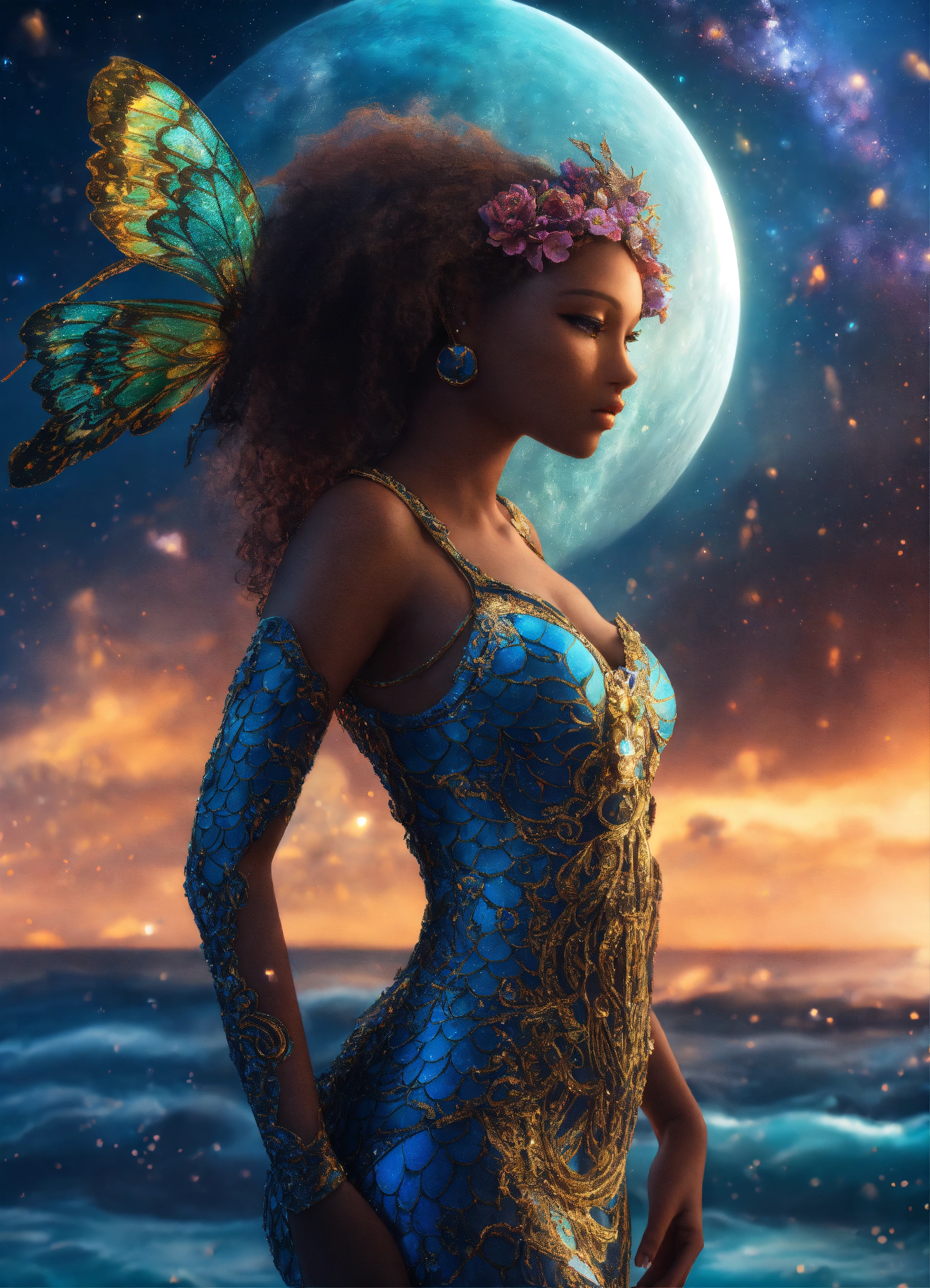 A 3d stunning interpretation full body shot rising up milky way, moody moonlight black woman mi mermaid mi faerie, queen of mermaid faerie butterfly, surreal, hyperdetailed, intricate details, shinning bright, extremely luminiscent, professional color grading, joy, innocence, fantasy, expressive, wings, beautifully ornate symmetrical face, perfect slender hand, enchanted fairytale milky way background, magical ocean, andromeda galaxy under the sea insanely detailed and intricate, spectacular, award-winning, insanely detailed and intricate ornate maximalist, full hd, 8k.n, eyecatching interpretation