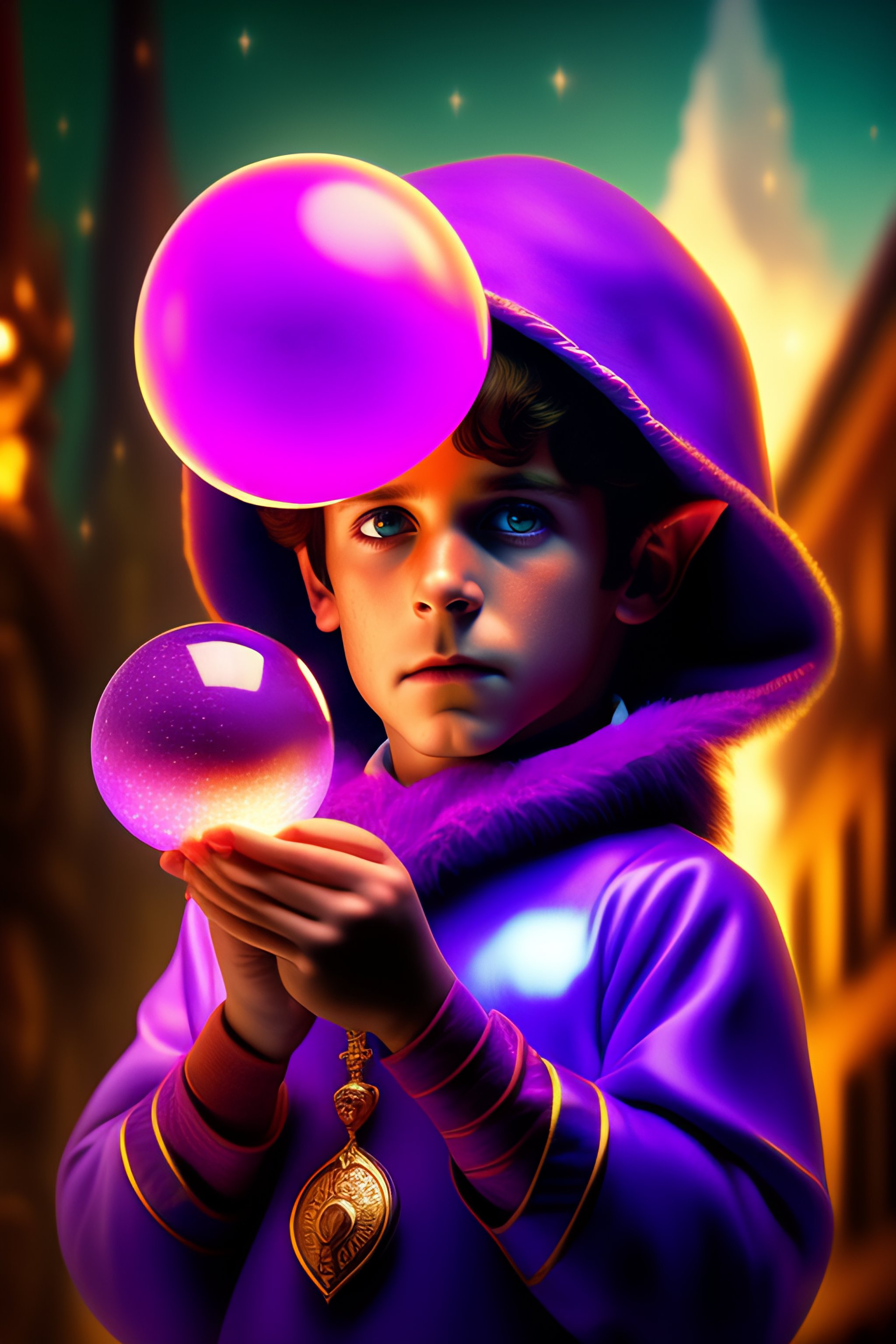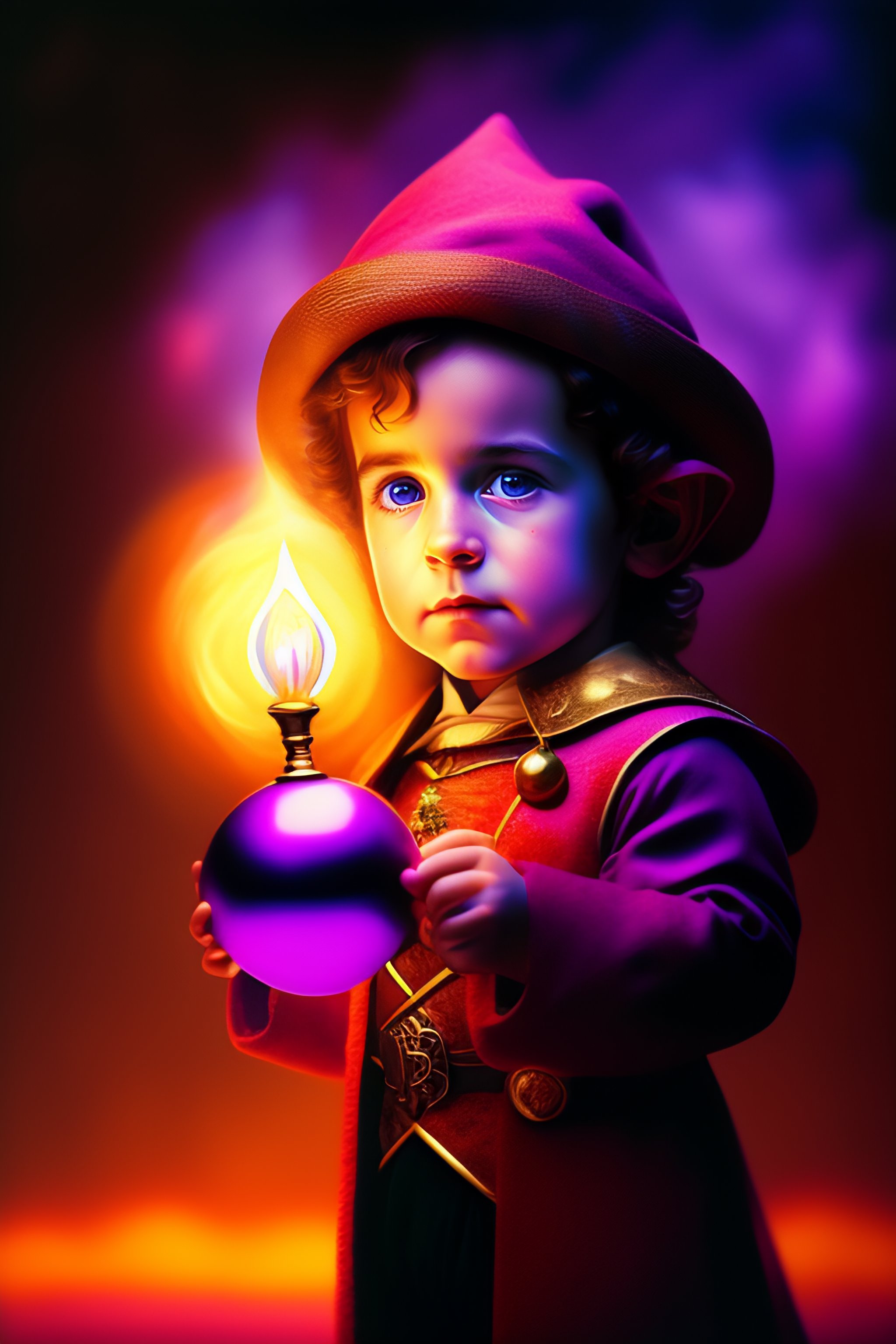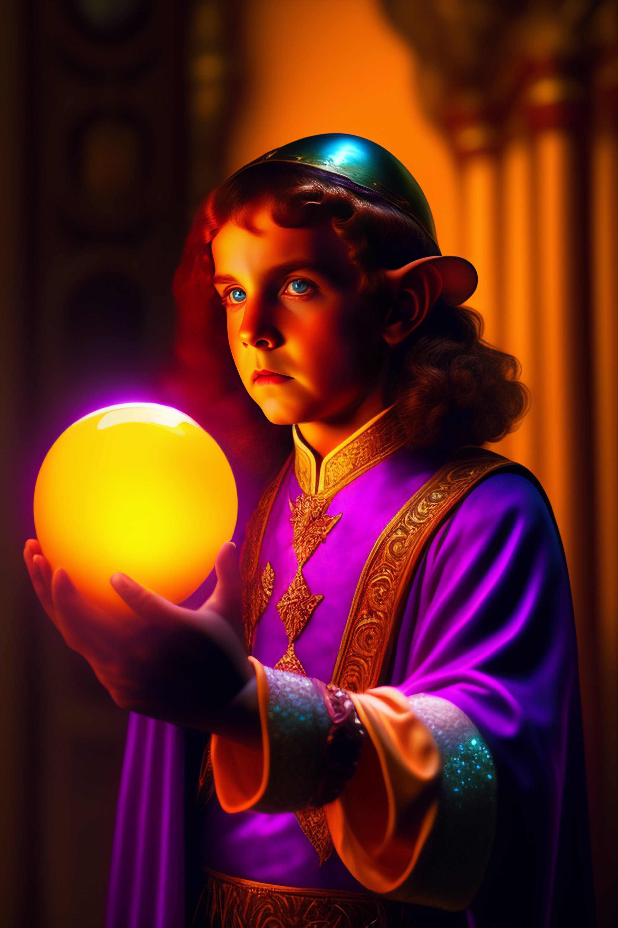 Noble elf, fantasy wizzard, holding a magic purple orb, evoking a demon, stanley kubrick the shinning, vibrant colors americana, cinematic, volumetric lighting, ultra wide angle view, realistic, detailed painting in the style of edward hopper and rene magritte