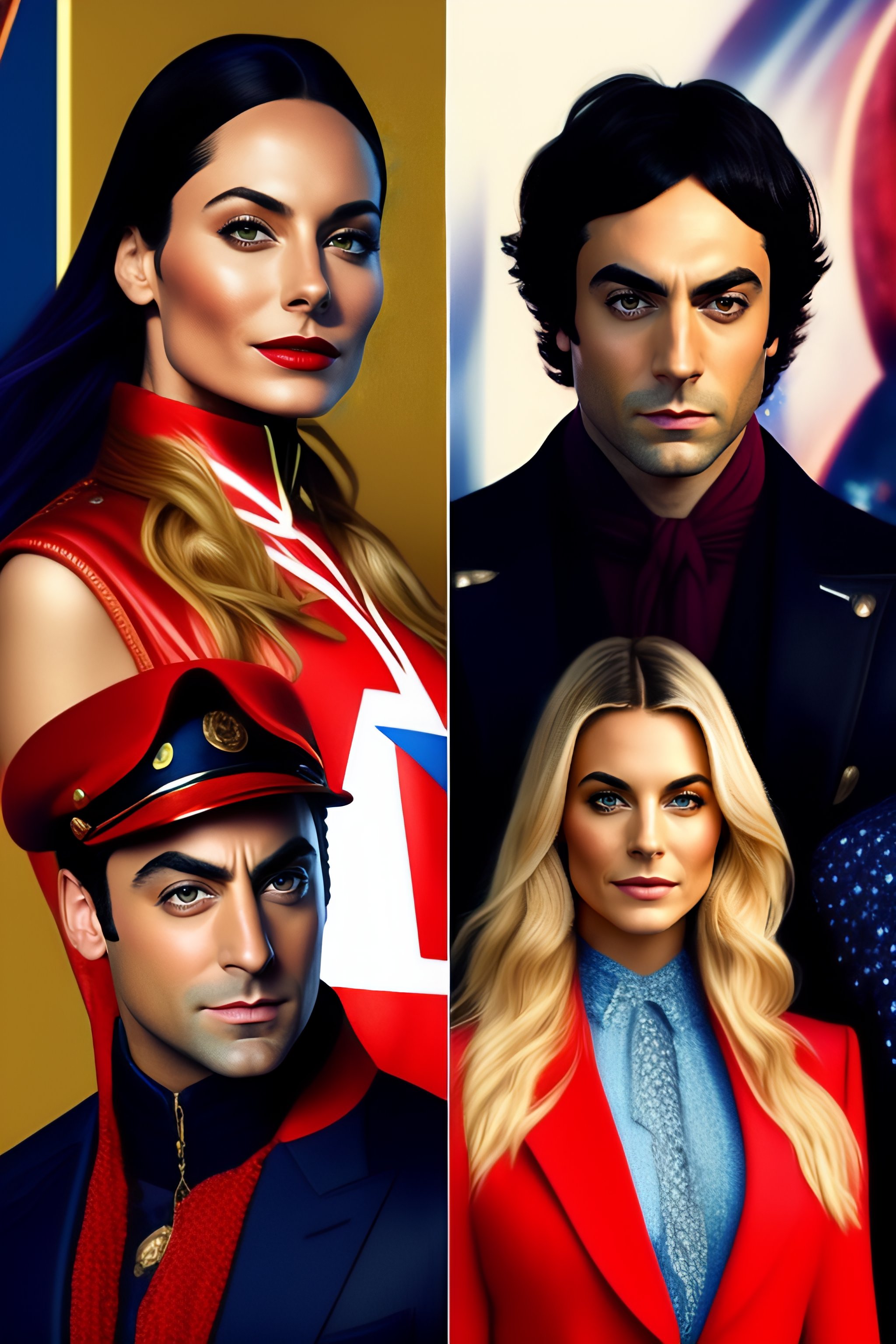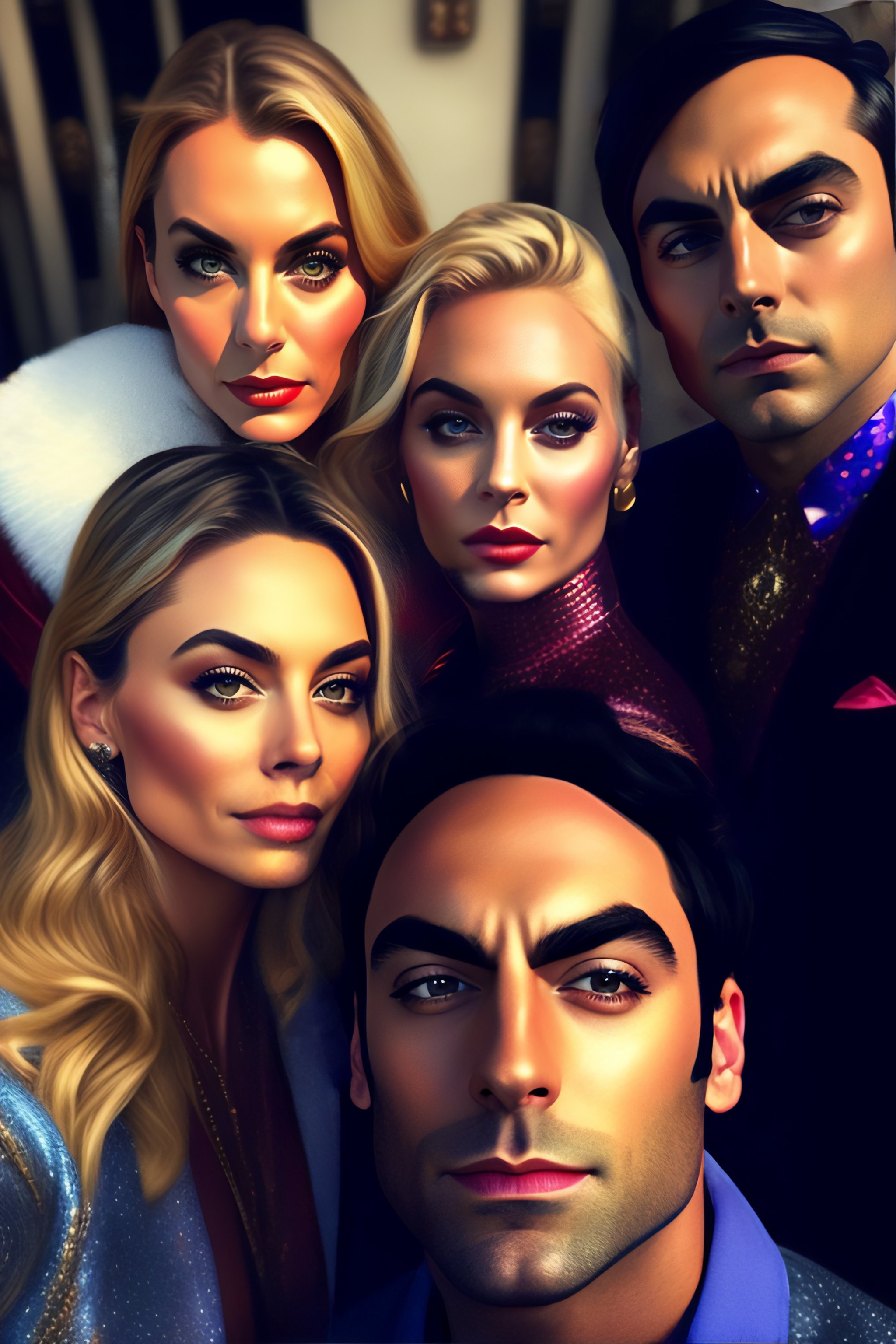Big bang theory cast as avengers, not a portrait, intricated details, street photo, high fashion, film, renoir, hobo style, vogue french, future, casual, jewelry, long hair, blond hair, low light, night, party, romance