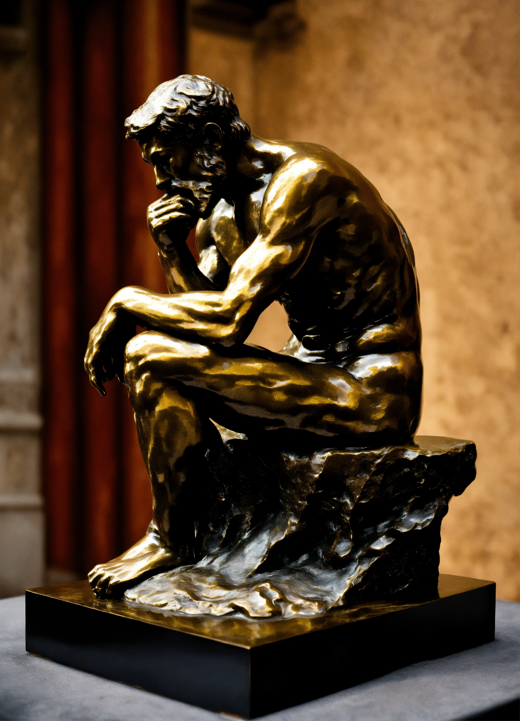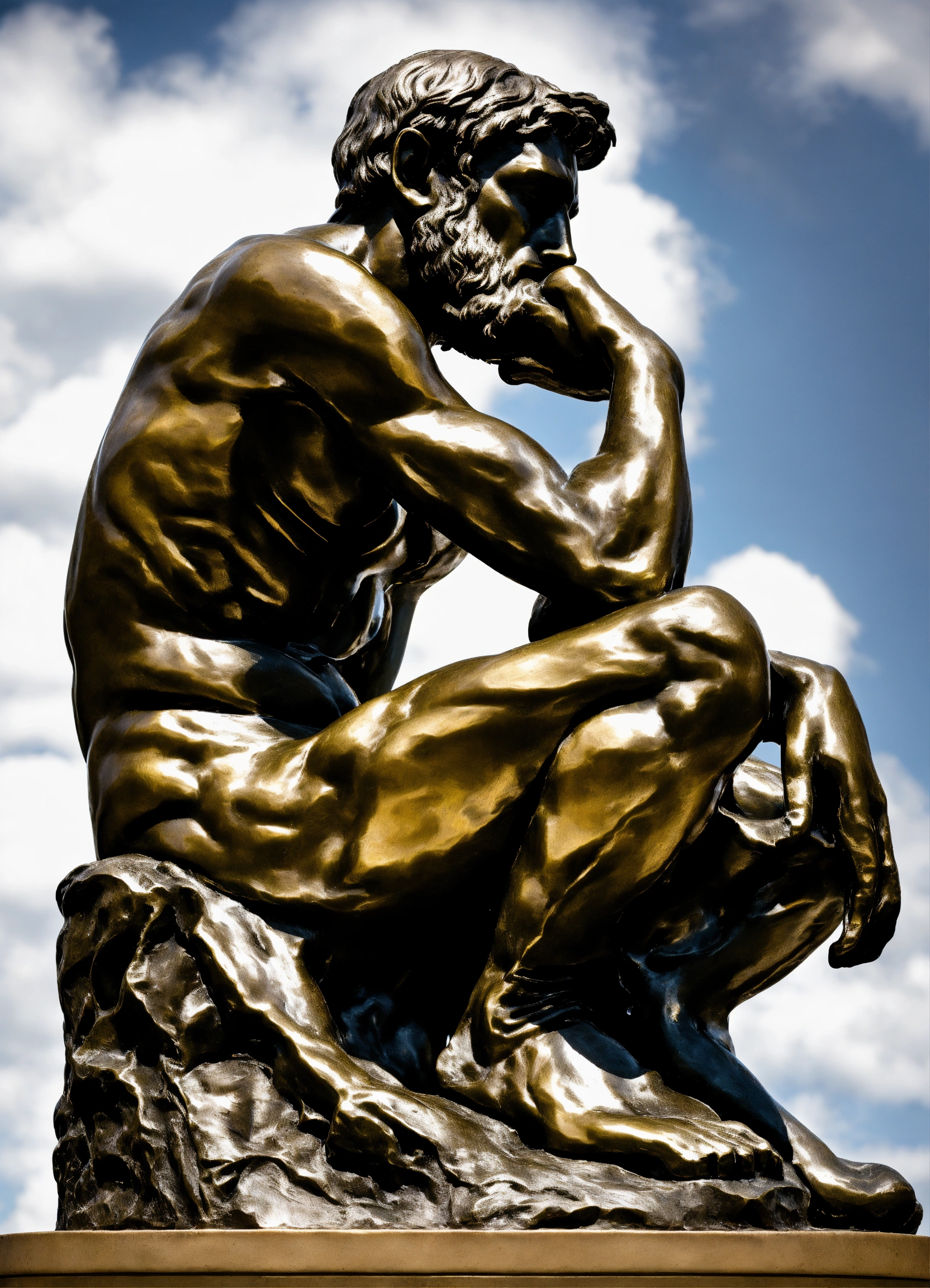 Sculpture of rodin's the thinker, and in other positions, in aged bronze on top of a base, ultra-mega-realistic in ultra-definition 32k photorealism.