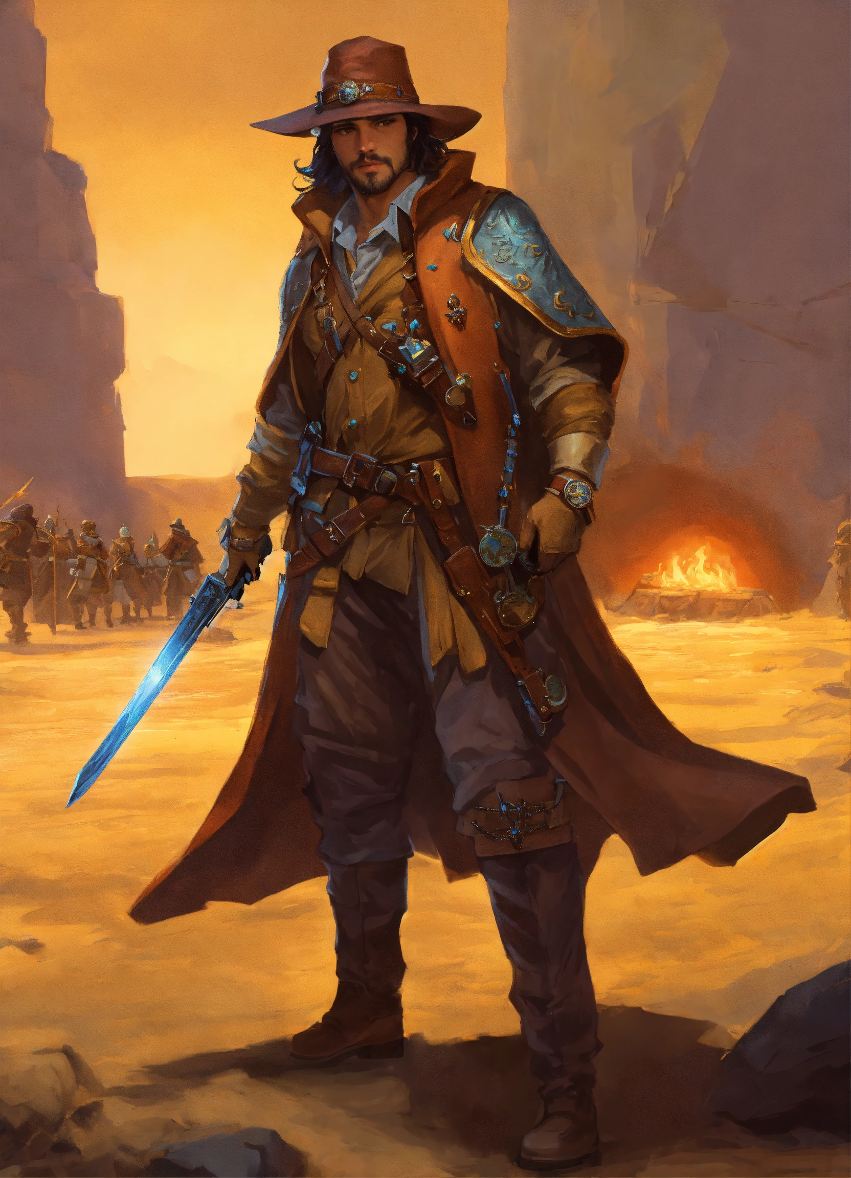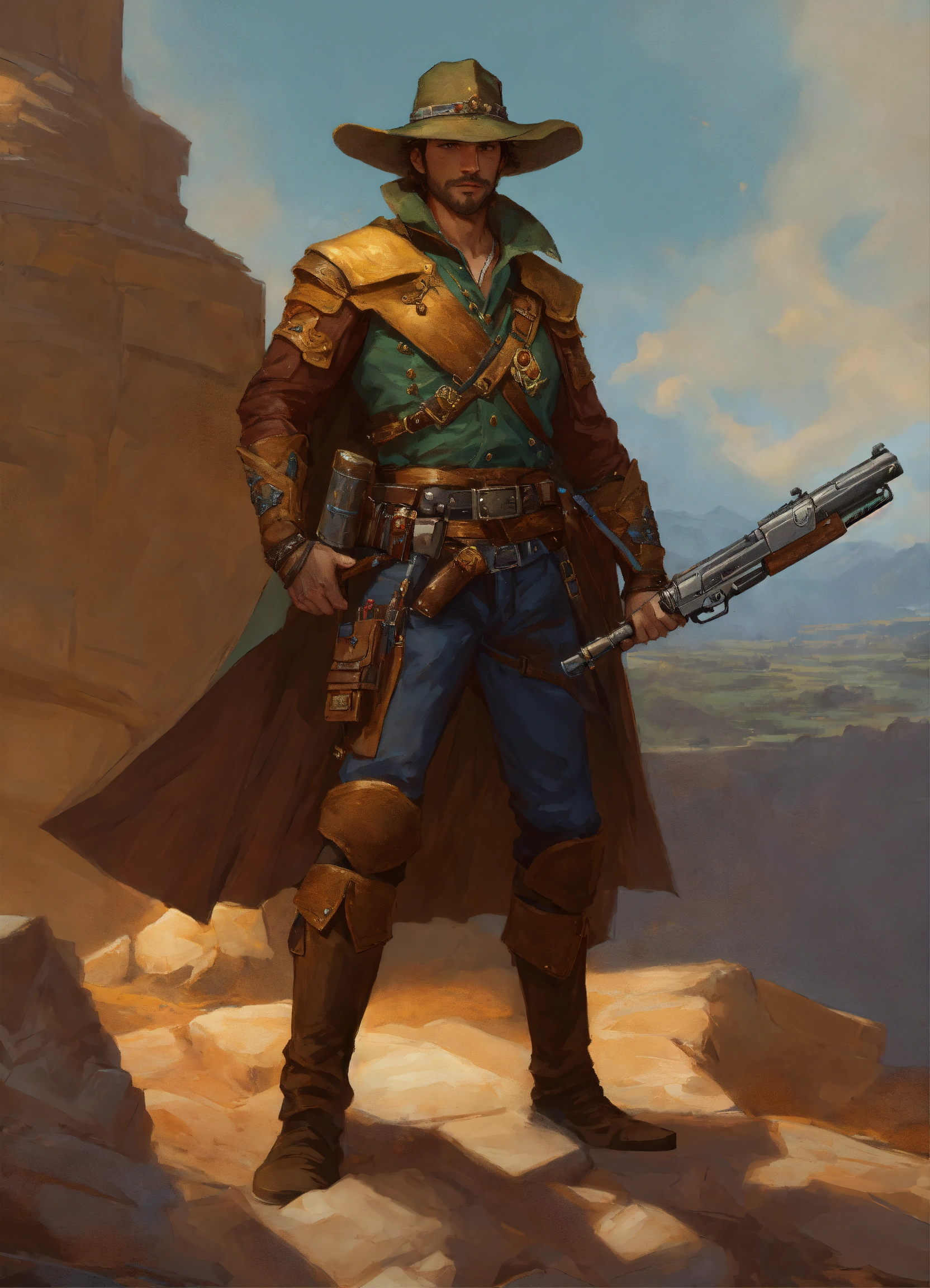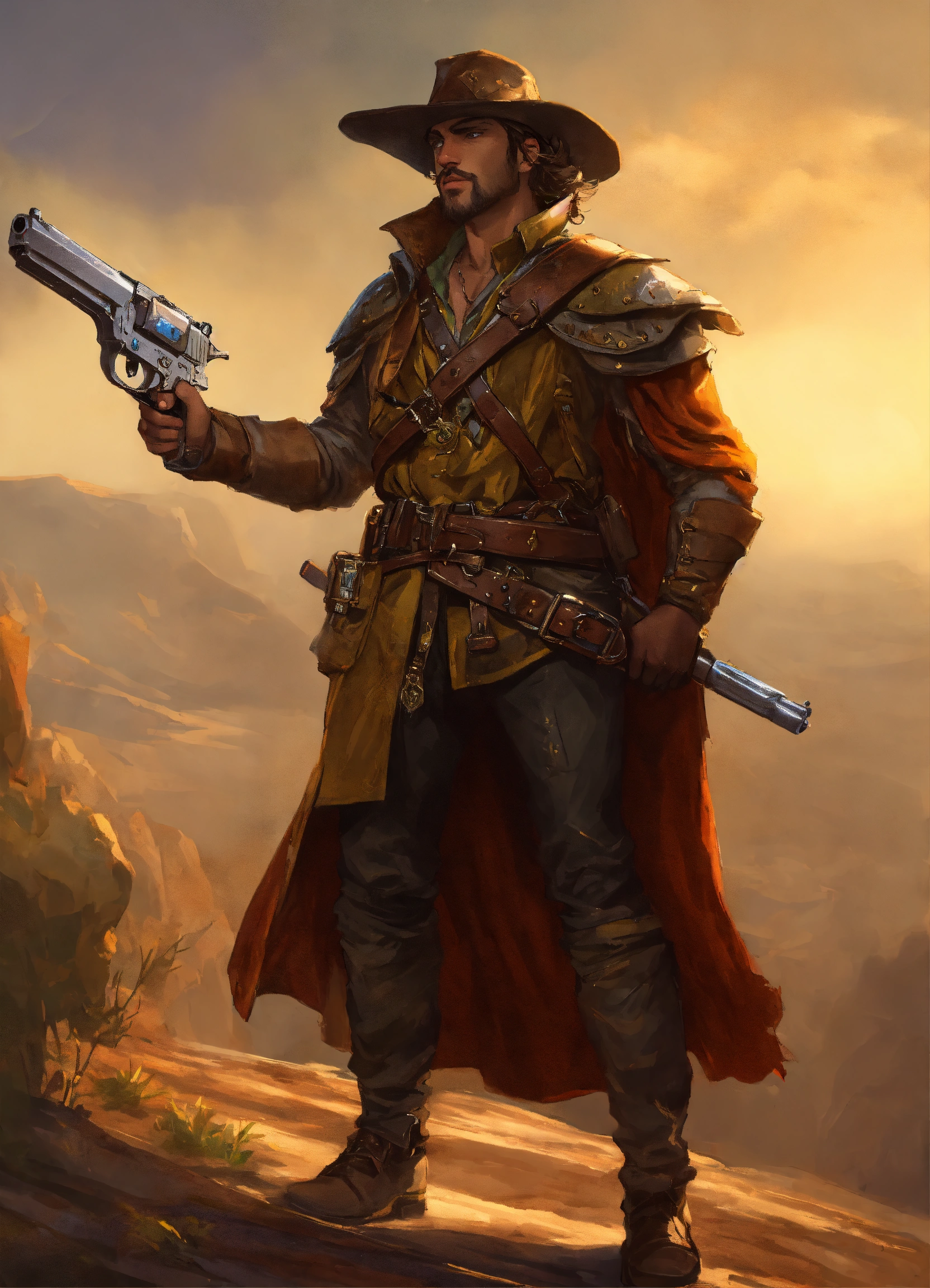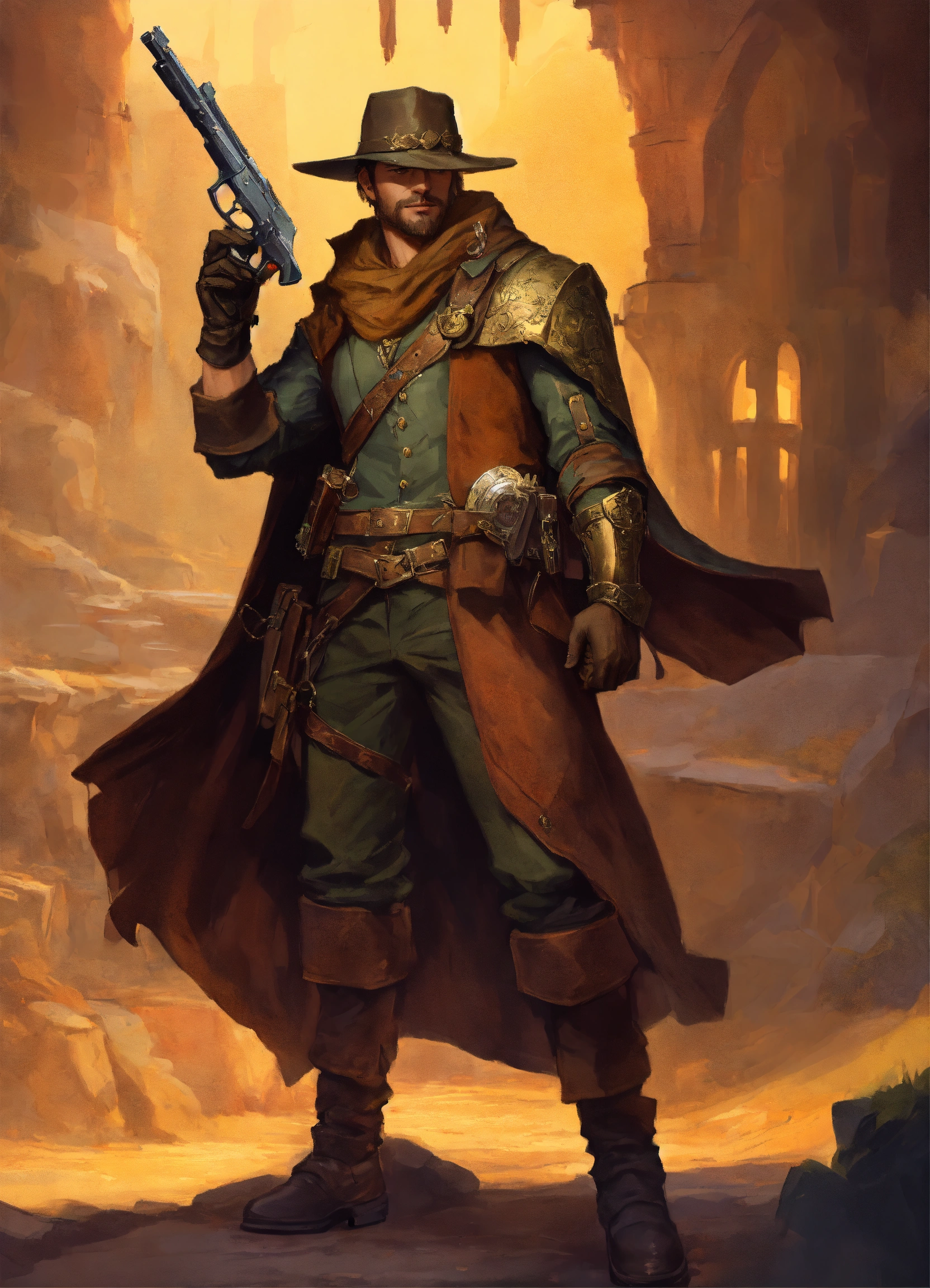 Male human bounty hunter treasure seeker, with a dueling pistol in his right hand, fantasy, fiction, d&d, renaissance era