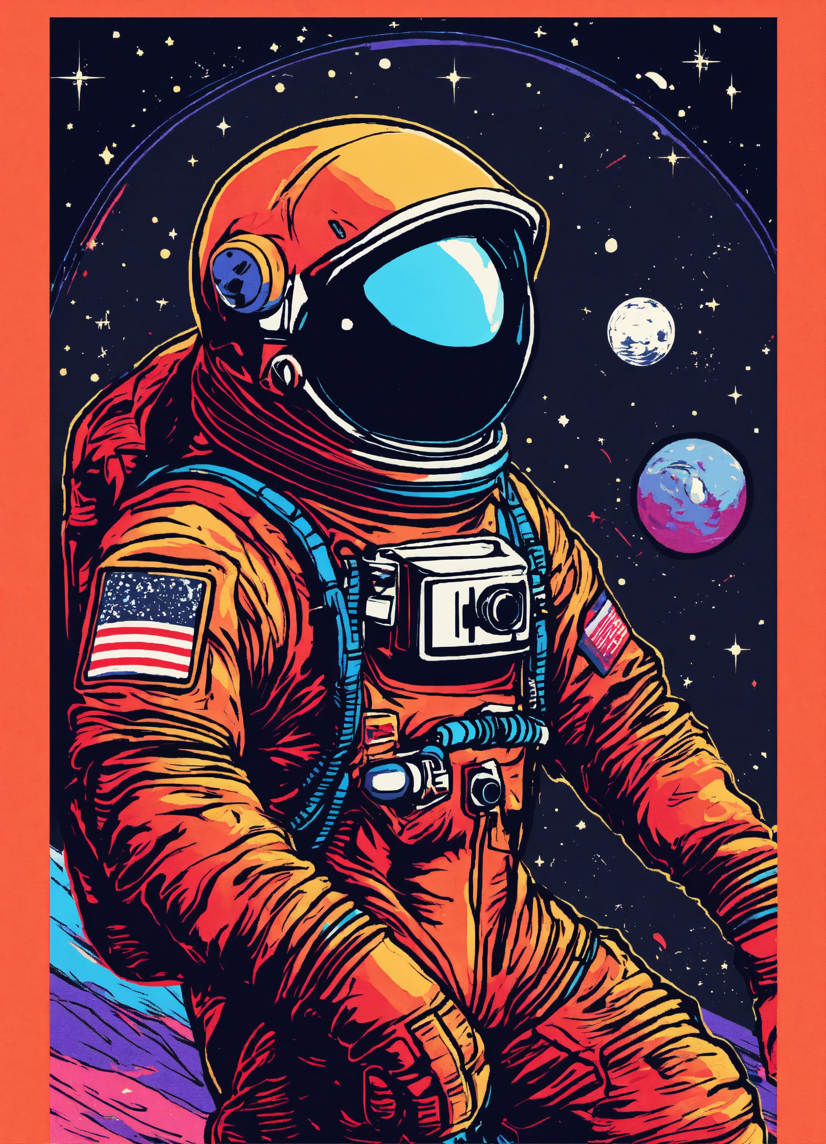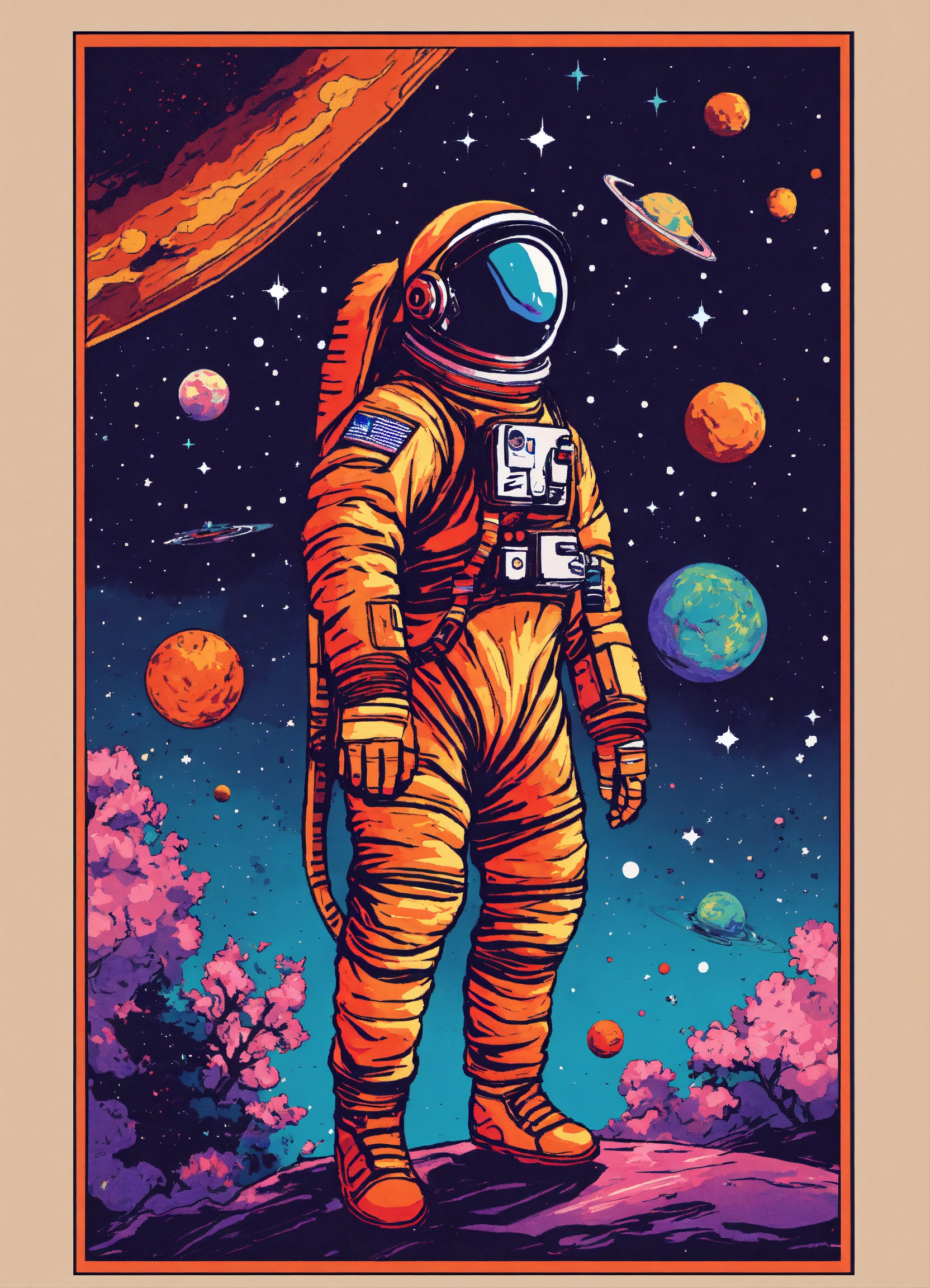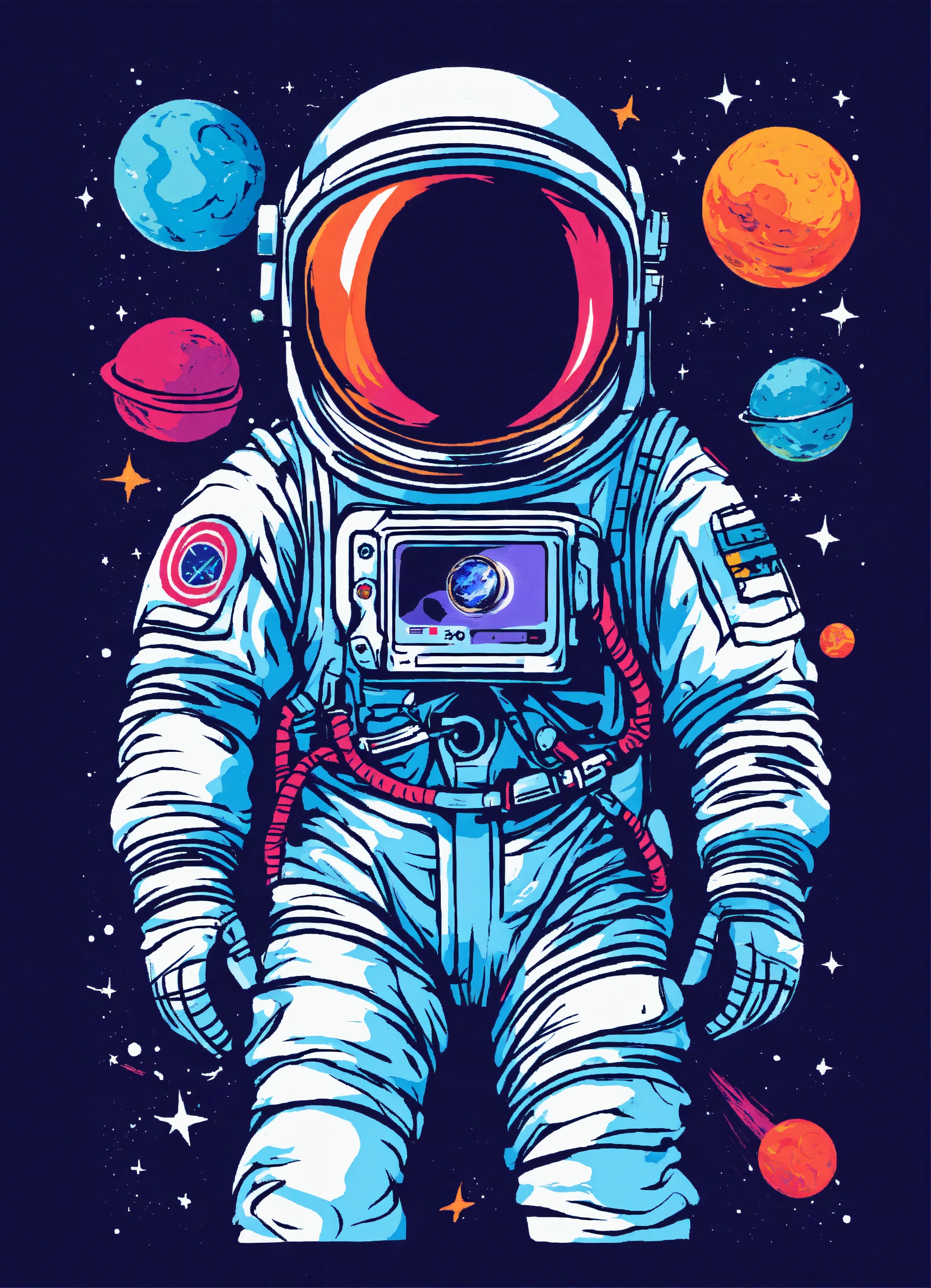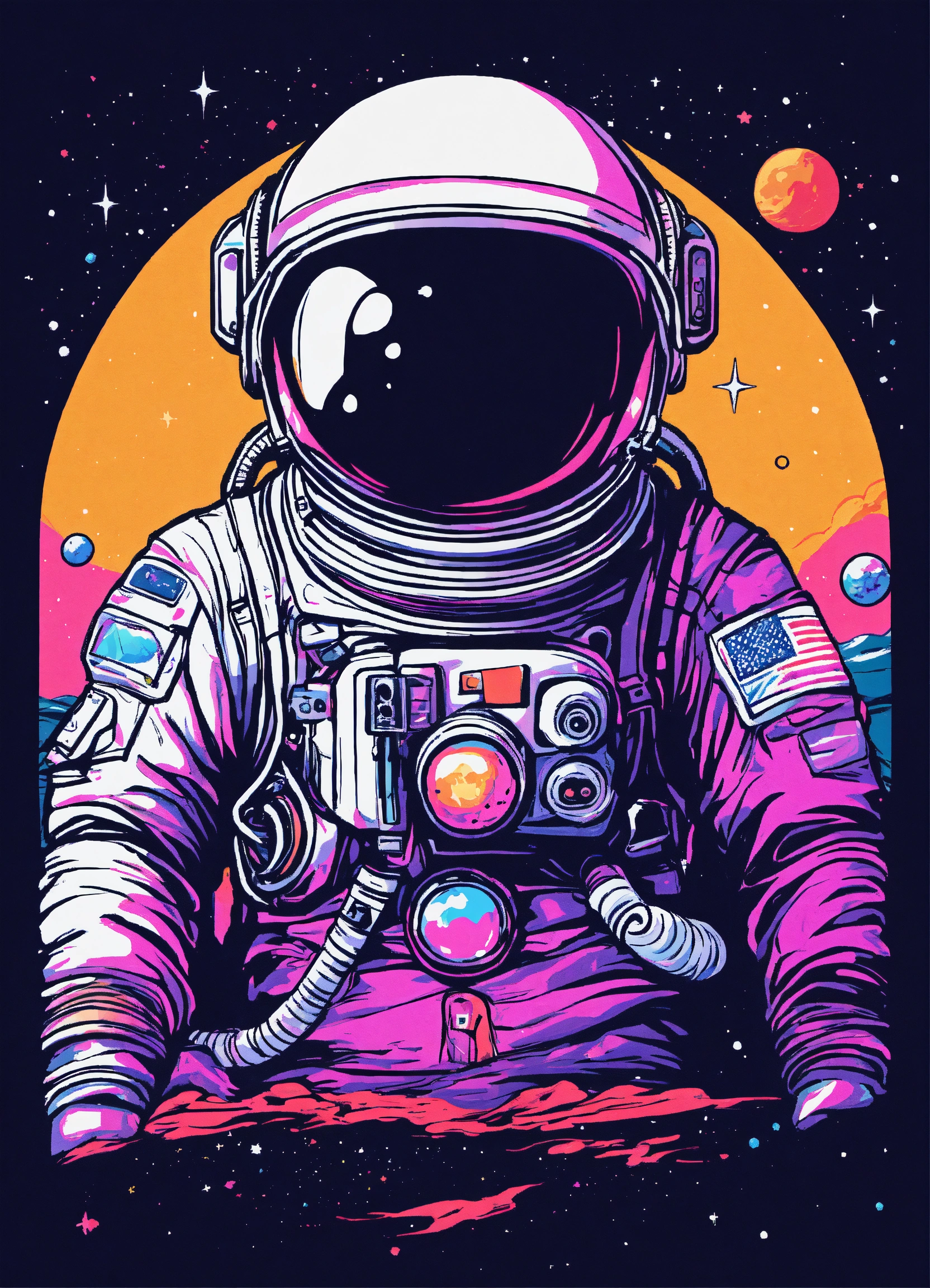 Very details astronaut lost in galaxy background, tshirt design, streetwear design, pro vector, japanese style, full design, 8 colors only, solid colors, no shadows, full design, bright colors, sticker, bright colors