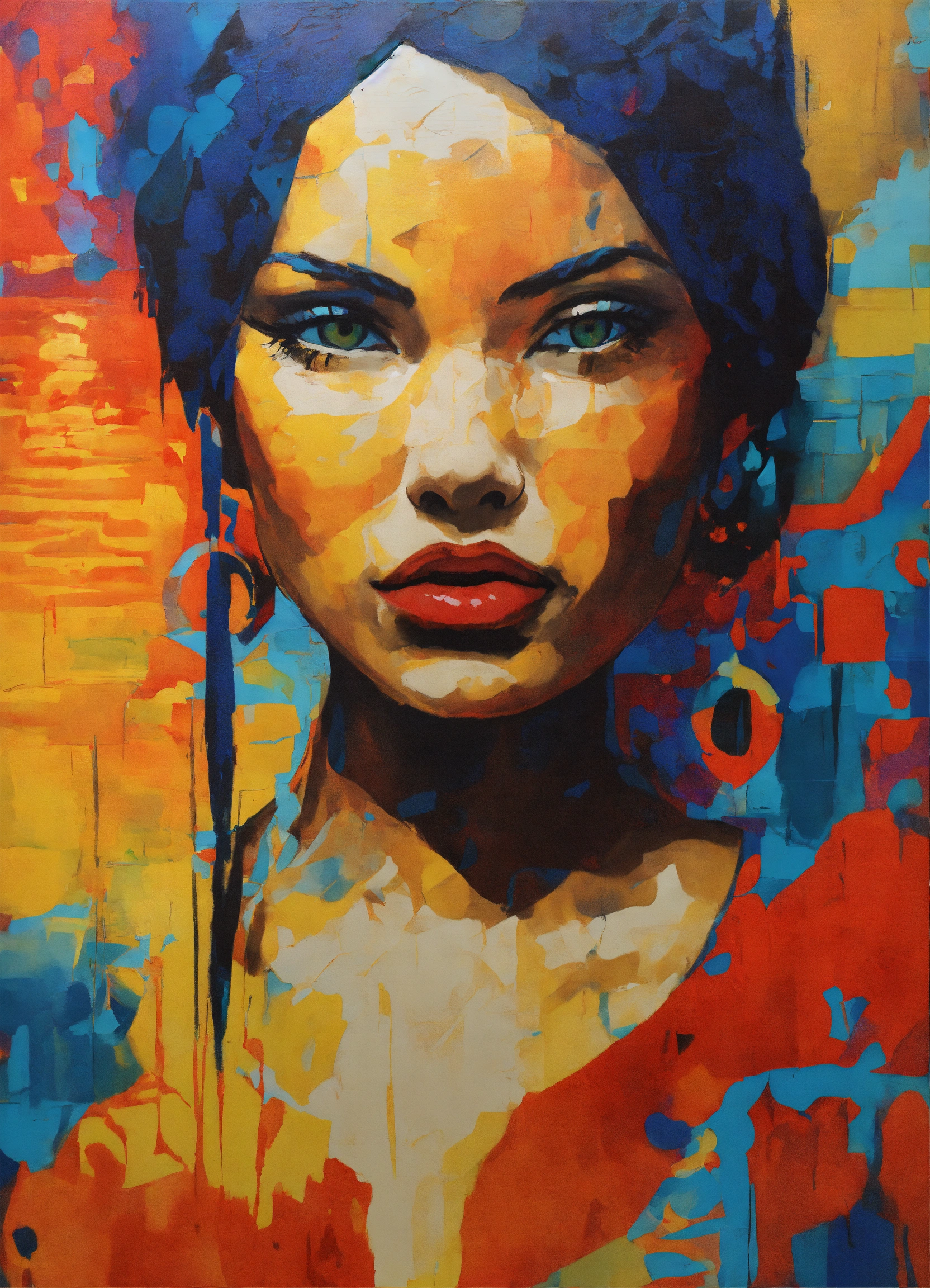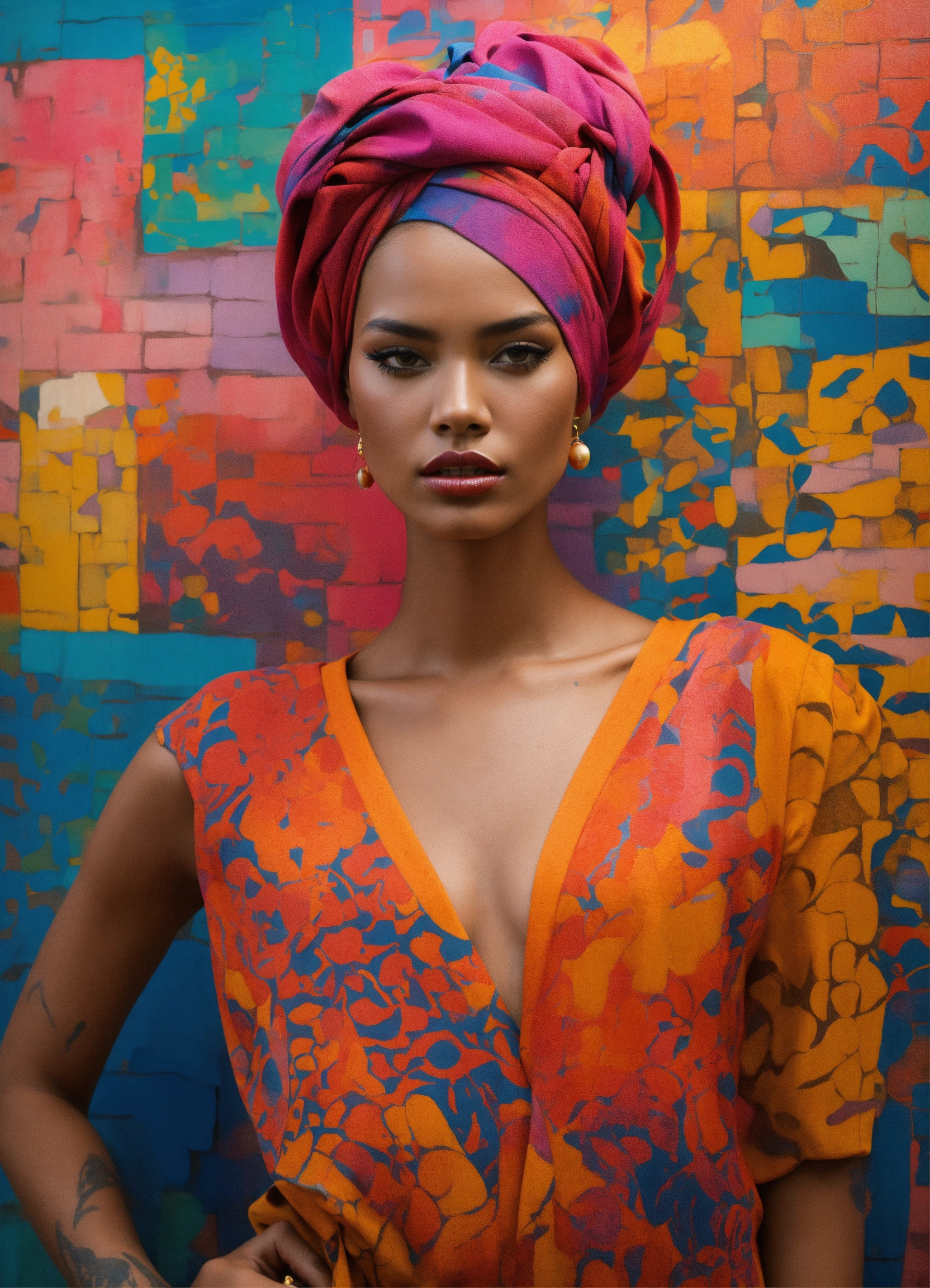 Abstract mural painting of a fierce model with woodblock print in vibrant colors