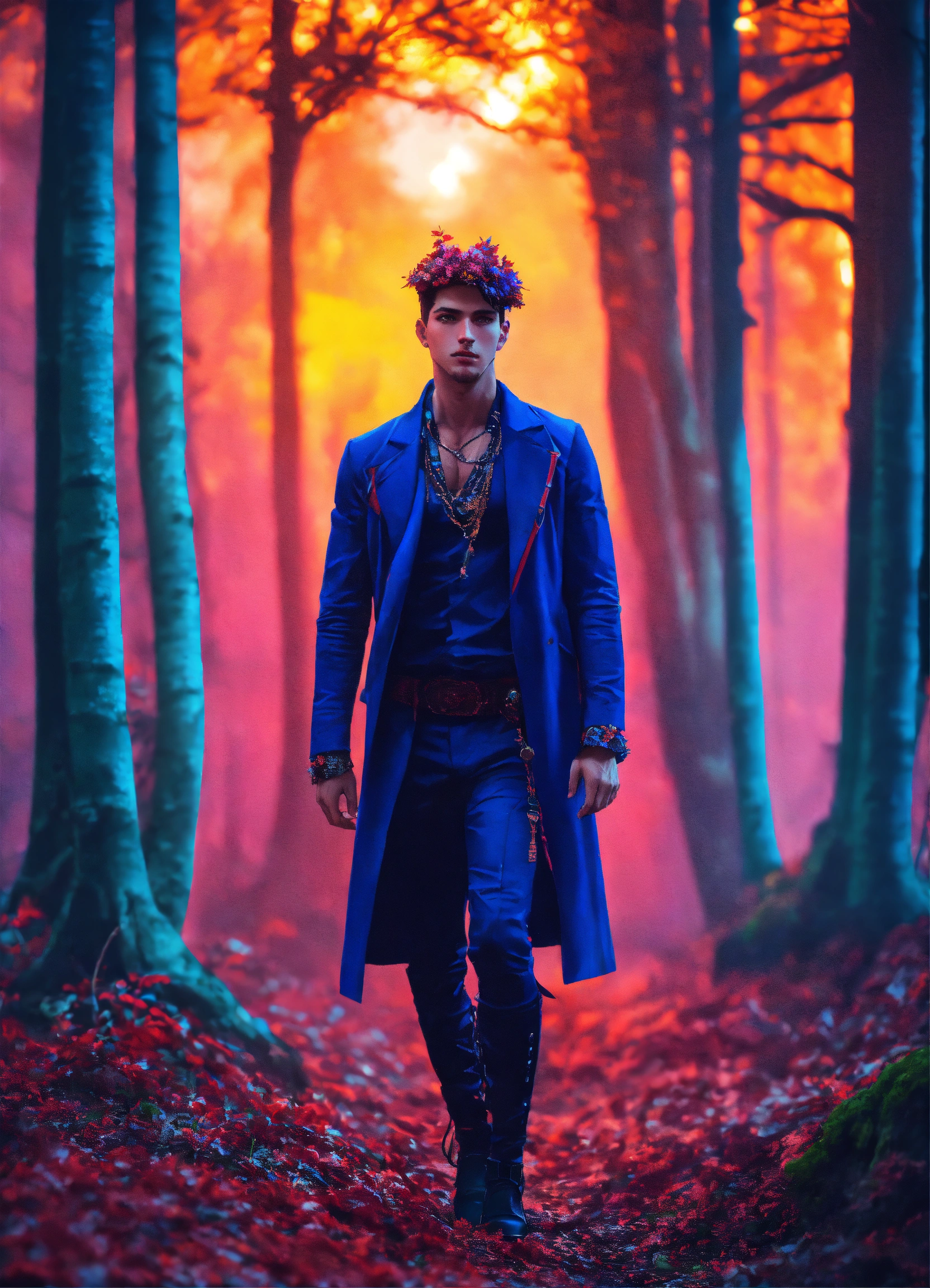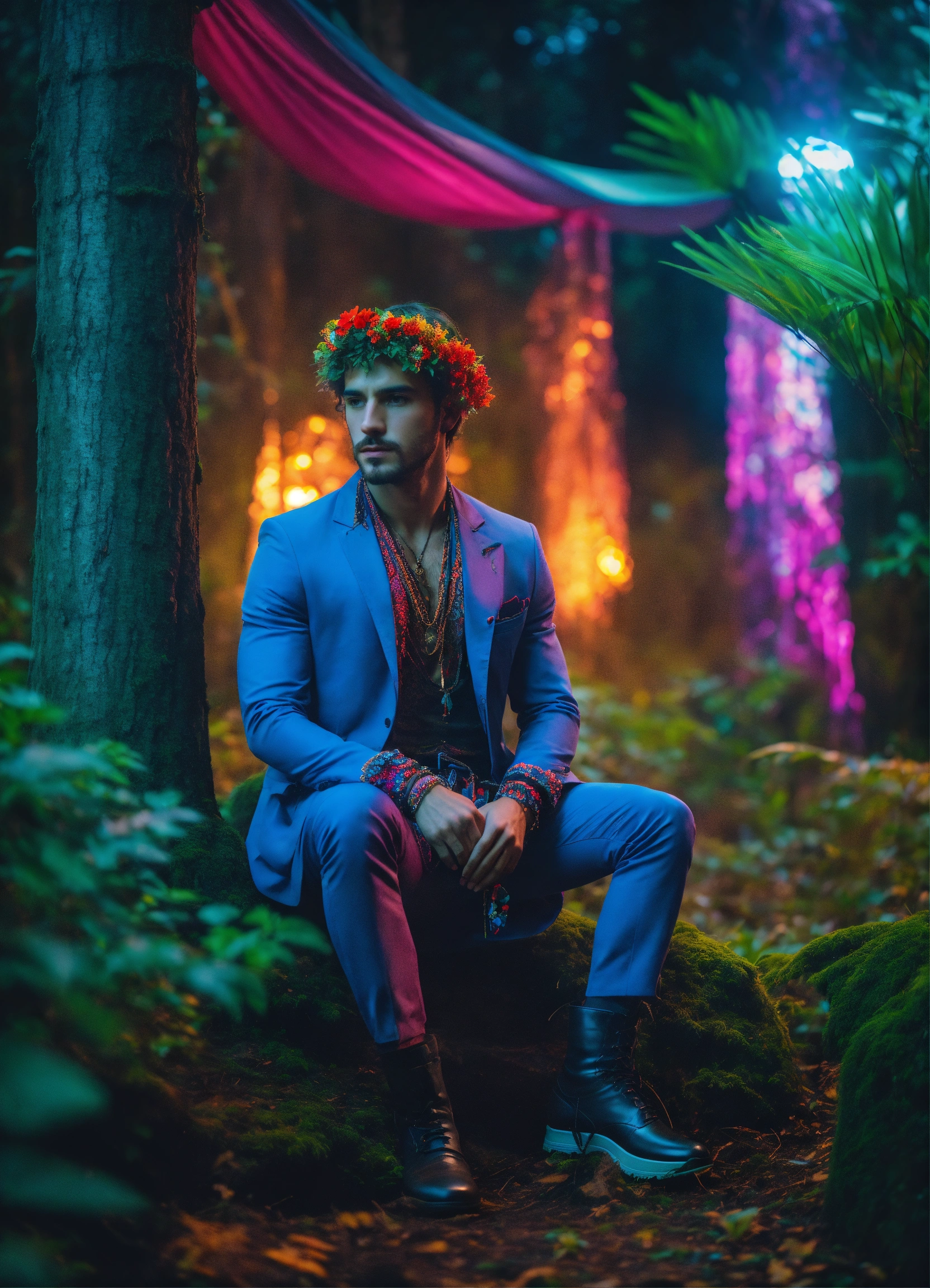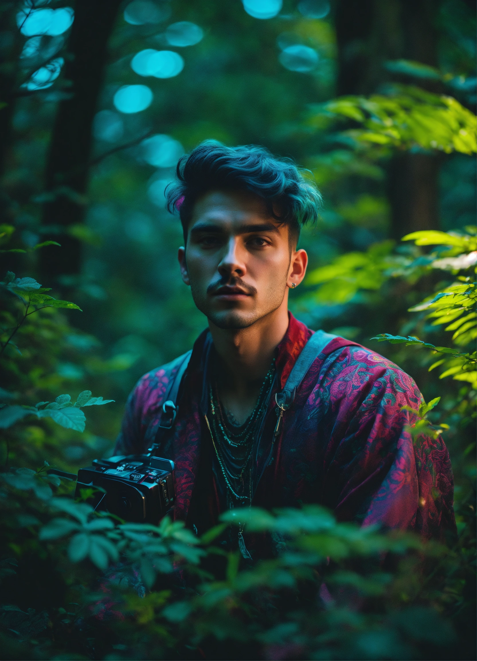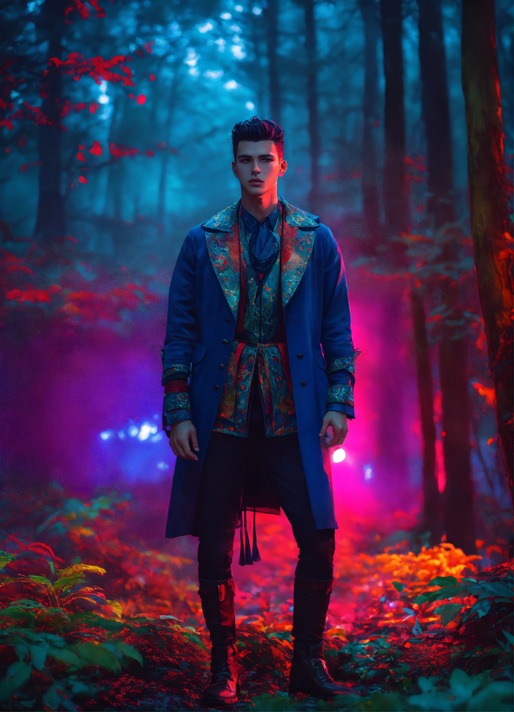 Cinematic photography, modern, male enigma archetype, in bohemian outfit, in a mystical forest, proportionate, neon colors details, realistic, ultra 8k resolution