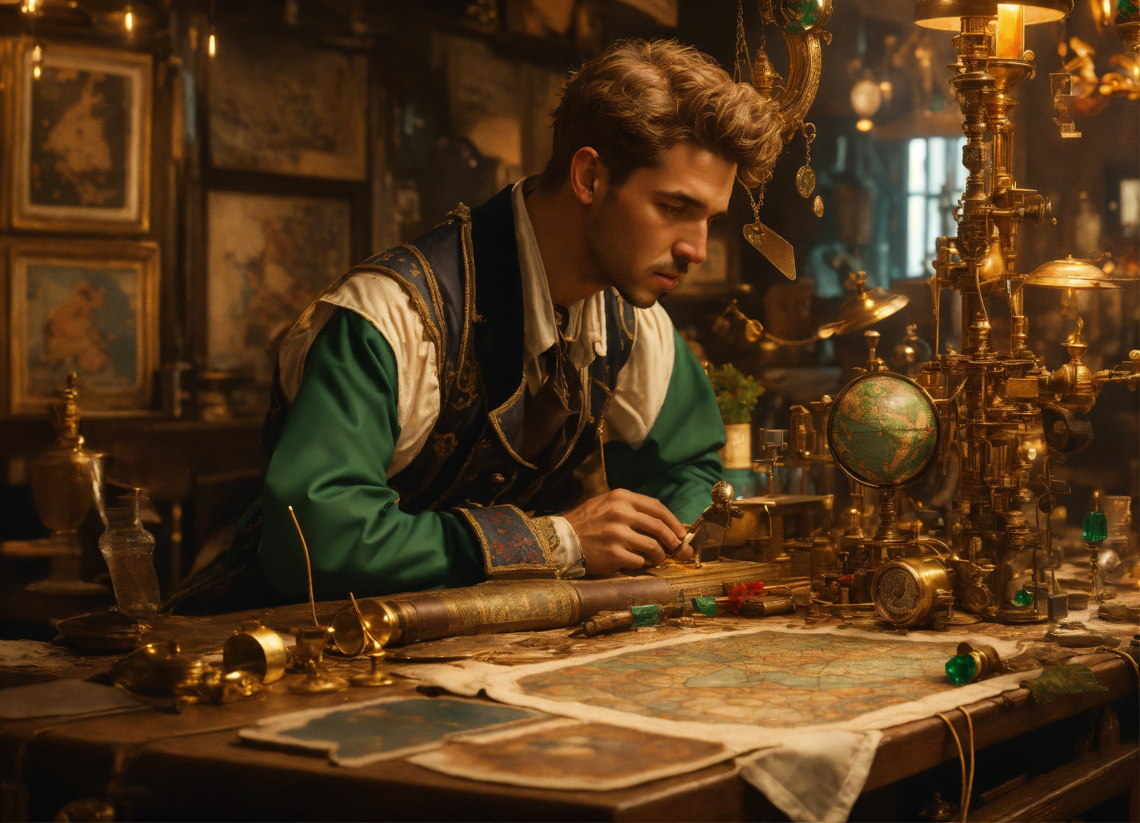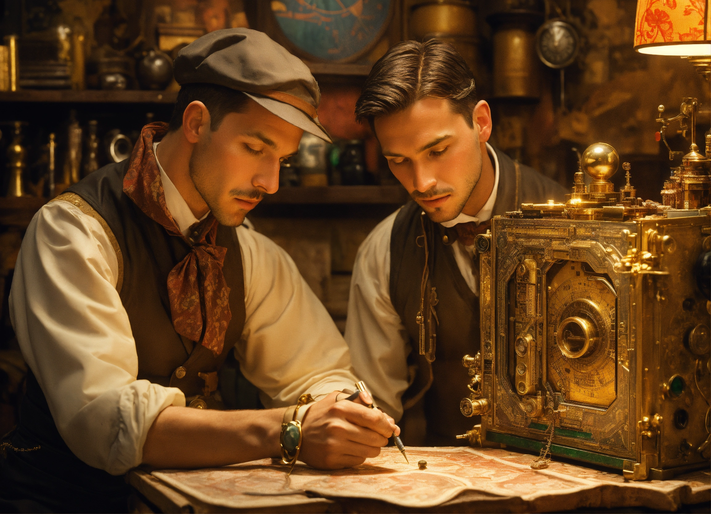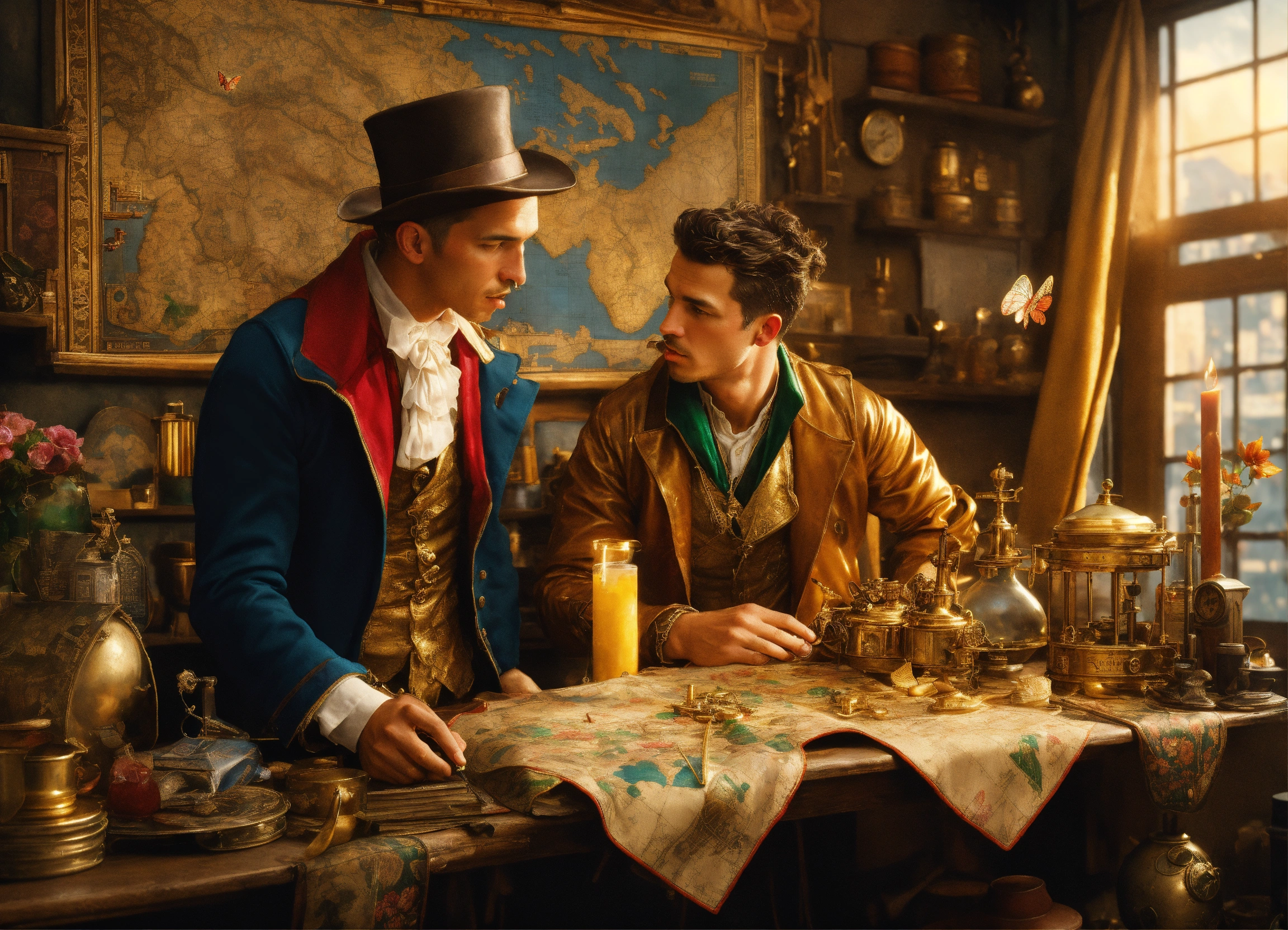 Daring treasure hunter, map and compass, standing in gold, emeralds, old books, old globe, desolate messy shack, chaotic shack in background. vibrant, photo realistic, realistic, dramatic, dark, sharp focus, 8k. gold, brass square and symbolic tapestry, adventurous, detailed, high detail, vanitas still-life flowers butterflies ham meat bread 17th century style, j.c. leyendecker, men in solid wet oil rainwear kissing, looking into his tender eyes, beautiful french tapestry, imagine a modern and technology-inspired living room with a unique twist. the centerpiece of the room is a striking circuit board interior wallpaper that covers one wall. the wallpaper features intricate circuit board diagrams, electronic symbols, and vibrant metallic tones, steampunk, perfectly detailed image, close-up, excellent lighting, photorealistic, digital illustration, realism, bastien lecouffe-deharme, norman rockwell, daniel ridgway knight, mike dargas, lucio amitrano, omar ortiz, disney