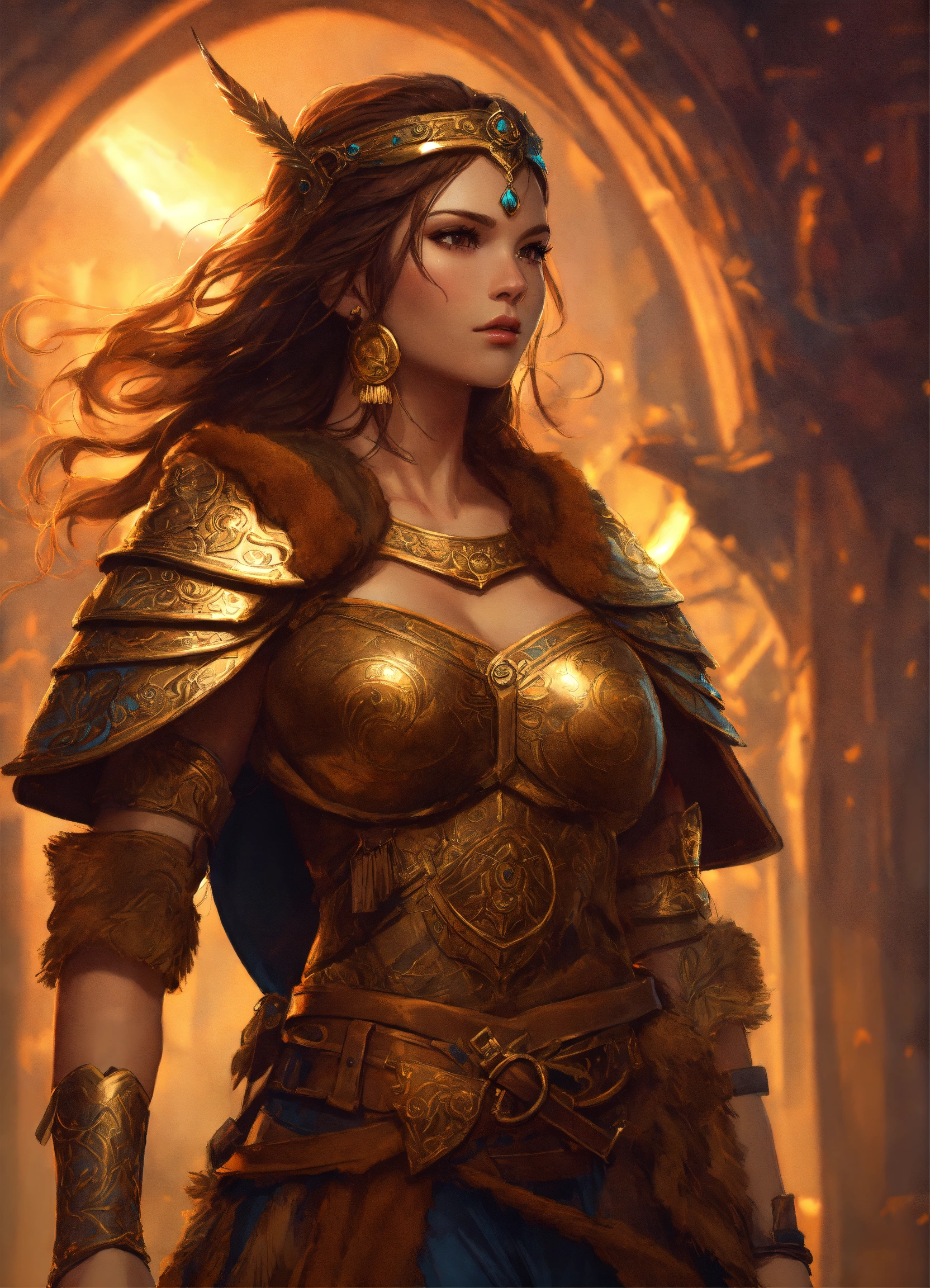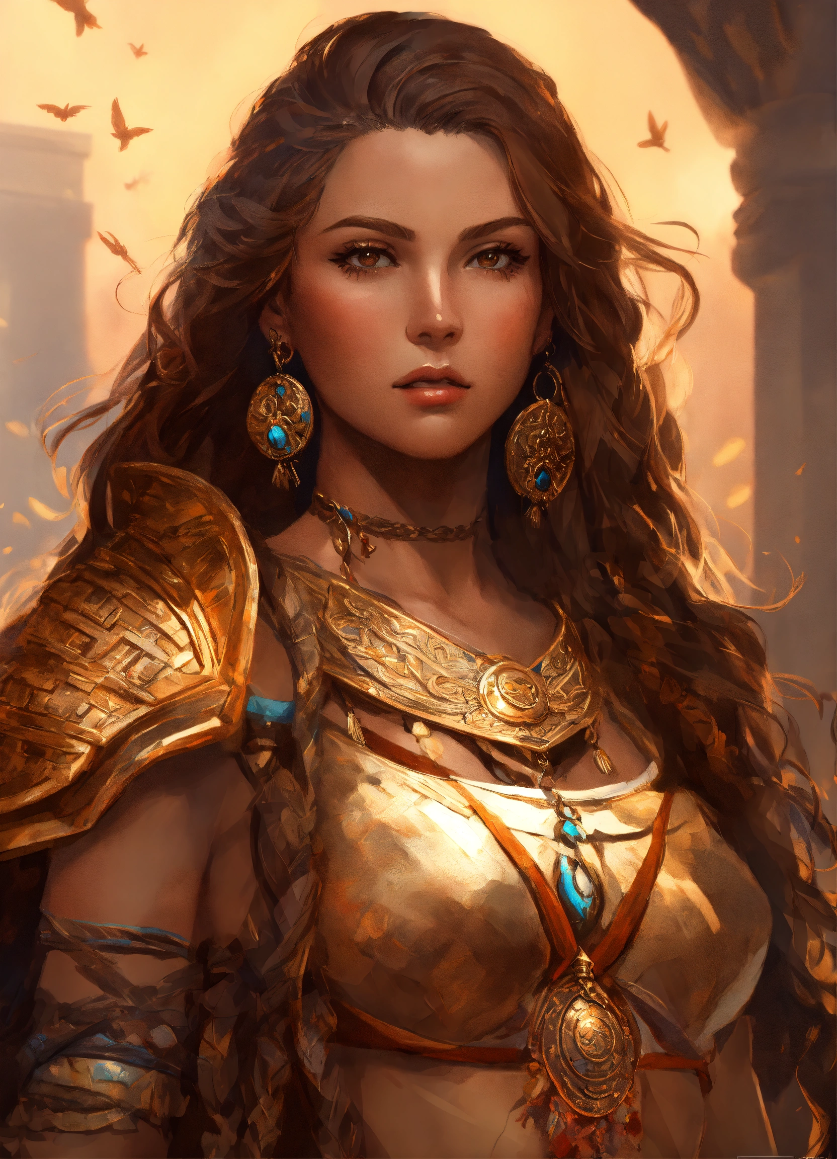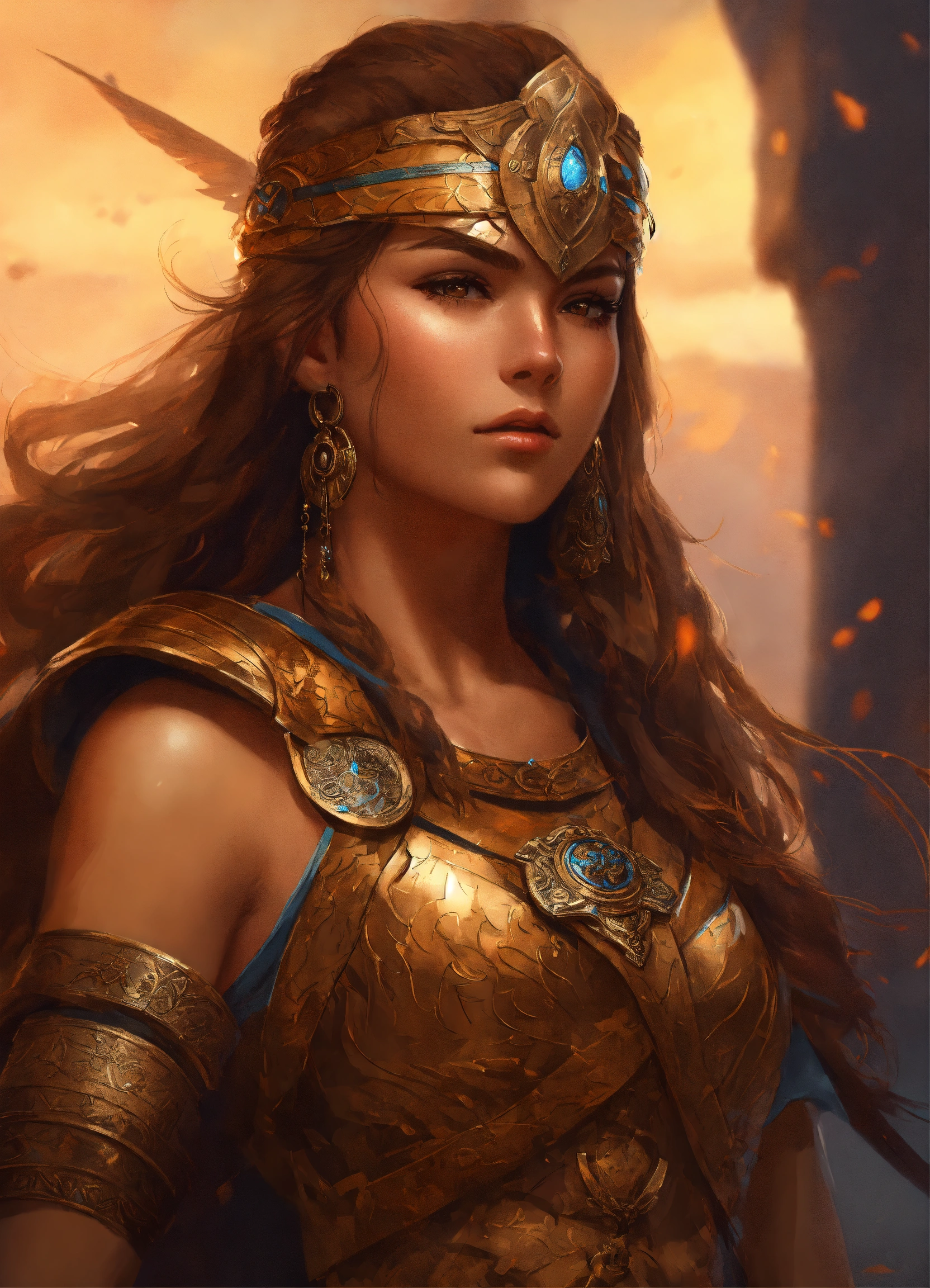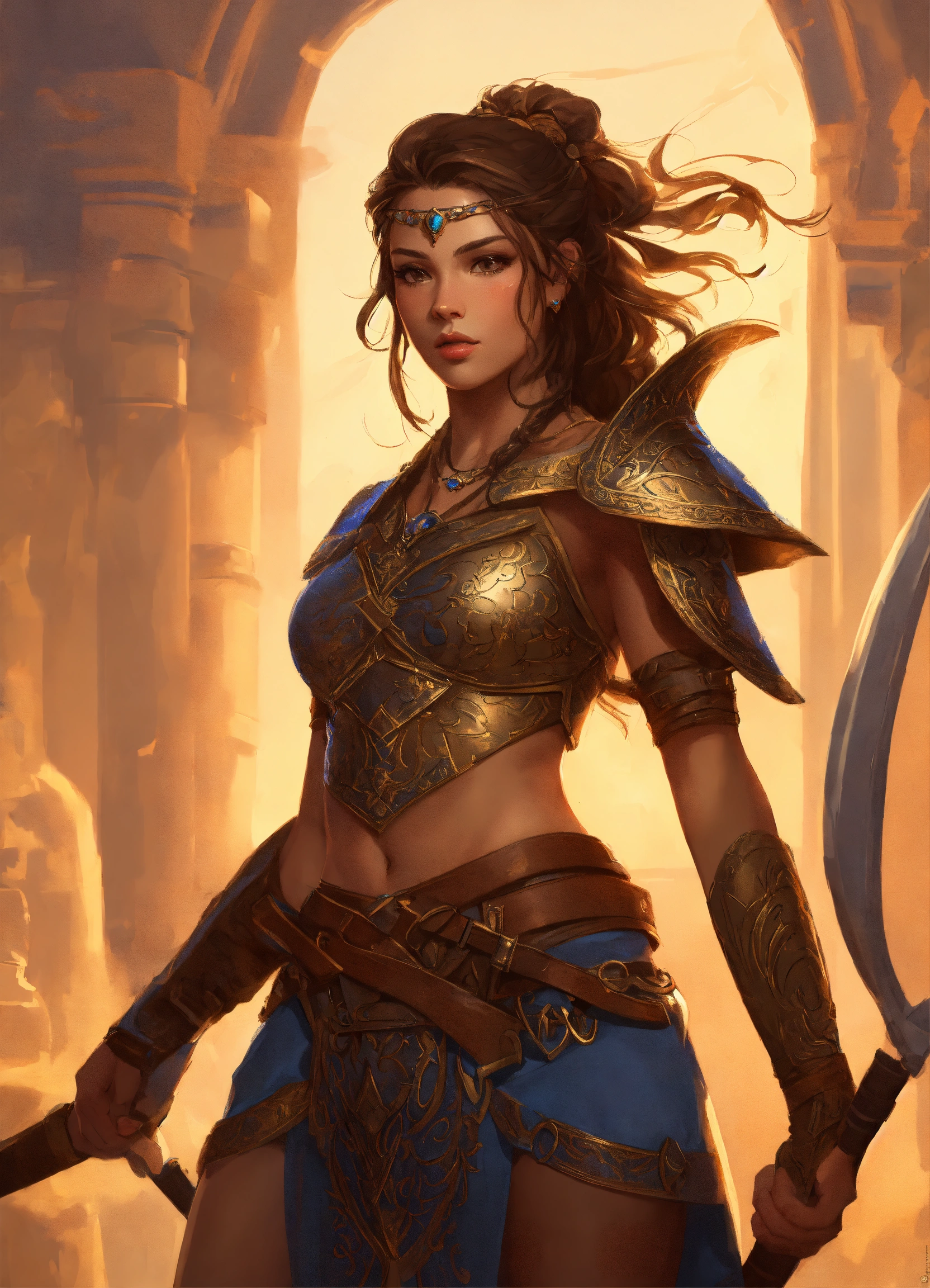 Warrior goddess, intricate, elegant, highly detailed, digital painting, artstation, concept art, smooth, sharp focus, illustration, brown hair, prepper, full shot, full-length portrait