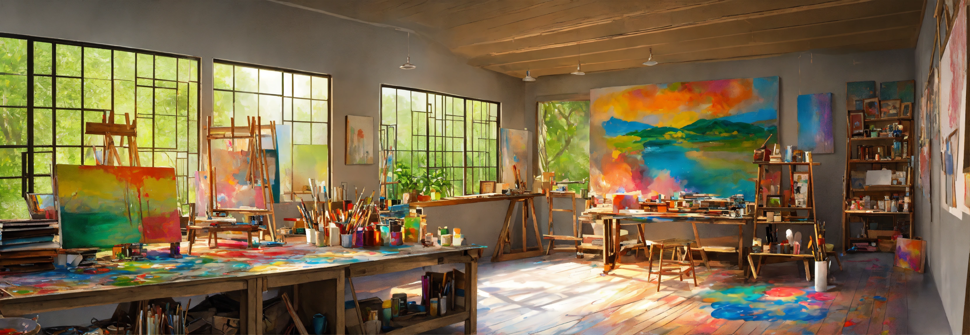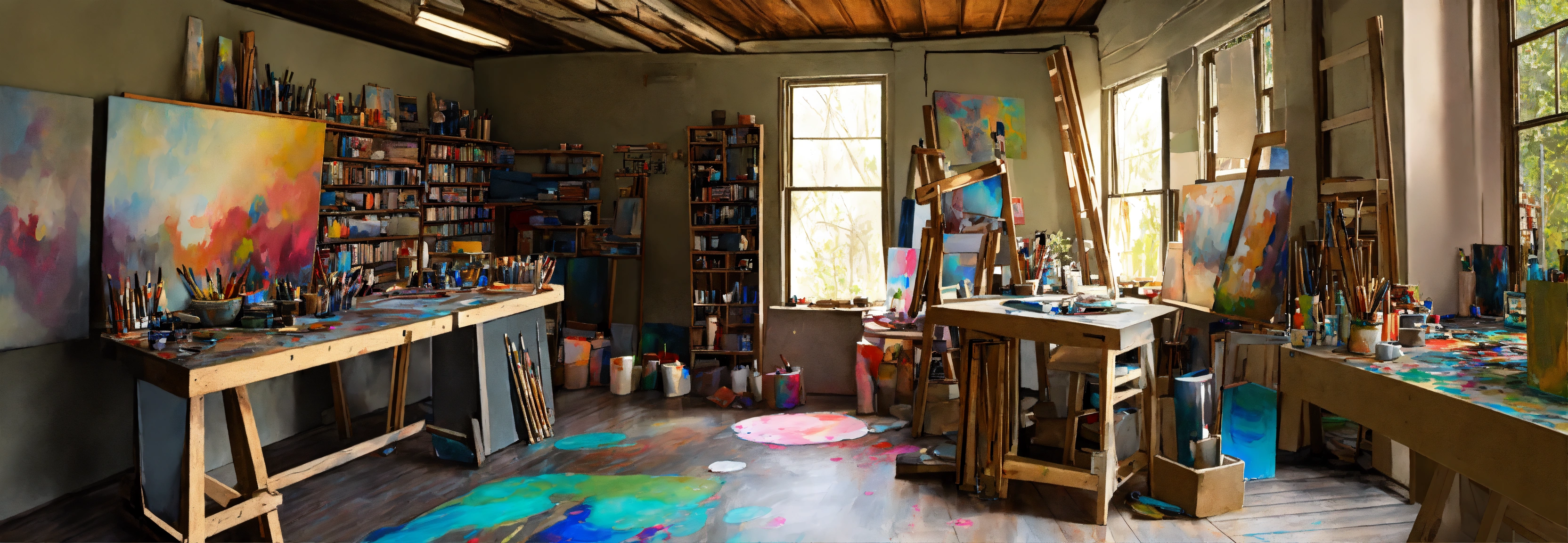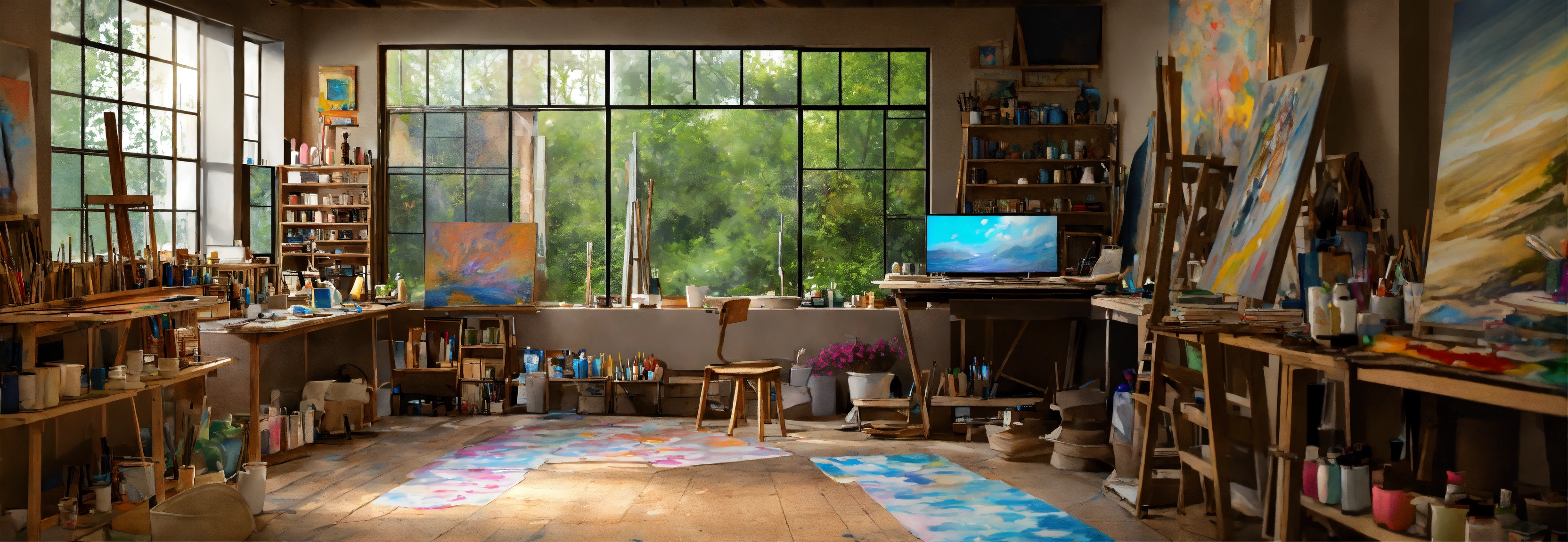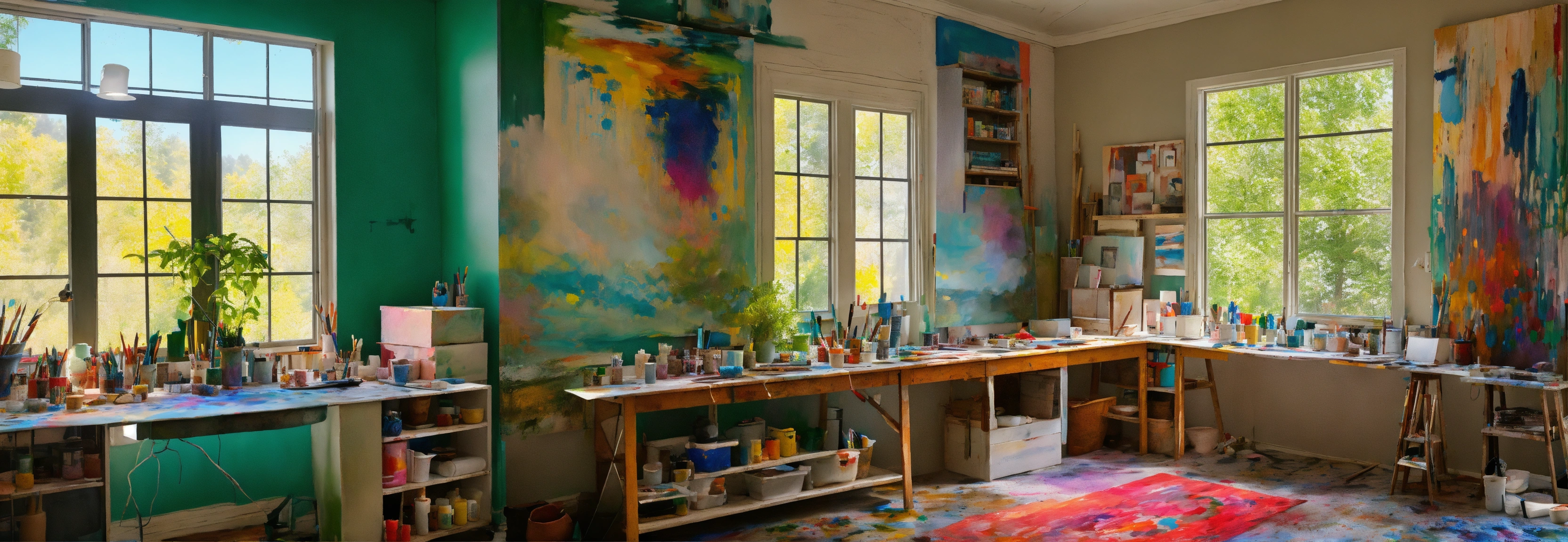 Concept art of an art studio, paintings on a canvas, stacked canvas paintings in a stack rack, bookshelves build into the walls with paint bottles and paintbrushes and colored pencils and art supplies, sink in the corner, bohemian, boho, artsy, hippie, private art studio, art supplies, unfinished grey clay sculptures on a table, one entire wall is a window looking out on a forest, huge room, hyper realistic, realistic, feminine, girly, paint splatters littered around floor, cluttered, workshop, desktop computer on a desk, home art studio, granite floors, big room, windows only on one wall, floor to ceiling windows on one entire wall, sink, painting on a canvas stand with a stool chair