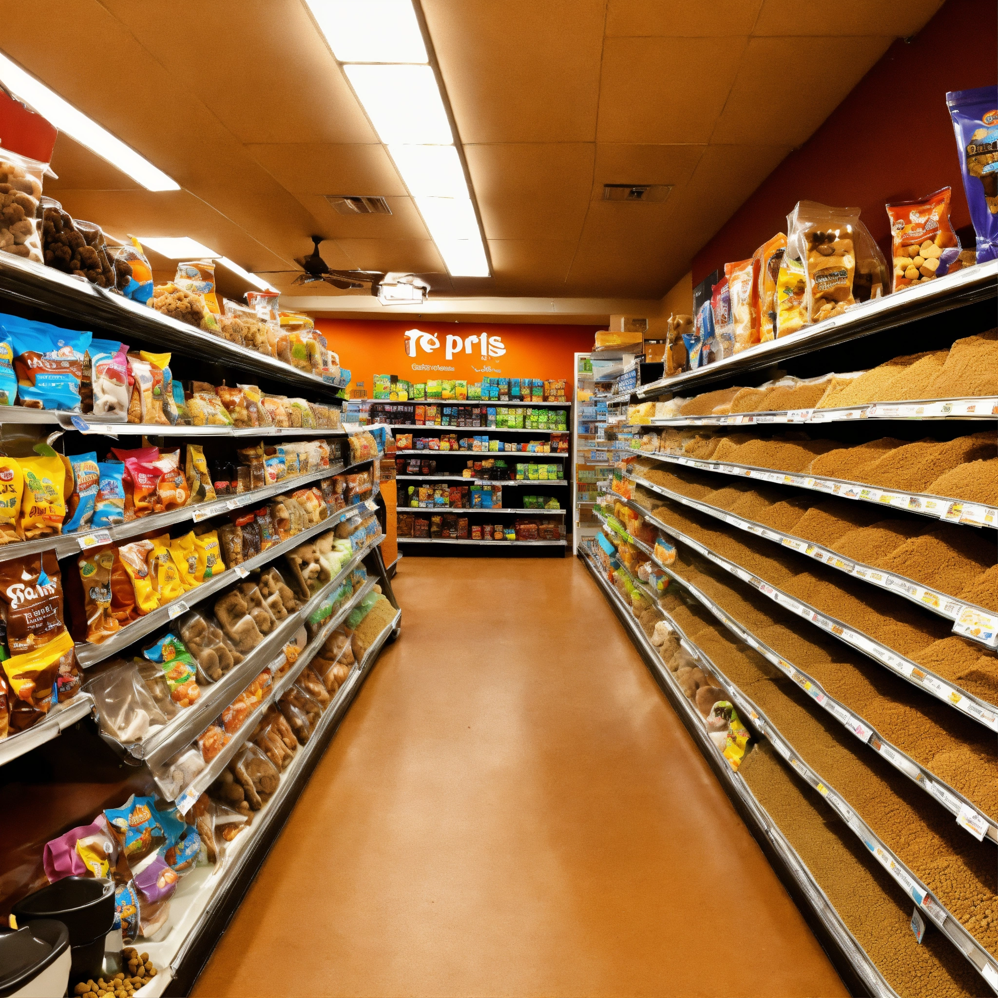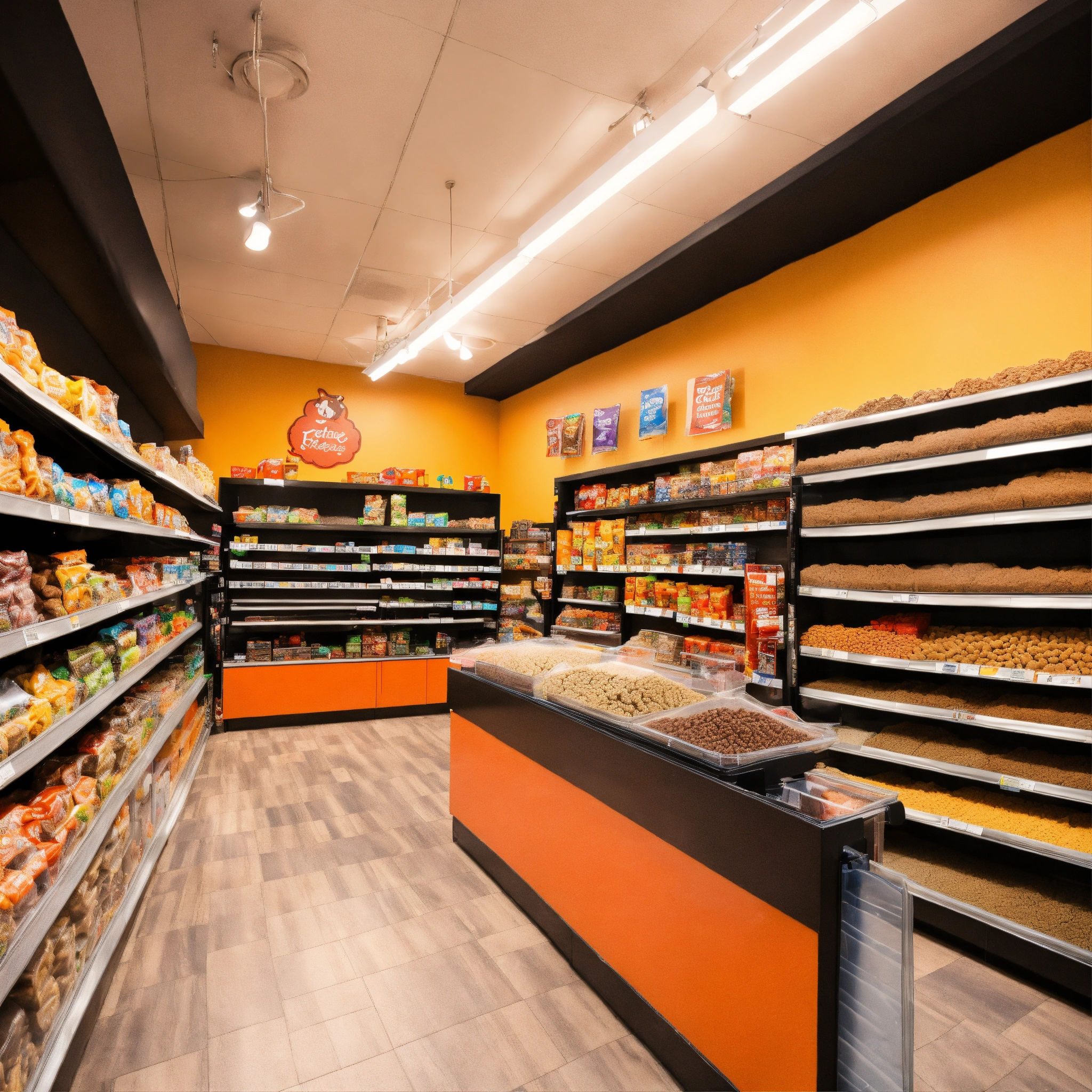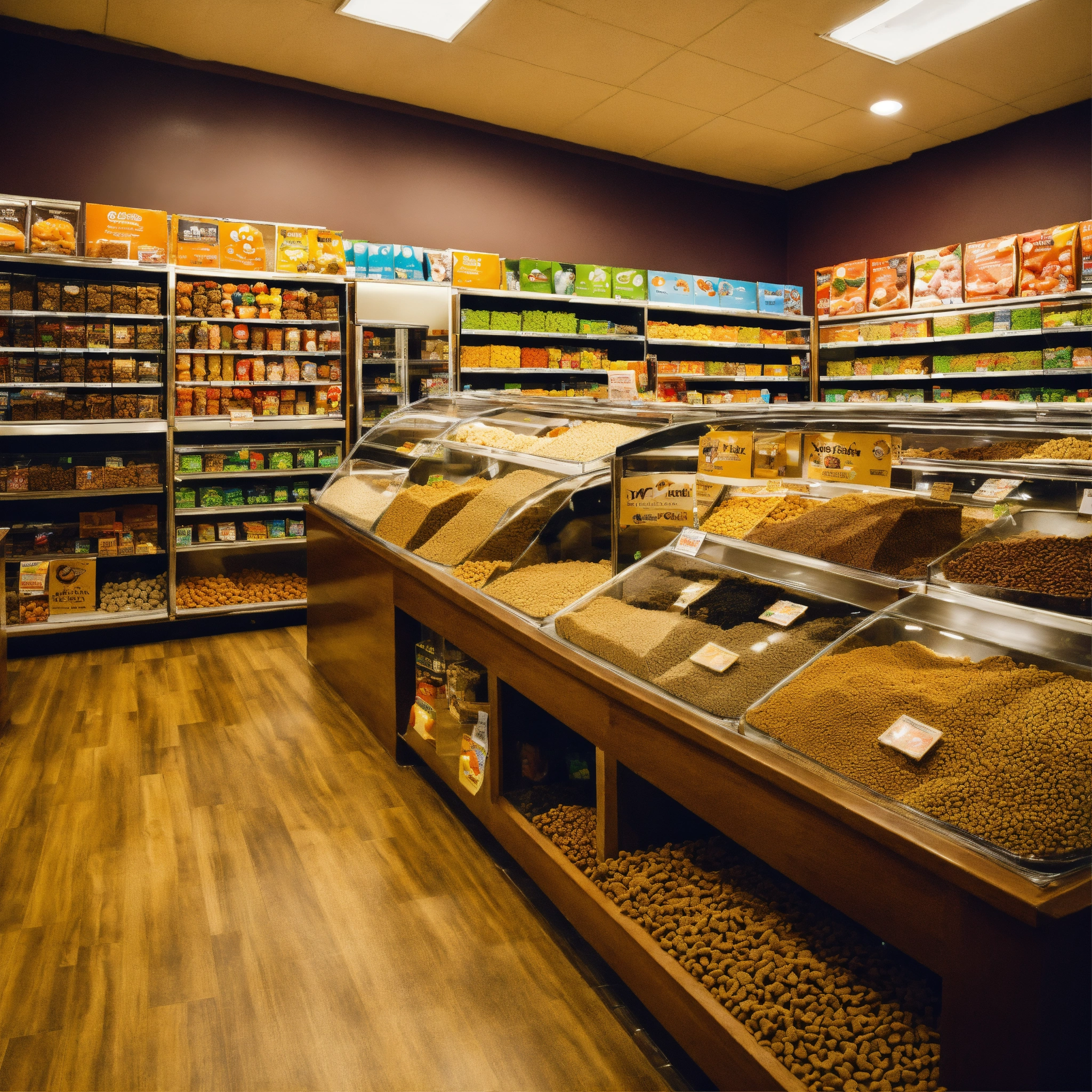 A photo of a pet store with a variety of pet food and treats, the store is clean and well-organized, the pet food and treats are displayed in an attractive manner