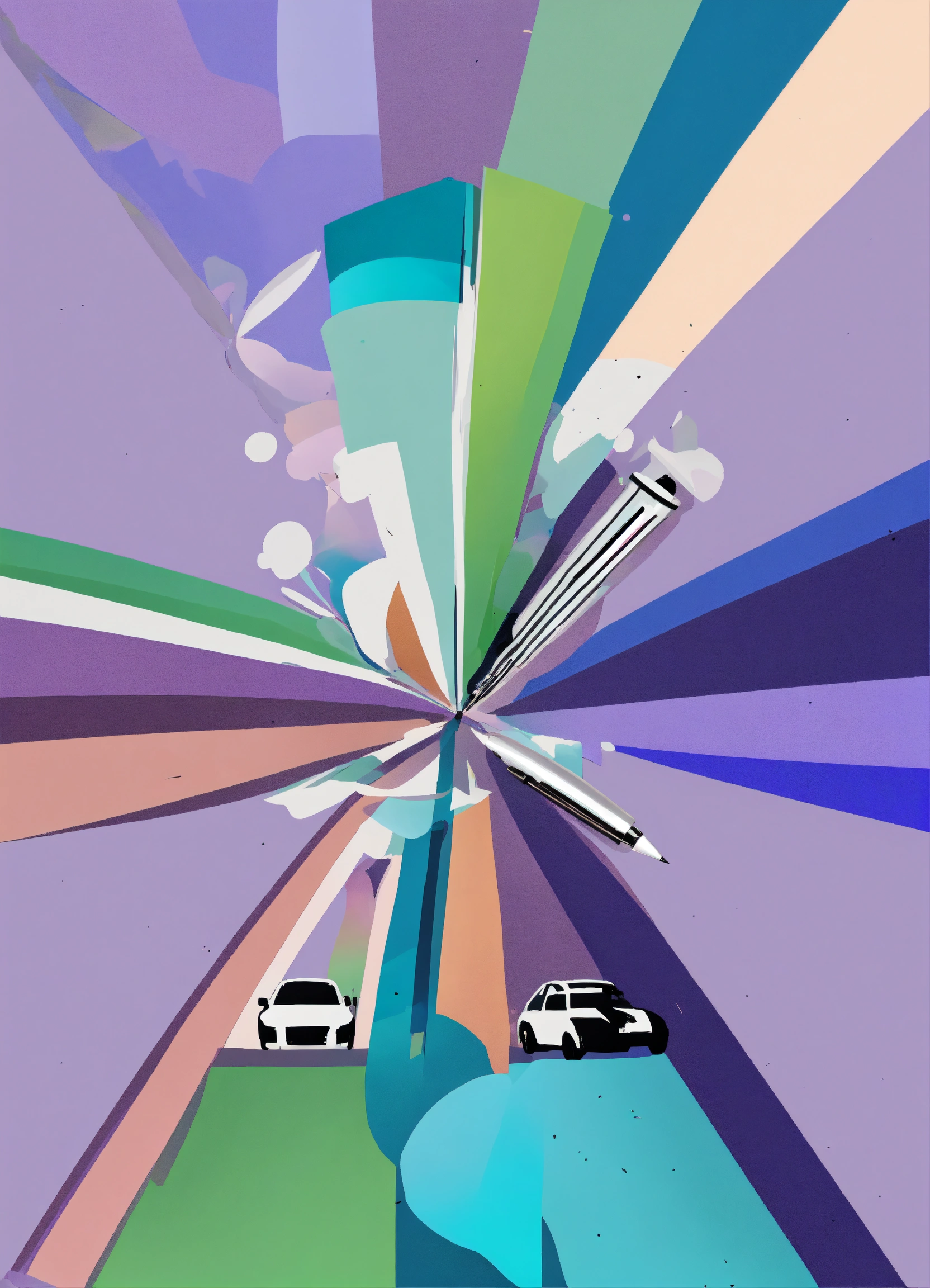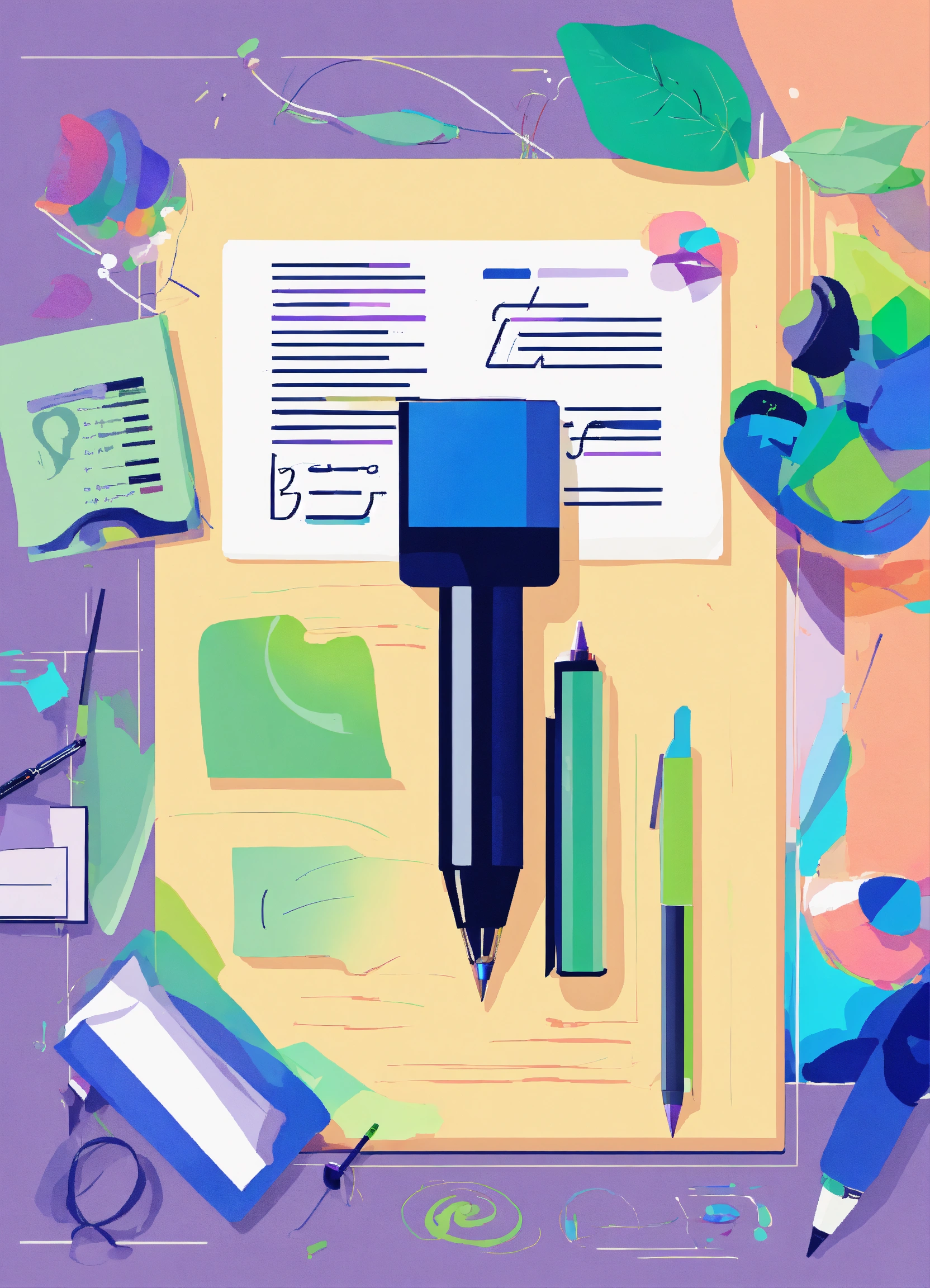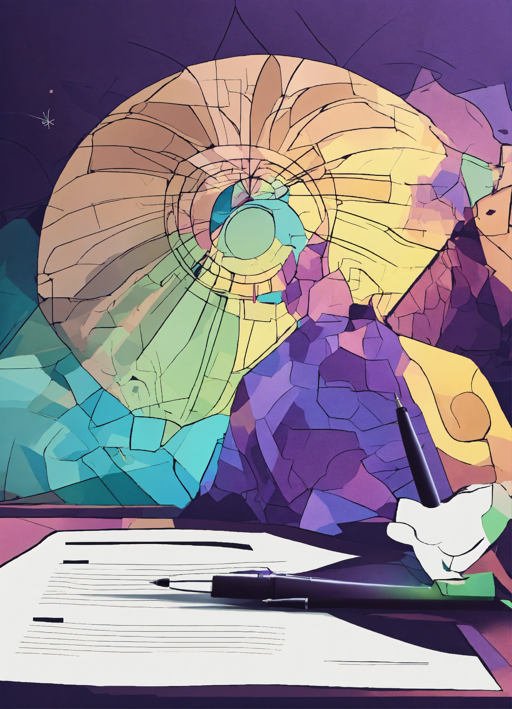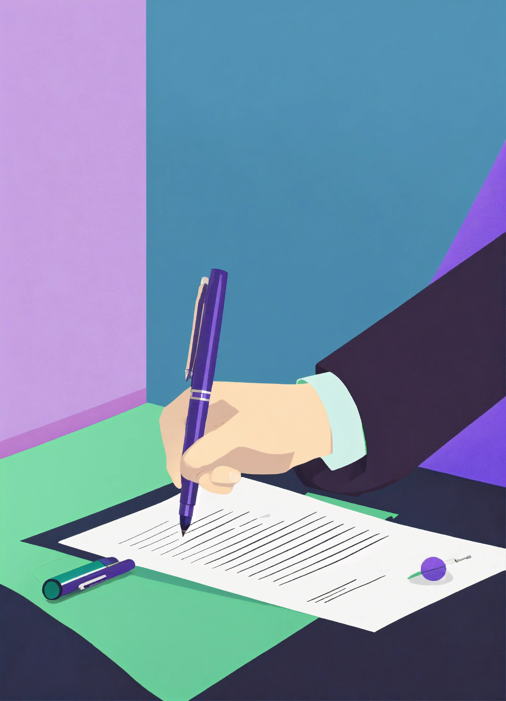 A vector with two hands, a pen and a contract signed with colors blue, purple, light green, black and white