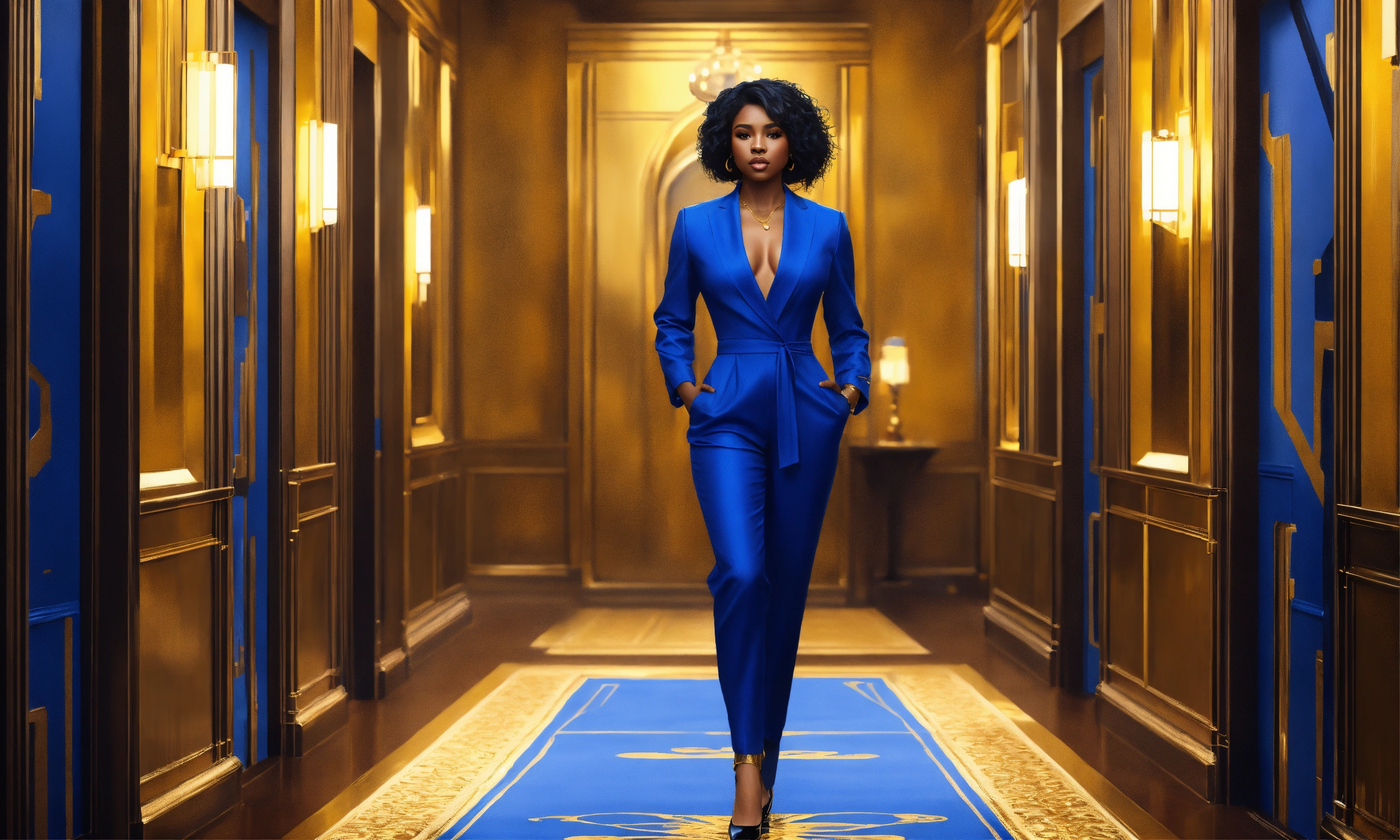 Solo beautiful eypgt sherrod classy brown skinned in cobalt jumpsuit with black hair, in gold and blue hallway painting wall, brown eyes, with blue and gold suit, mother body, full body, intricate, elegant, highly detailed, digital painting, concept art, art station, smooth, sharp focus