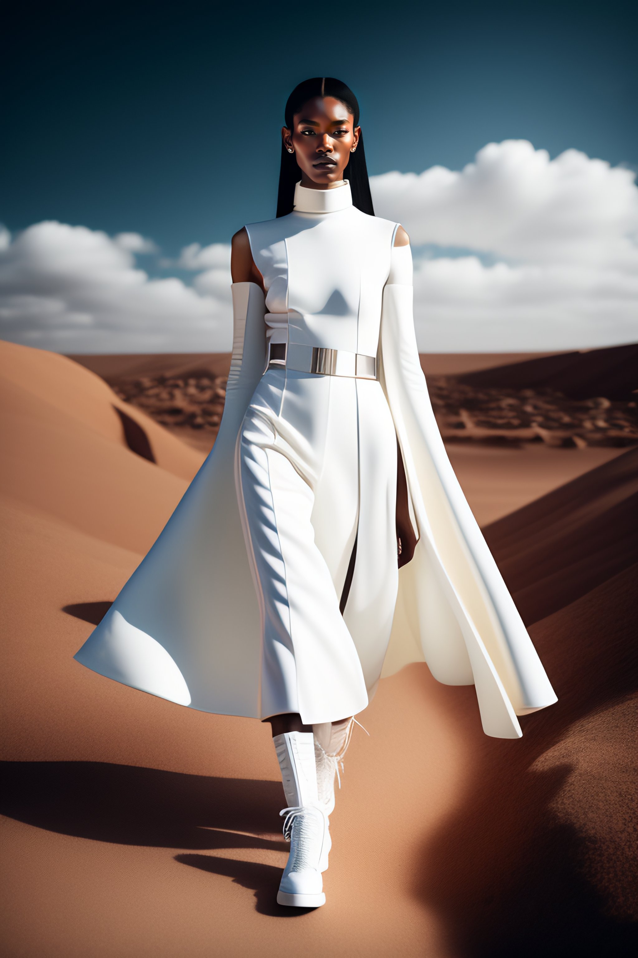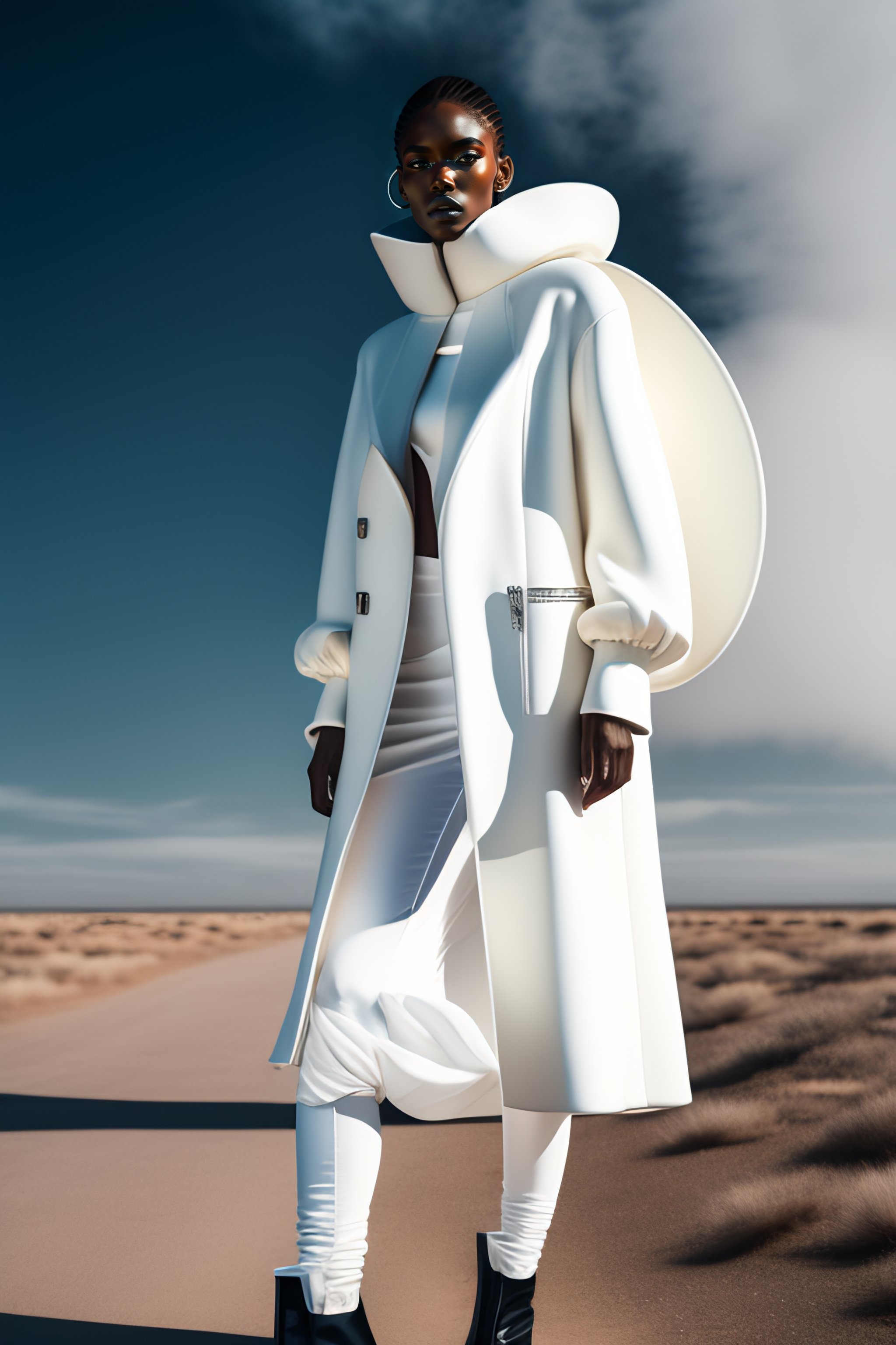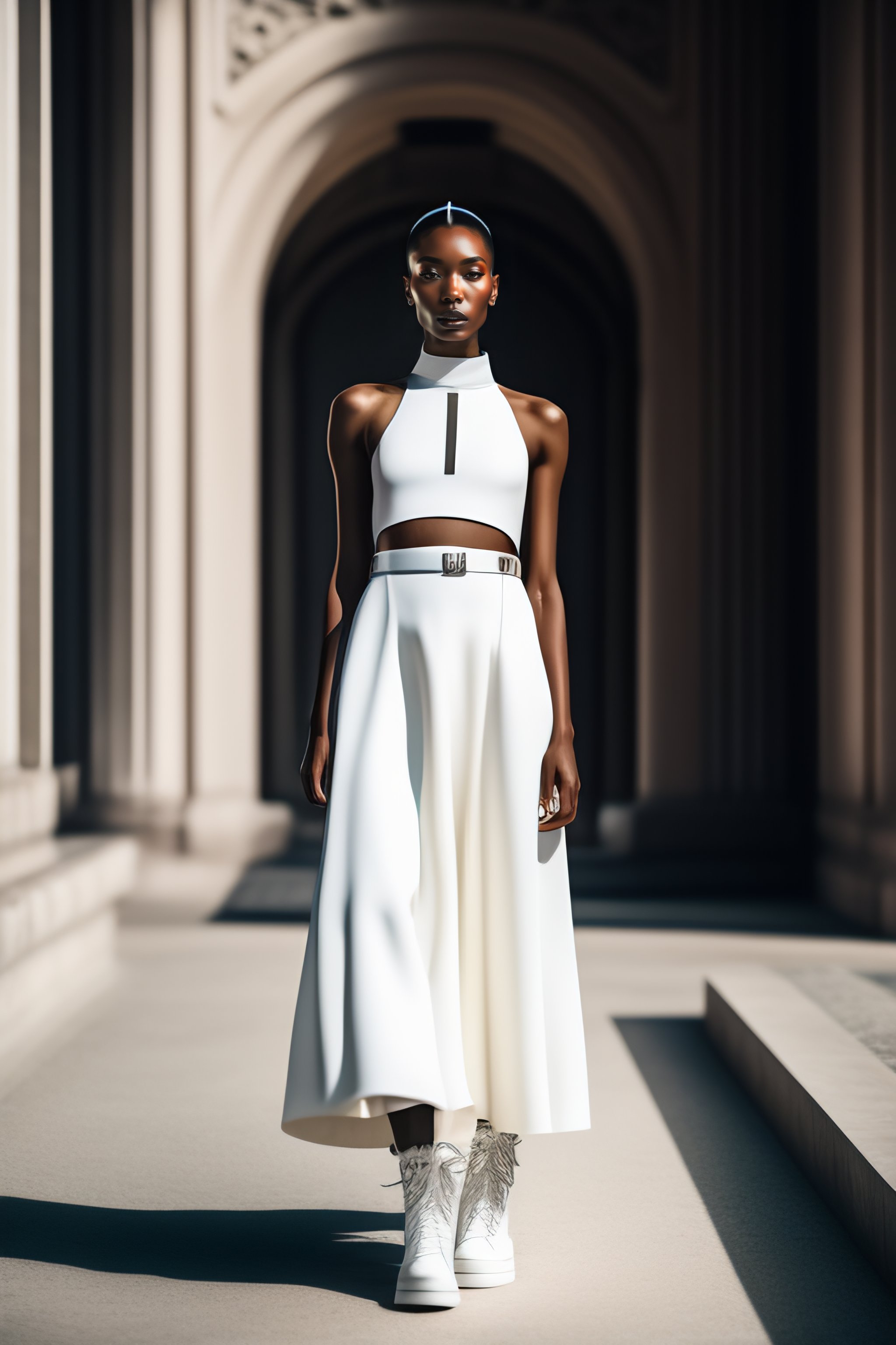 Ultra hd! editorial, rick owens, female model, white and chrome, structured outfit, platform shoes, iso 400, surrealistic, 8k, full frame, landscape, architecture