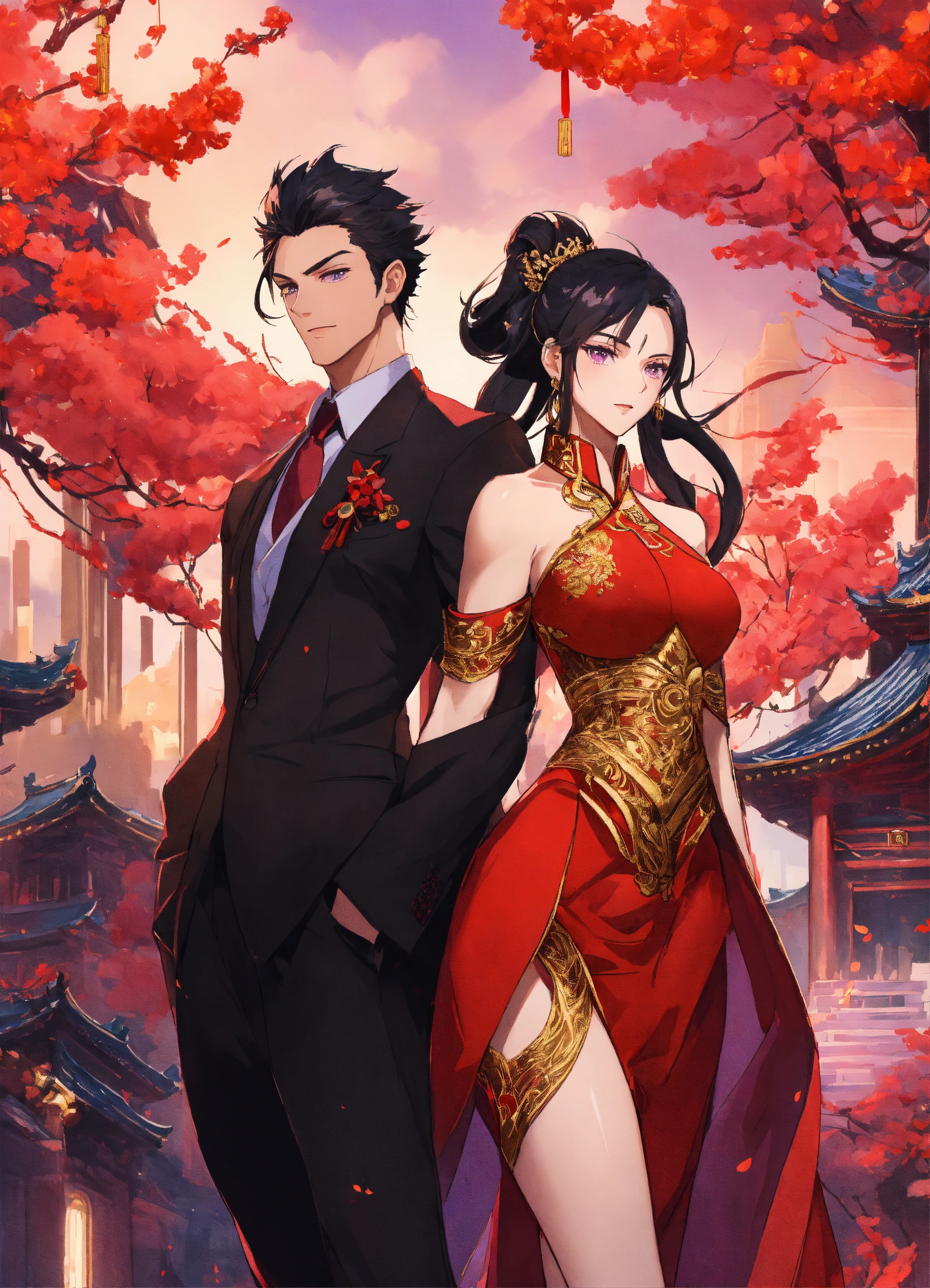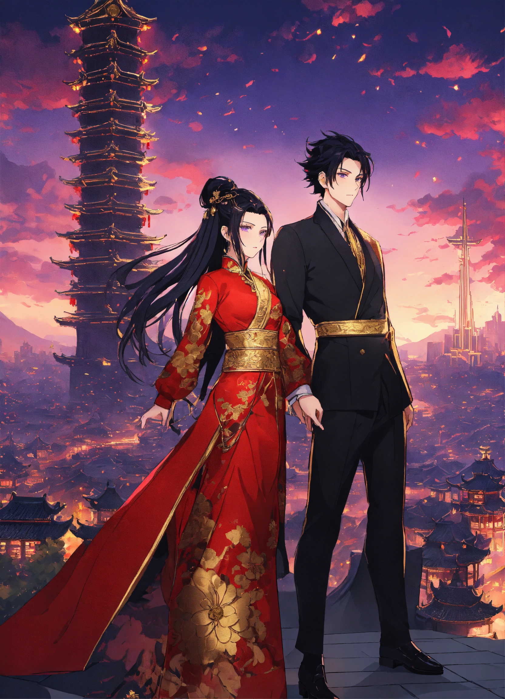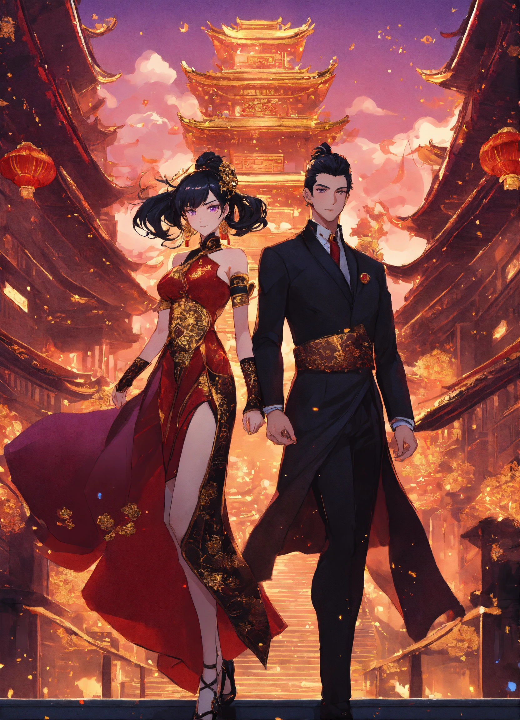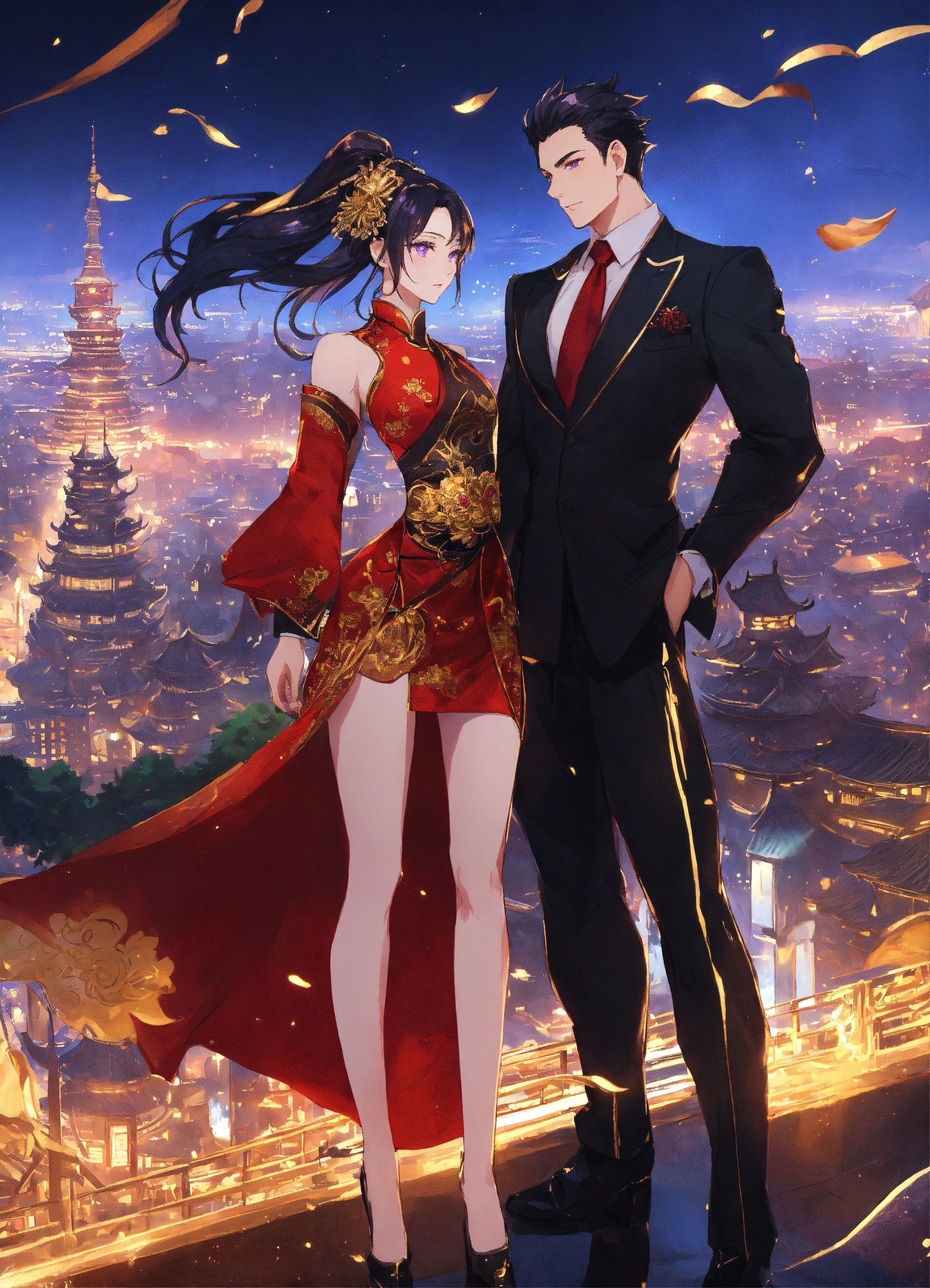Illustration of a man and a woman, the man wears a black suit with gold adornments, black tousled hair, violet eyes, the man wears a red chinese dress with gold adornments that shows legs, she has muscles, dynamic pose, background beautiful intricate city with spiral towers, maximalist, 8k anime artwork, 8k photo, trending on artstation