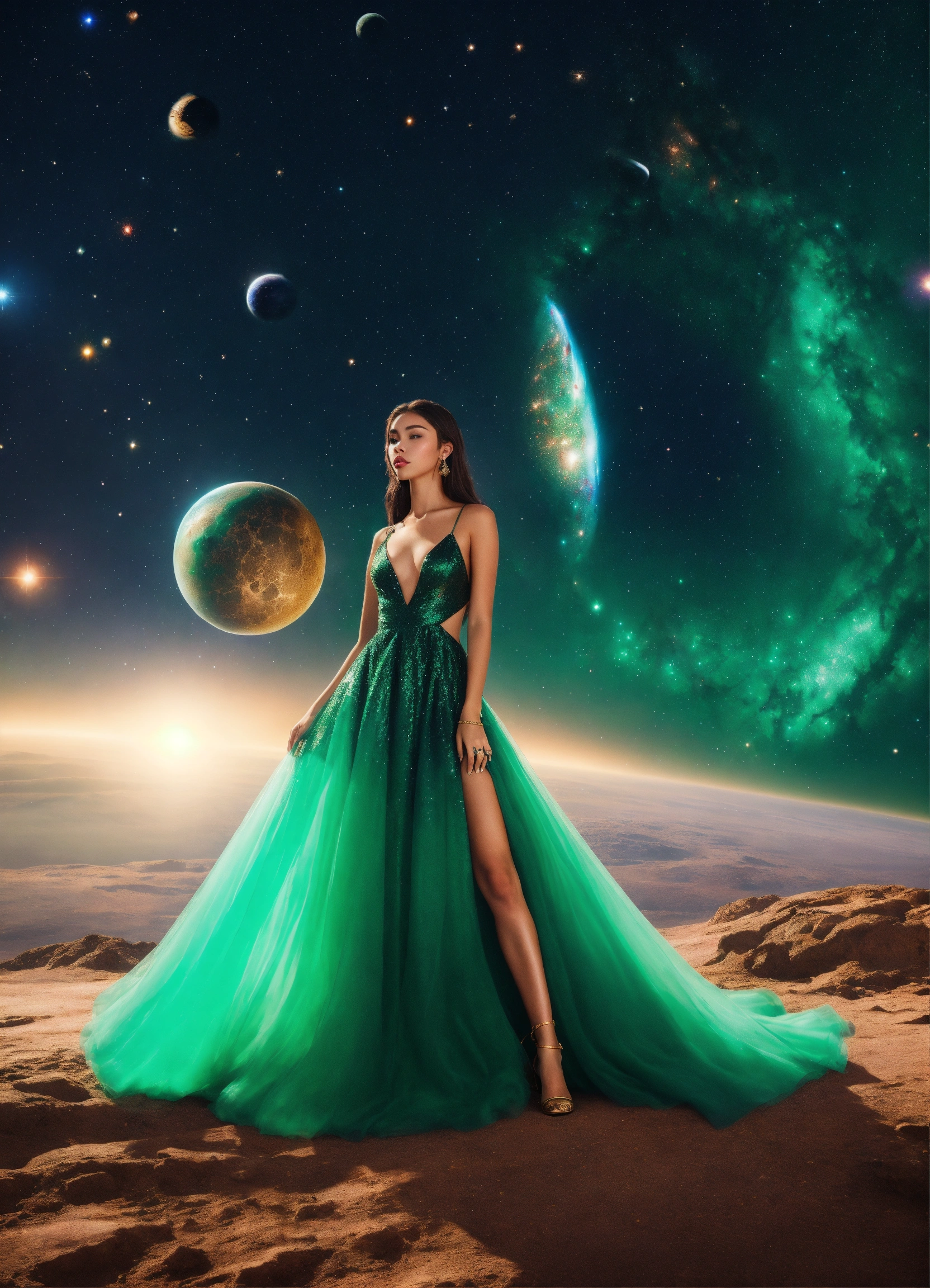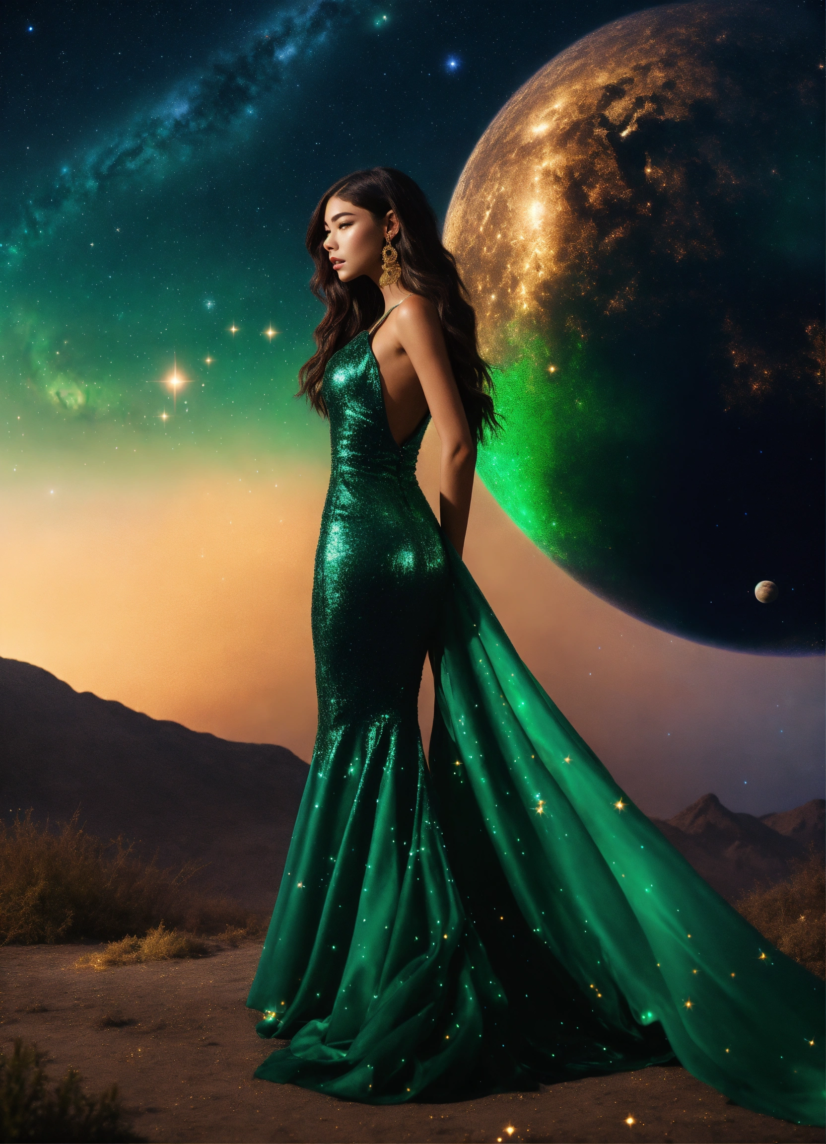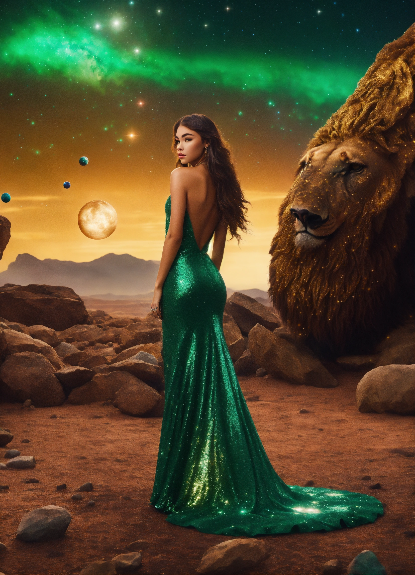 Madison beer in a emerald sparkling cocktail dress, black, on an isolated planet, back turned. stars raining down, a majestic lion with golden mane watching her. galaxy filled with planets, realistic. full body. 4k real photoshoot.