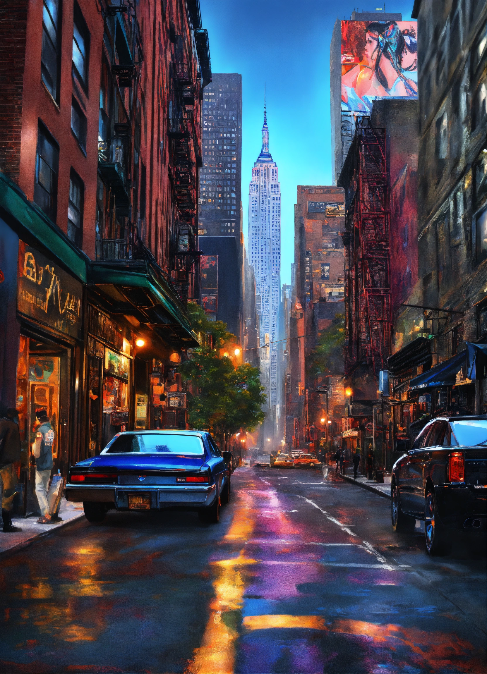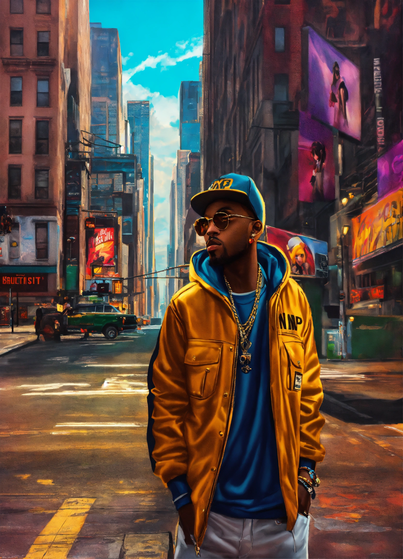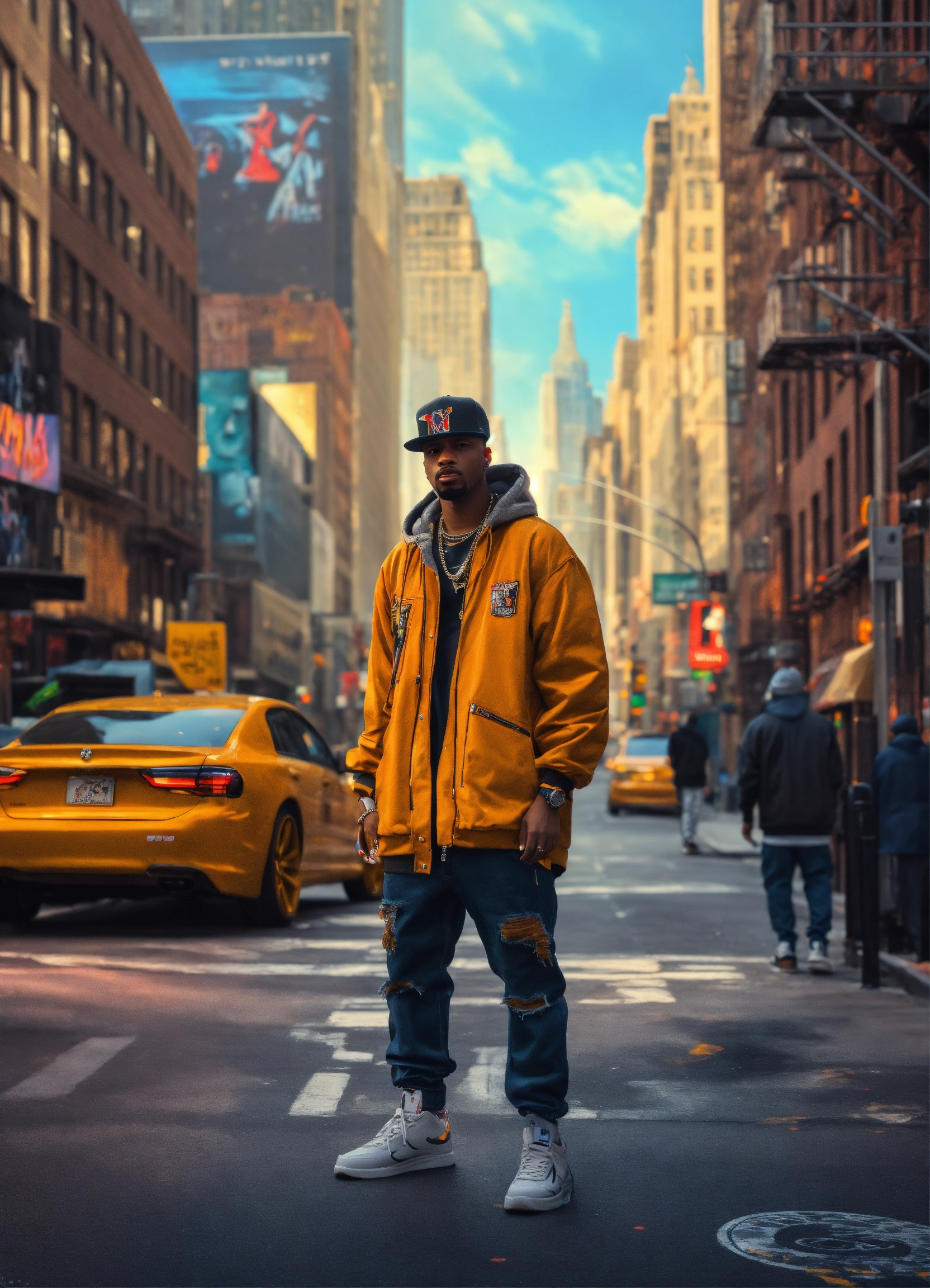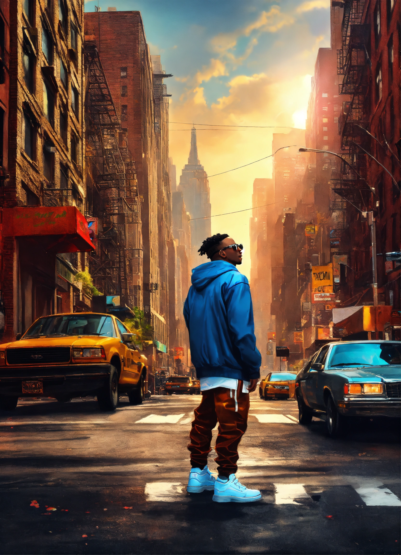 A beautiful new york street in hip hop style, street is watching, iper realistic, rapper, digital paint, digital art, 8k, hdr