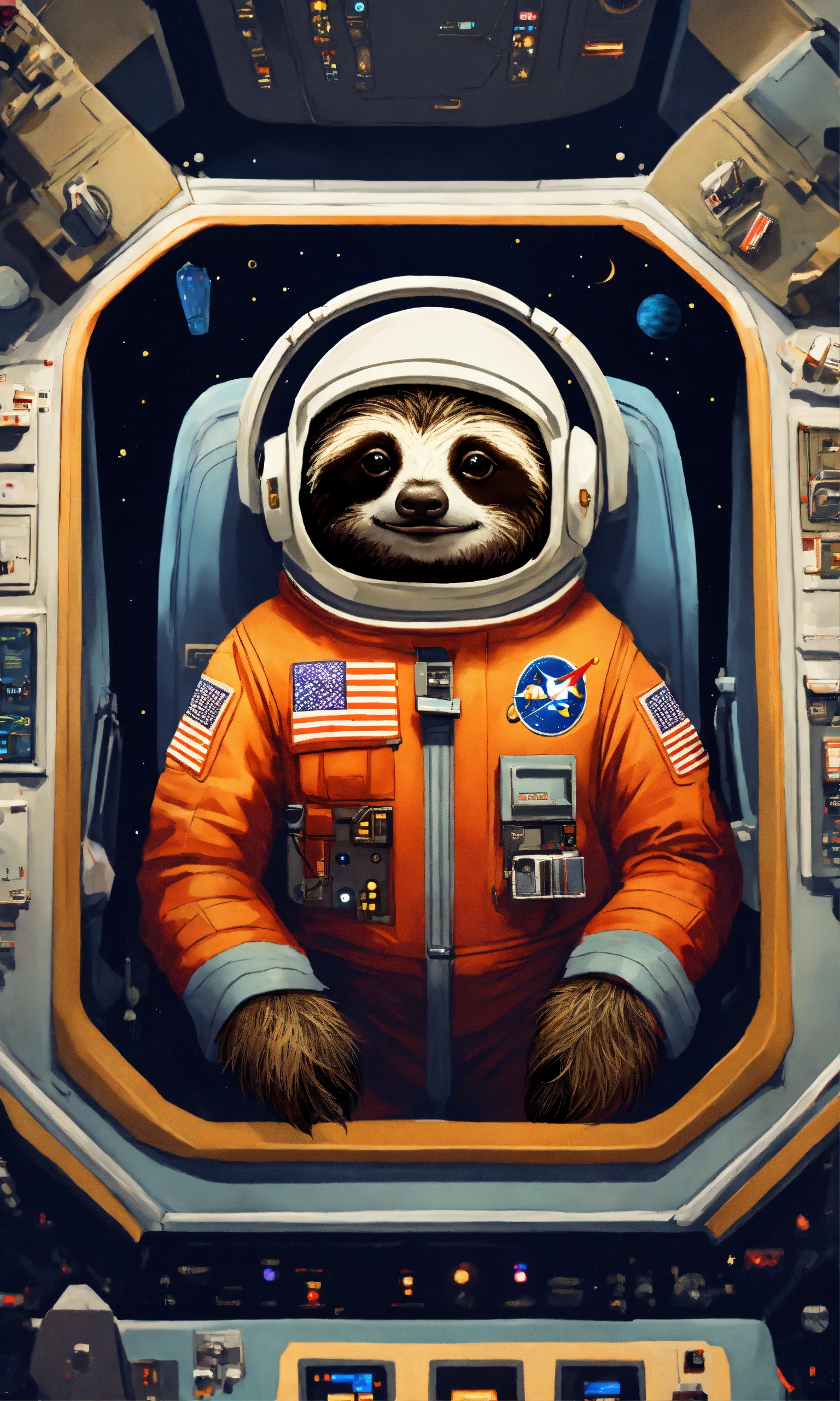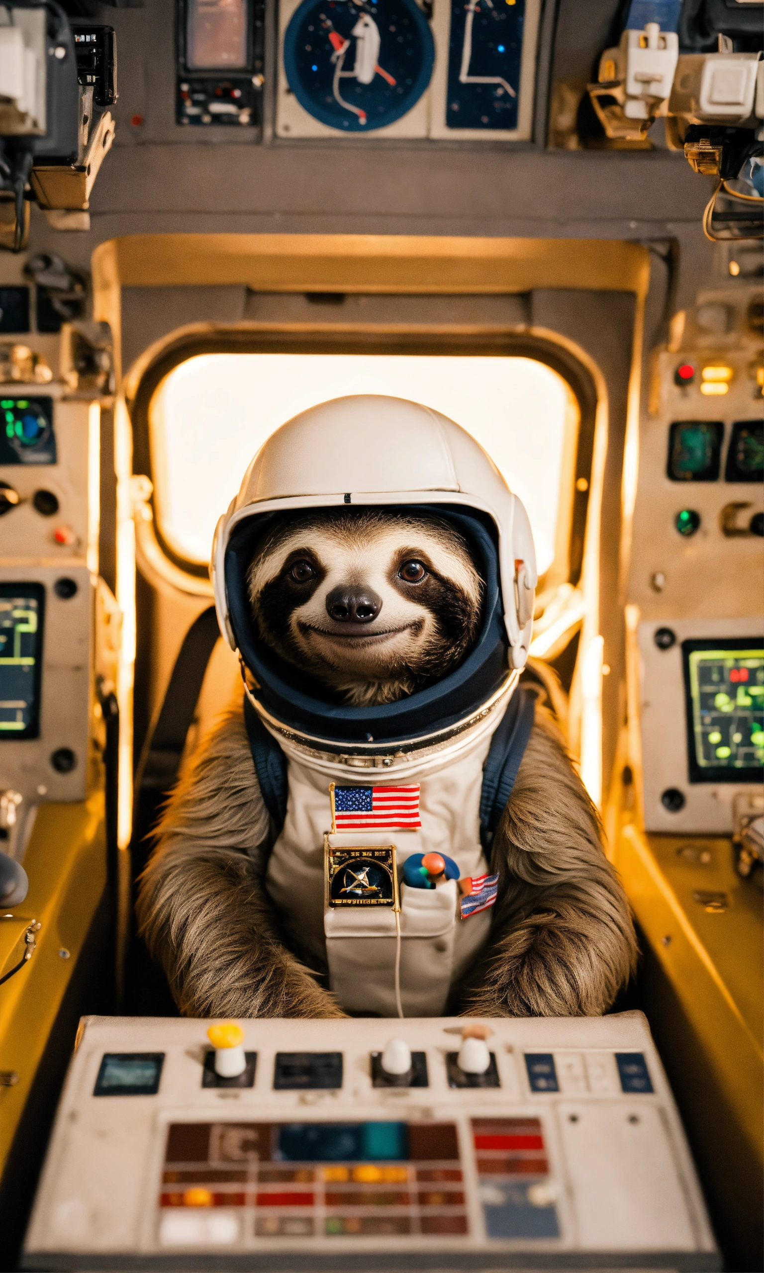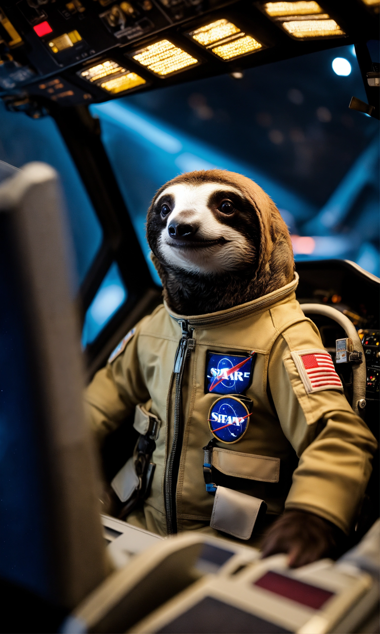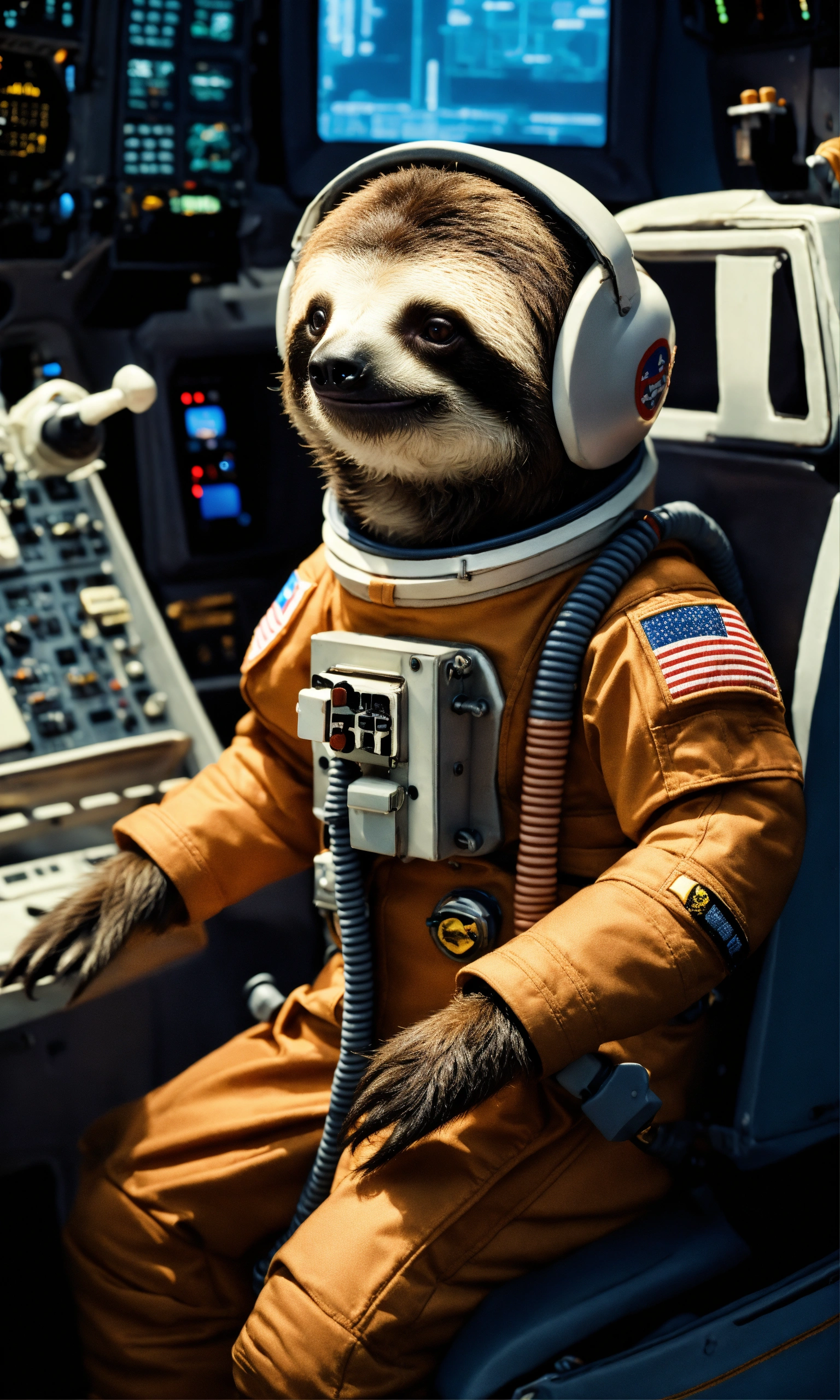 A cute and tiny sloth captain inside the space shuttle's control cockpit
