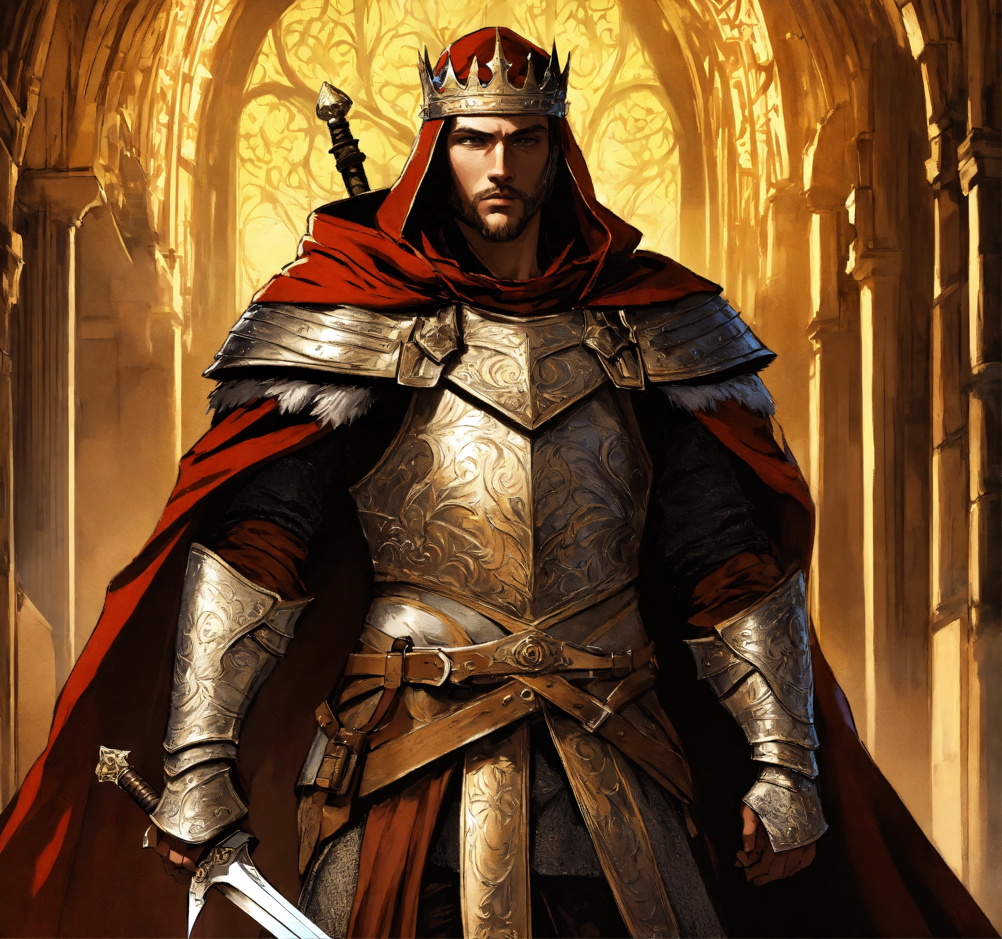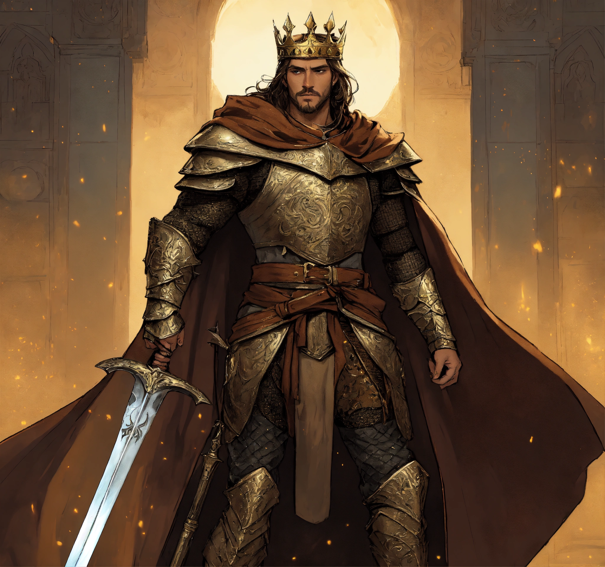 Fantasy setting, an enigmatic human king, in scale mail armor, wearing a crown, and brown cloak, standing in a heroic profile pose, head facing, holding a longsword and looking down the blade, shrouded in glory, highly detailed, comic graphic novel art, top-rated, sharp, no blur, edited, corrected