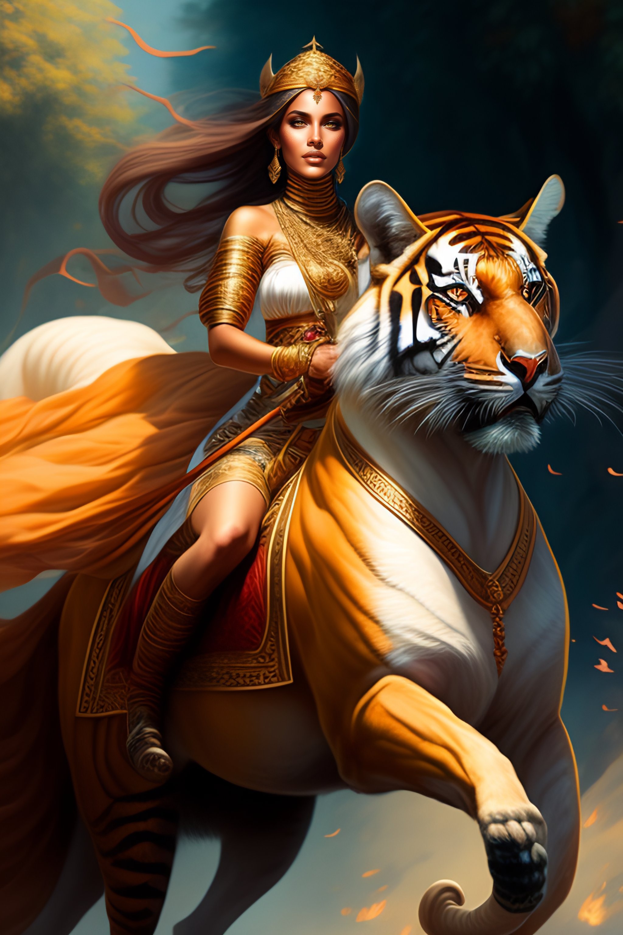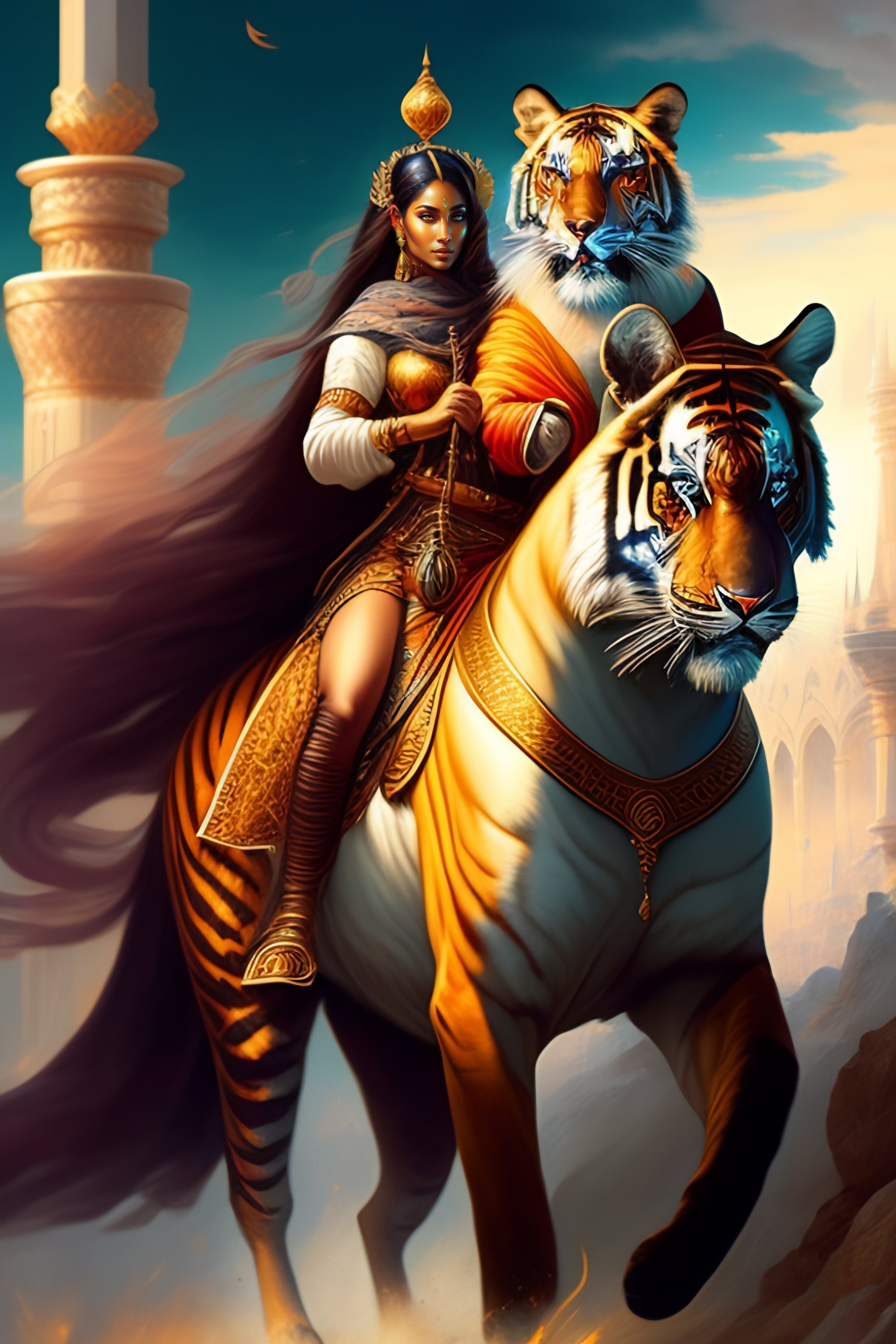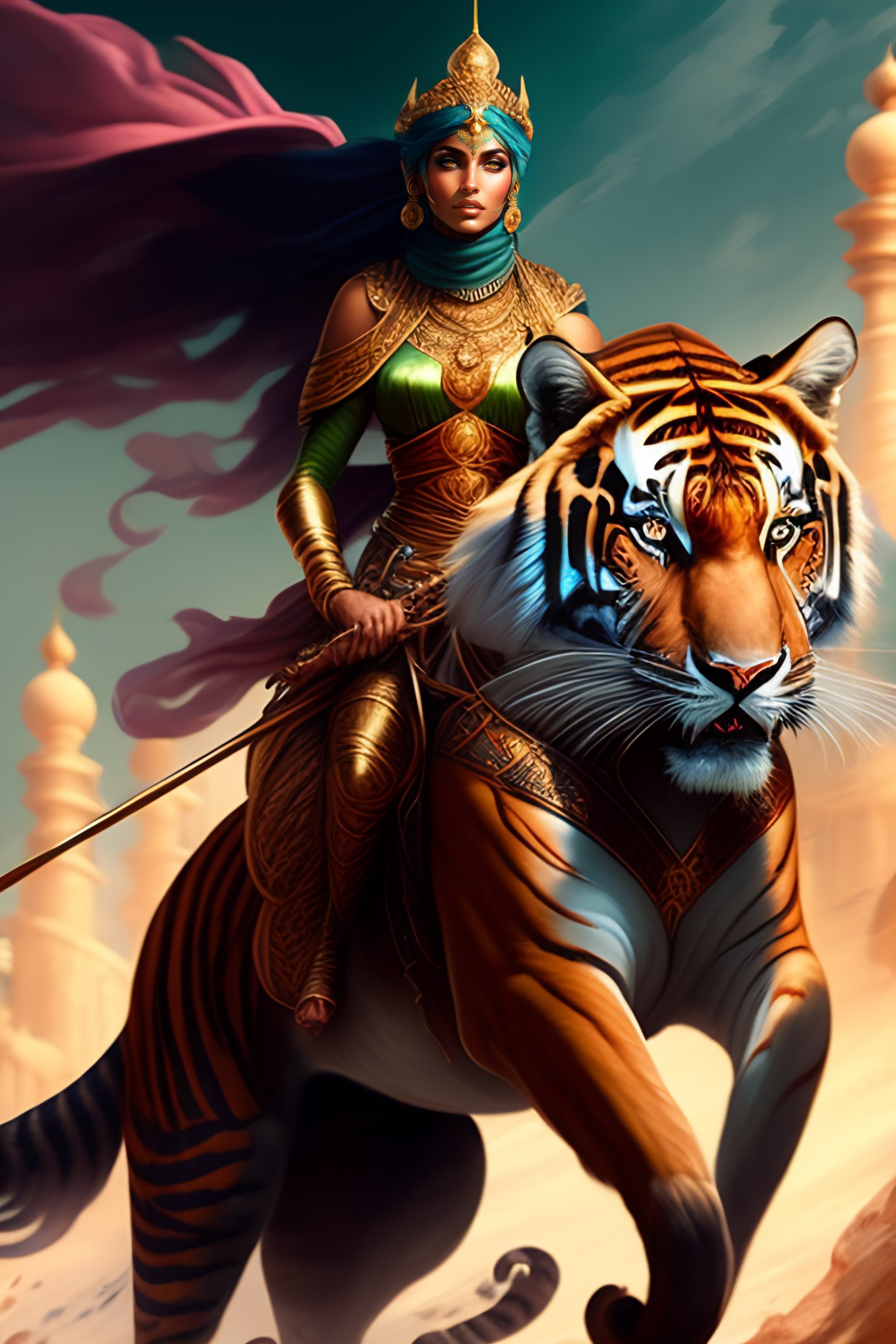Image of arab goddess riding tiger, d & d, beautiful, renaissance, fantasy, intricate, elegant, islamic, highly detailed, digital painting, artstation, concept art, smooth, sharp focus, illustration, art by artgerm and greg rutkowski and alphonse mucha