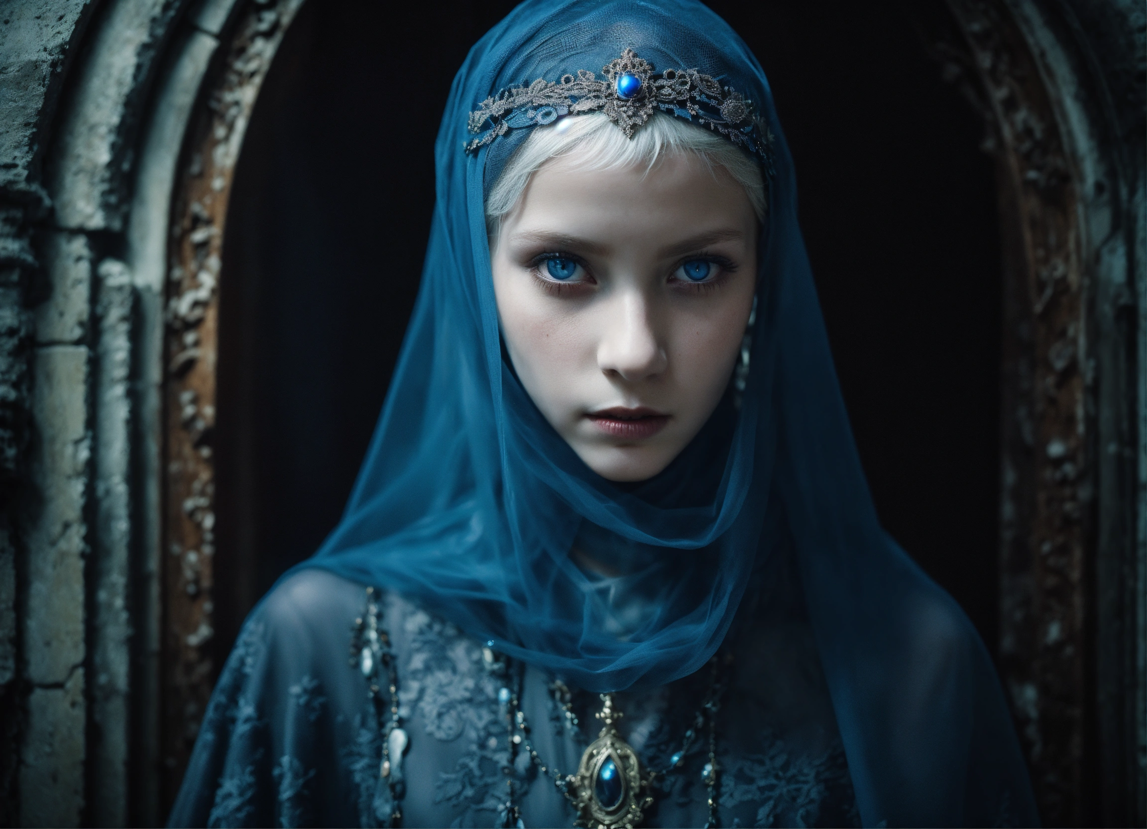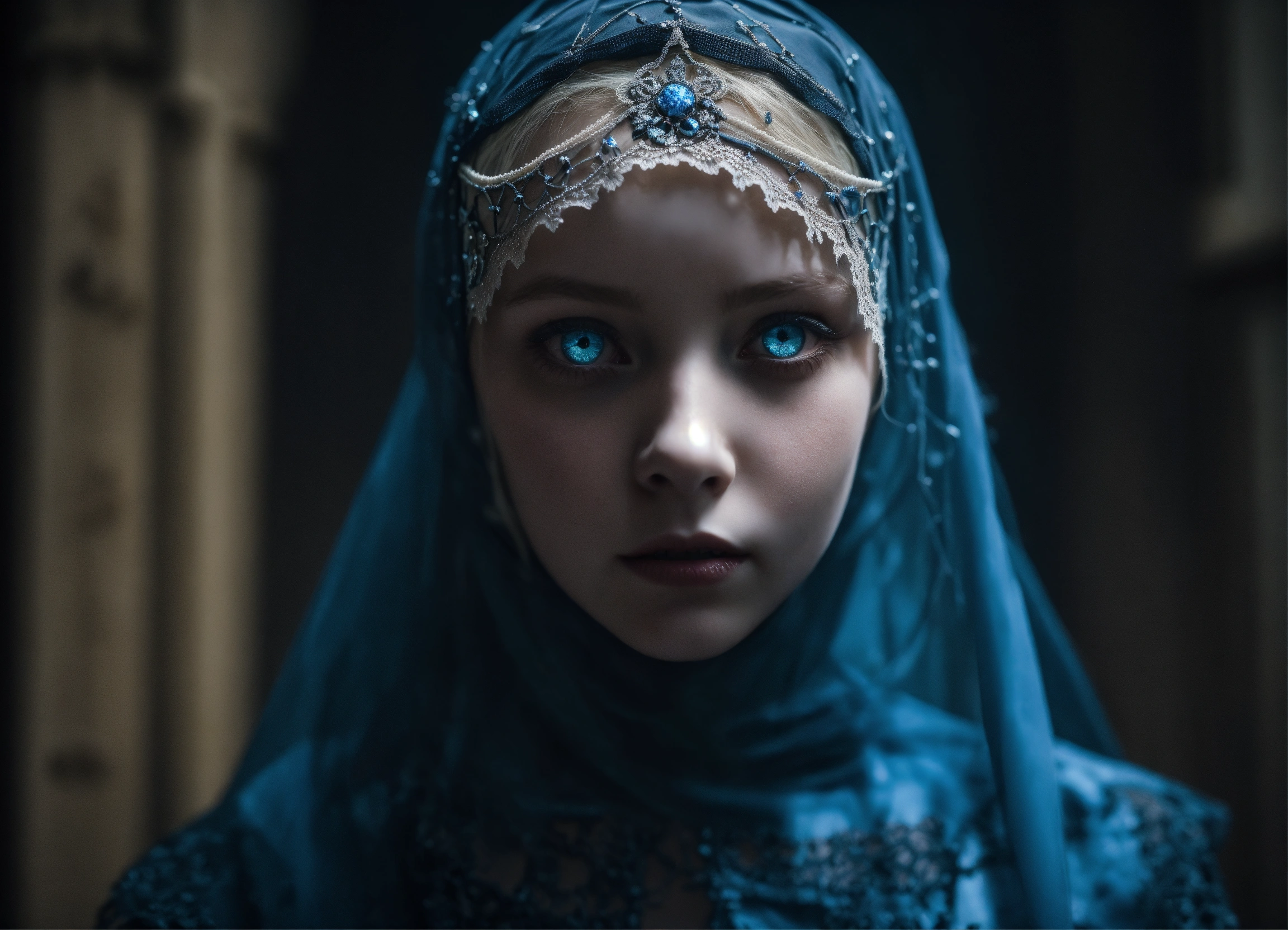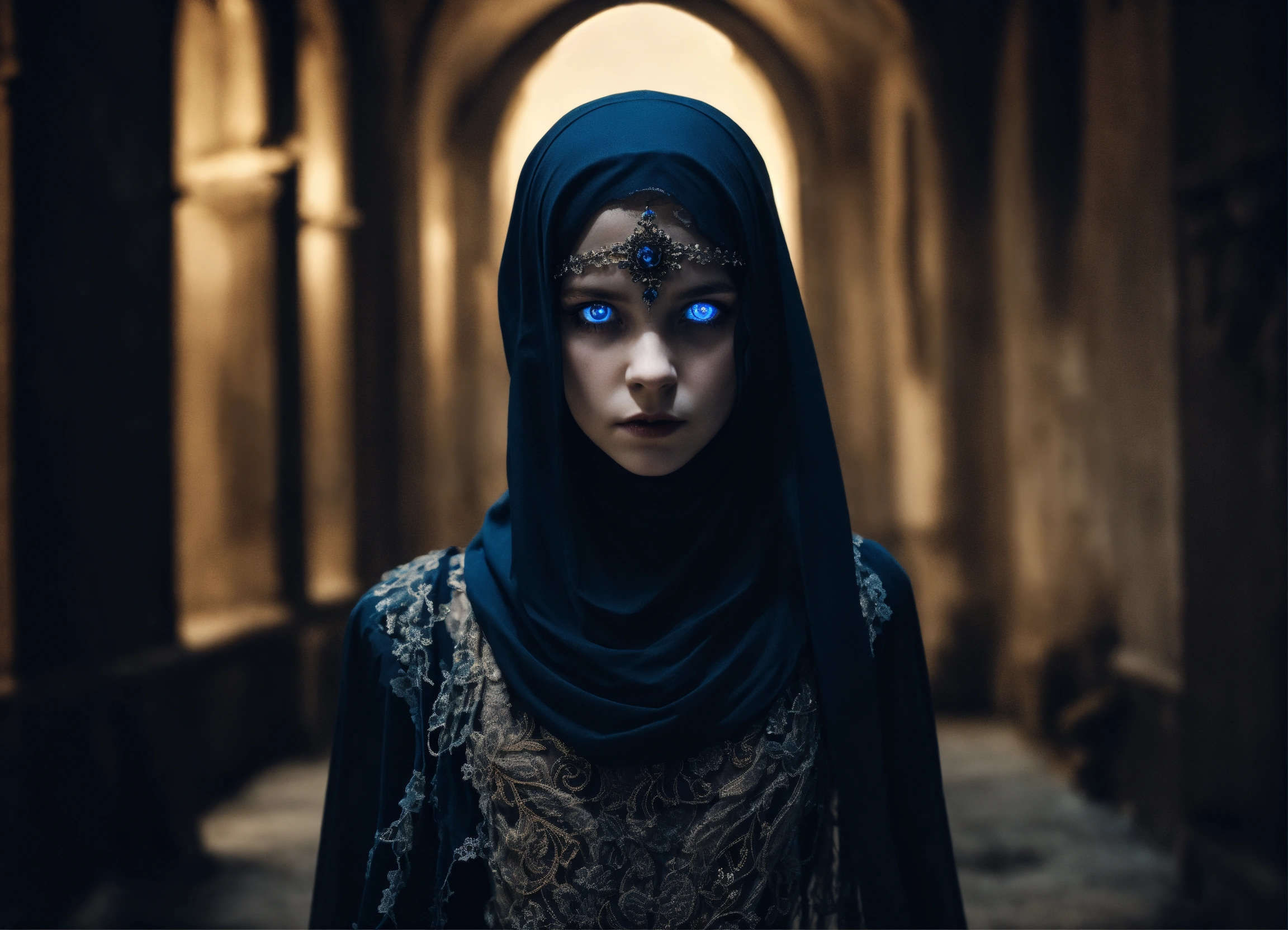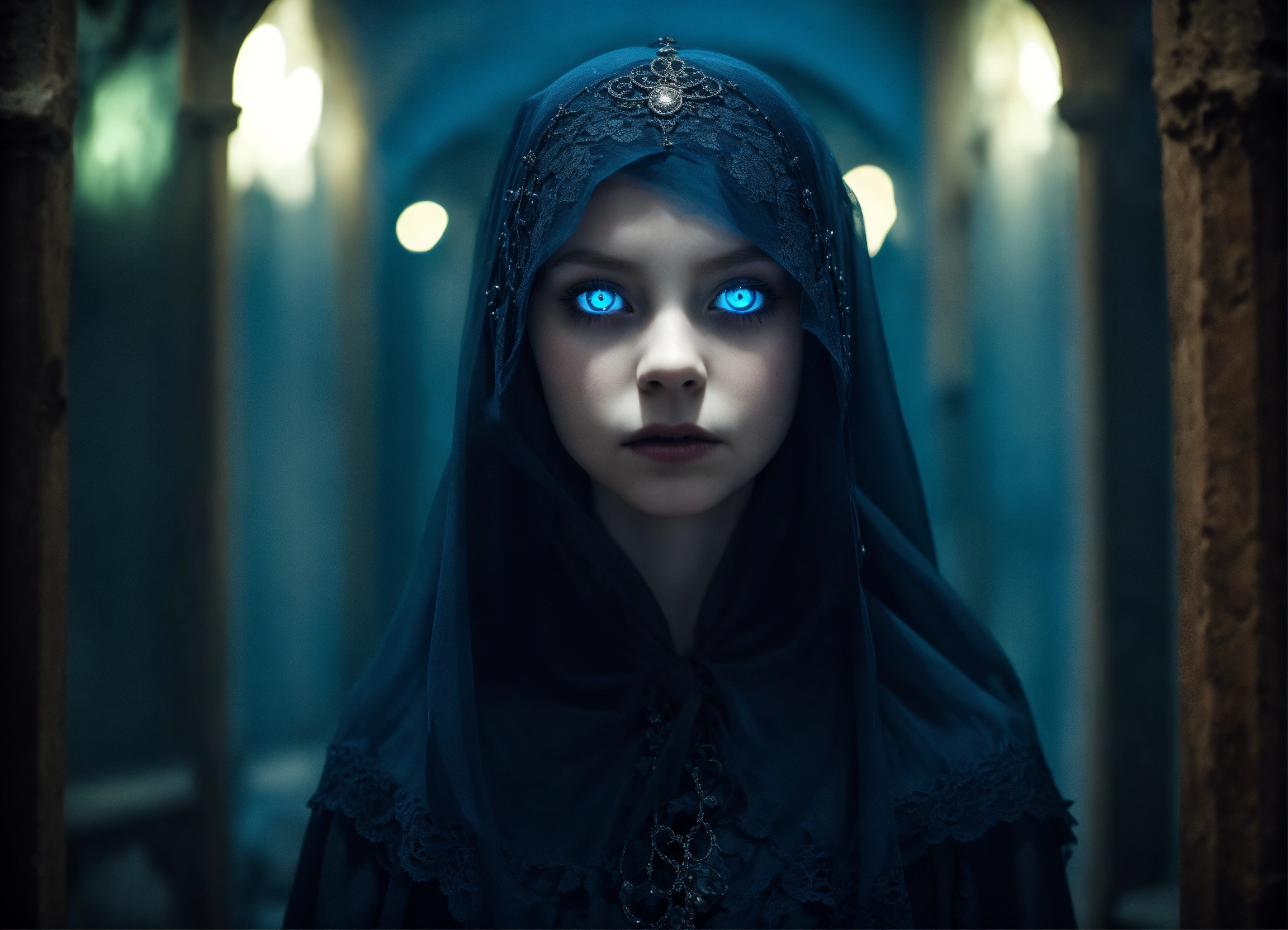 Body portrait of a very childish deadly pale ultra slim twelve year old female child, she is a ultra skinny goth necromancer with waist long silverwhite hair, lace niqab, face veil, narrow clothing, ultra skinny, ultra slim body, ultra emaciated body, completely emaciated, ultra narrow face, alabaster skin, pale as a corpse, glowing blue eyes, ultra slim face, innocent looking, in a gloomy crypt, lasziv, kindlich, unschuldig, childlike, graceful, wispy, glowing blue eyes, ghostly, dead, evil, demonic, undead, darkness, grotesque, mysterious, dark, cold ambient lighting, extremely detailed, fantasy, medieval setting