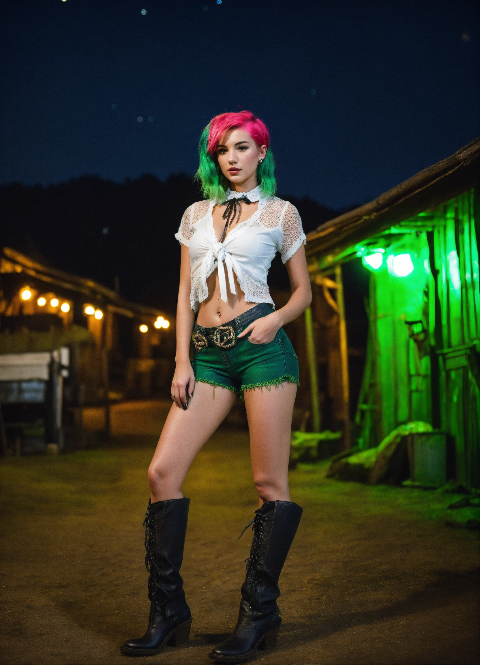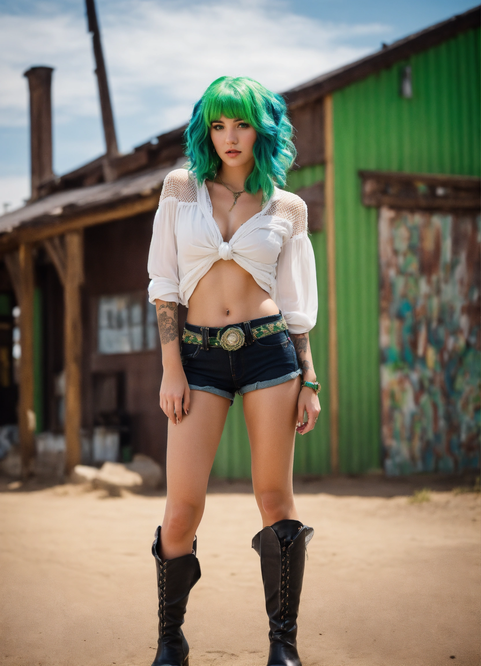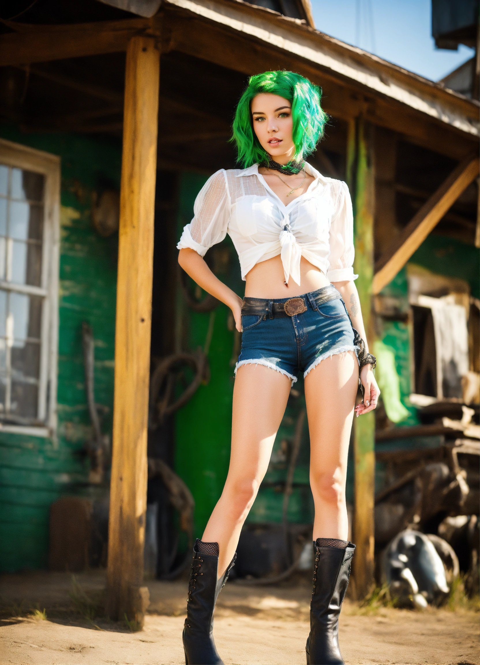 A real photo of a hot 25 year old cowgirl with bright green hair. she is wearing a white knotted fishnet blouse, tight short black denim hotpants and a leather had. she stands in a very old western alien town