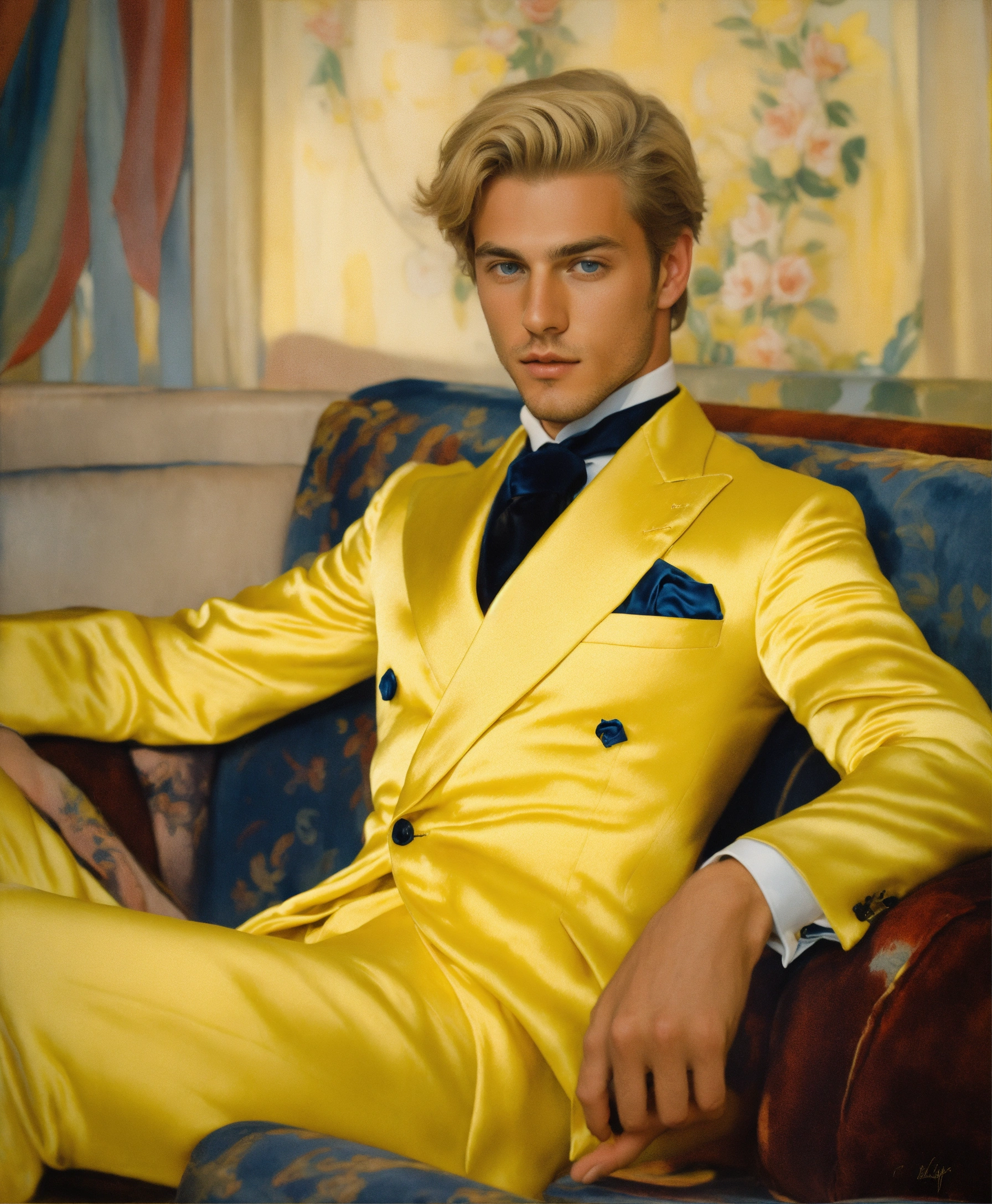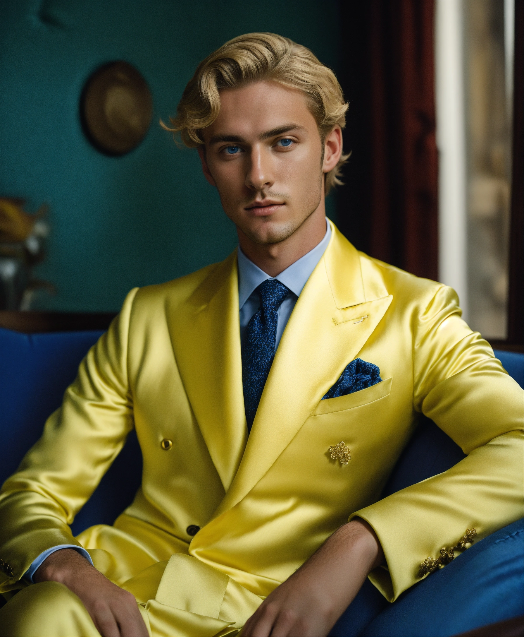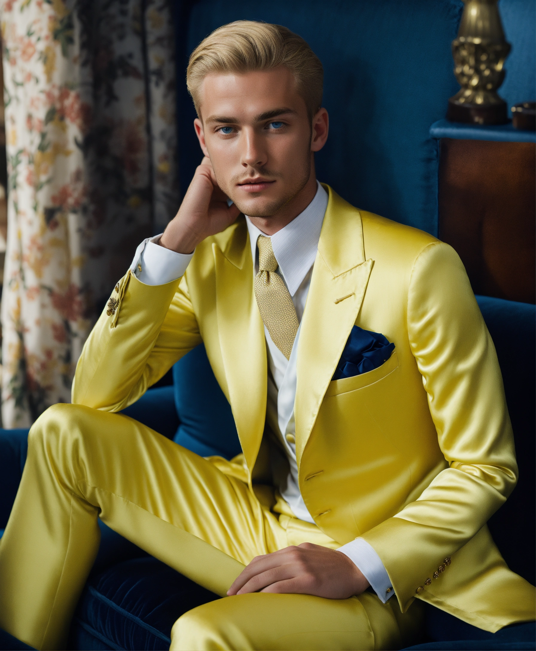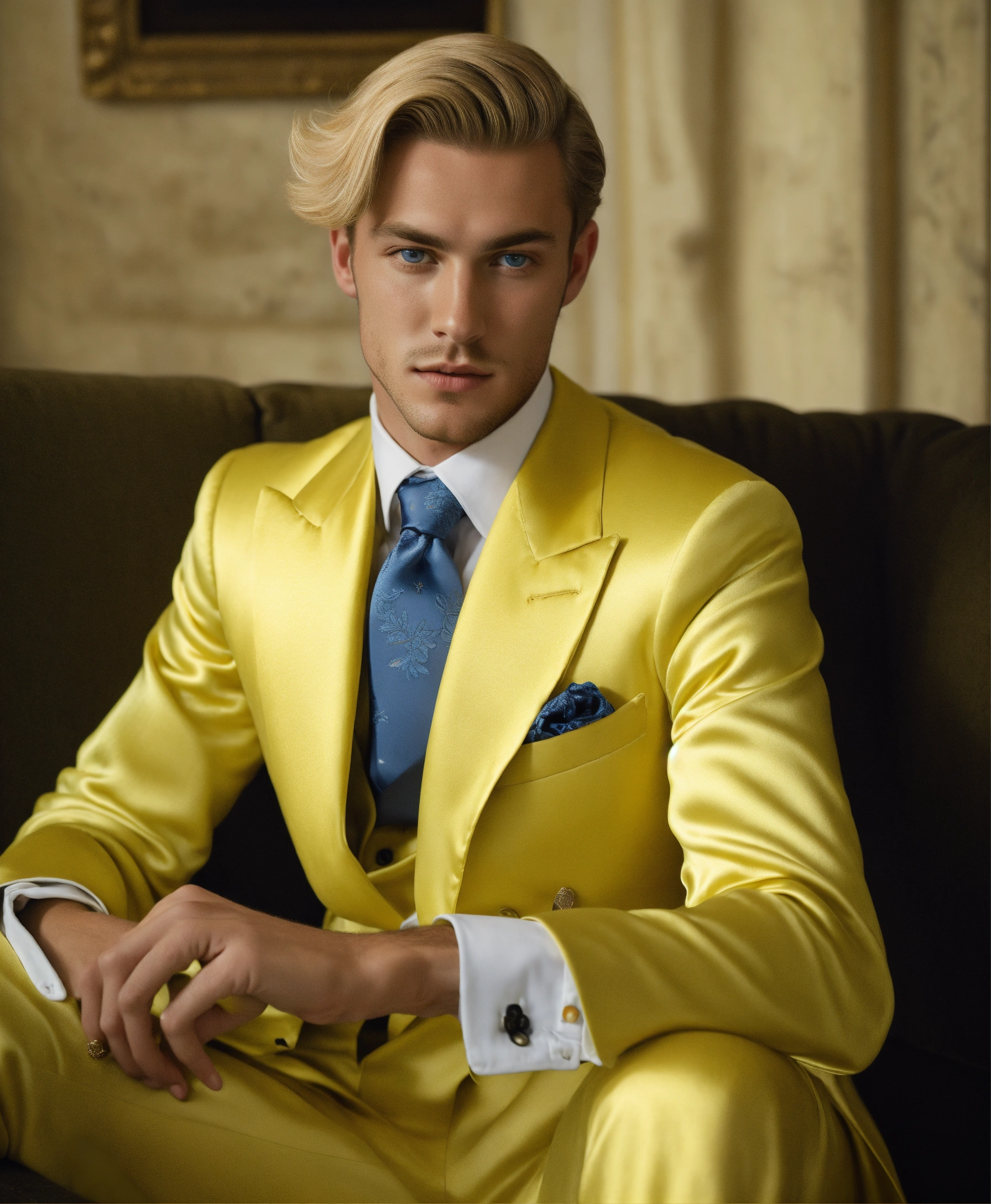 A young blonde italian gentleman in lemon satin silk suit, blue eyes, brushed hair, seating on a sofa