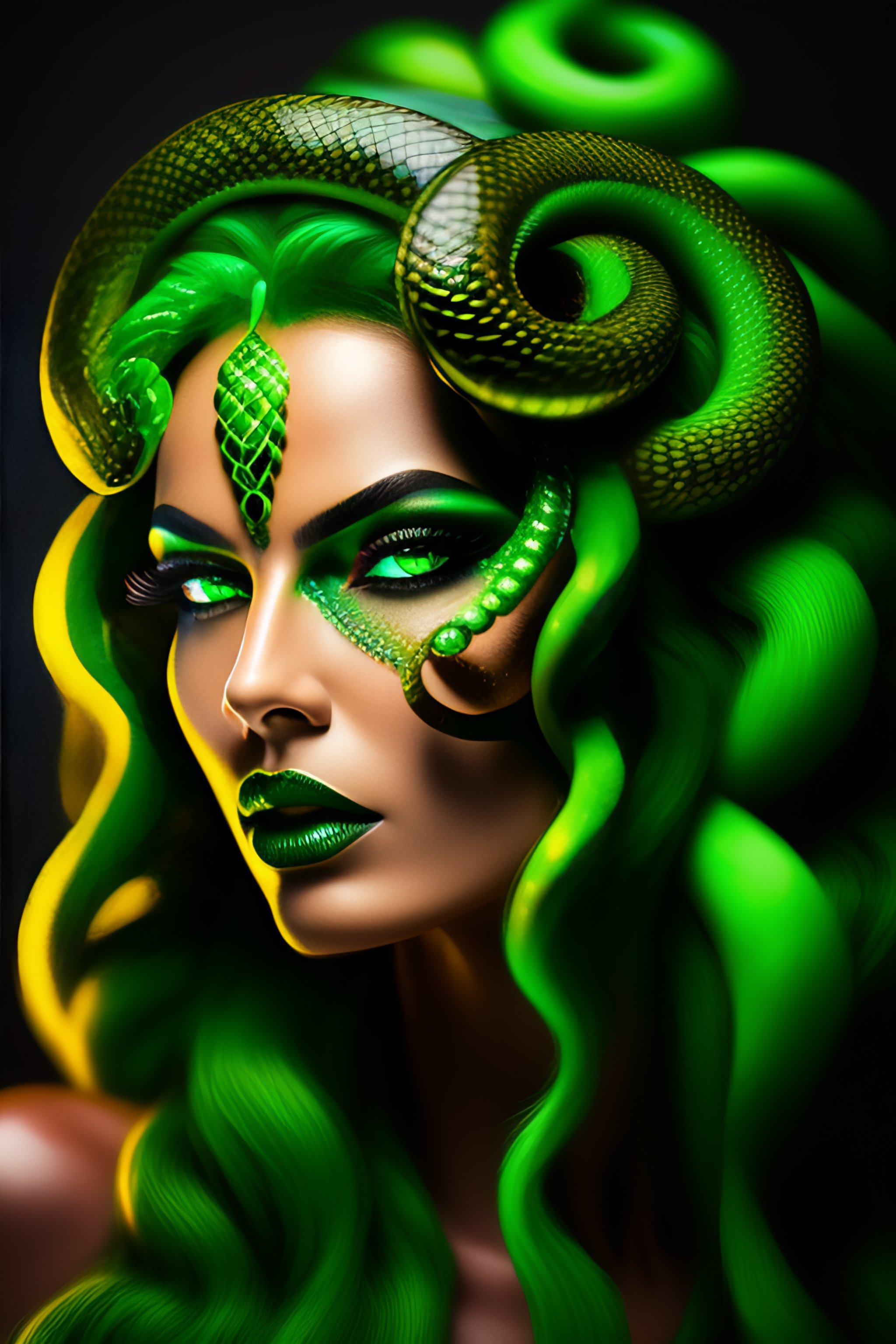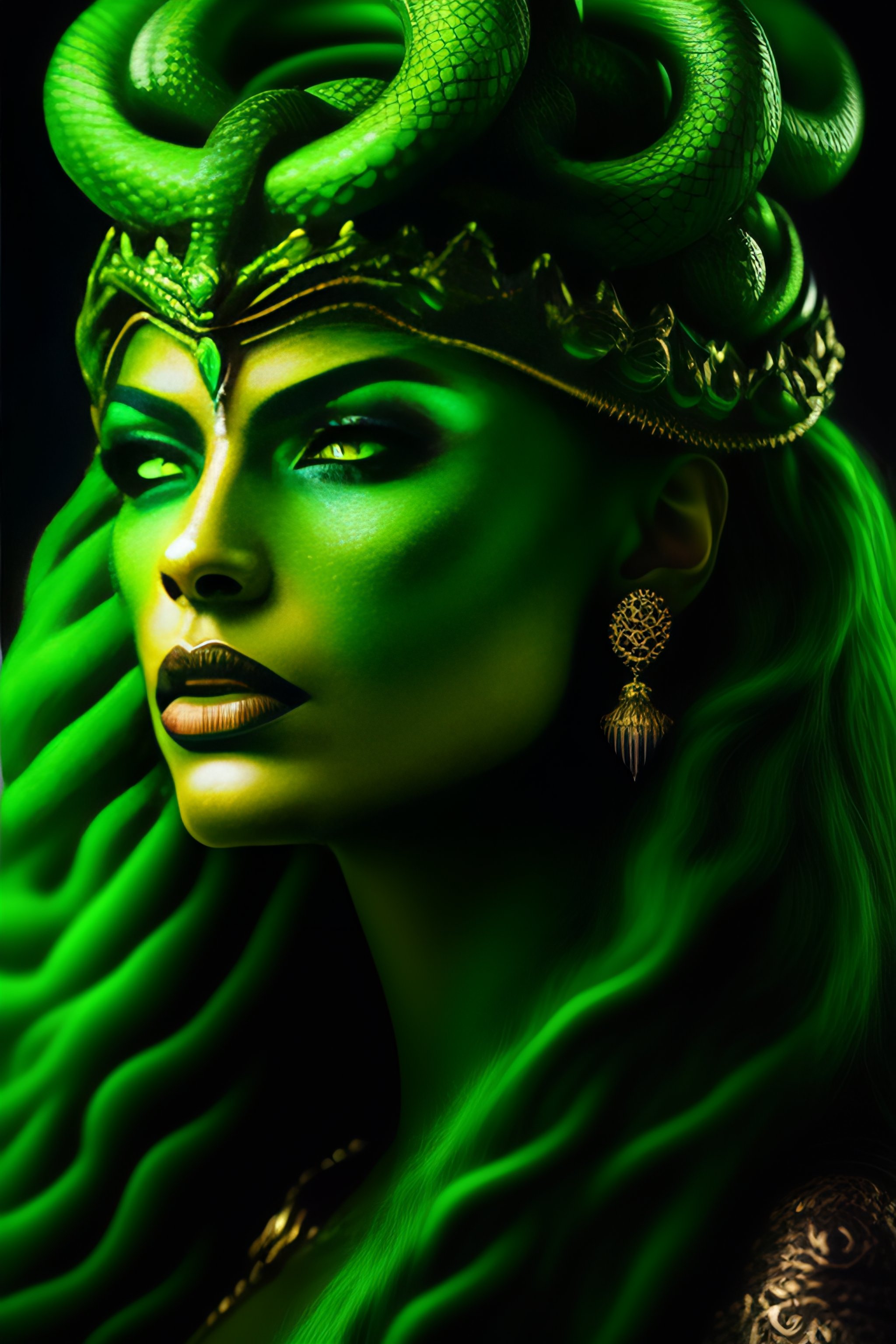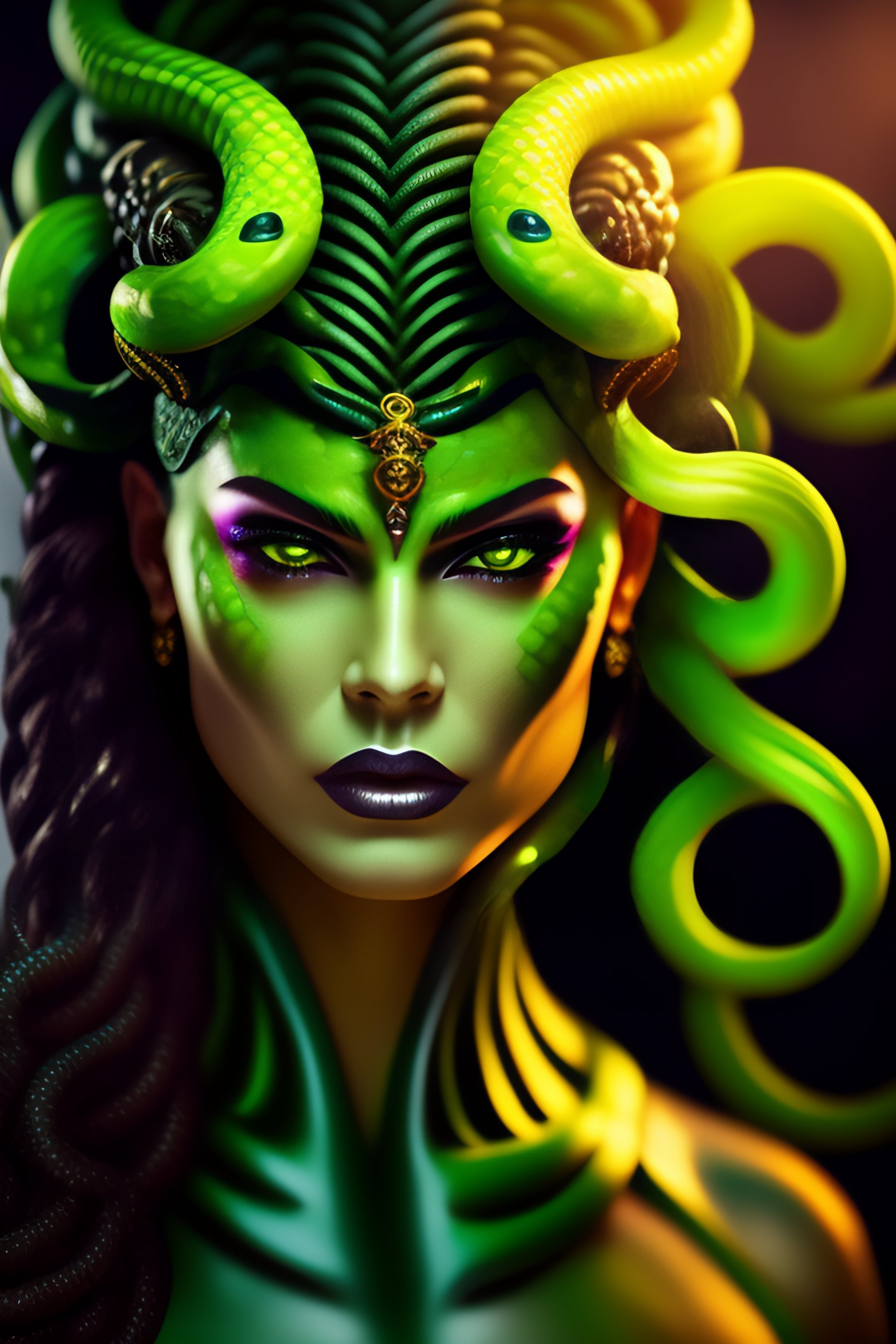 Very upclose portrait of medusa gorgon with a very aggressive and evil face, many green snakes instead of hair, foggy eyes, fantasy style, evil, aesthetically pleasing color scheme, sharper curvatures