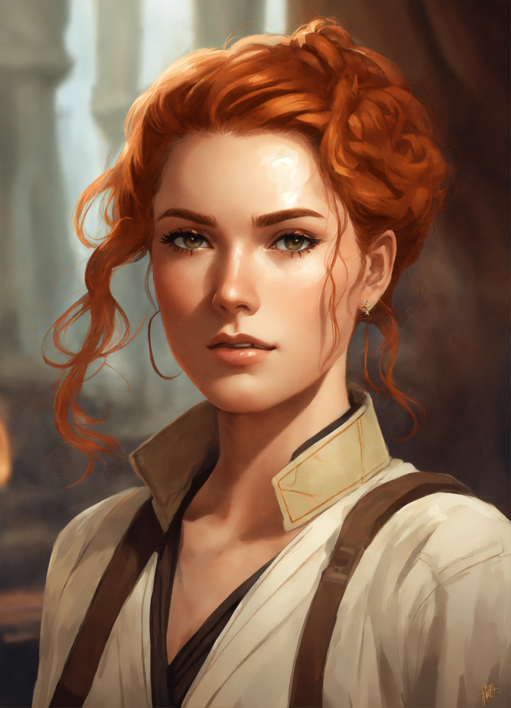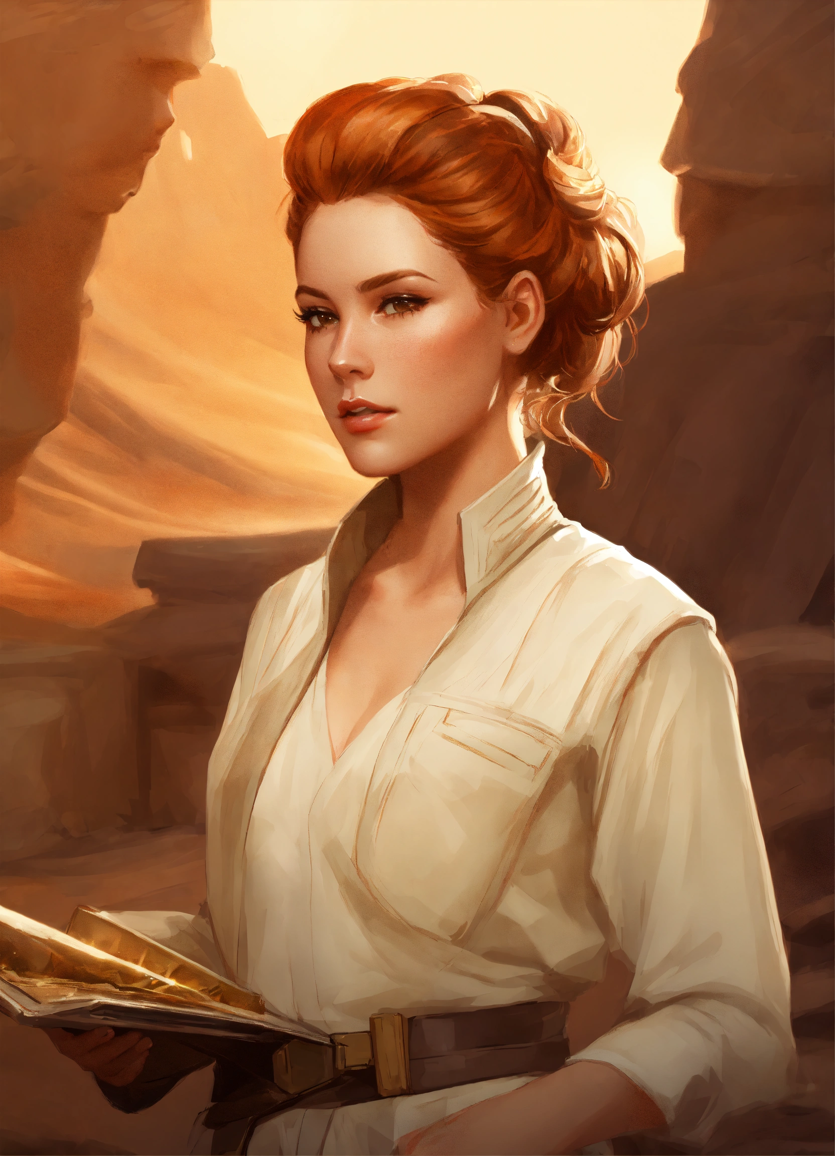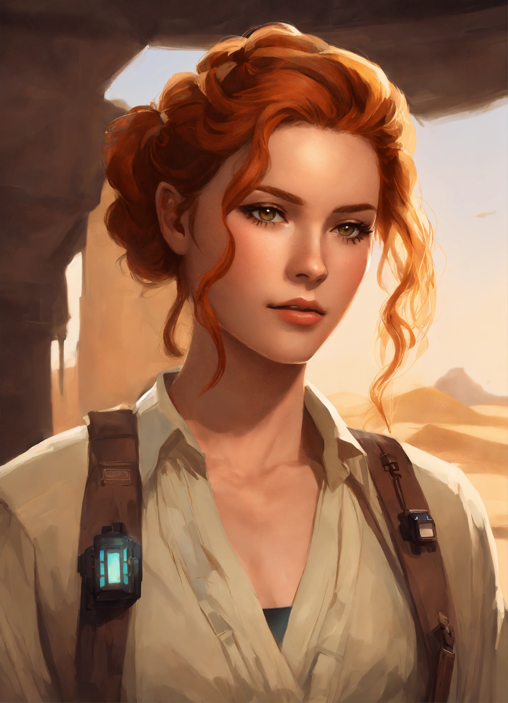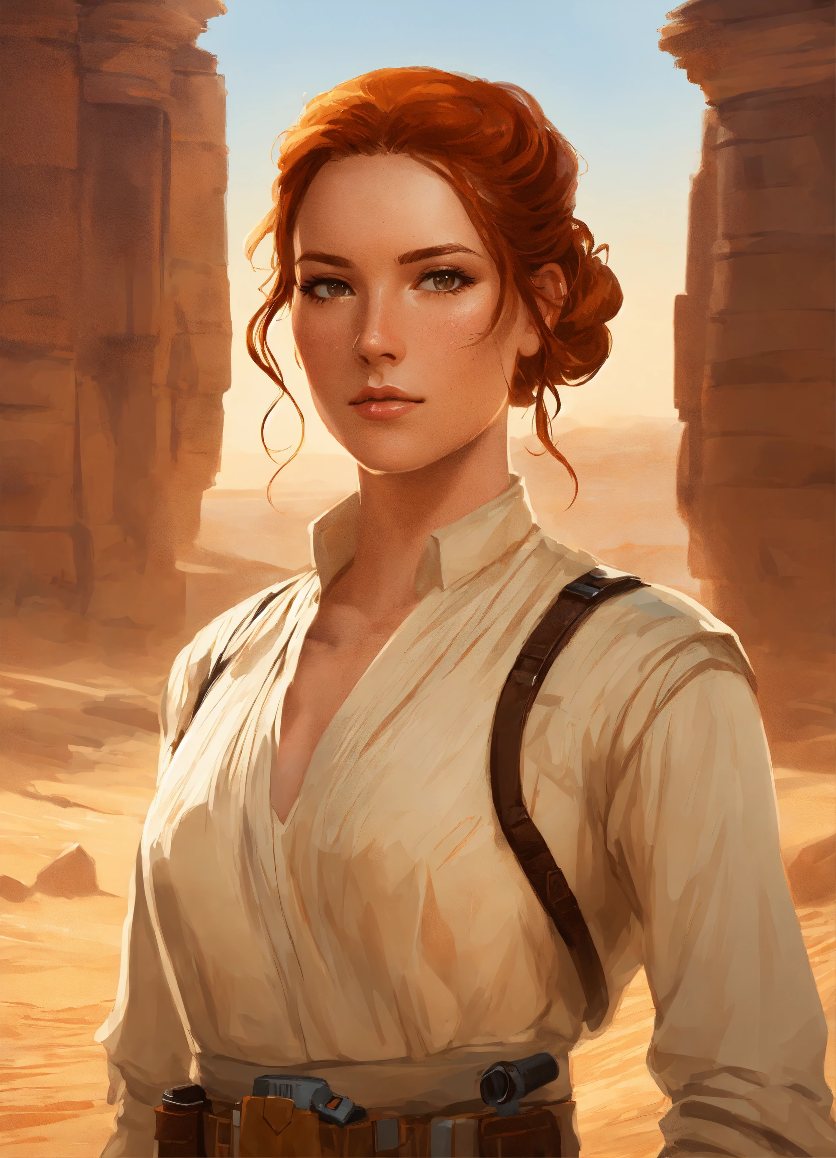 A digital character art portrait of a stunningly gorgeous star wars archaeologist woman with coiffed ginger hair, in a loose off-white blouse.