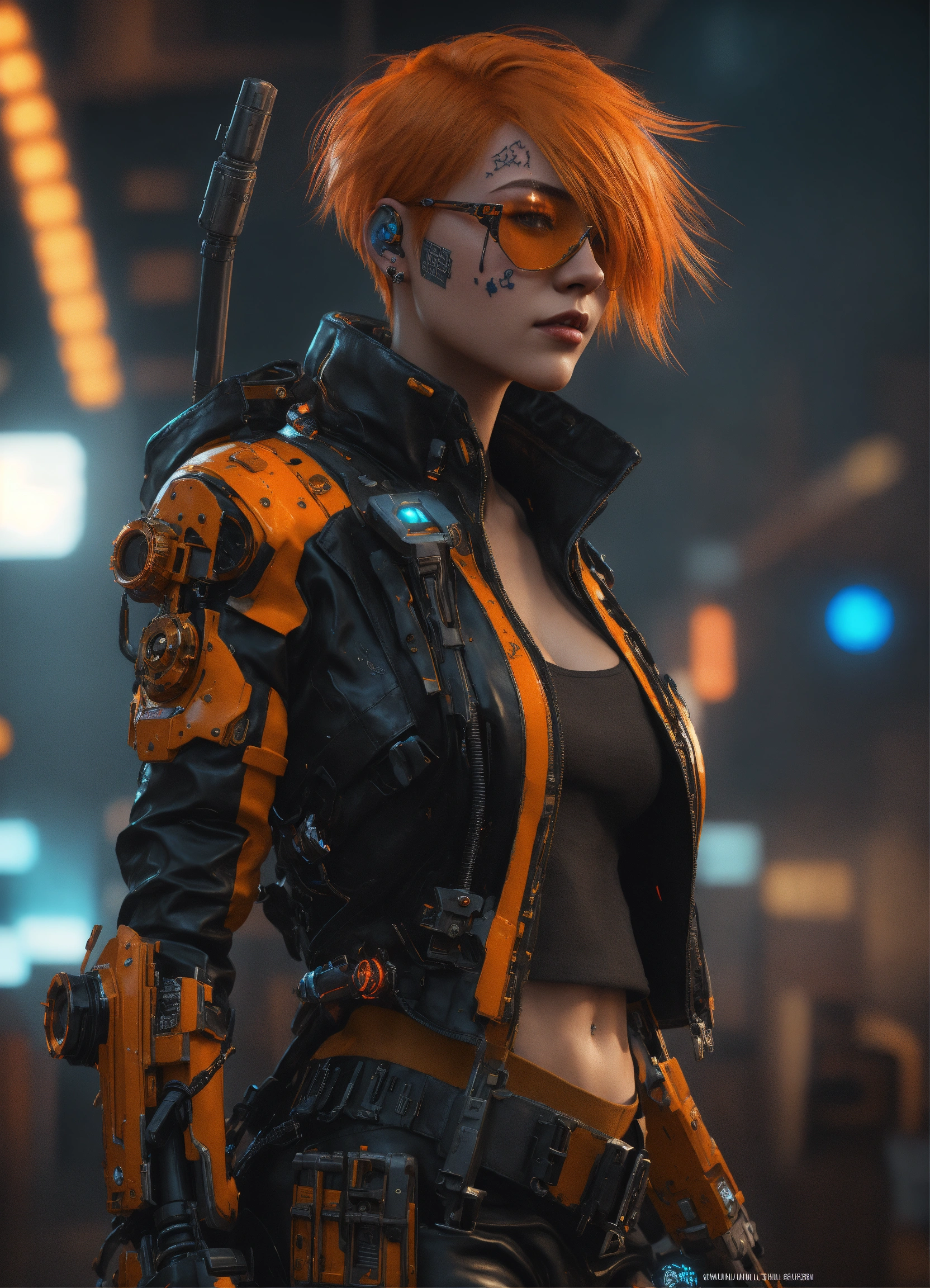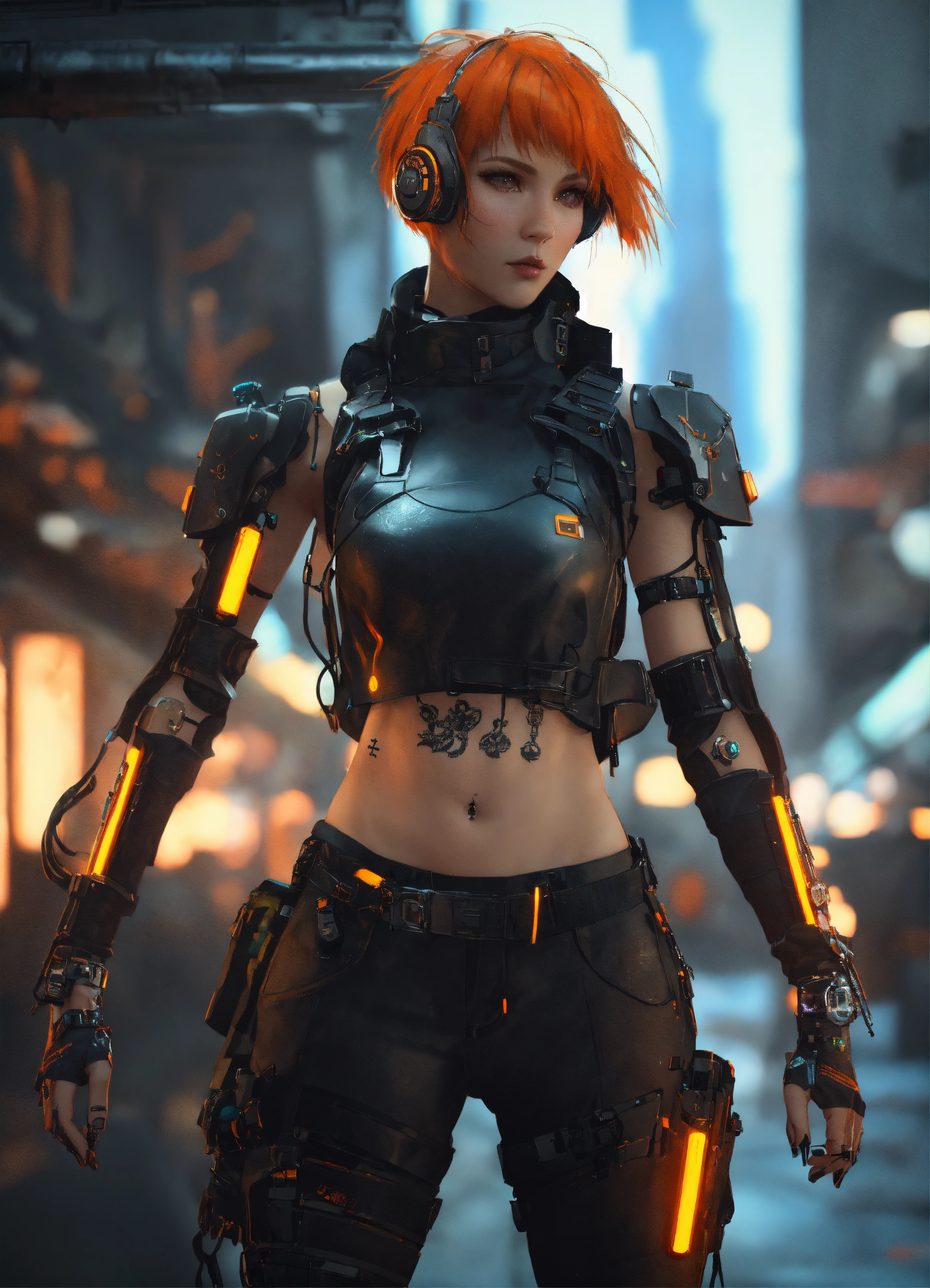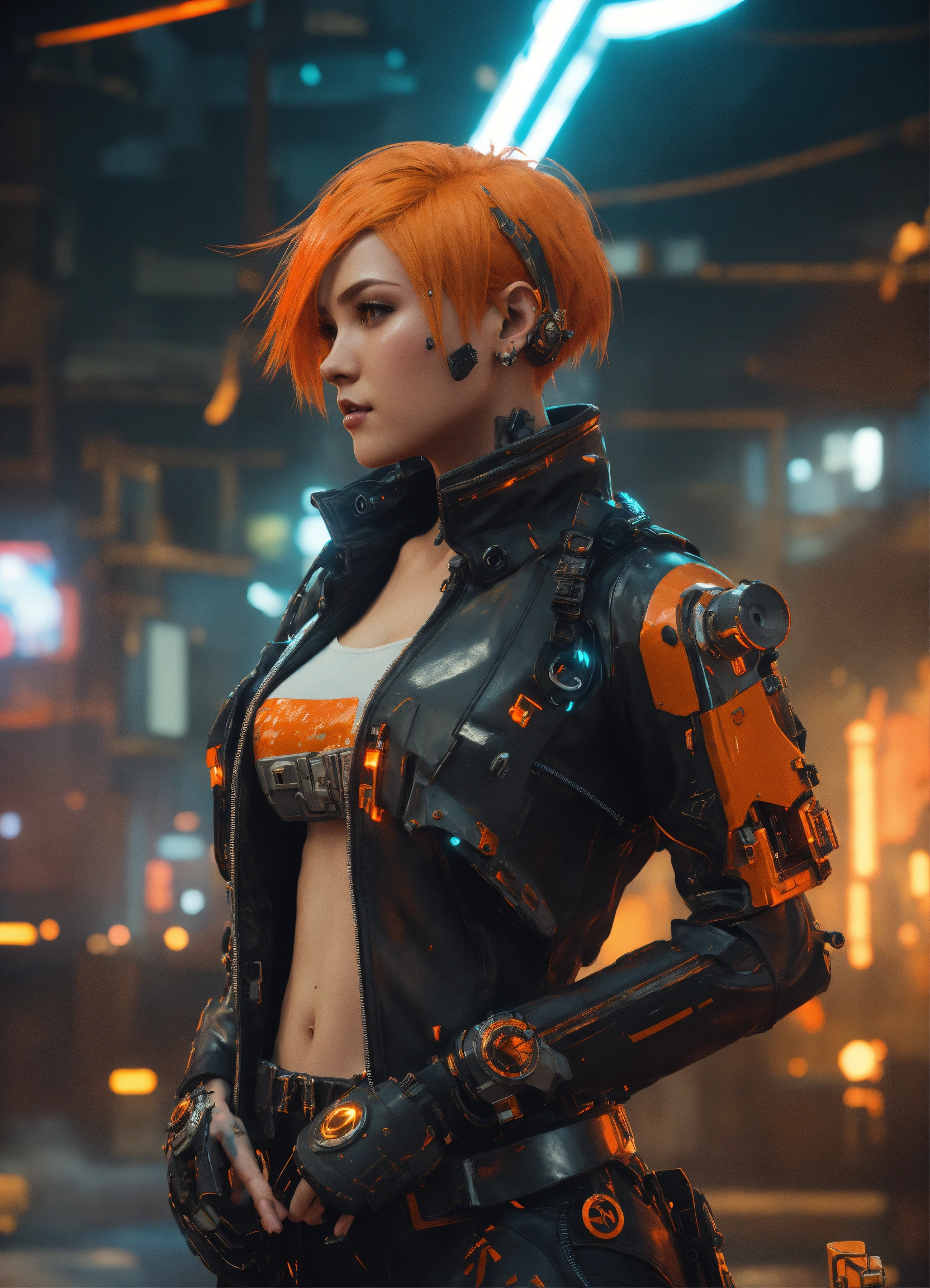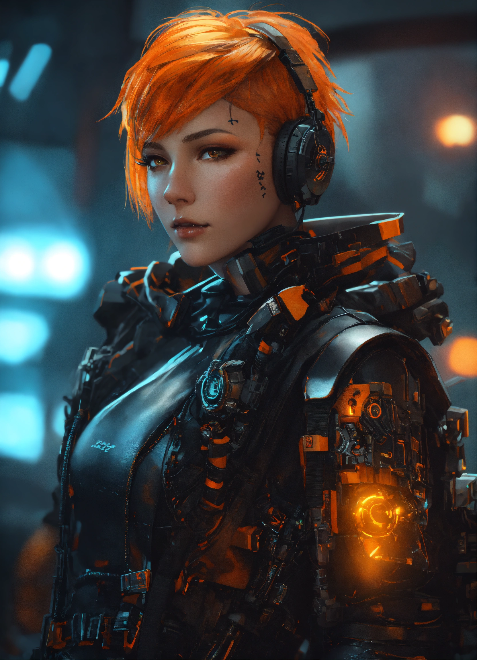 Mech punk clothes with short orange hair girl, tattooed, piercing, complex black leather, carbonfiber, battle status, hyper detailed, digital art, cyberpunk style, cybercinematic lighting, studio quality, smooth render, unreal engine 5 rendered, octane rendered, art style by klimt and nixeu and ian sprigger and wlop and krenz cushart