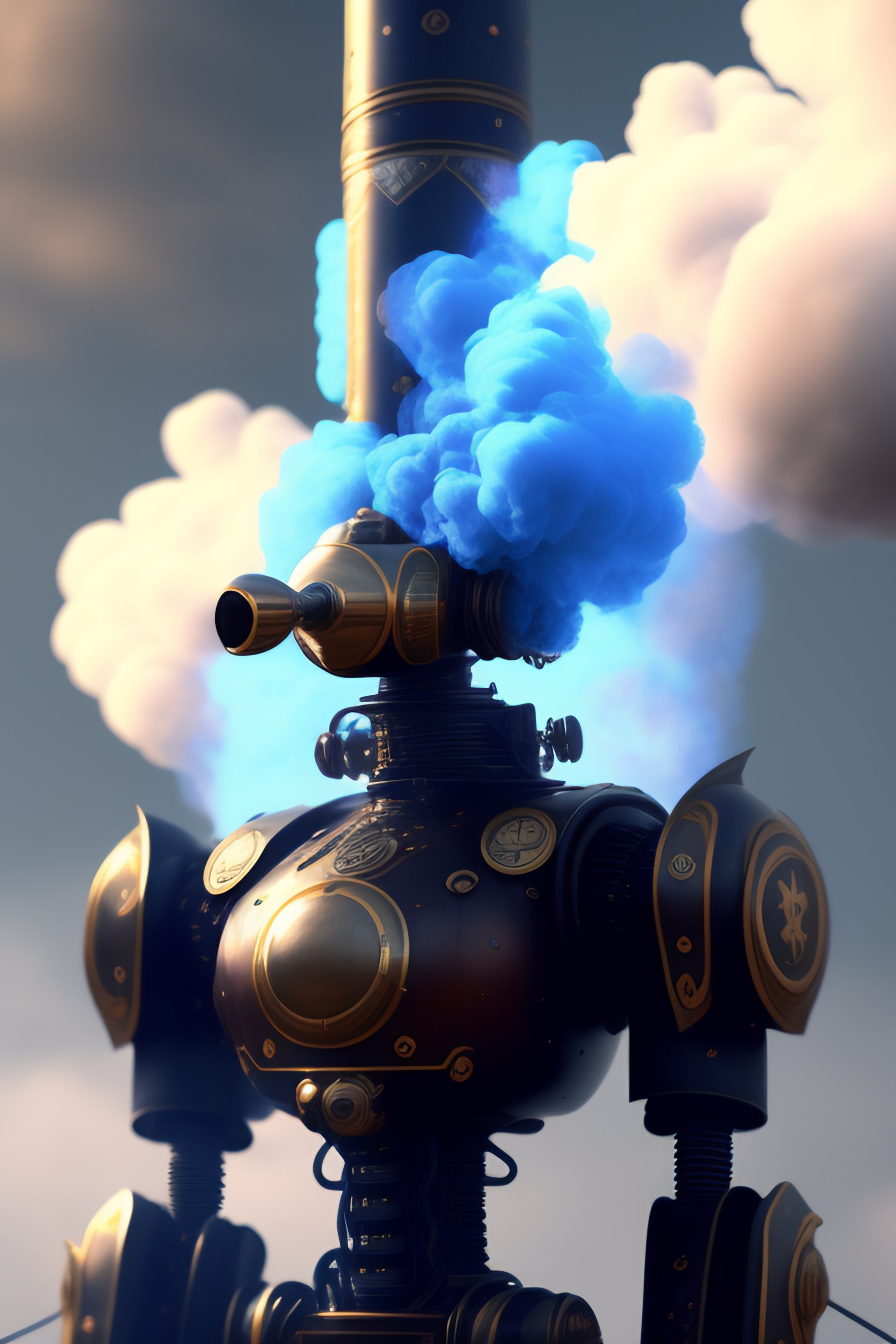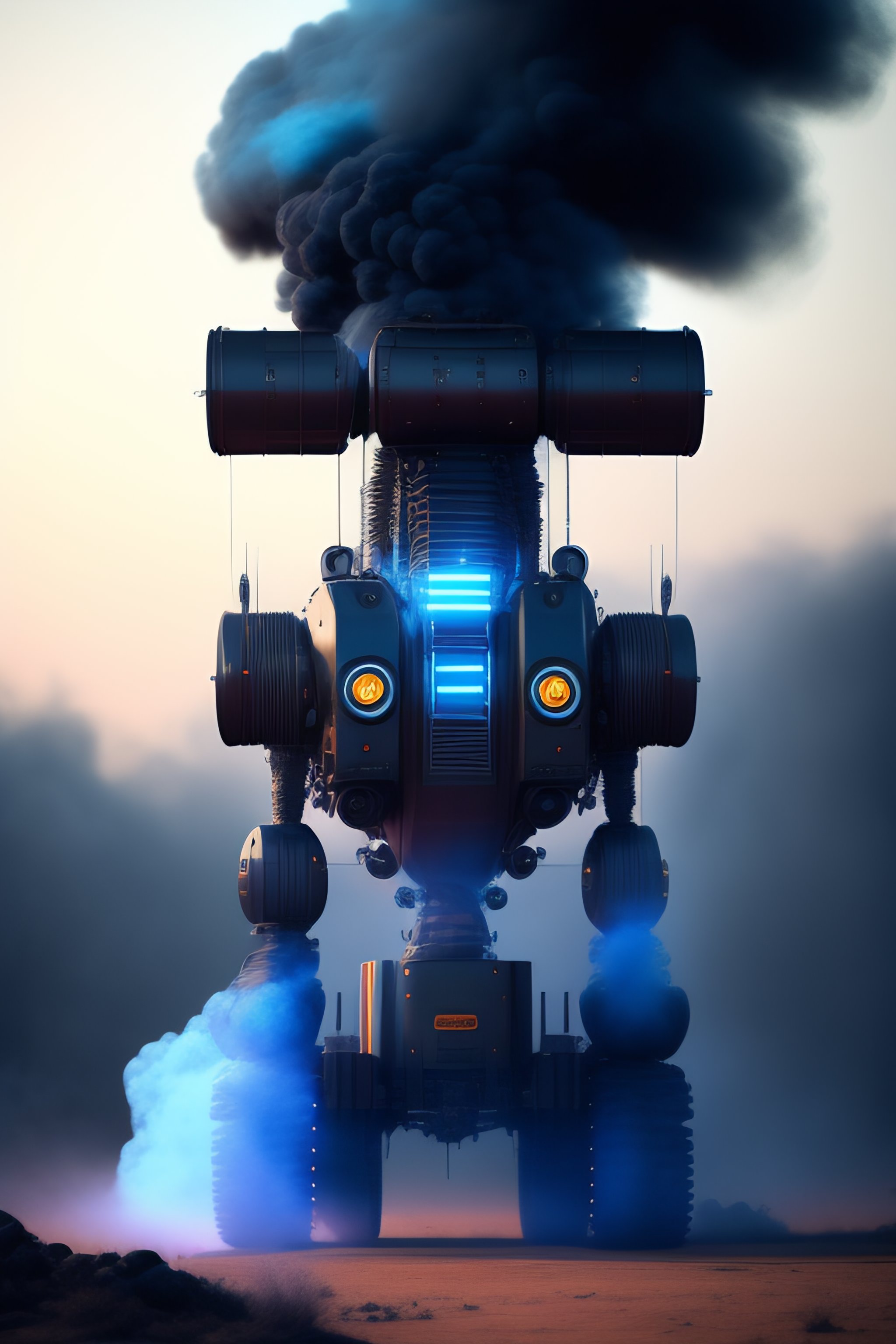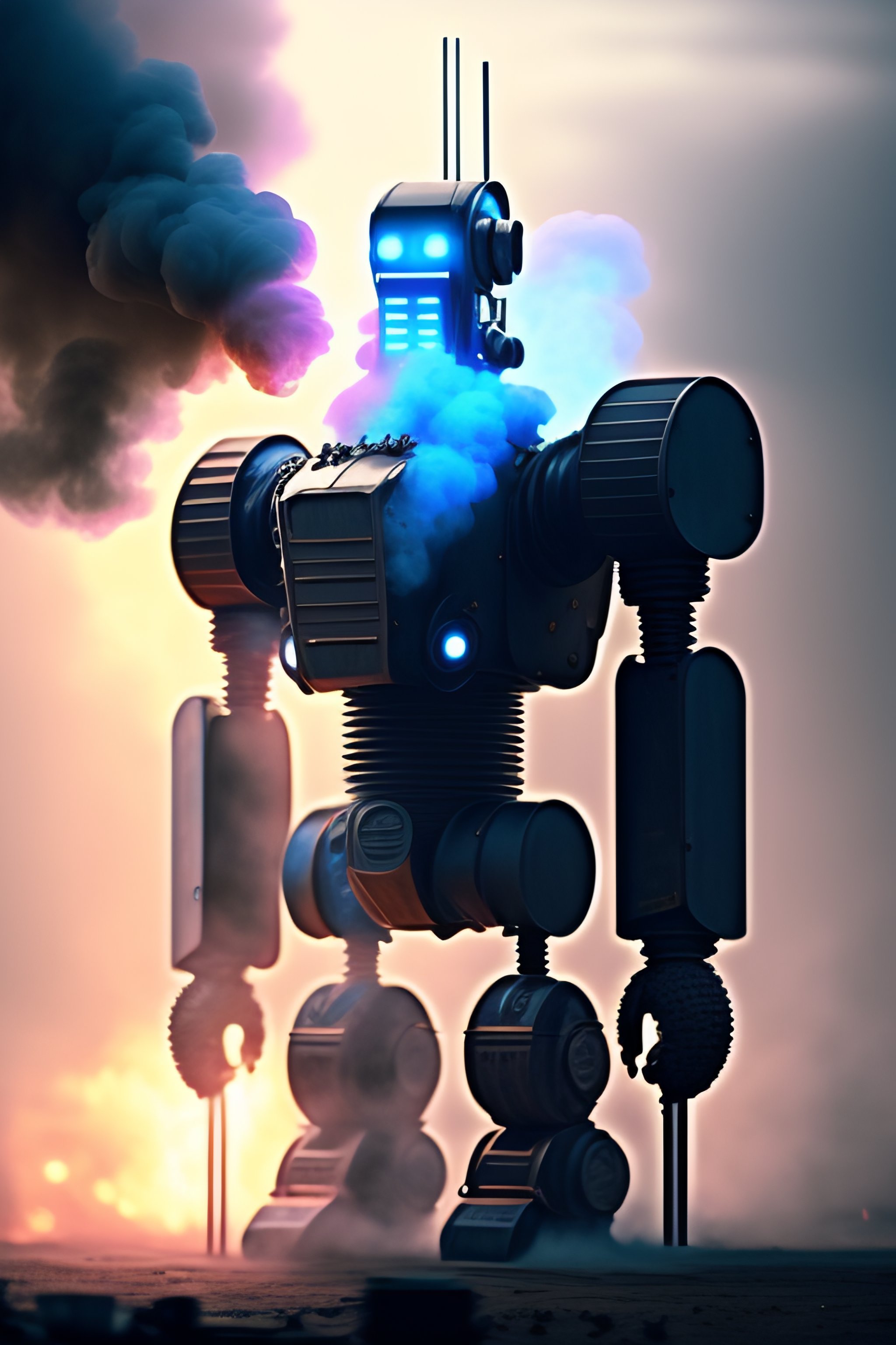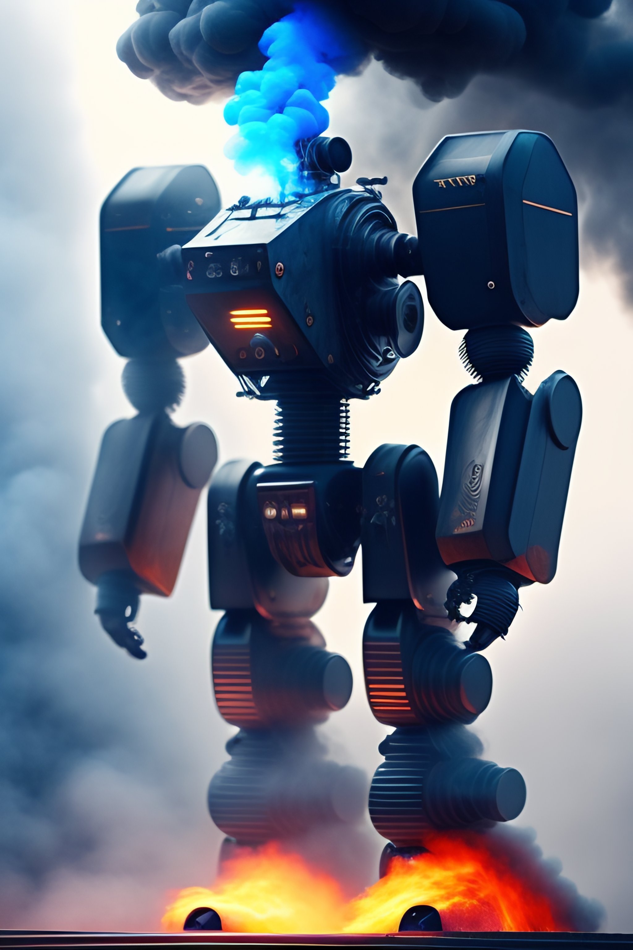 Happy agressive tall robots lots of blue smoke and realistic detail light