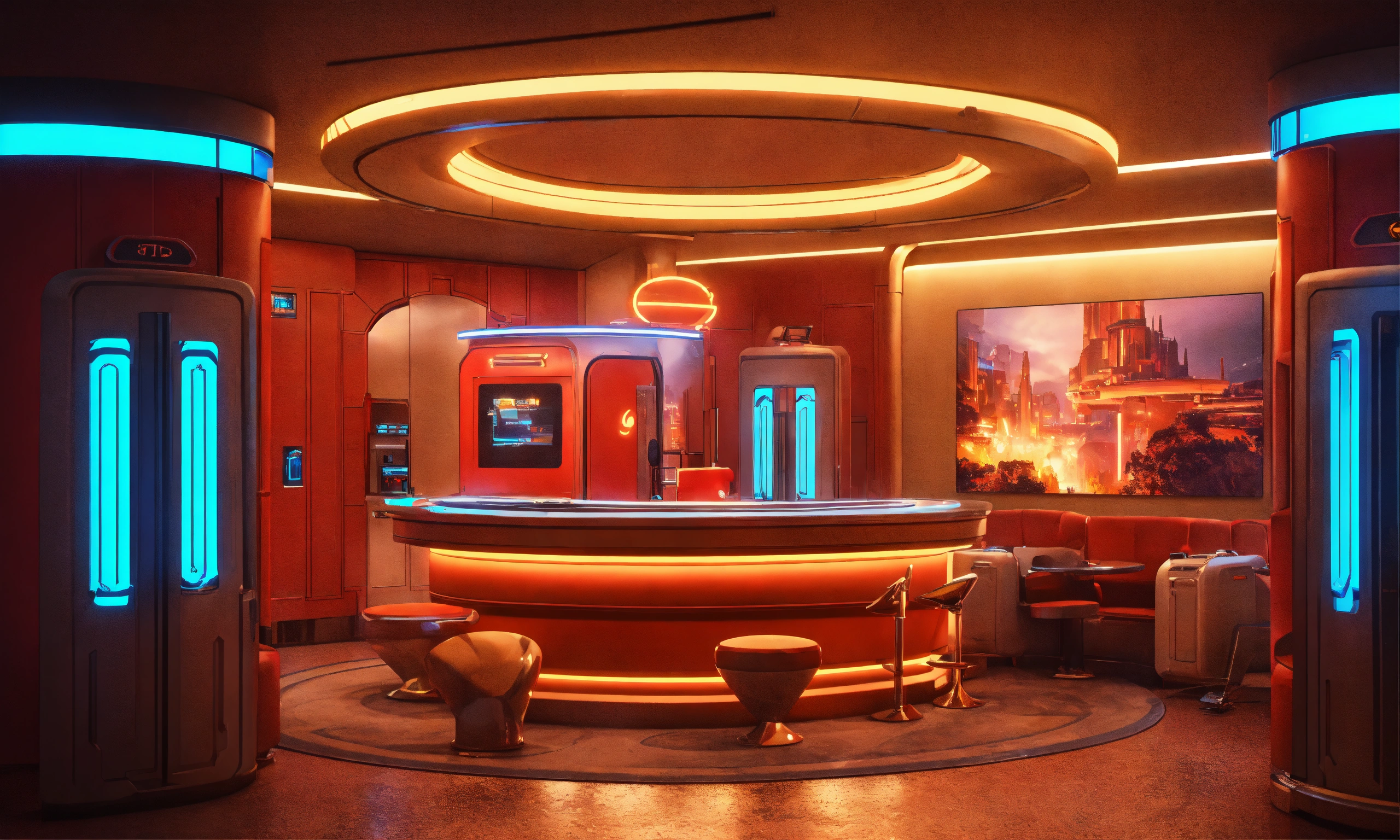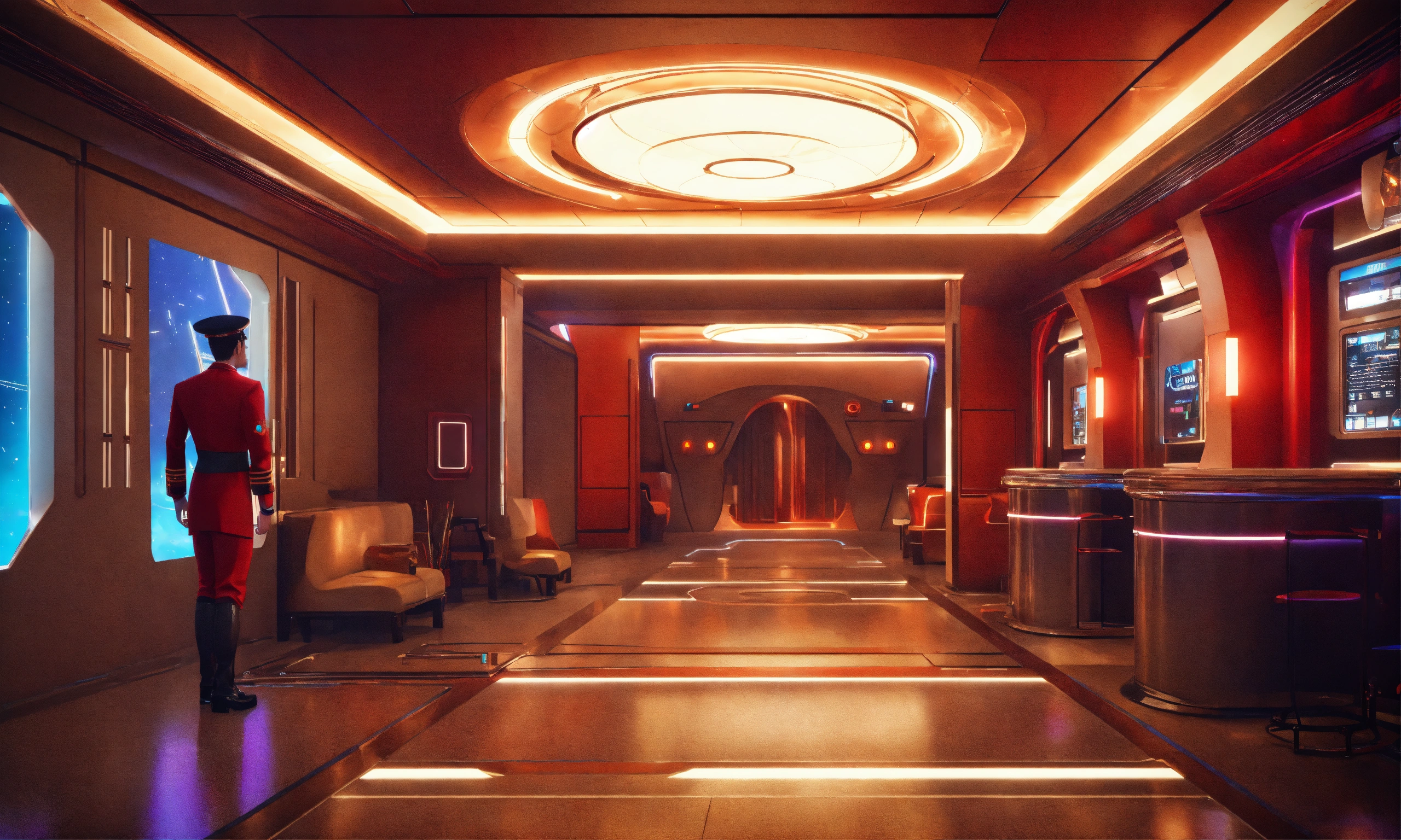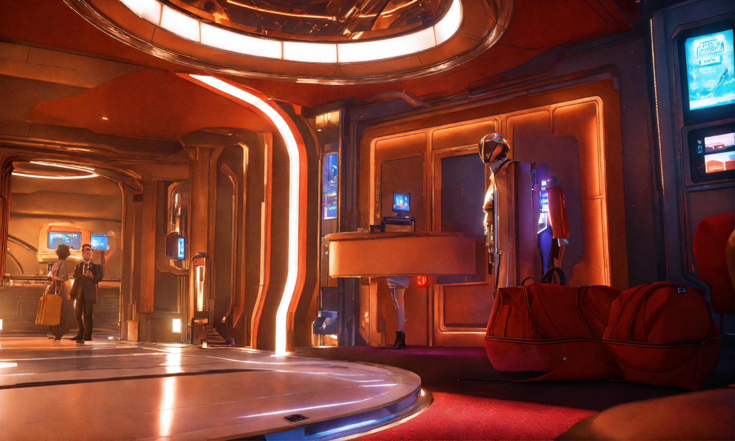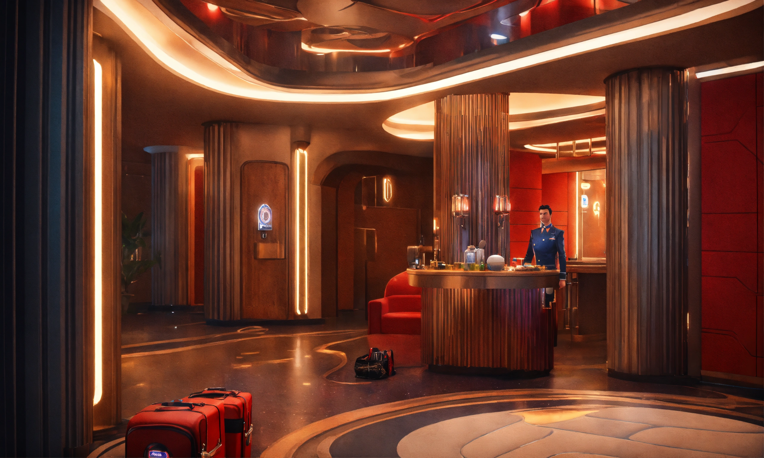 A hotel strange space hotel bellhop greets and ask to take your bags, realistic, futuristic, sci-fi, 8k, unreal engine, 8k realistic, pixar, disney, cartoon, unreal engine, 3d, sci-fi