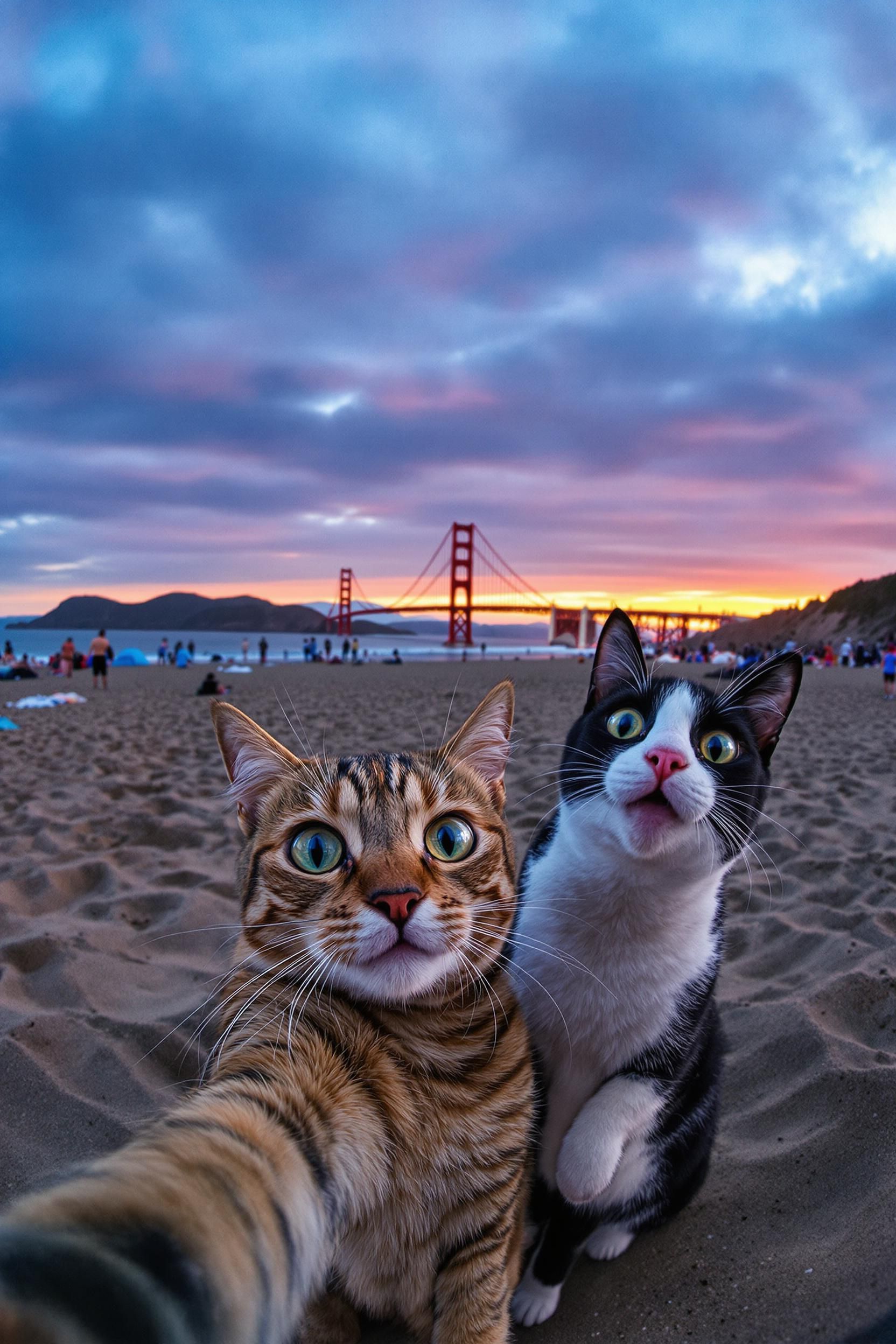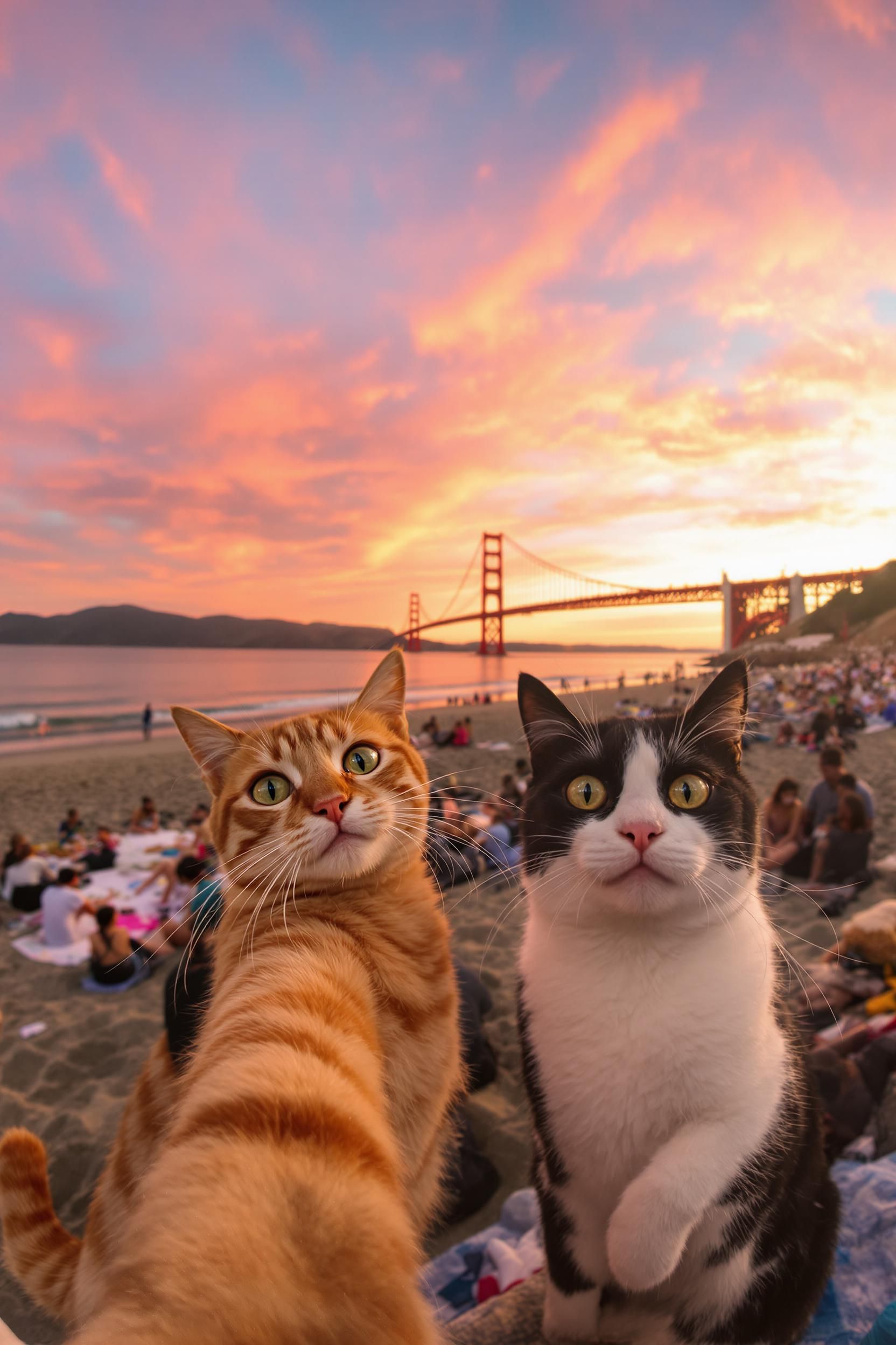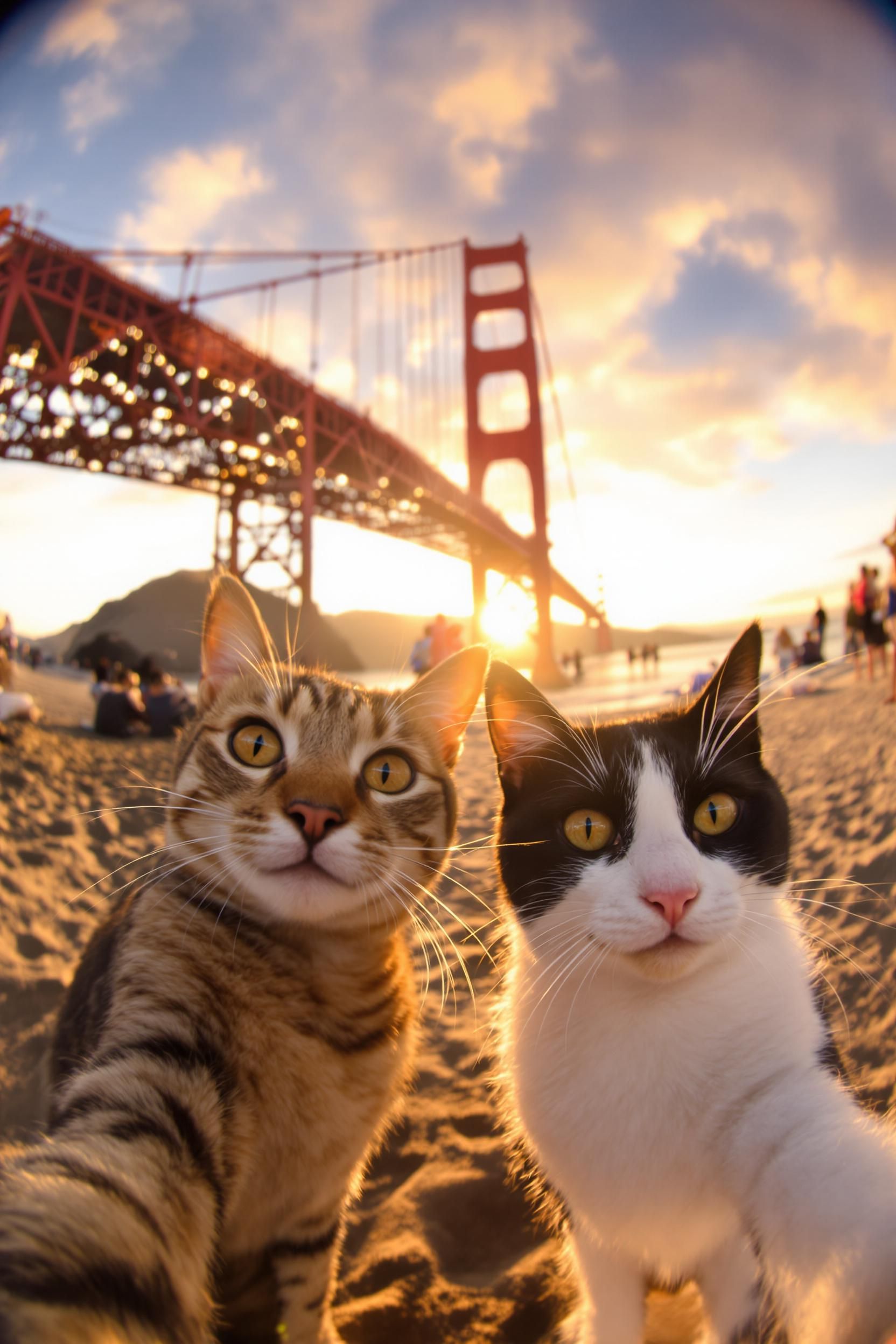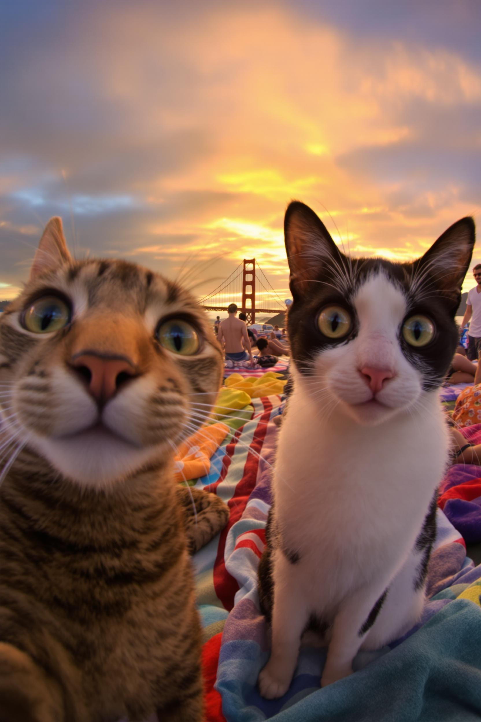 The image shows a sunset scene at baker beach in san francisco, with the golden gate bridge prominently in the background. the beach is populated with people sitting and enjoying the view, bathed in warm, golden light. in the foreground, two cats—one tabby and one black-and-white—appear out of focus and close to the camera, giving the image a candid, humorous, and slightly chaotic vibe. mood: whimsical and surreal. the serene sunset and iconic backdrop contrast amusingly with the unexpectedly close-up, blurry, and wide-eyed cats, evoking a sense of spontaneity and accidental charm. this is a selfie pov.