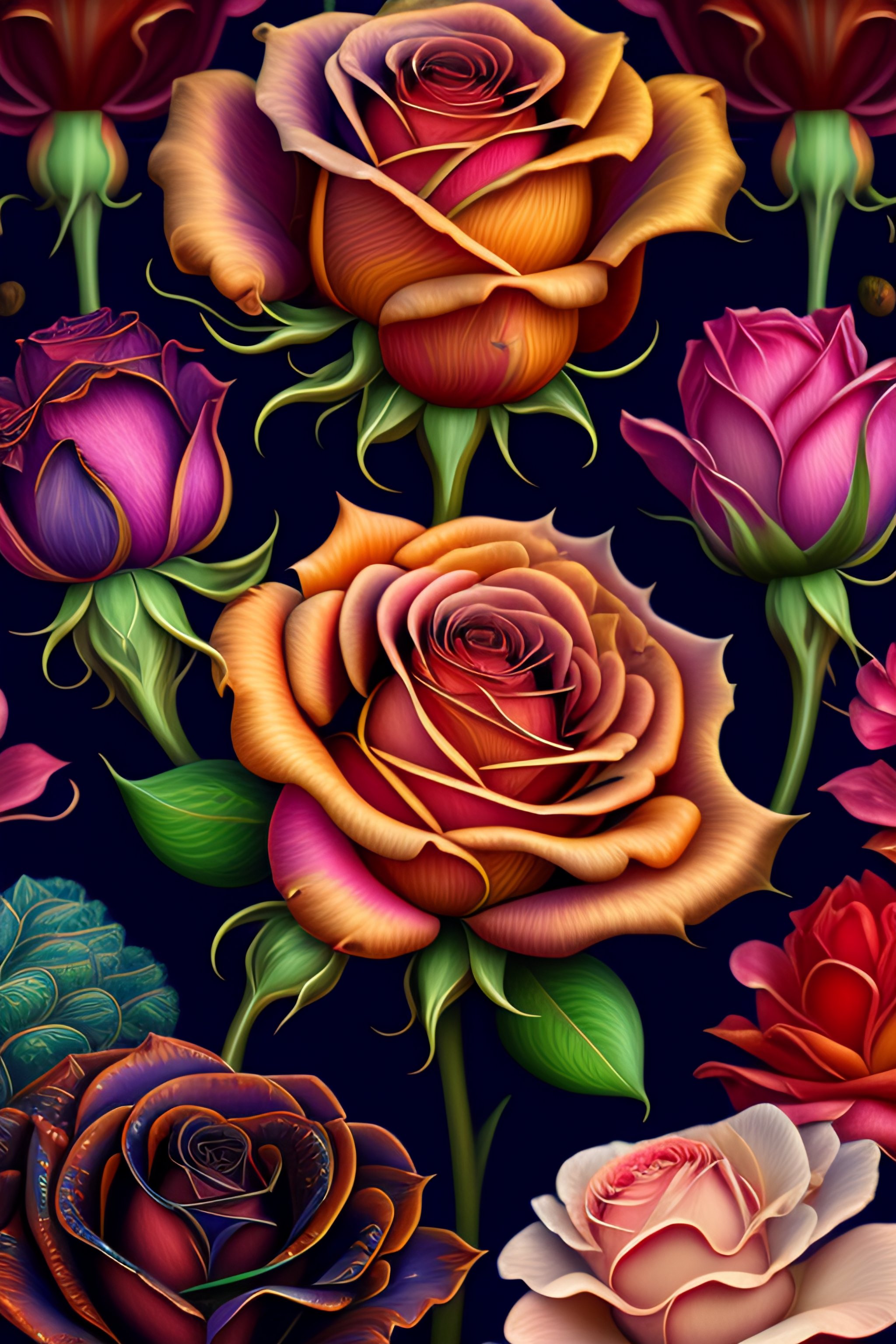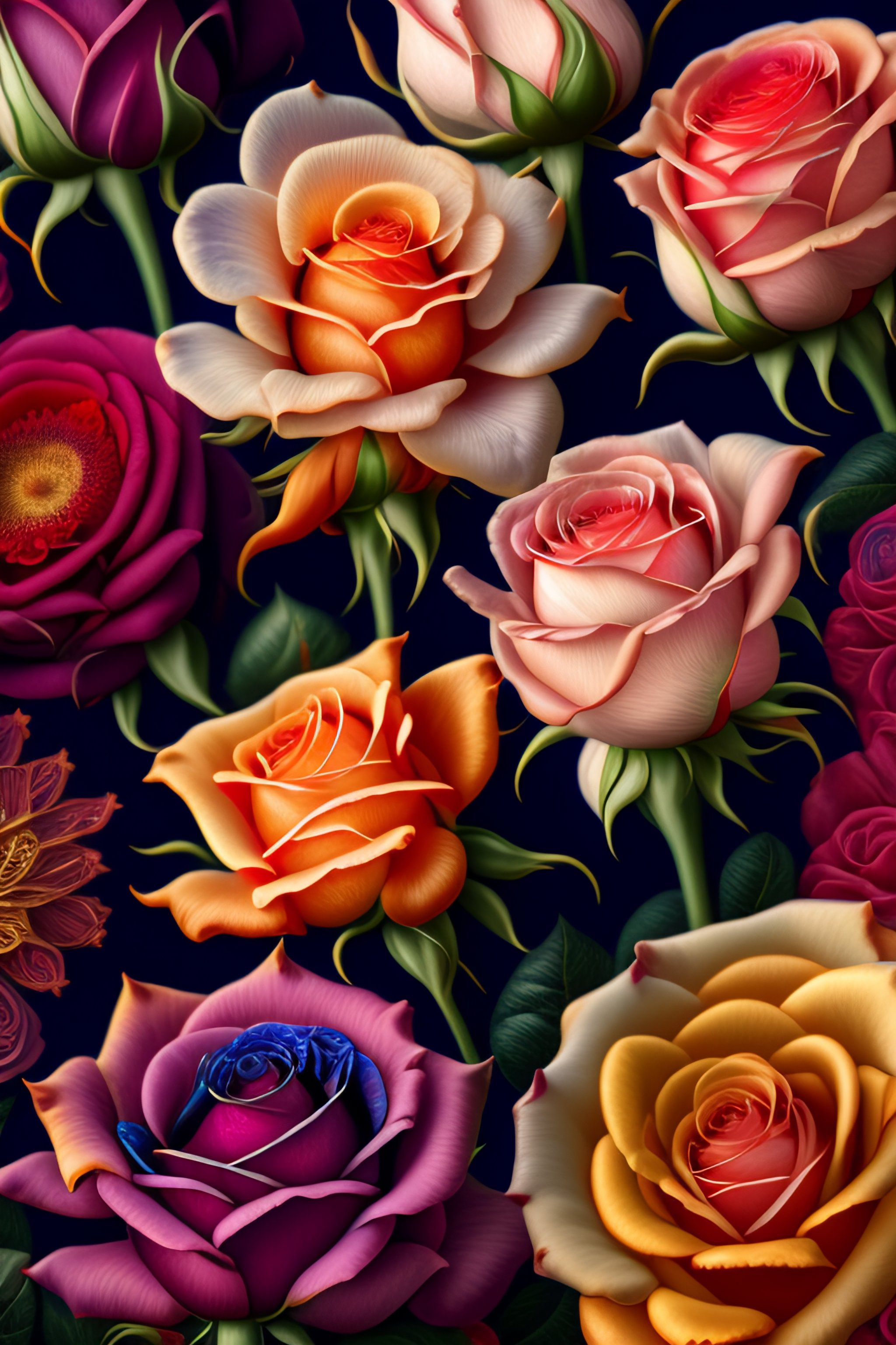 An ultra hd detailed painting of many different types of roses by android jones, earnst haeckel, james jean. behance contest winner, generative art, baroque, intricate patterns, fractalism, movie still, photorealistic