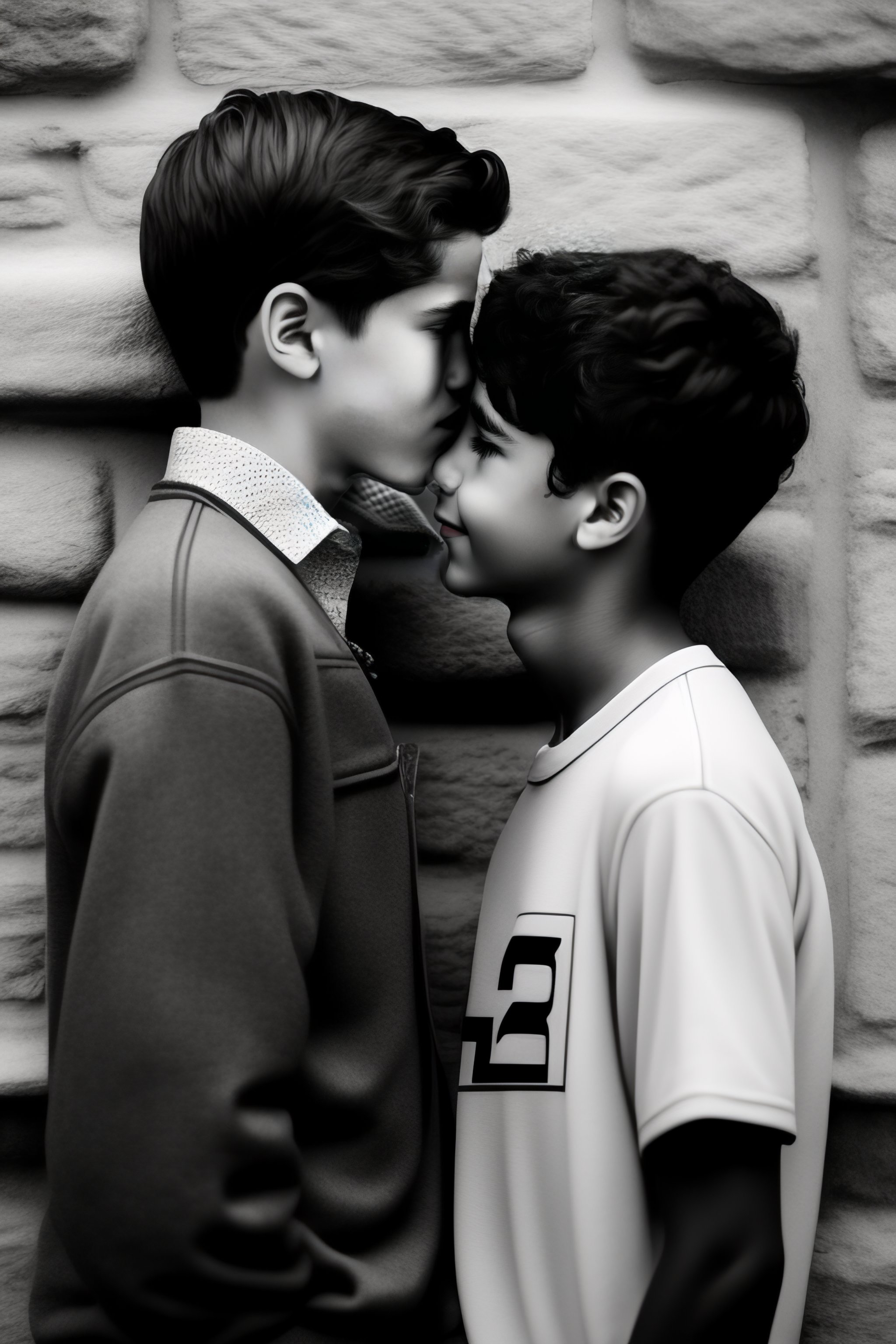 Black and white photos, two twelve year old boys stand against a wall, staring lovingly into each other's eyes, about to kiss, cdx