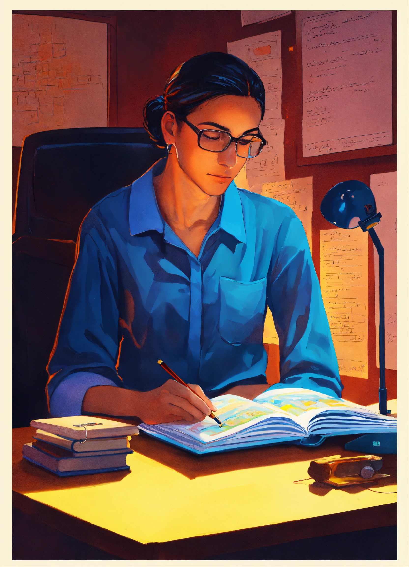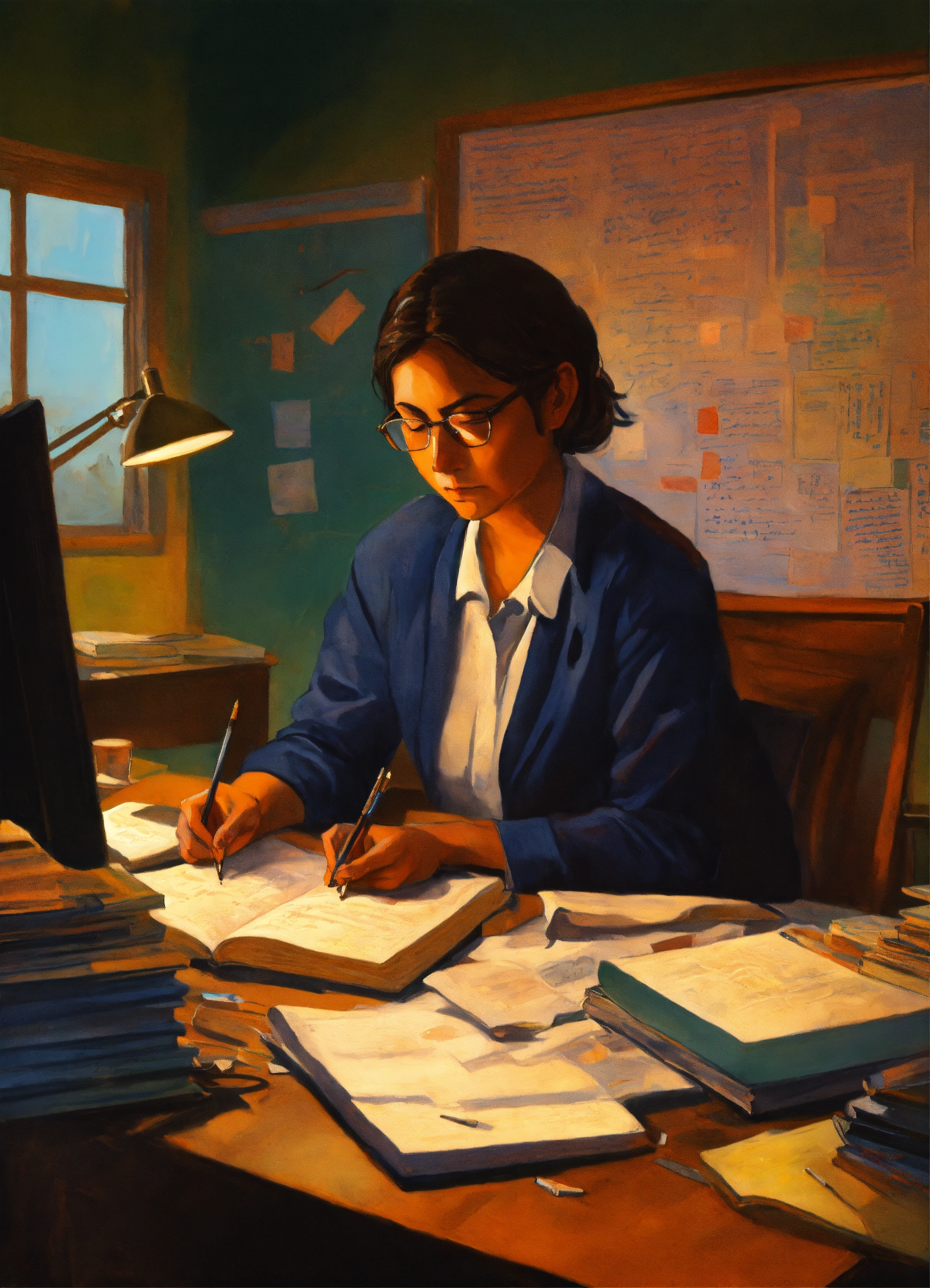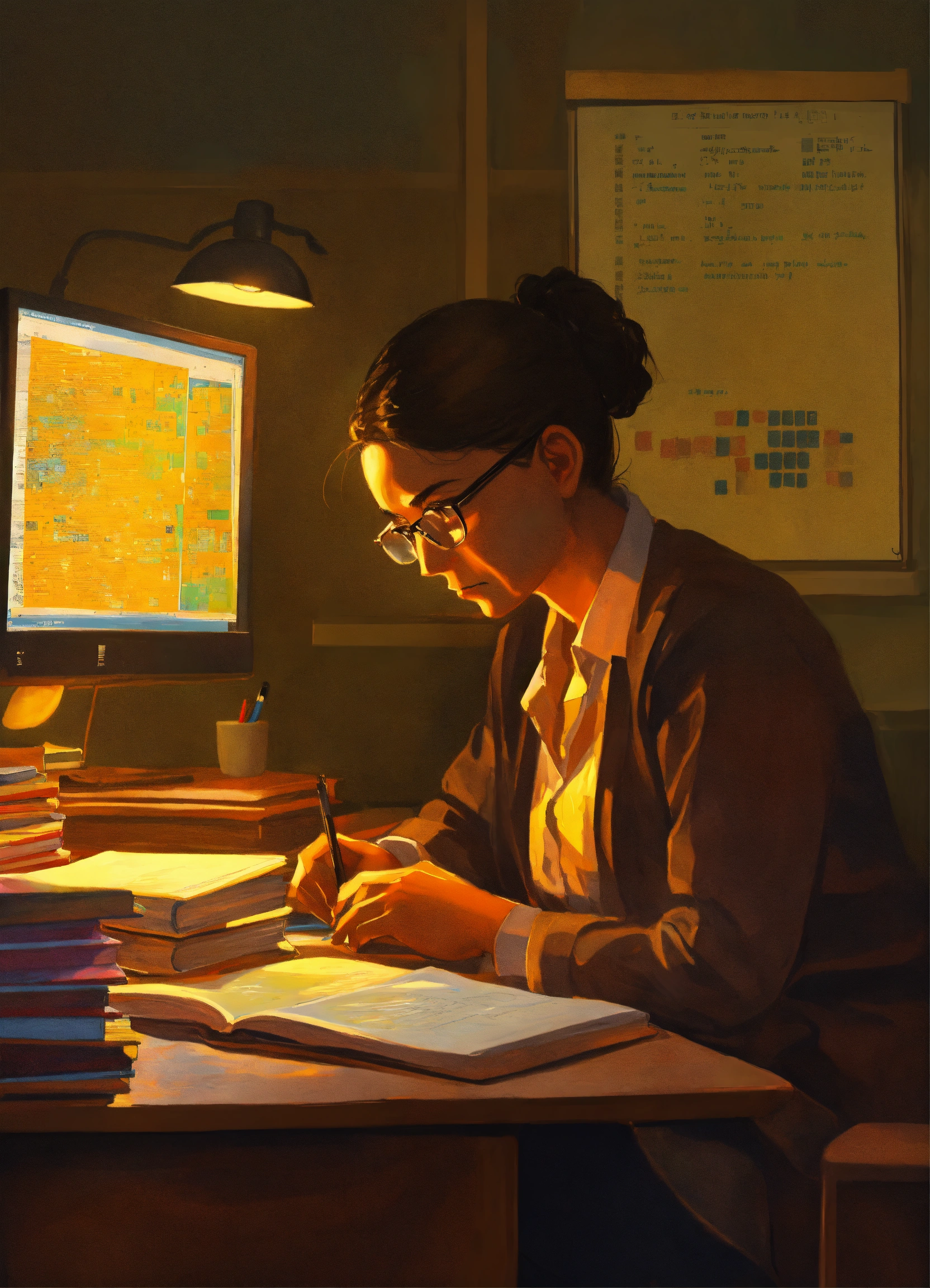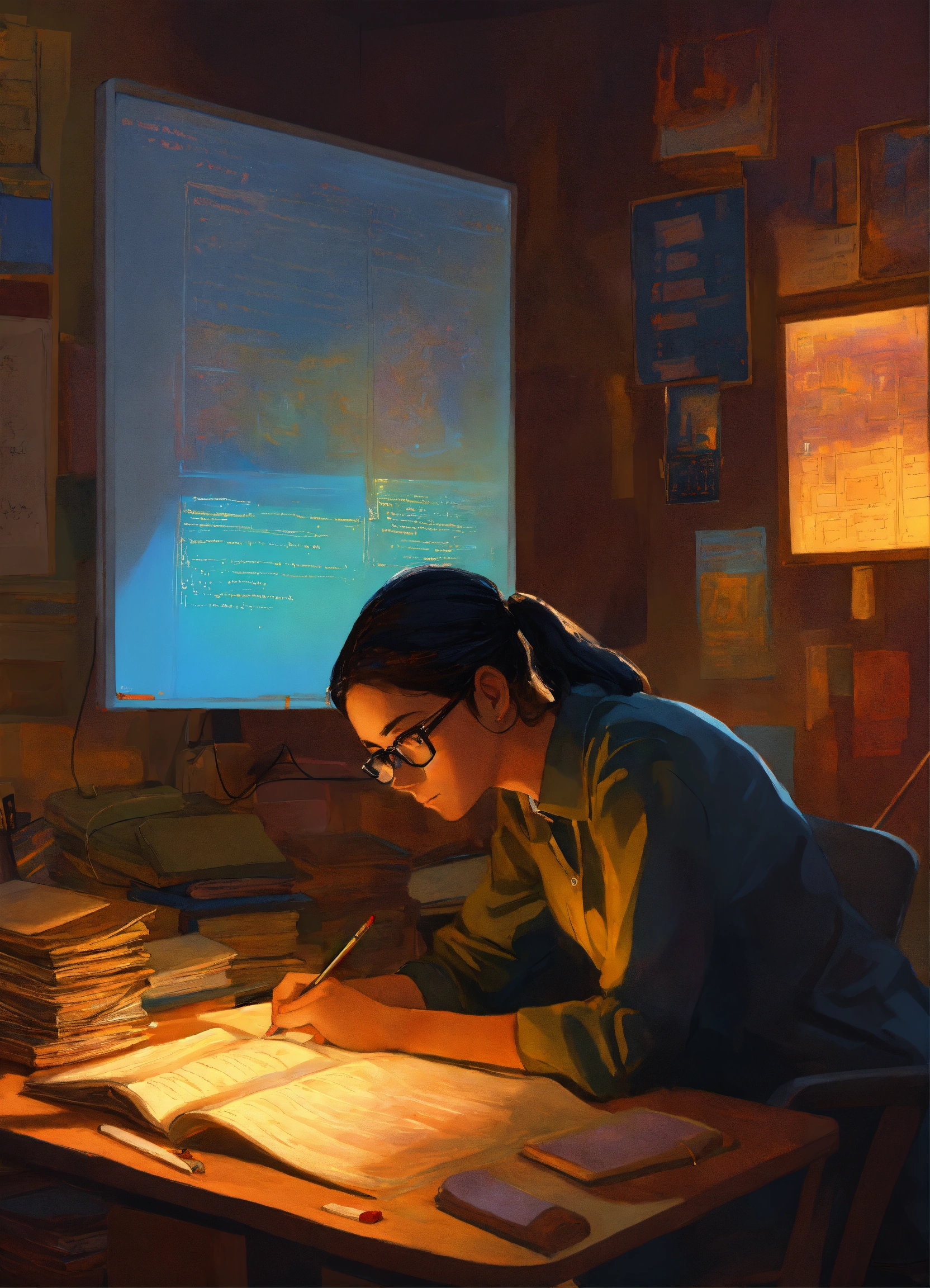 In the painting, a dedicated teacher sits at a cluttered desk, softly illuminated by the warm glow of a computer screen. the muslam teacher is hunched over, deep in concentration, with a stack of textbooks beside them. the computer displays lines of code and the logo of lexica, symbolizing the software project. the teacher's tired but determined expression reflects the sacrifices made to ensure the project's success. the background is dim, emphasizing the teacher's solitary late-night effort. this painting captures the essence of a teacher's sacrifice for the sake of creating a proper with students