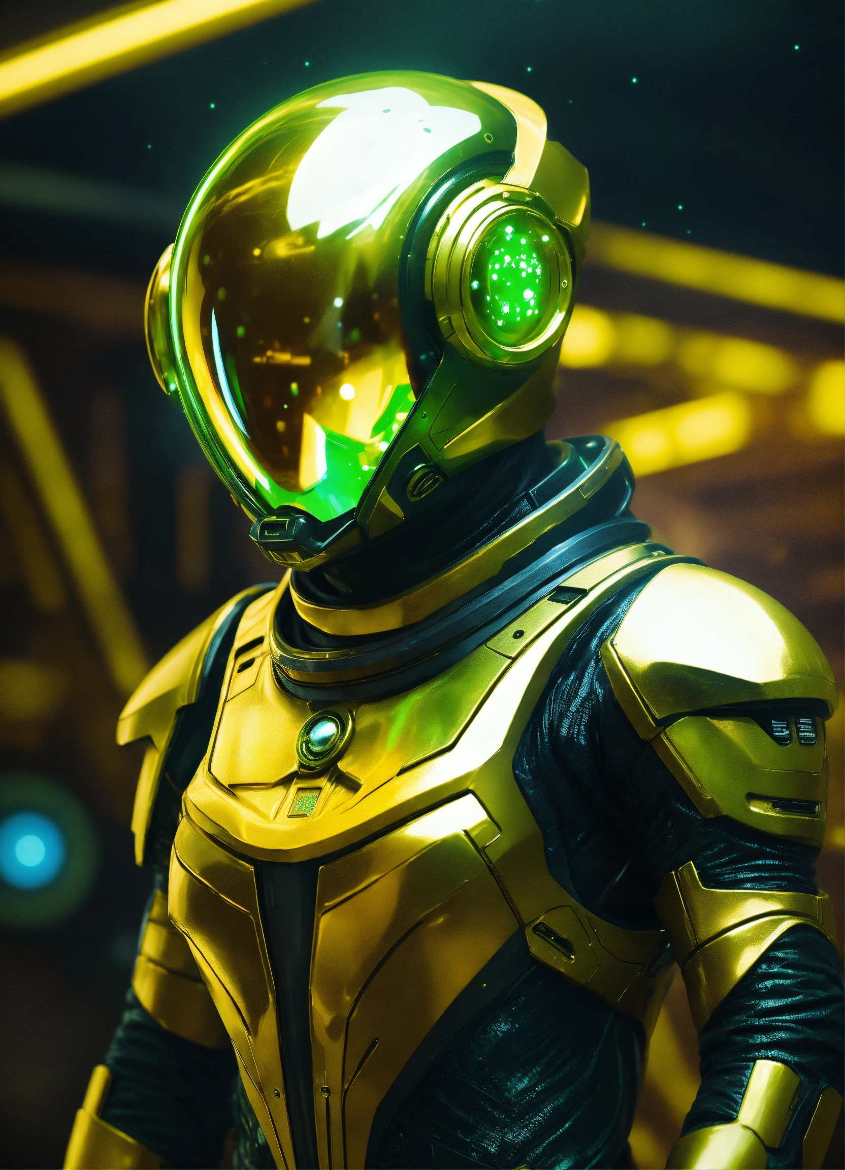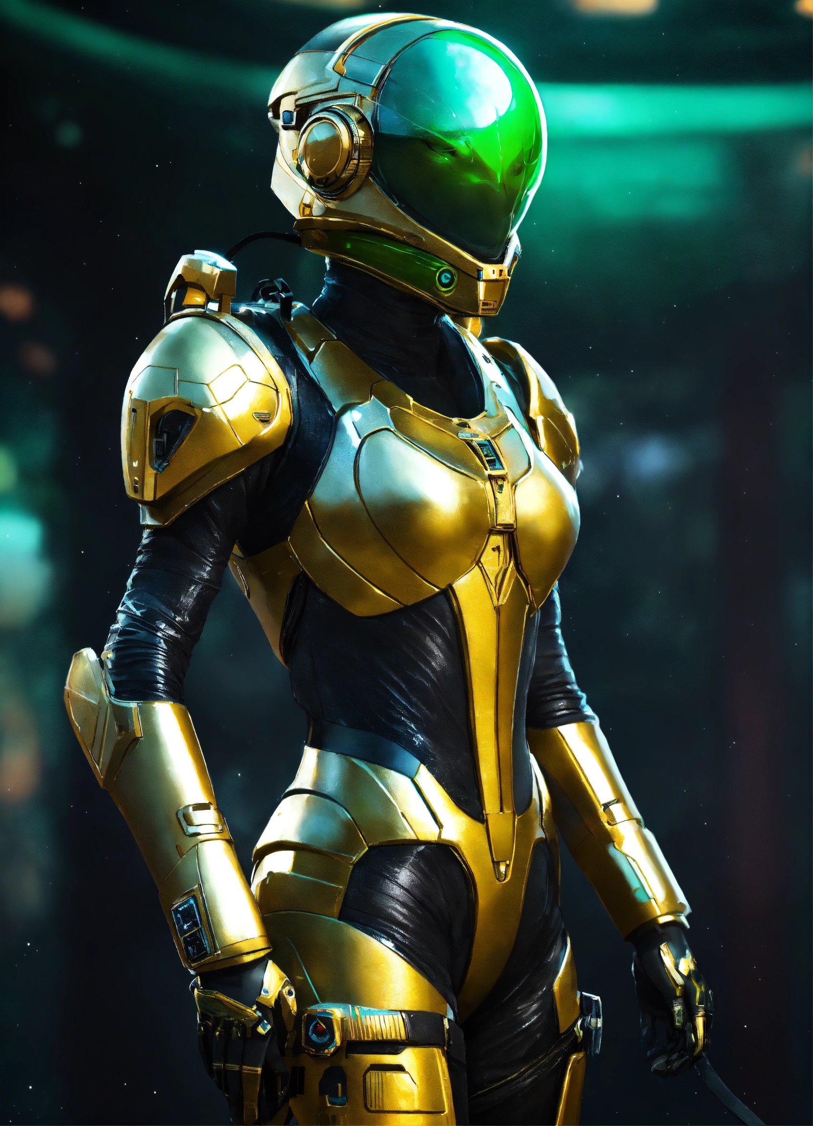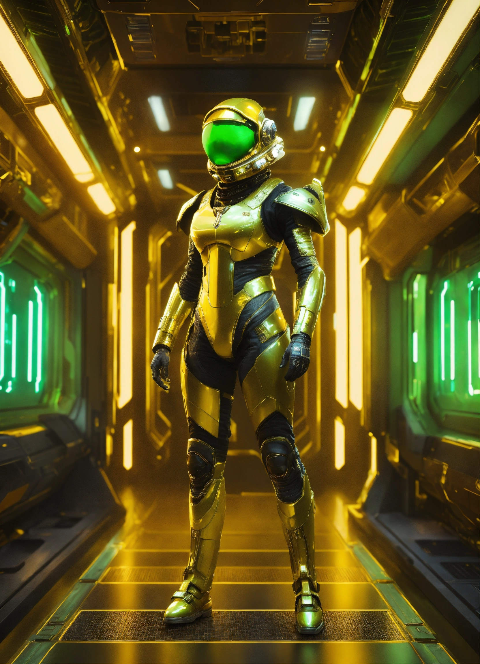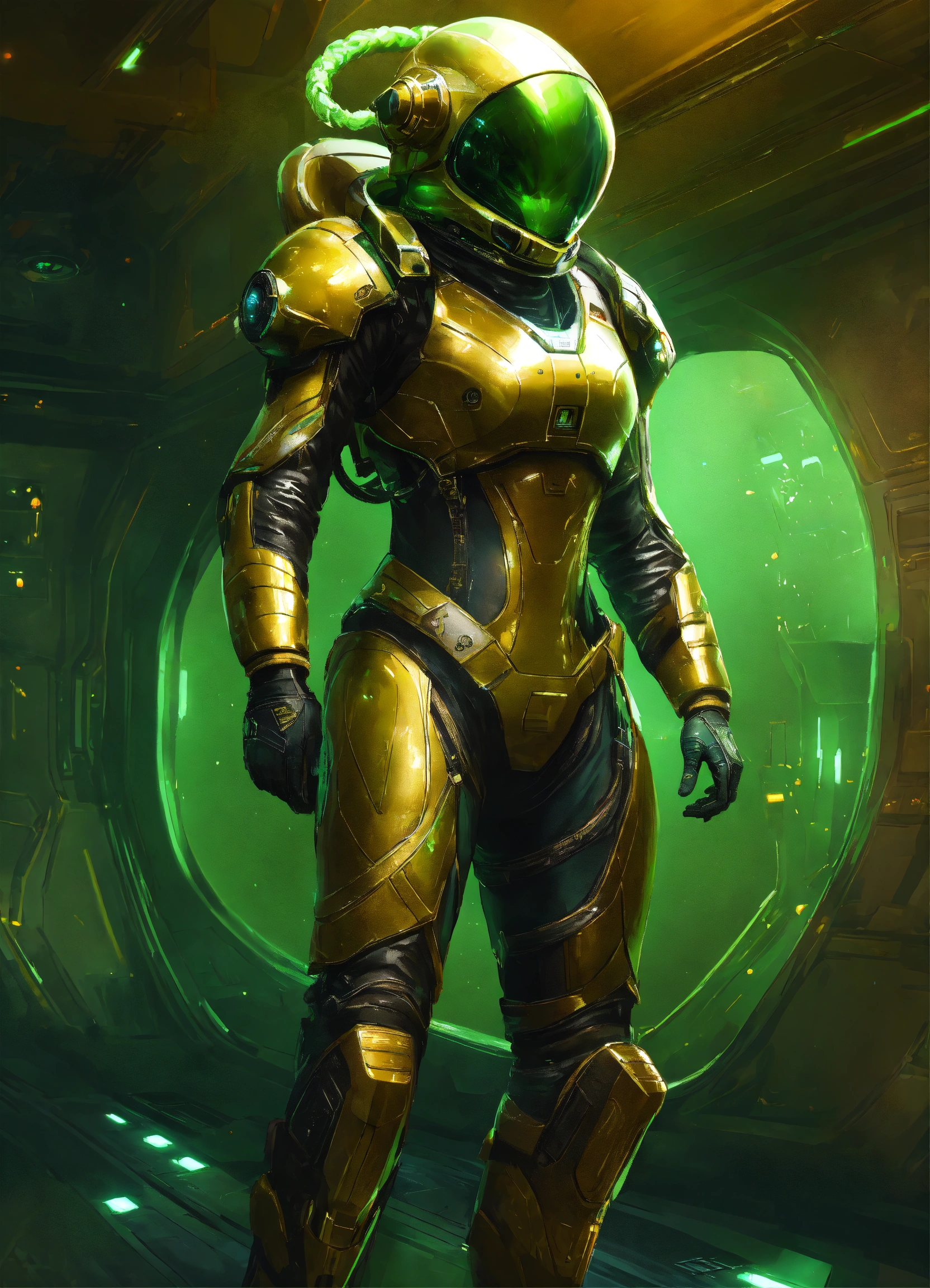 Anthropomorfic alien with green skin as a scifi mercenary, full body gold and black space suit front view, medium shot, spaceship interior background, scifi, fantasy, action, breathtaking, digital painting, highly detailed, pinterest, artstation, eve online, starfield.