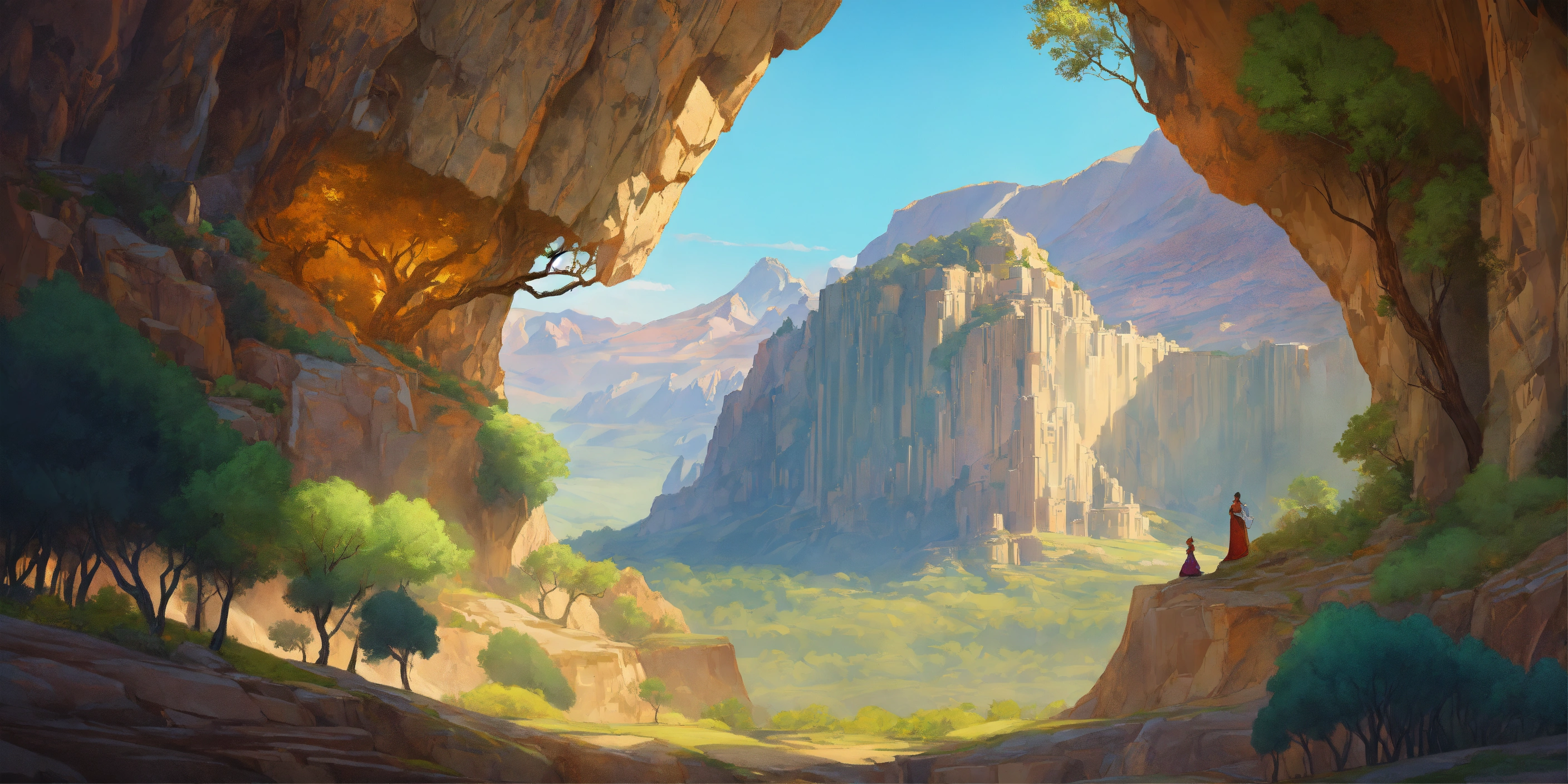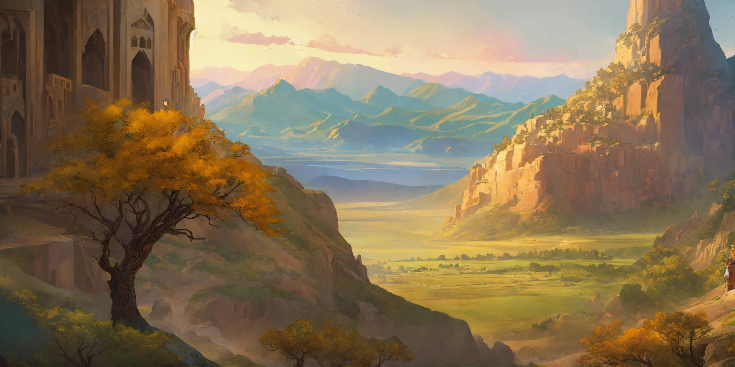 Mountain cliffs and mongolian plains, mystical, glowing gems, weird trees and rock formations, forest, bukhara style city build into the cliff walls, highly detailed, digital painting, artstation, concept art, smooth, sharp focus, illustration, art by artgerm and greg rutkowski and alphonse mucha, erte, 8 k