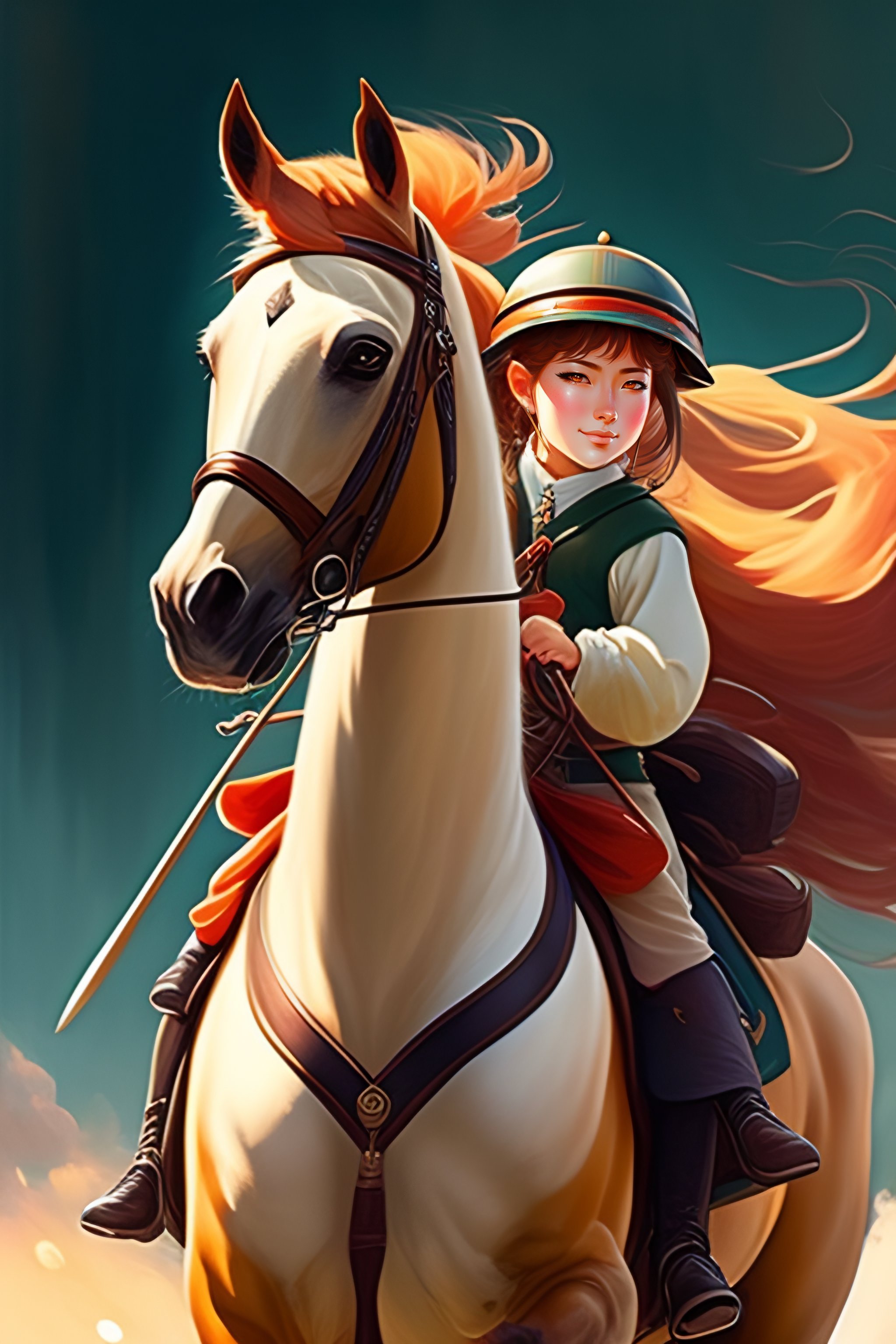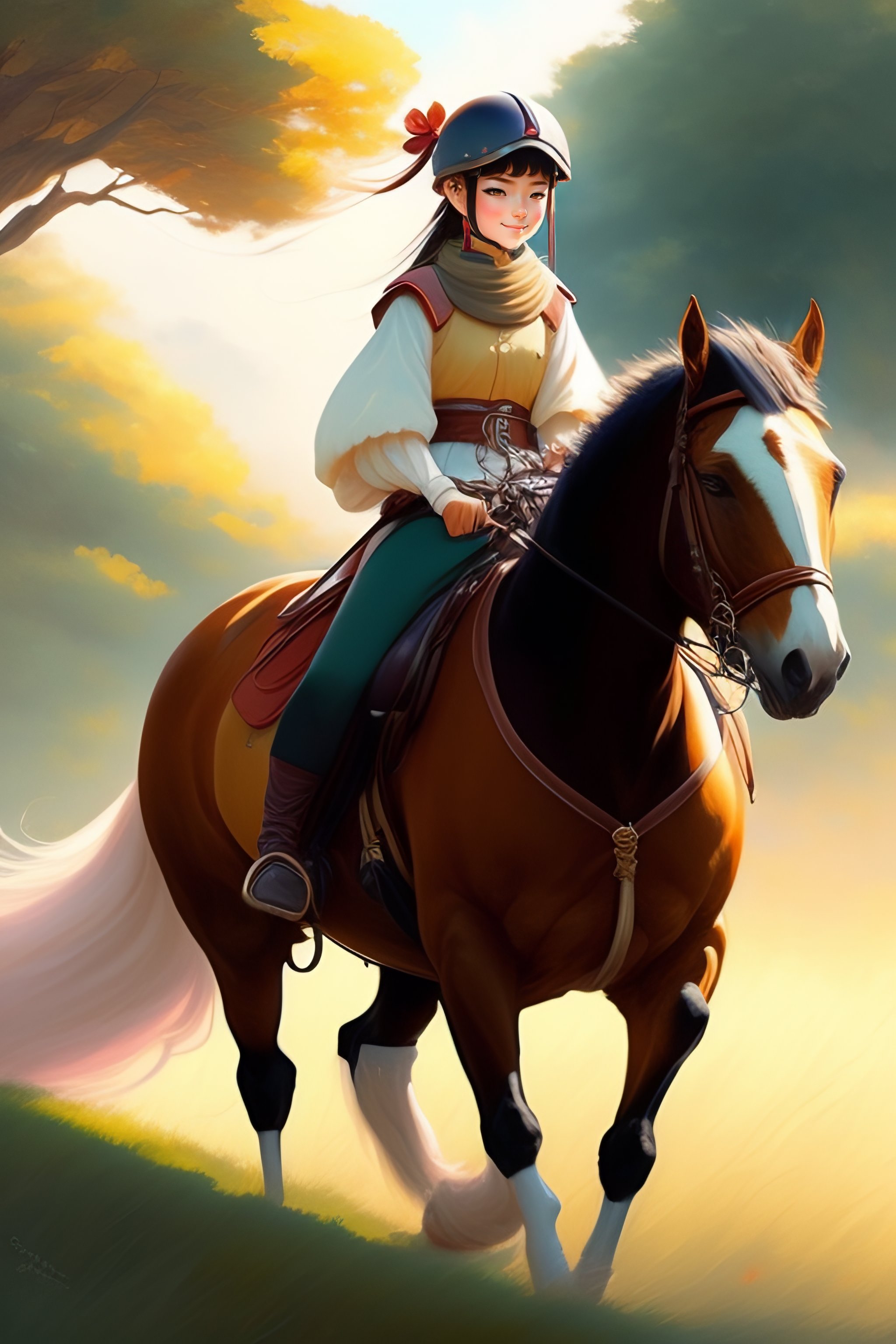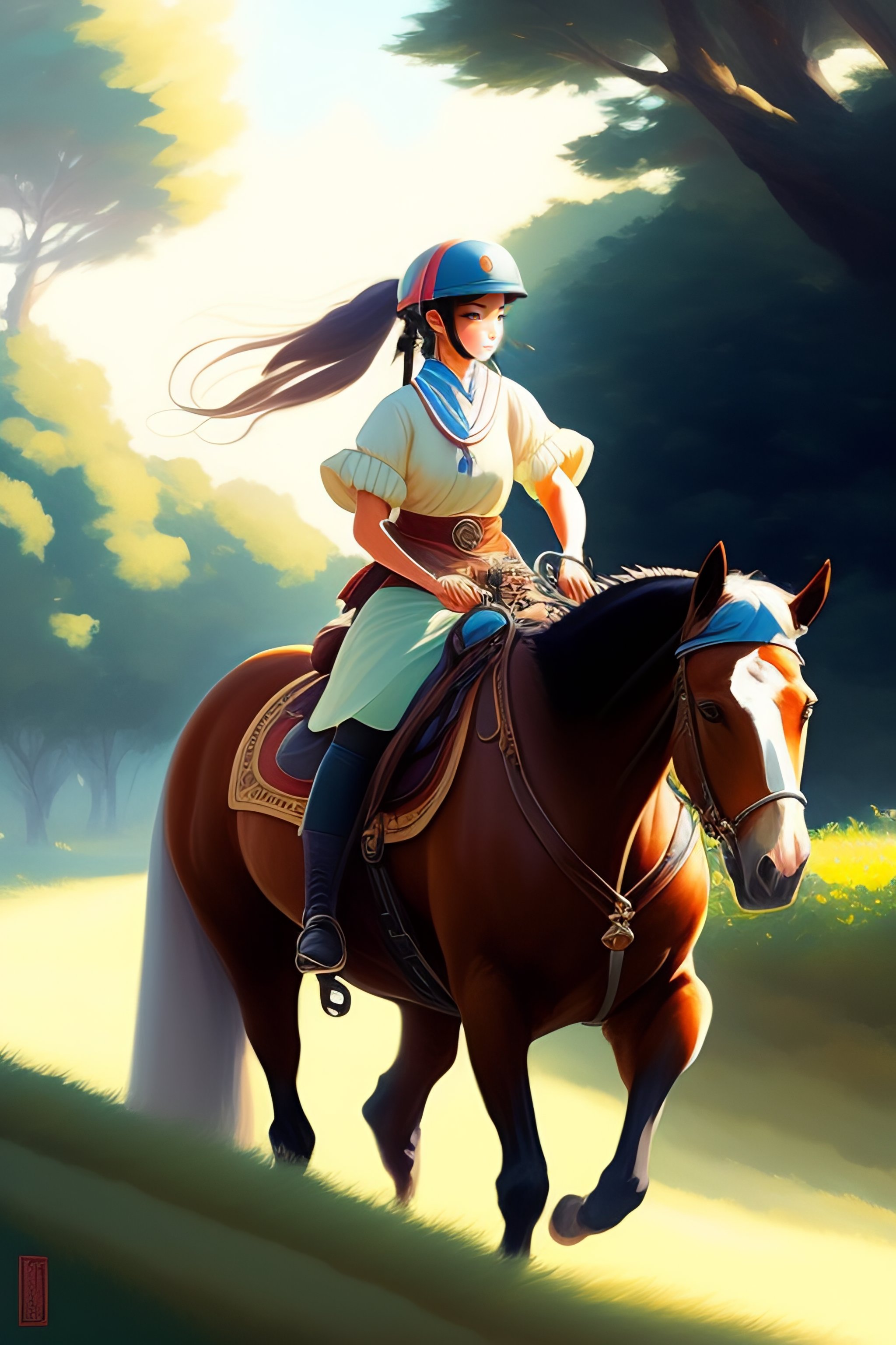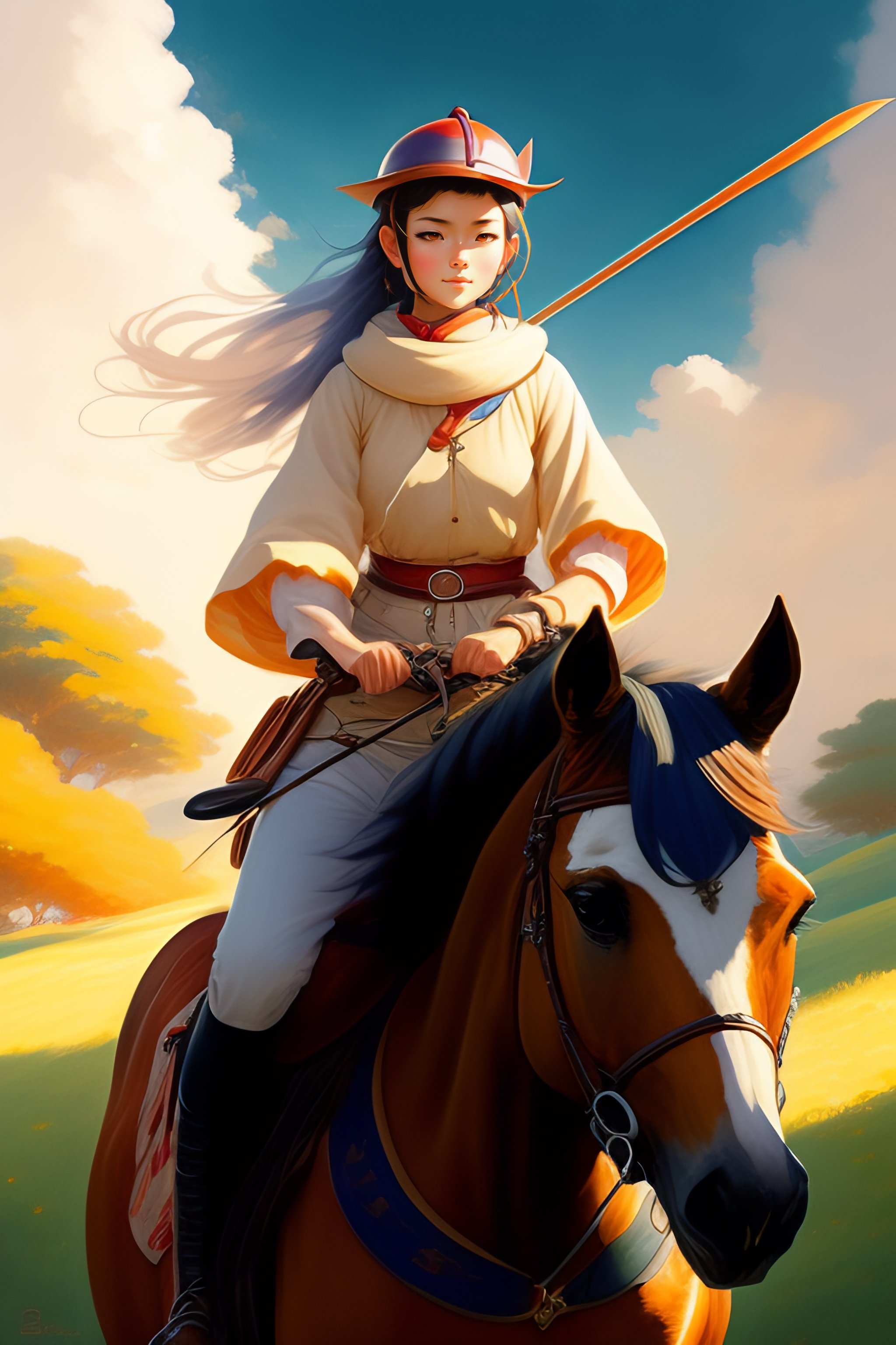 Cute girl riding a horse, by studio ghibli painting, superior quality, masterpiece, traditional japanese colors, by grzegorz rutkowski, concept art