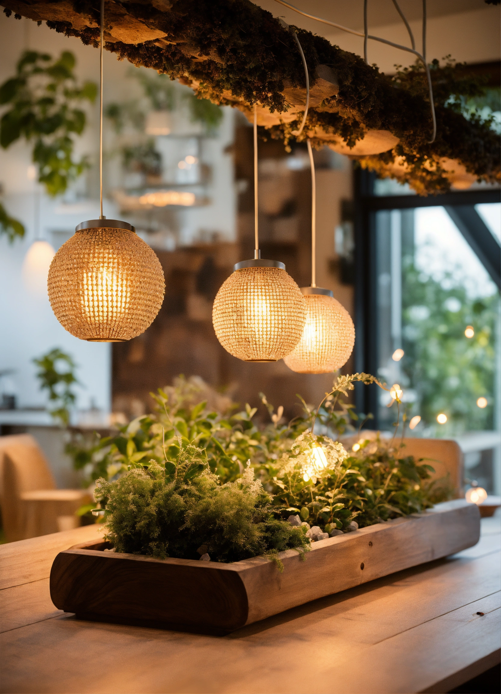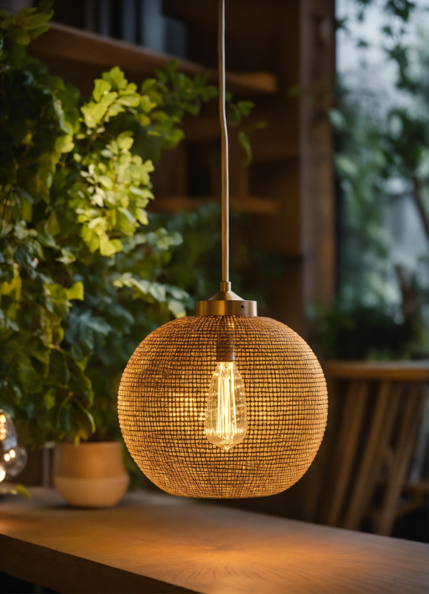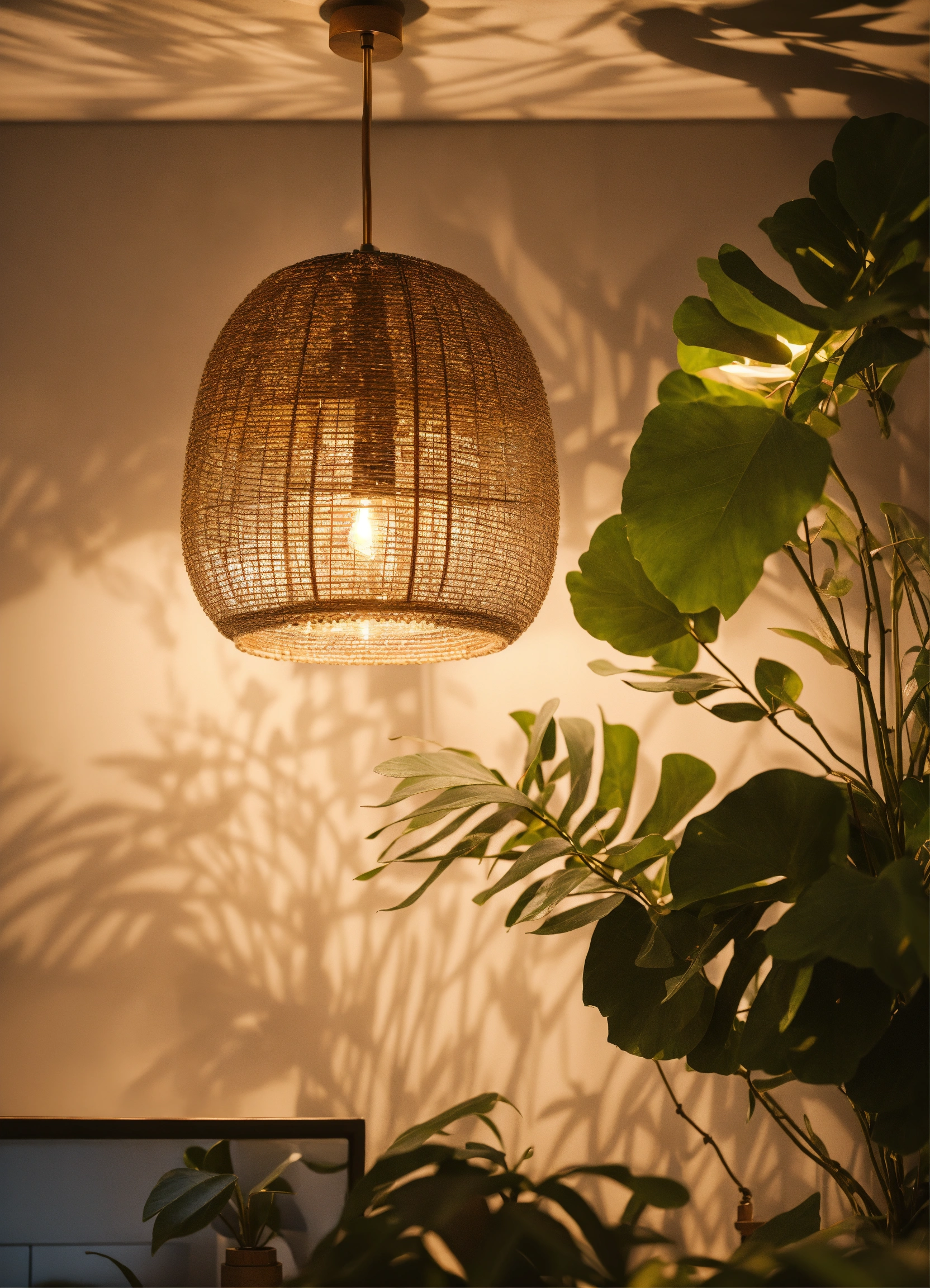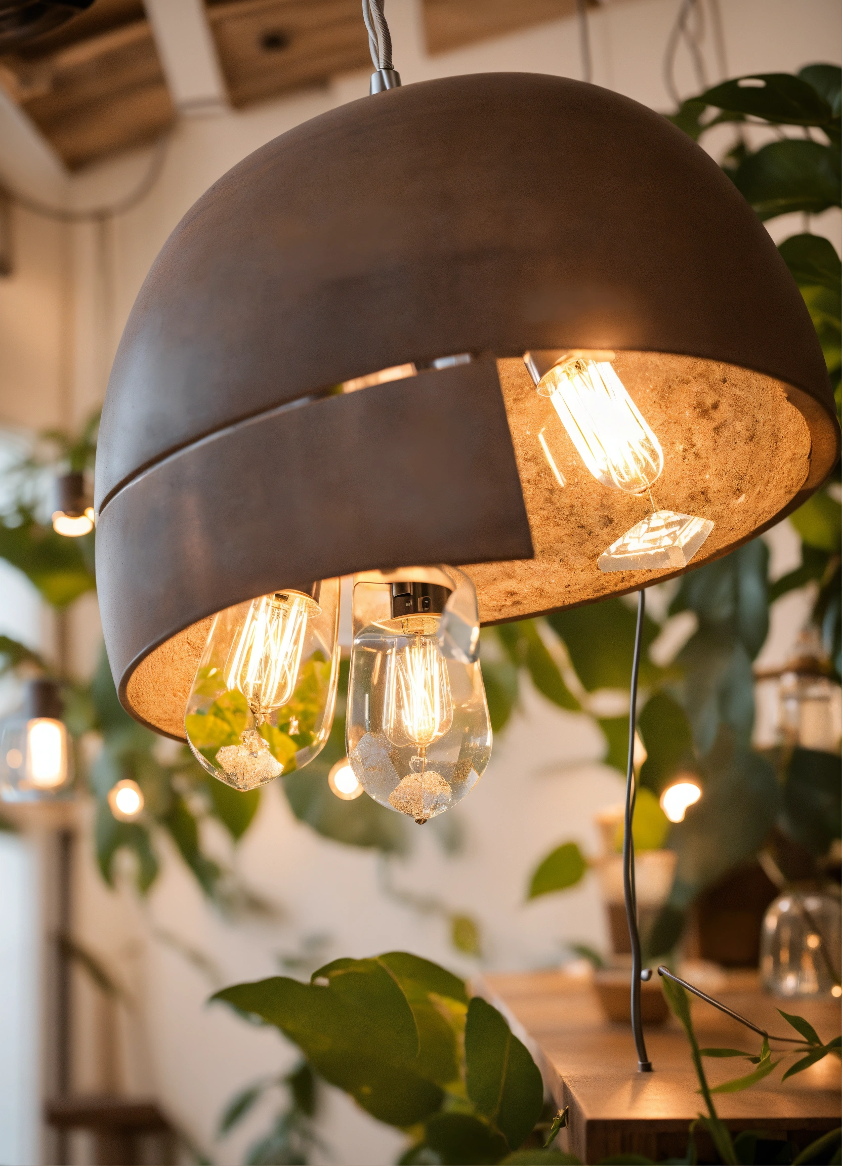 A close-up of a well-designed light fixture that creates a welcoming atmosphere and promotes well-being. biophilic design, natural materials, light colours, scandinavian style, crystals, ambient light on very cozy, lots of vegetation