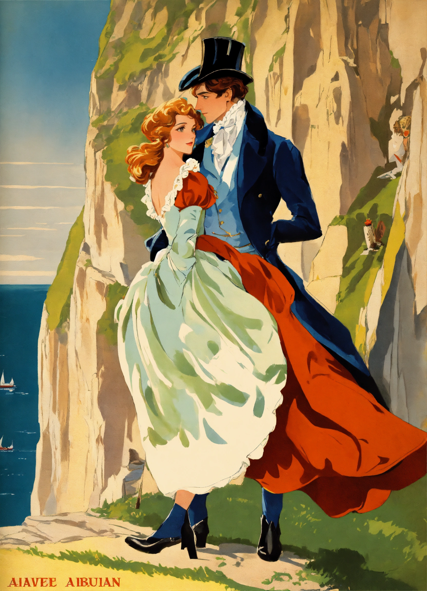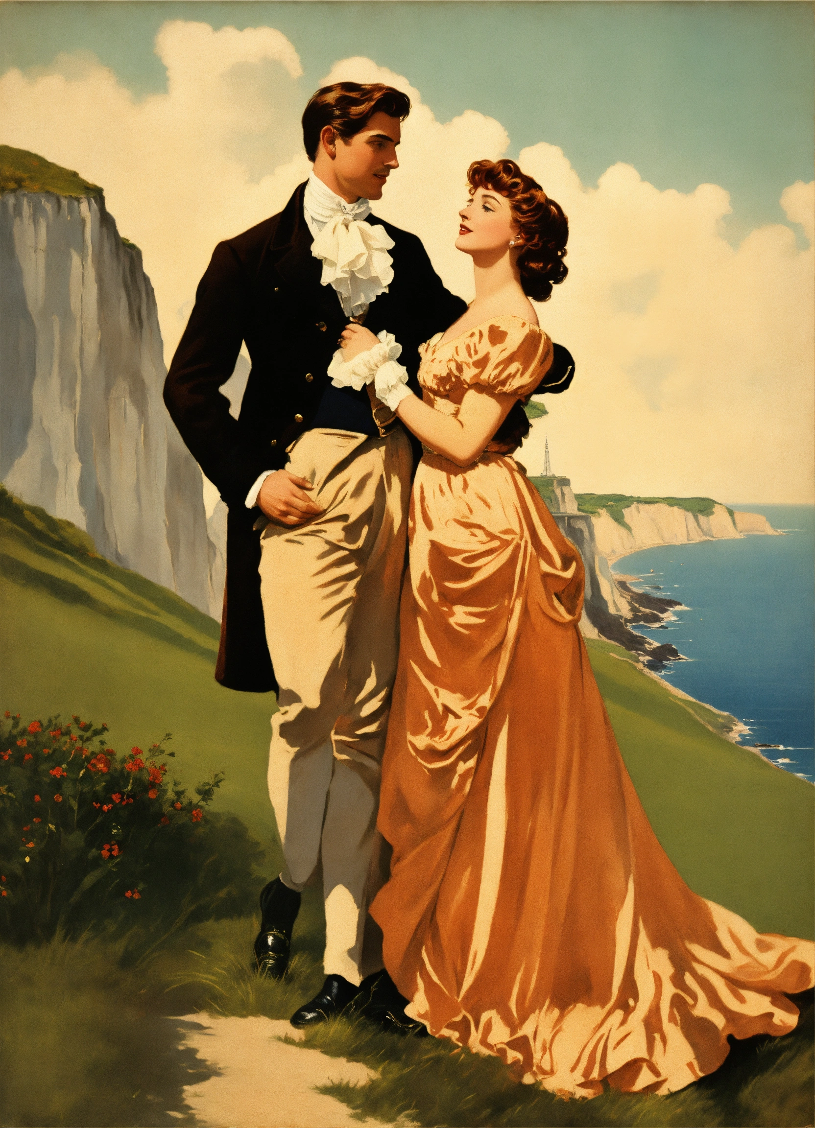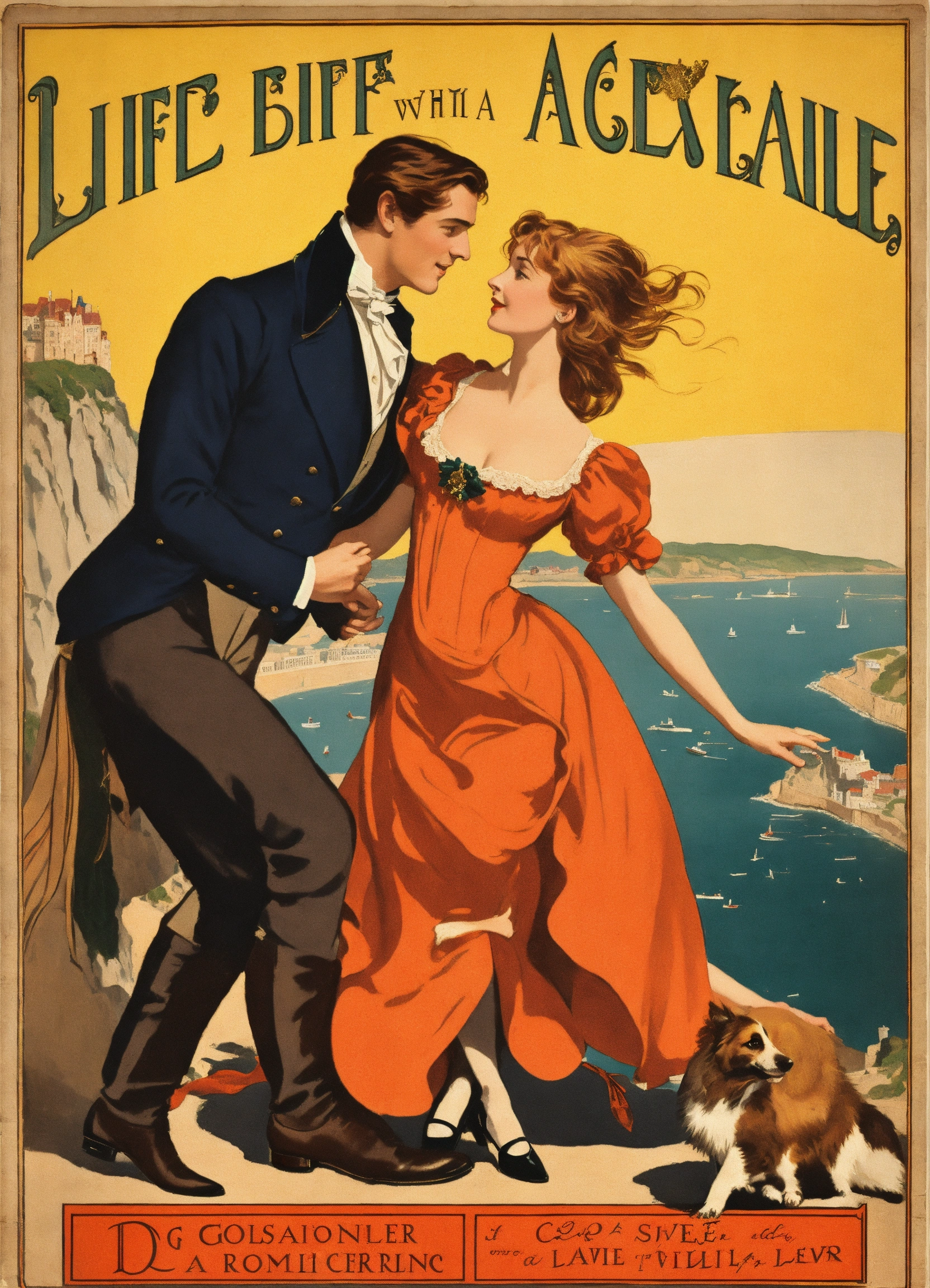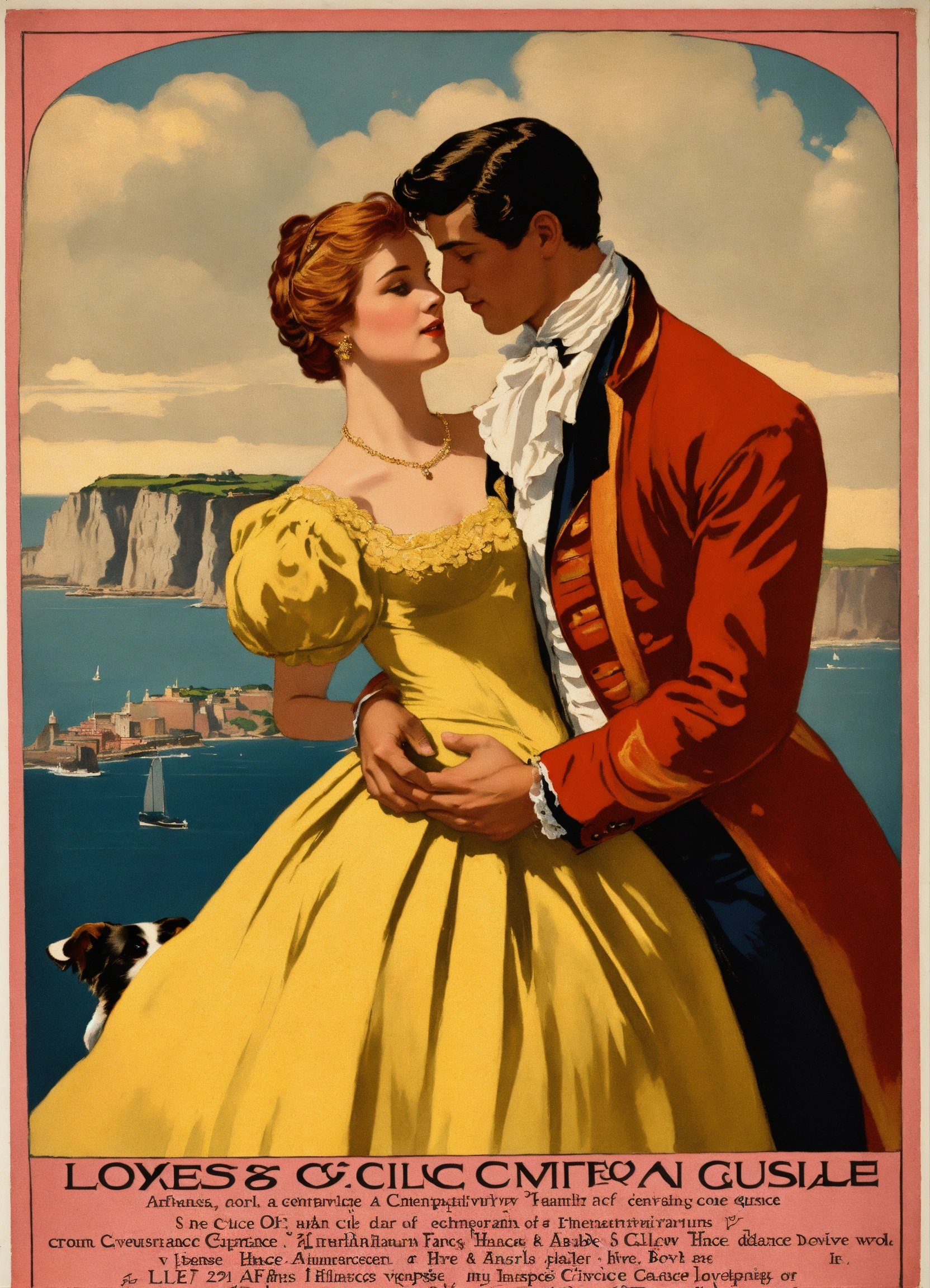 Create a captivating cover design that conveys the theme of romantic comedy, with the title of " loves many guises a comedic dance, featuring a dashing regency gentleman with auburn hair embracing a slender woman with golden hair, a long face, and hazel eyes. again, the cliffs of dover and a sable collie could be in the background near their legs. vintage poster paint book cover style design, with shadows and effect that gives the design captivating, super detailed, extremely detailed, detailed hands, whole body, with the cliffs of dover in their background