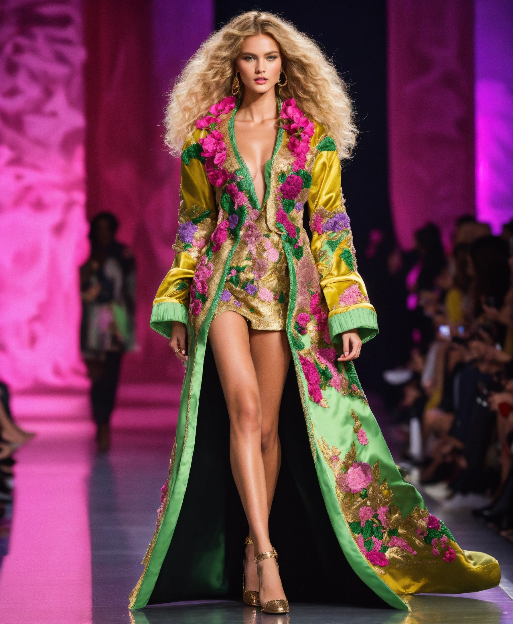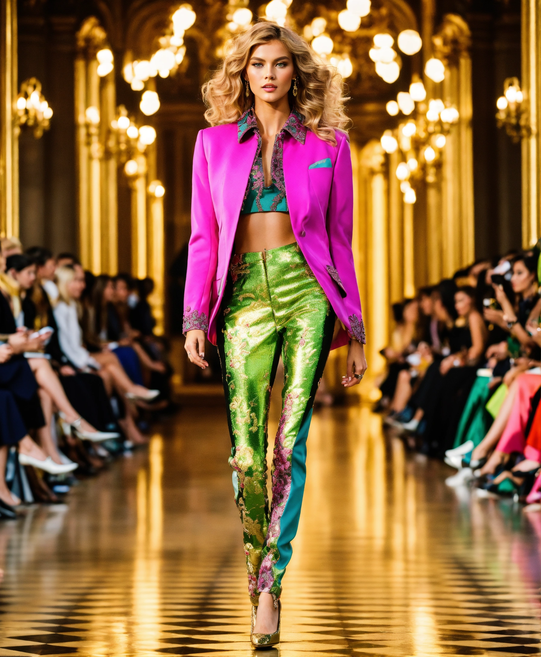 Ultra realistic full body photo of a stylish beautiful elegant blonde german supermodel voluminous wavy hair walking the runway modeling summer cruise designer wear brave, paris versailles details cutouts and gold geometric pattern structured tailored jacket pink gold green lilac peridot silver magenta lime fuchsia yellow blue black gray copper mauve bronze haute couture embroidered contrasting colors vivid intricate bold vibrant glamorous ultimate elegance beautiful luxurious awesome wealthy opulent exquisite resplendent magnificent sublime 12k