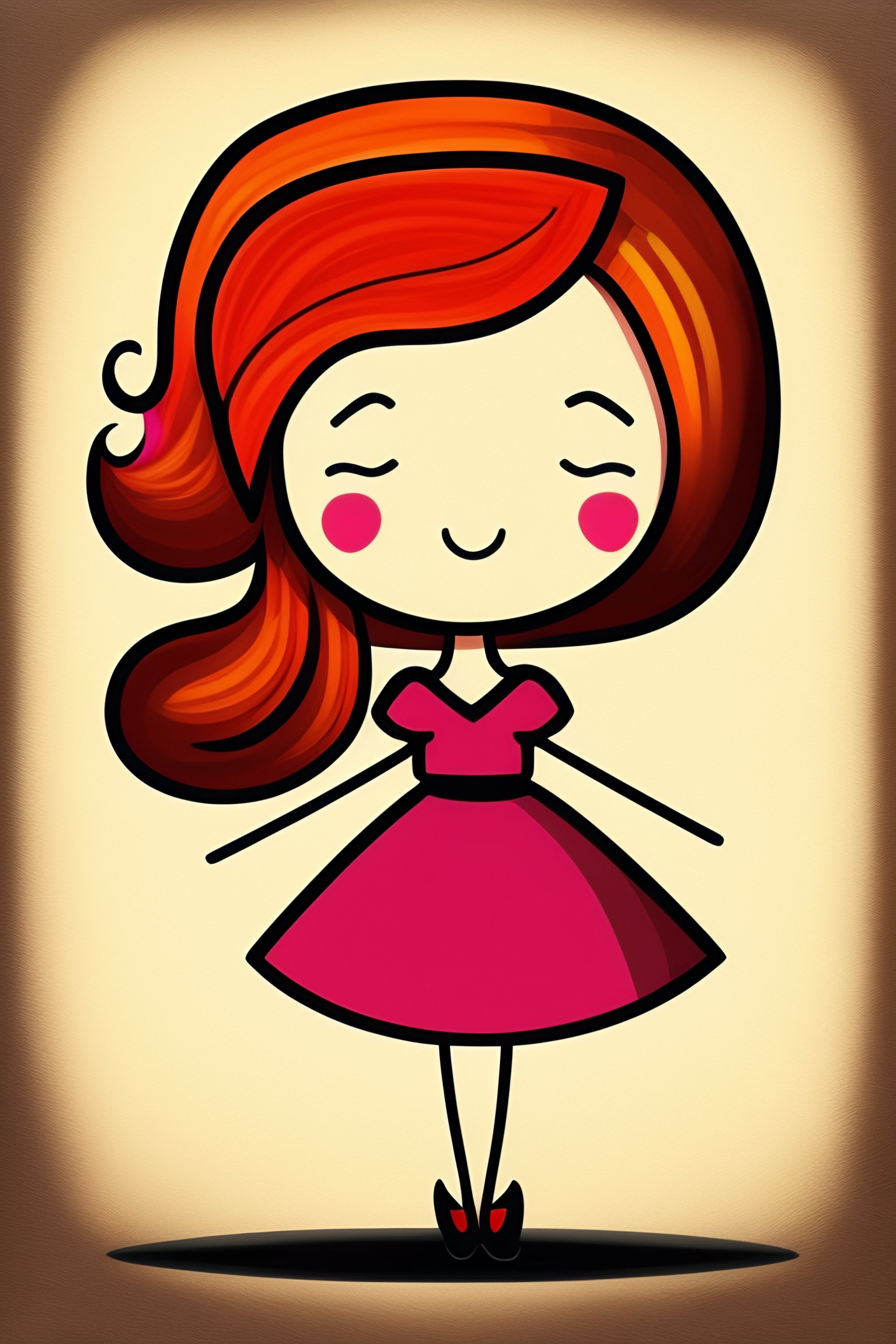 Stick drawing of a cheerful redhaired girl as a stick figure with long hair in a bun, positive atmosphere, xkcd style