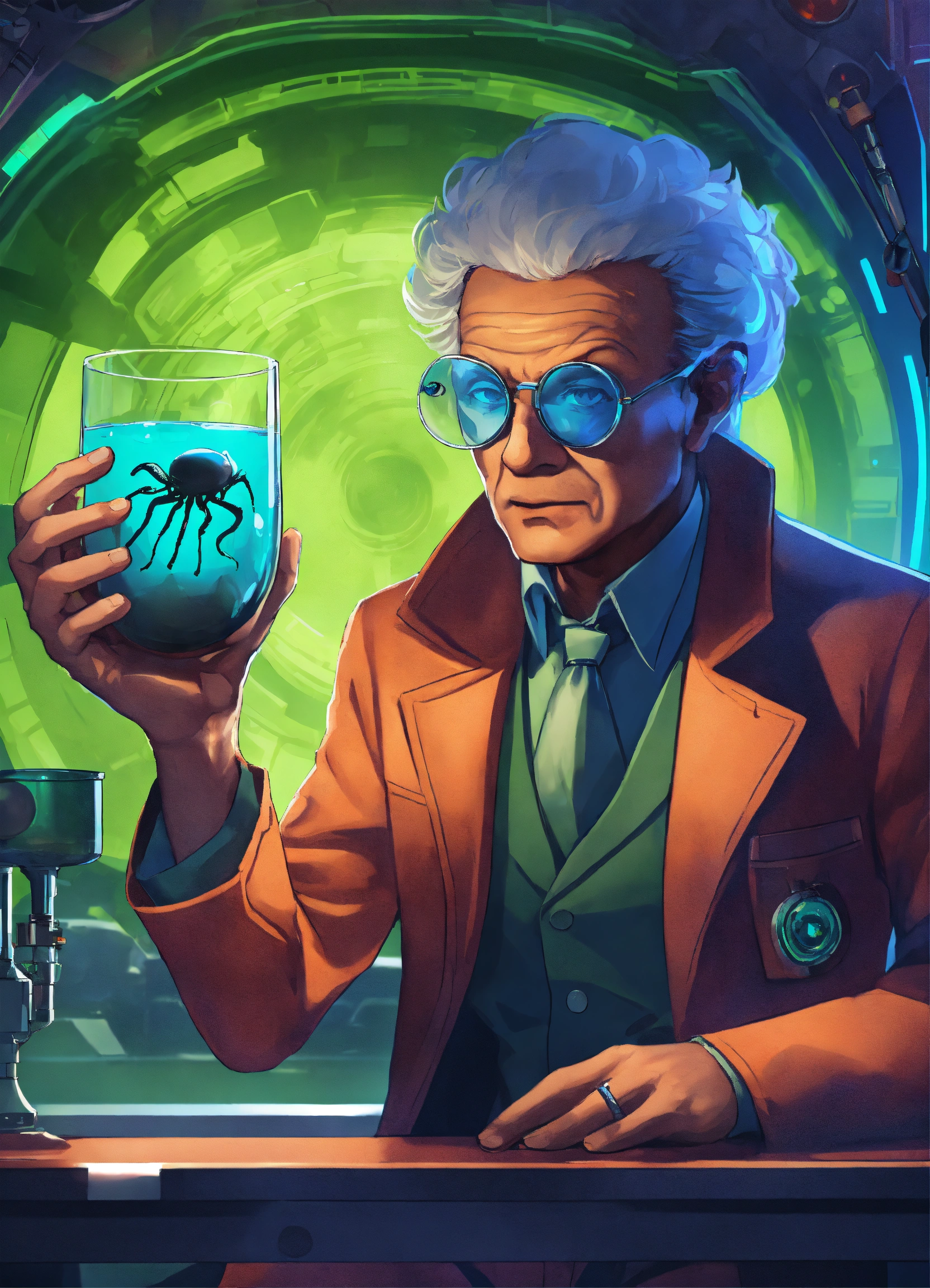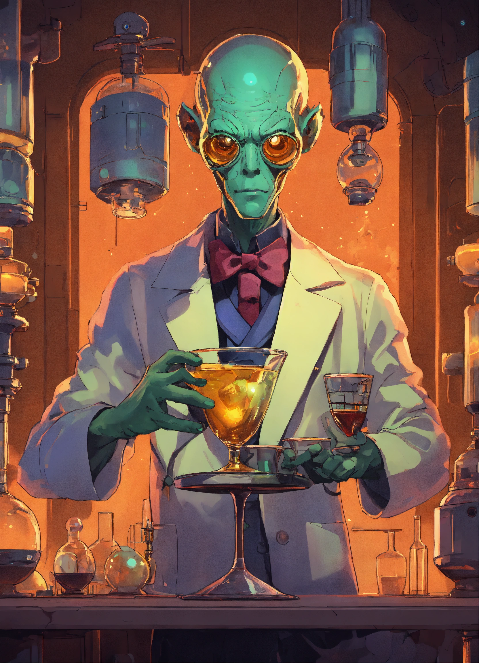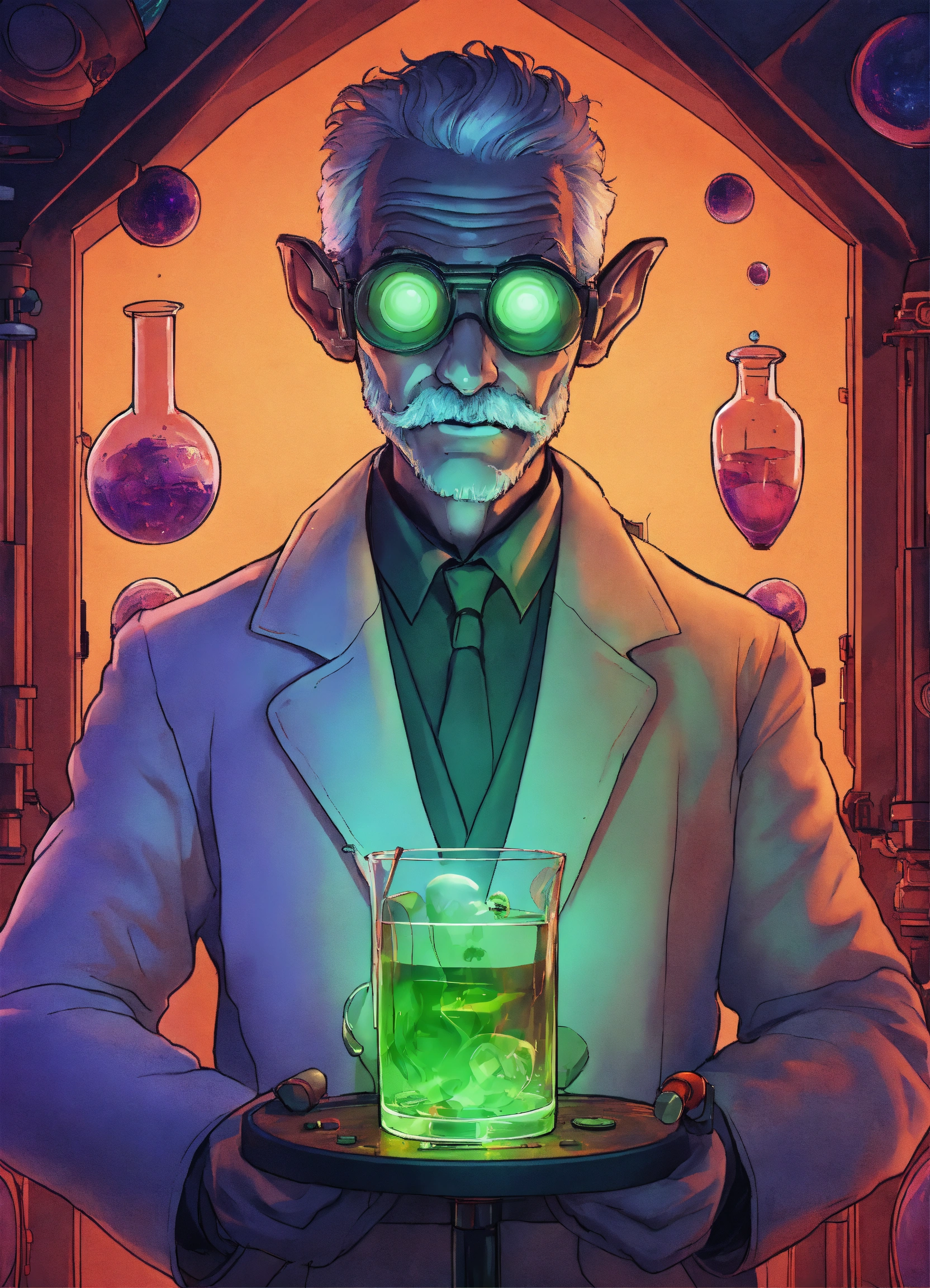 A minimalist cartoonish portrait of the mad scientist is holding a glass of alien artifact above an alien artifact, super advanced technology, futuristic, hyper-digital background, extremely detailed and realistic, ominous and eery, minimalist