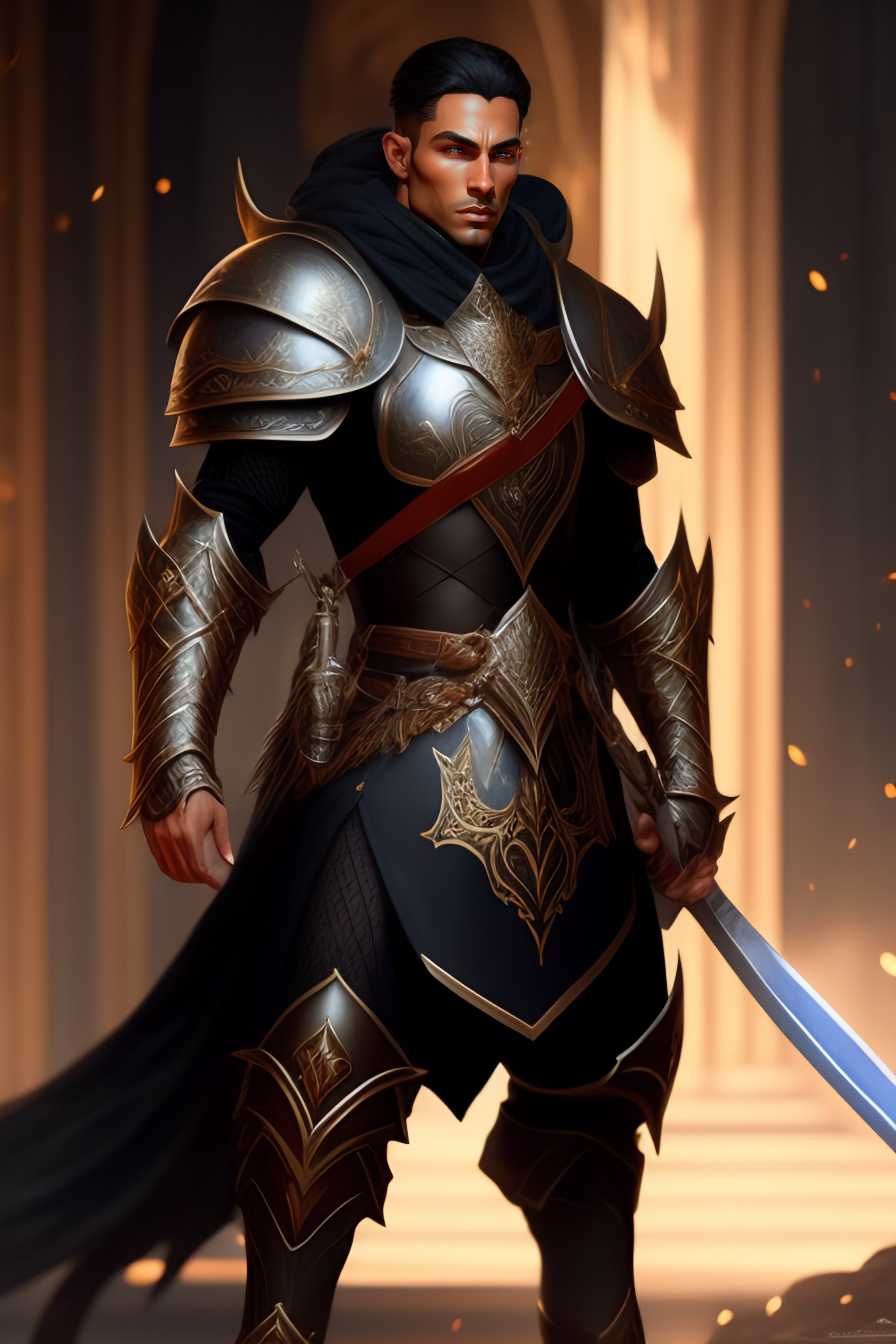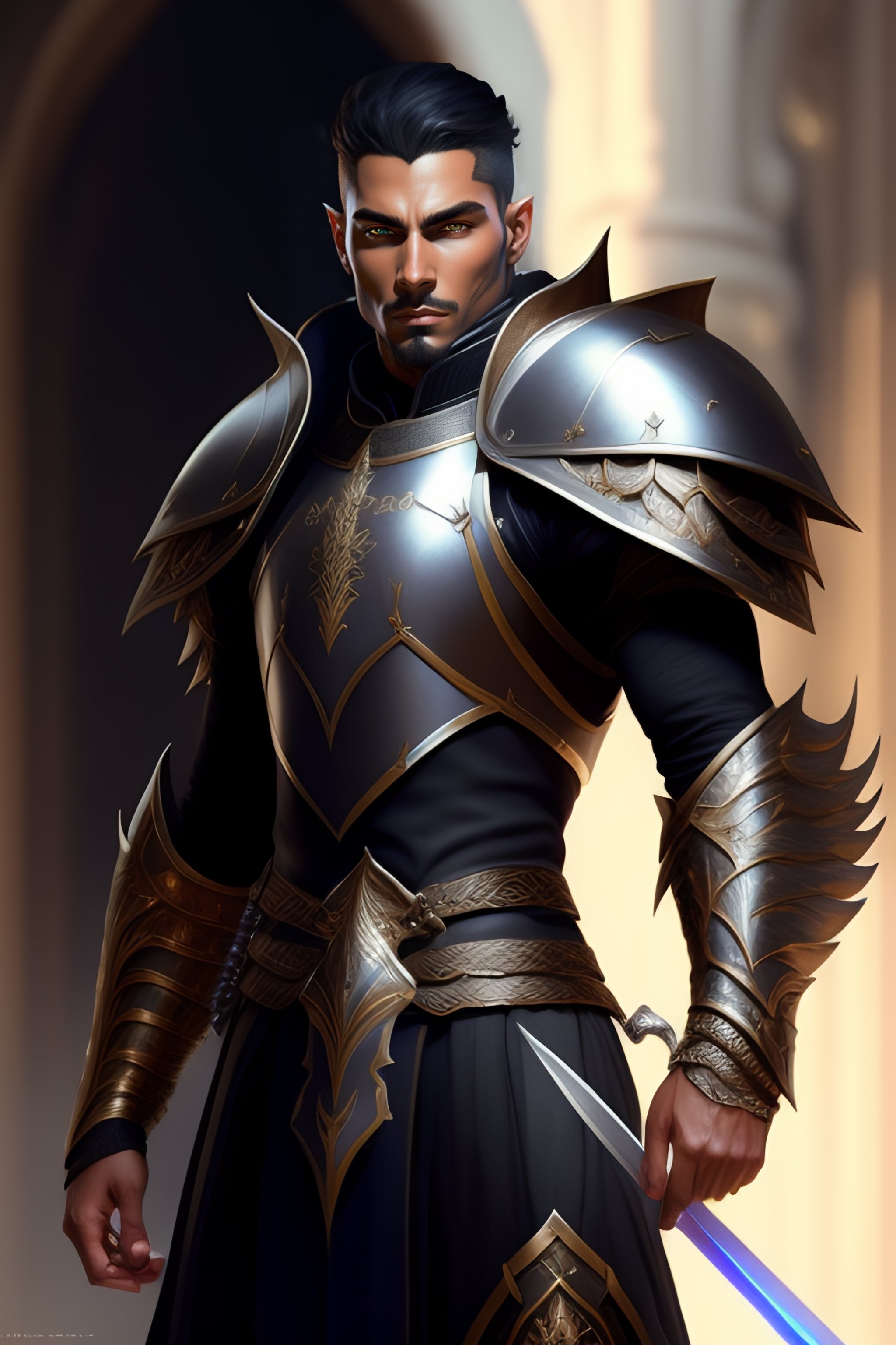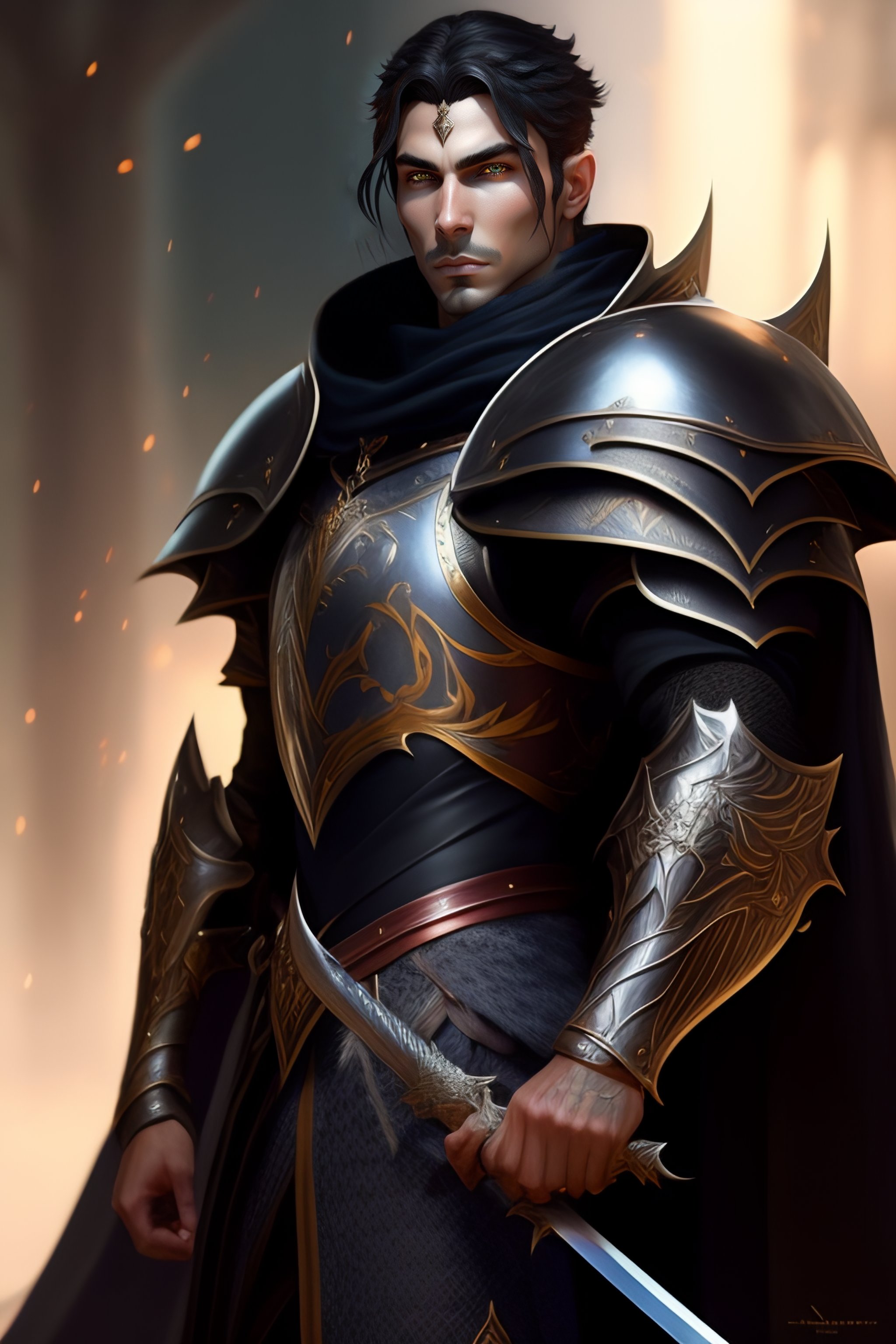 Male elf paladin in black armor holding sword, posing for a fight intricate, elegant, highly detailed, digital painting, artstation, concept art, smooth, sharp focus, illustration, art by artgerm and greg rutkowski and alphonse mucha, 8 k