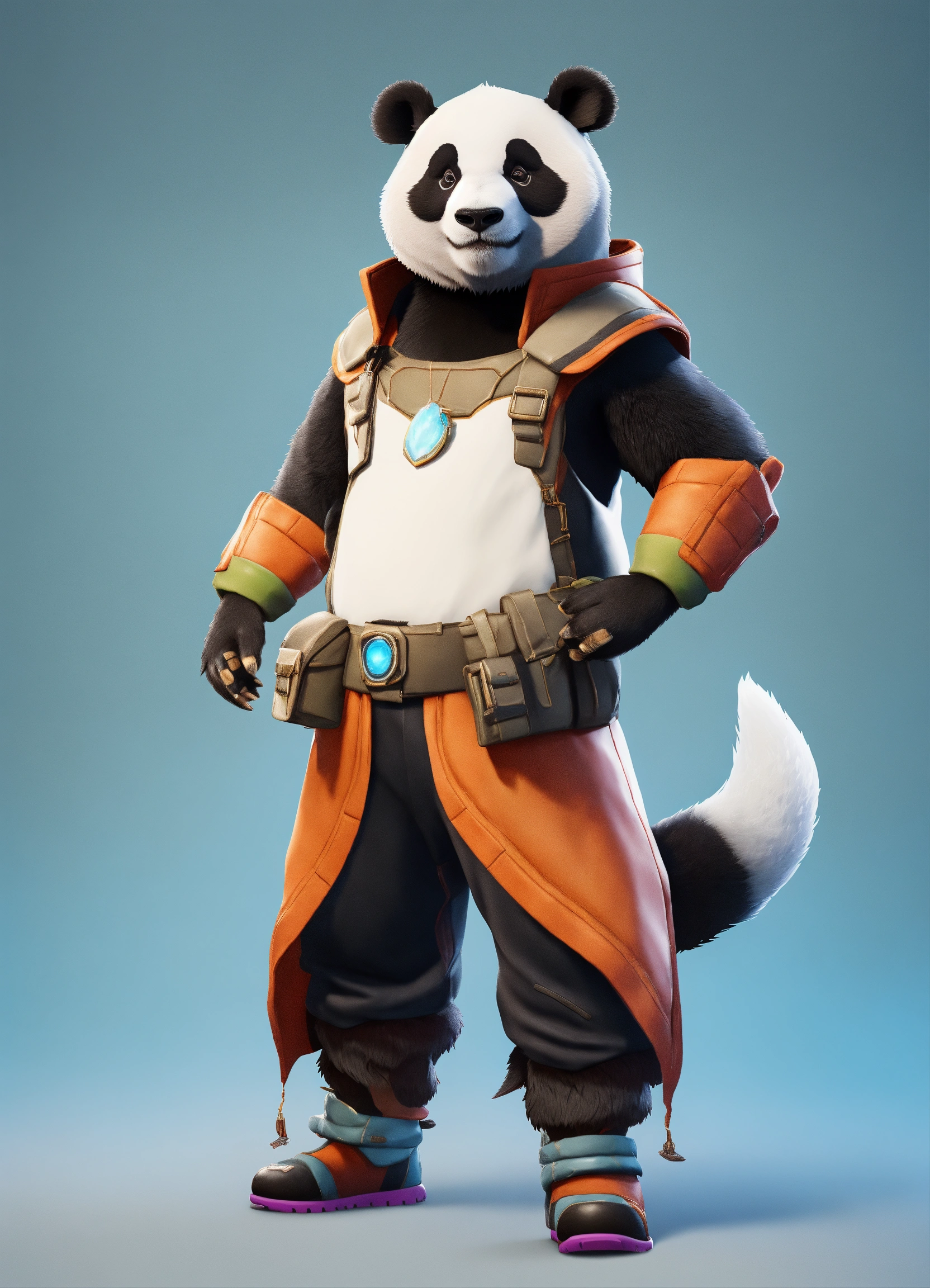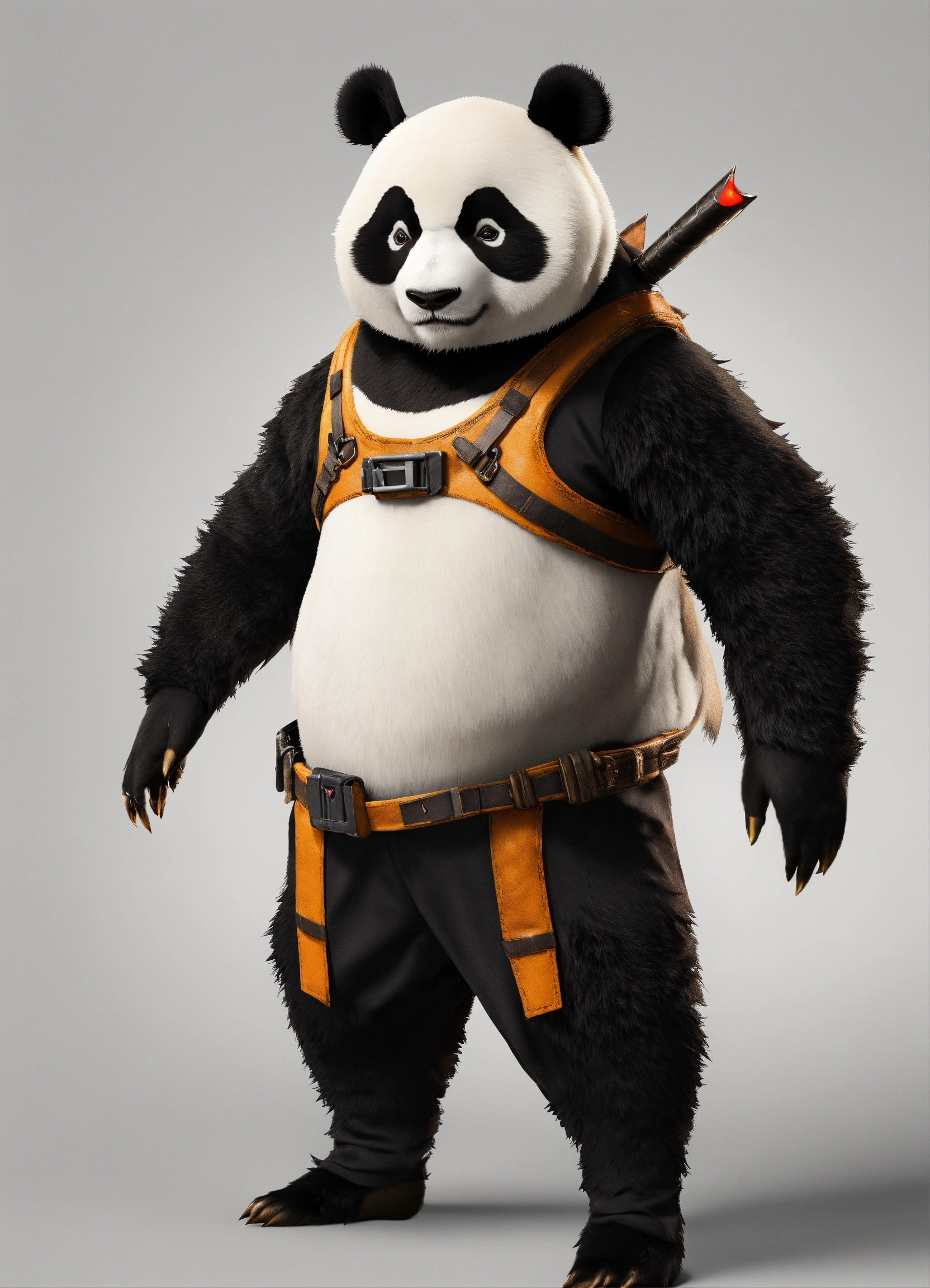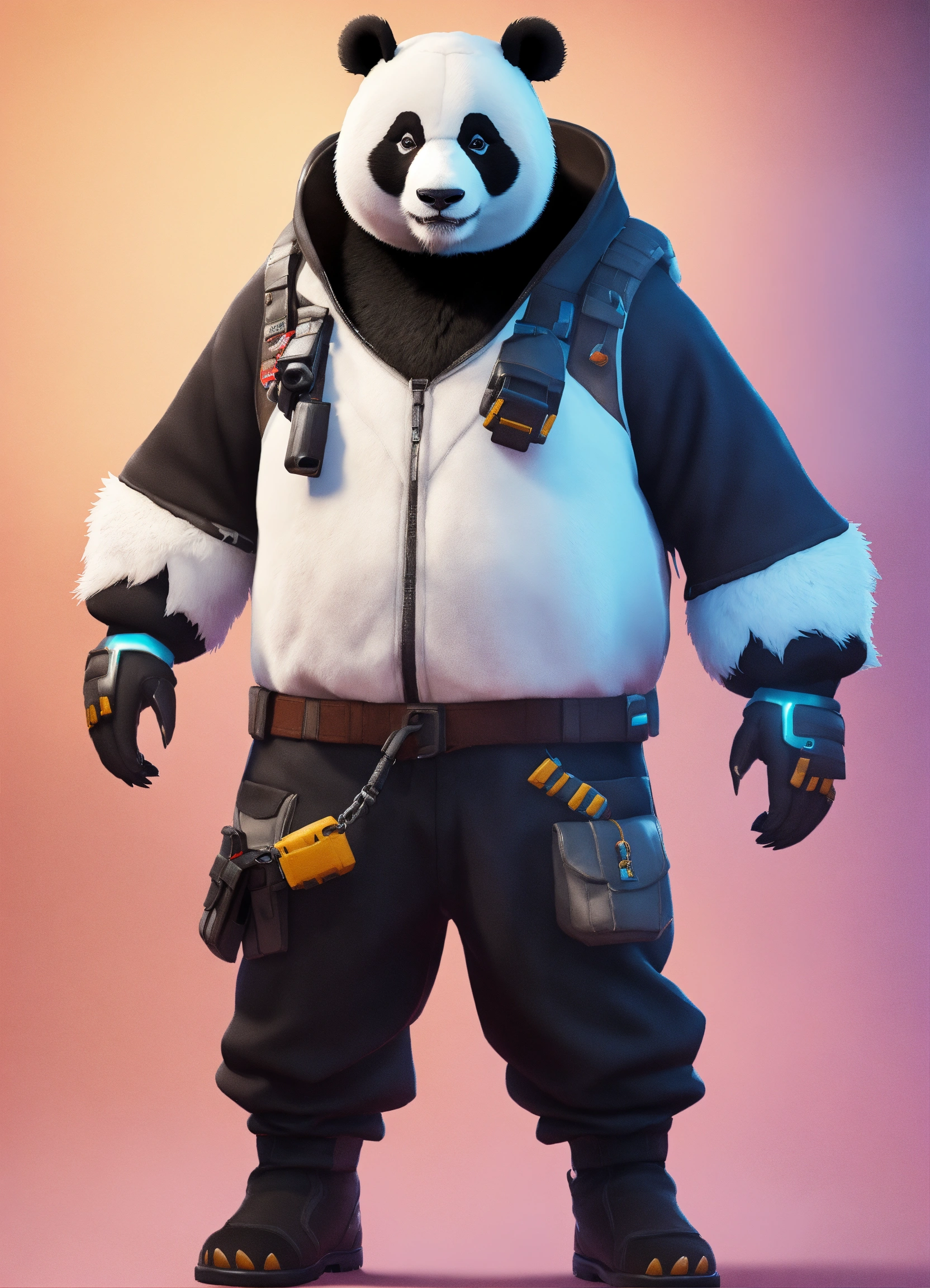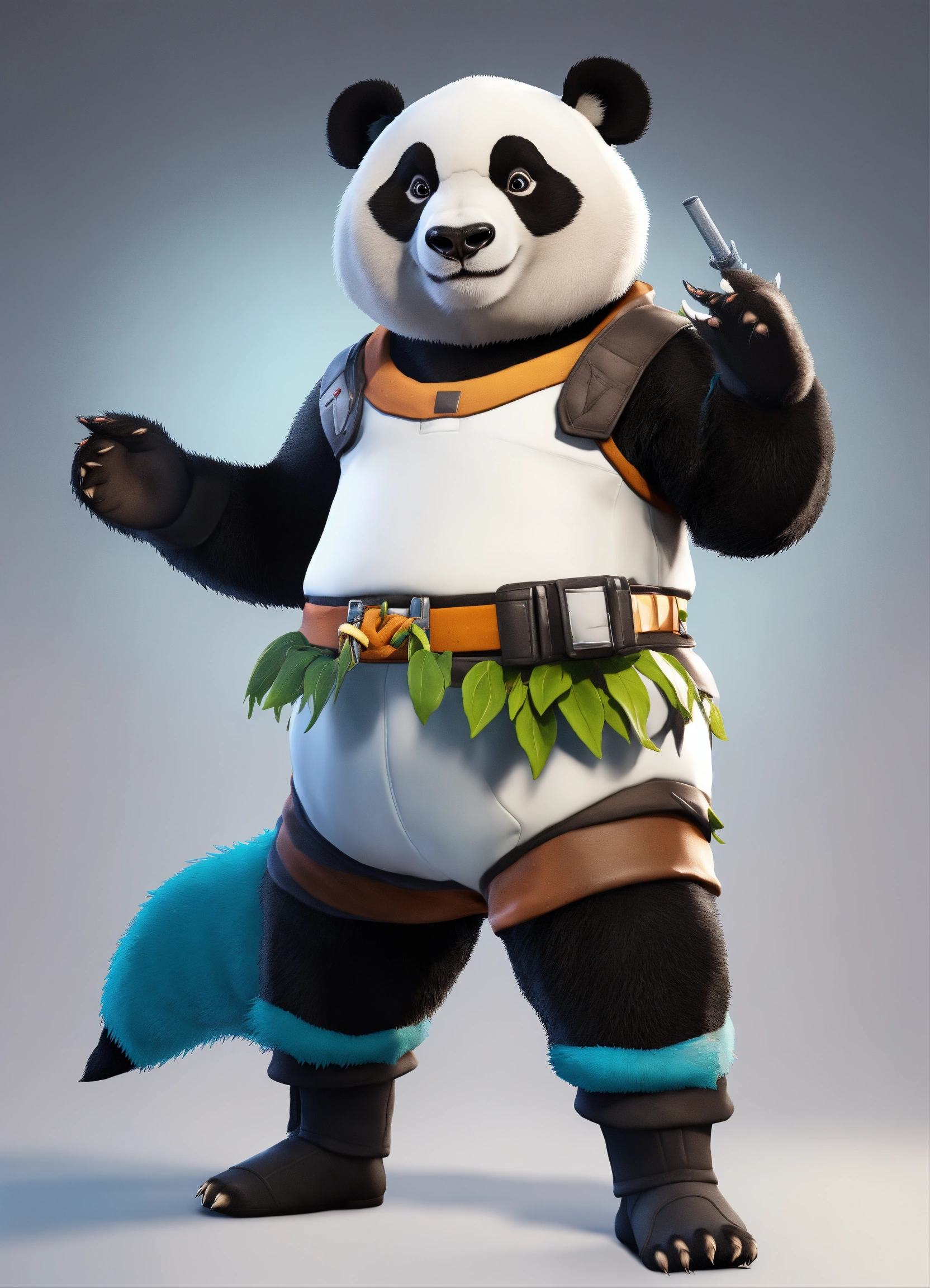 A photograph of a costume of a panda for a male character with fortnite style, male costume, white background, turnaround, claws, tail, full body