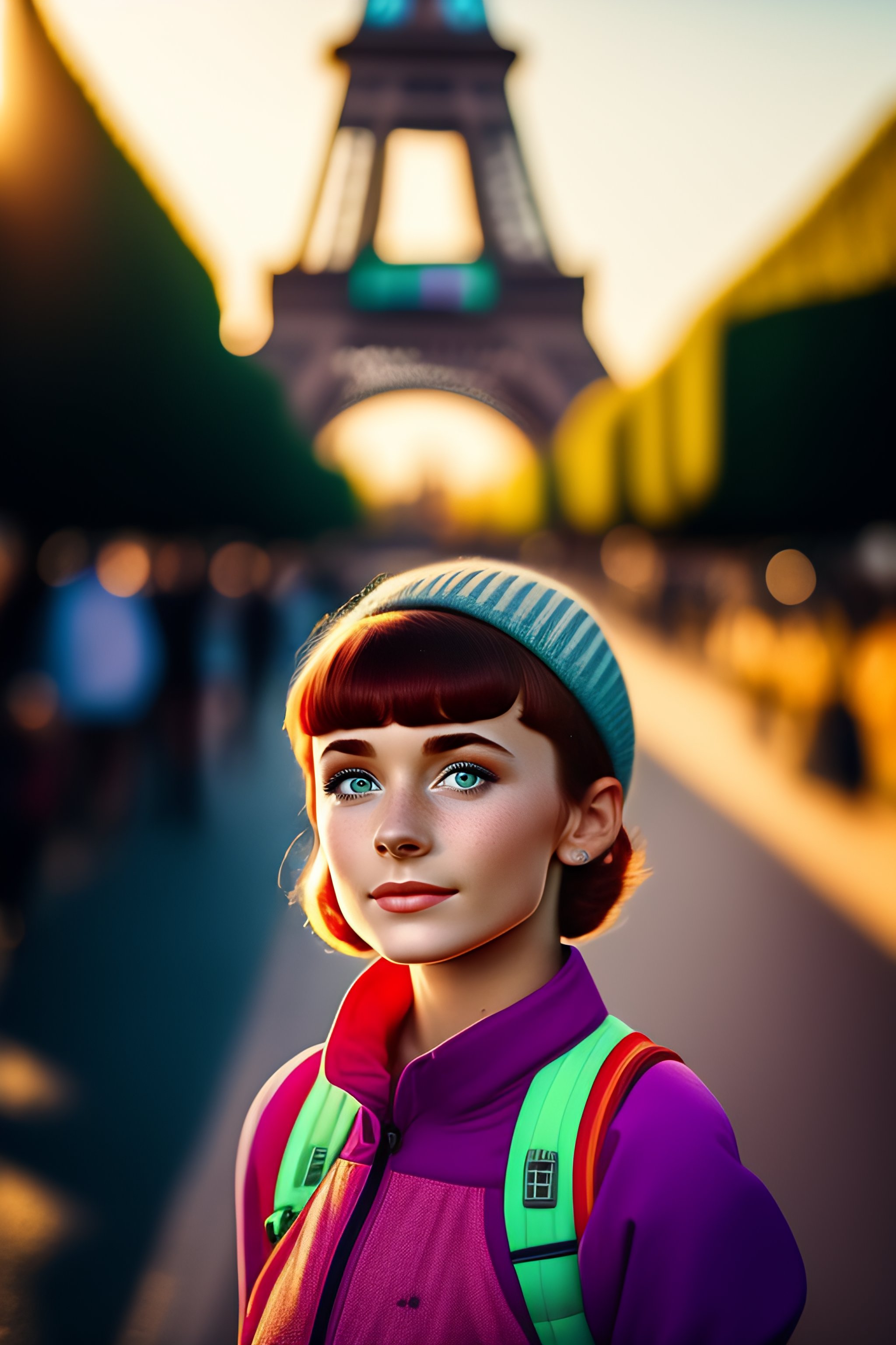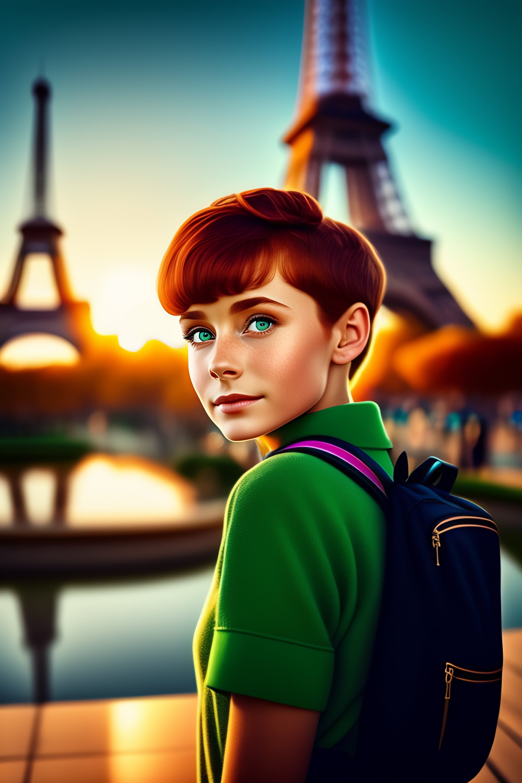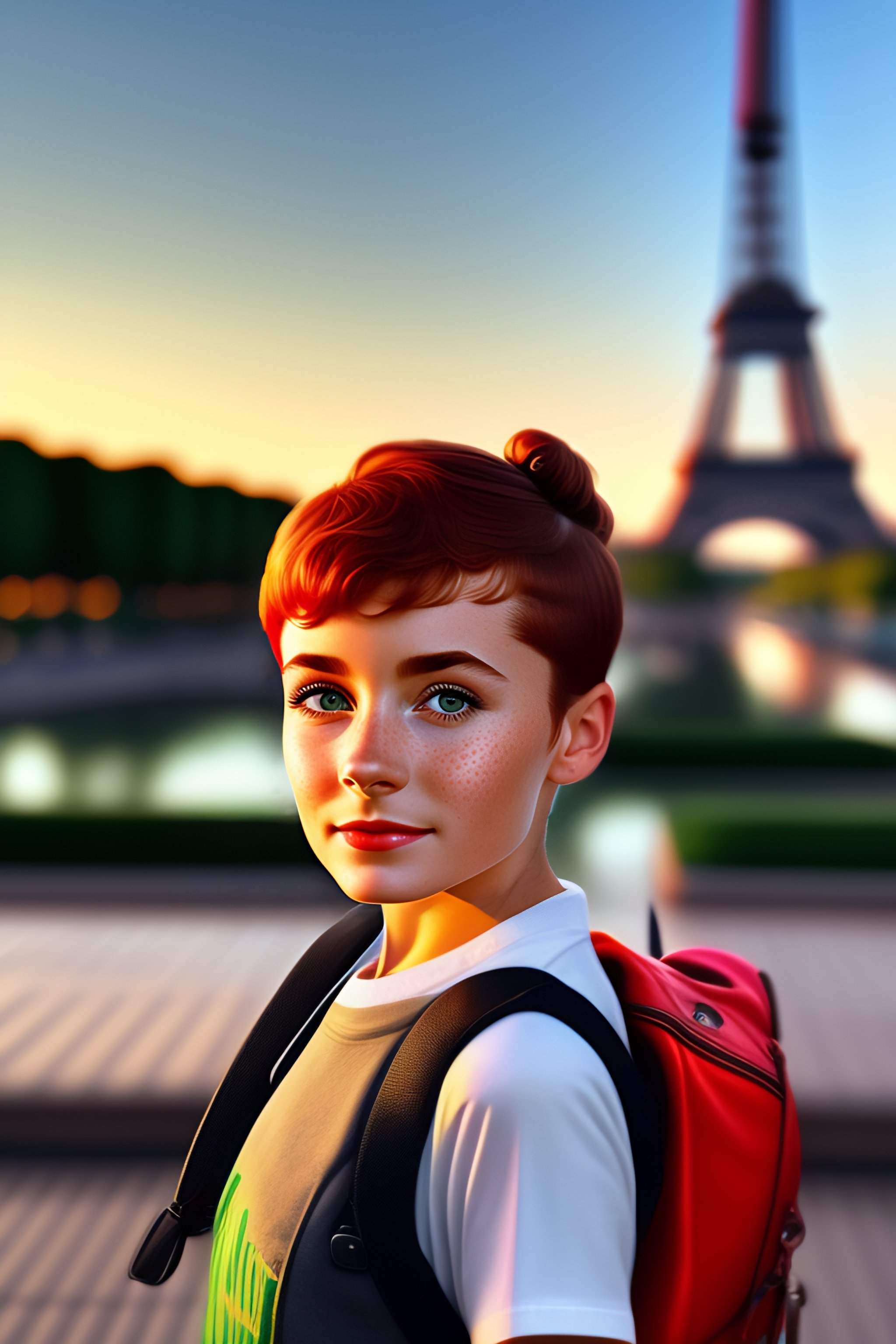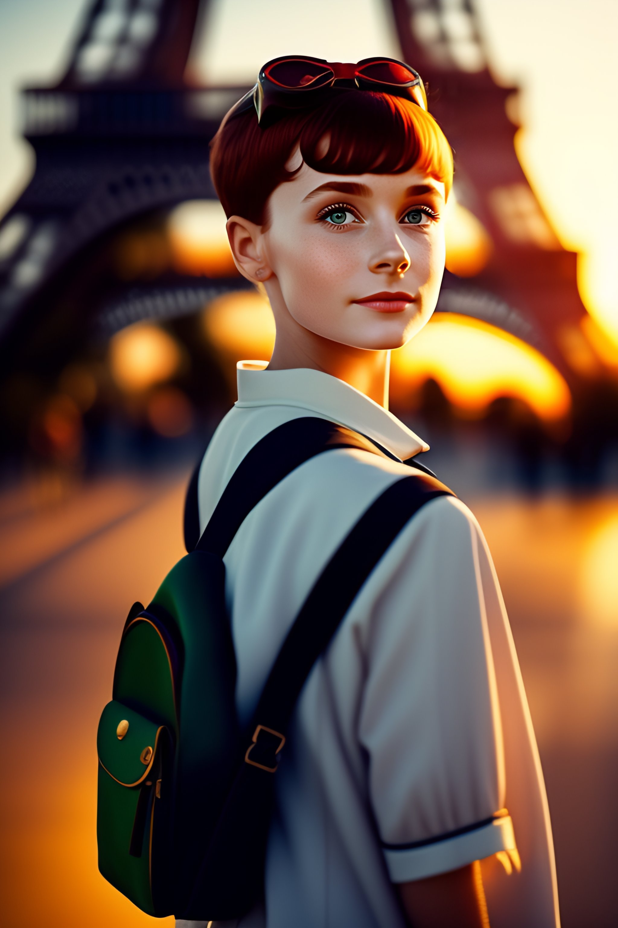 12 years old girl walking by the eiffel tower, audrey hepburn, cute, green eyes, red hairs, short hair, some freckles, mole on the left chick, fine nose, small ears, blue hair clip, leather backpack, detailed, golden hour, looking at the camera