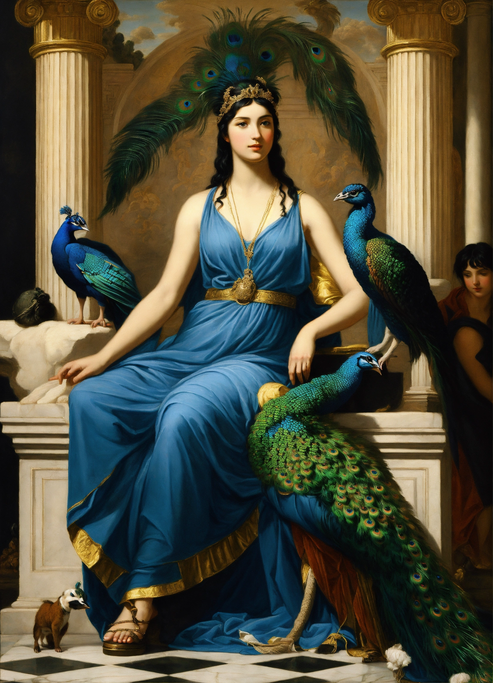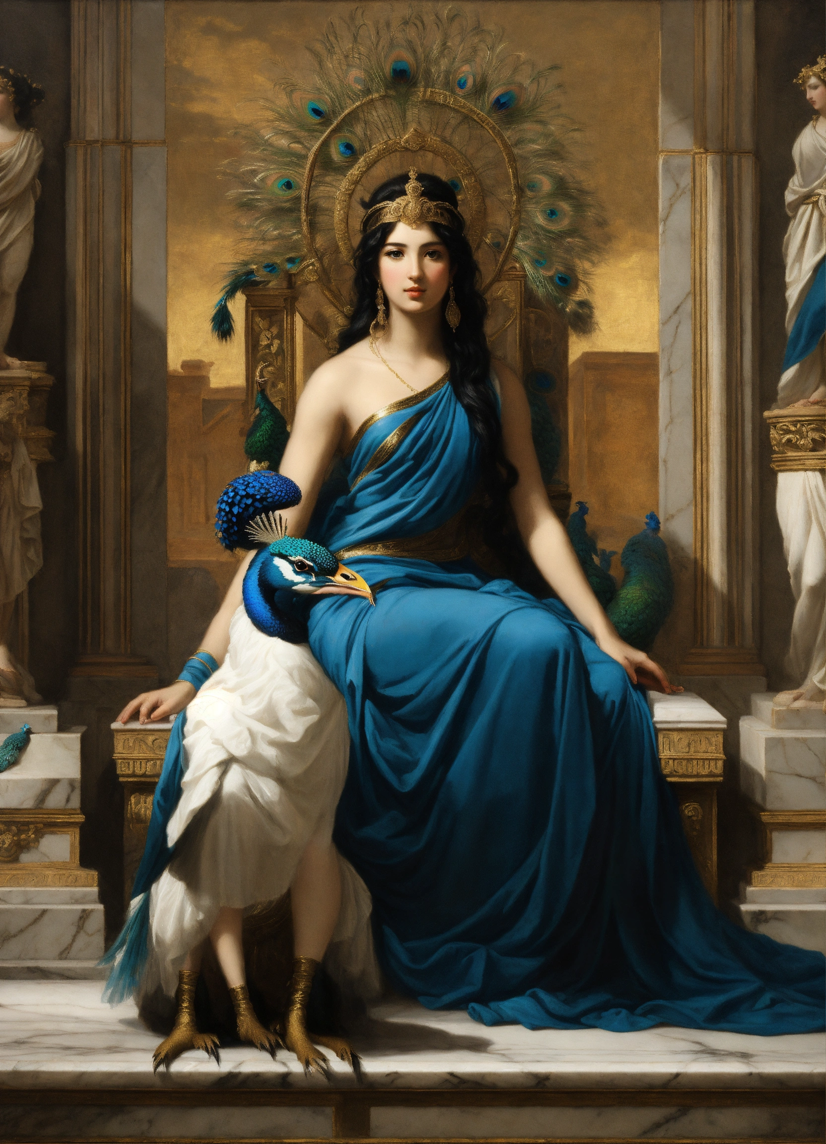 Neoclassical art. neoclassical painting. full body. greek goddess hera sitting on her marble throne with her pet peacock, with dark long black hair and blue toga dress.