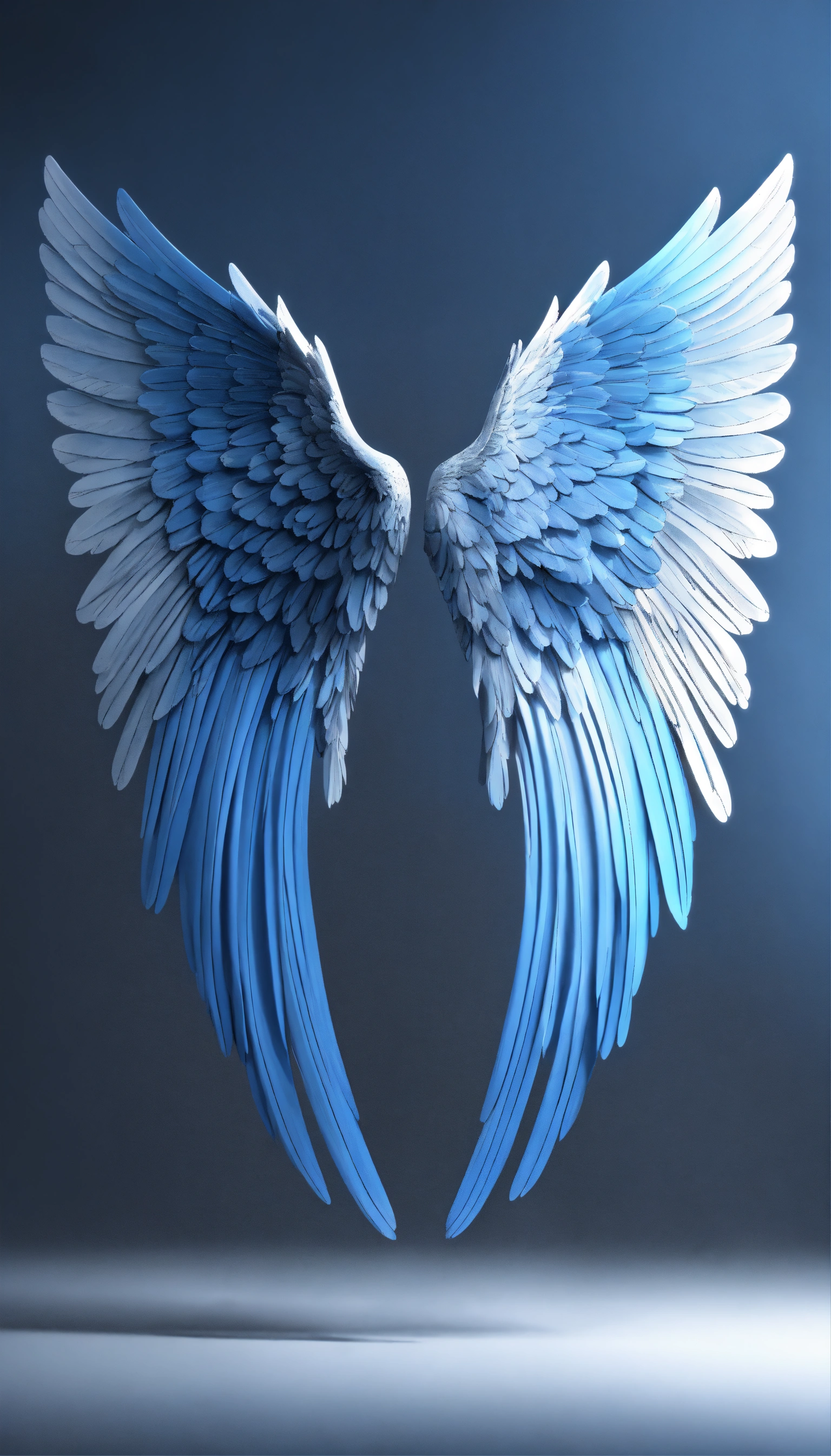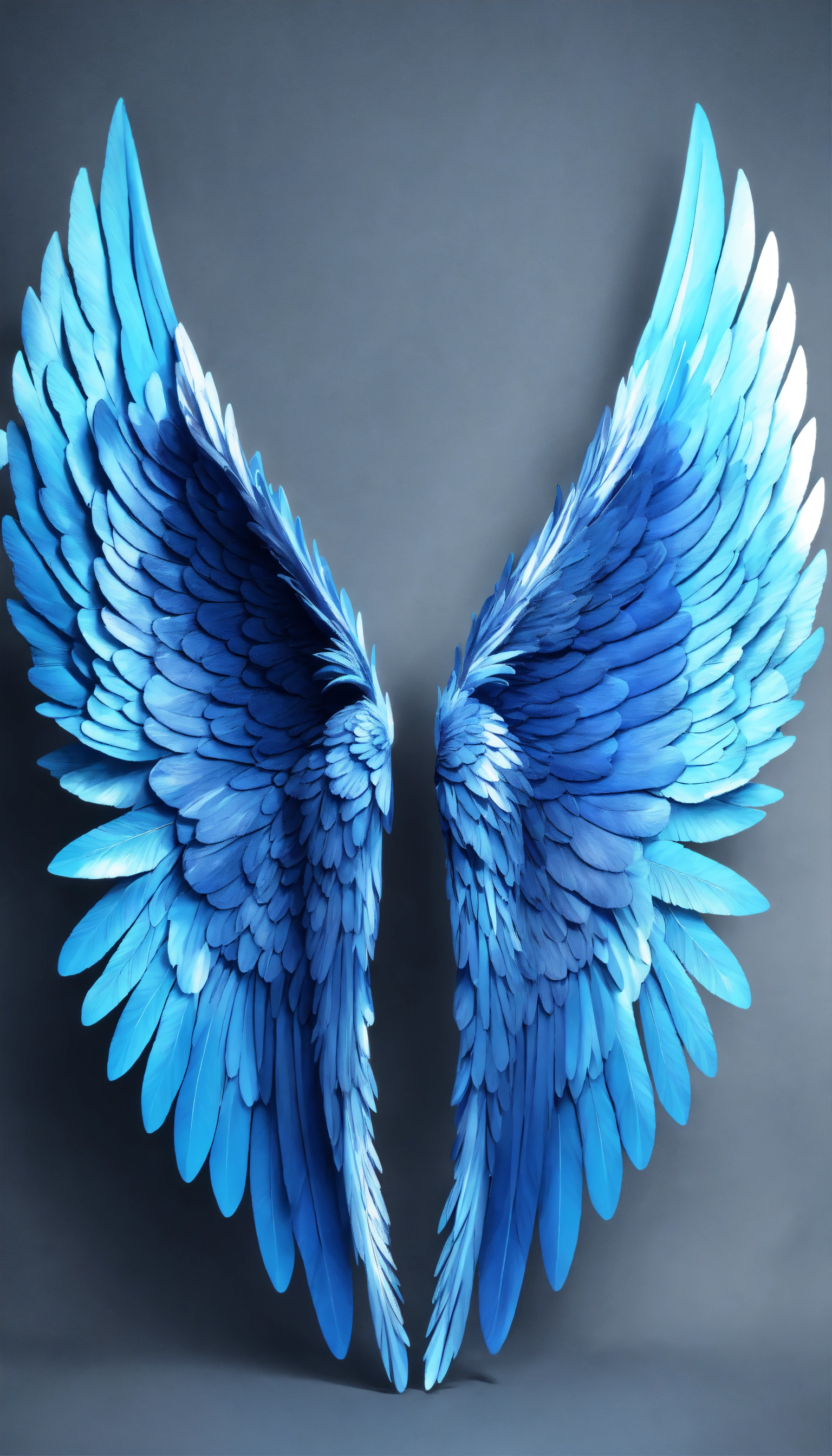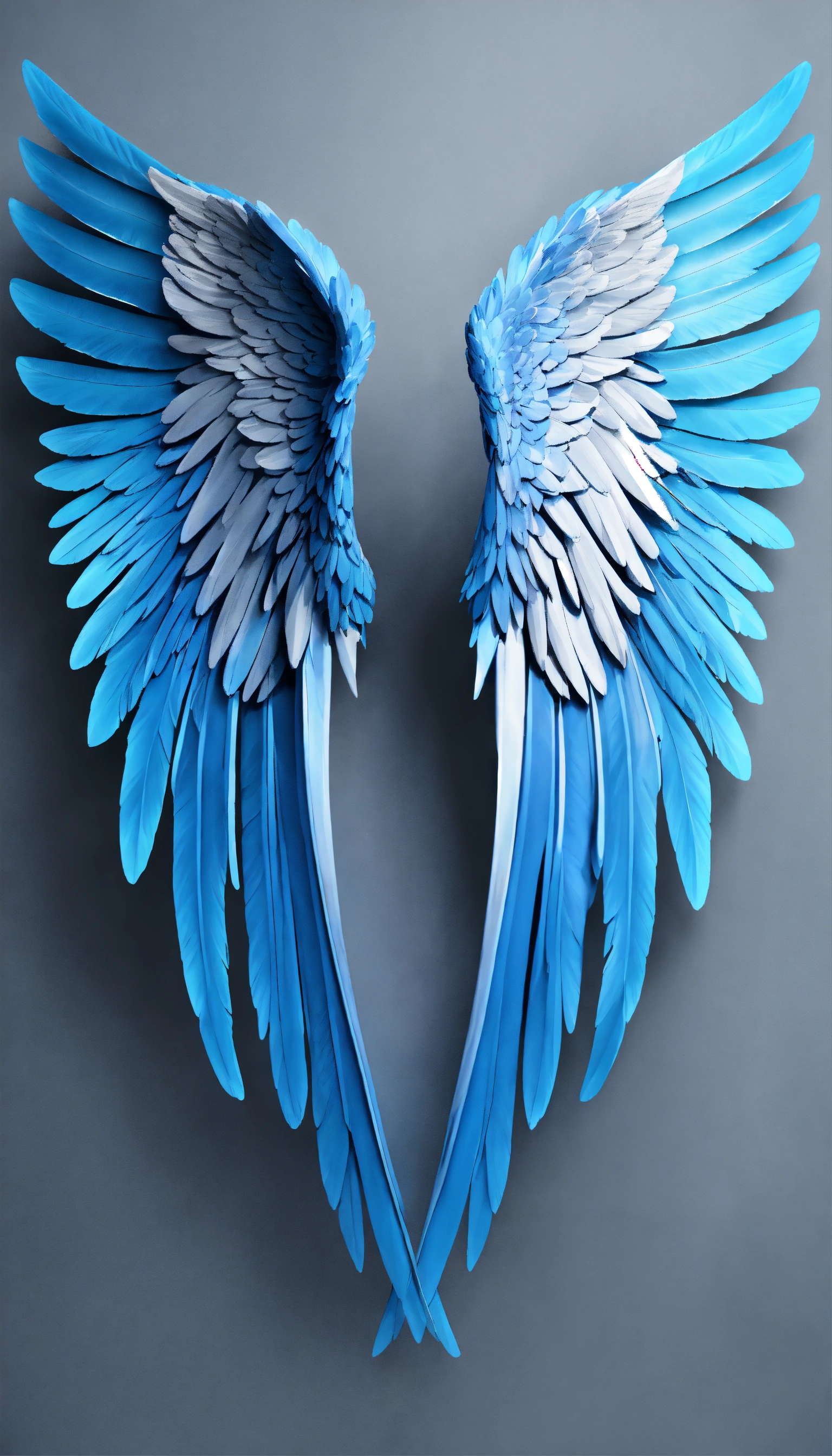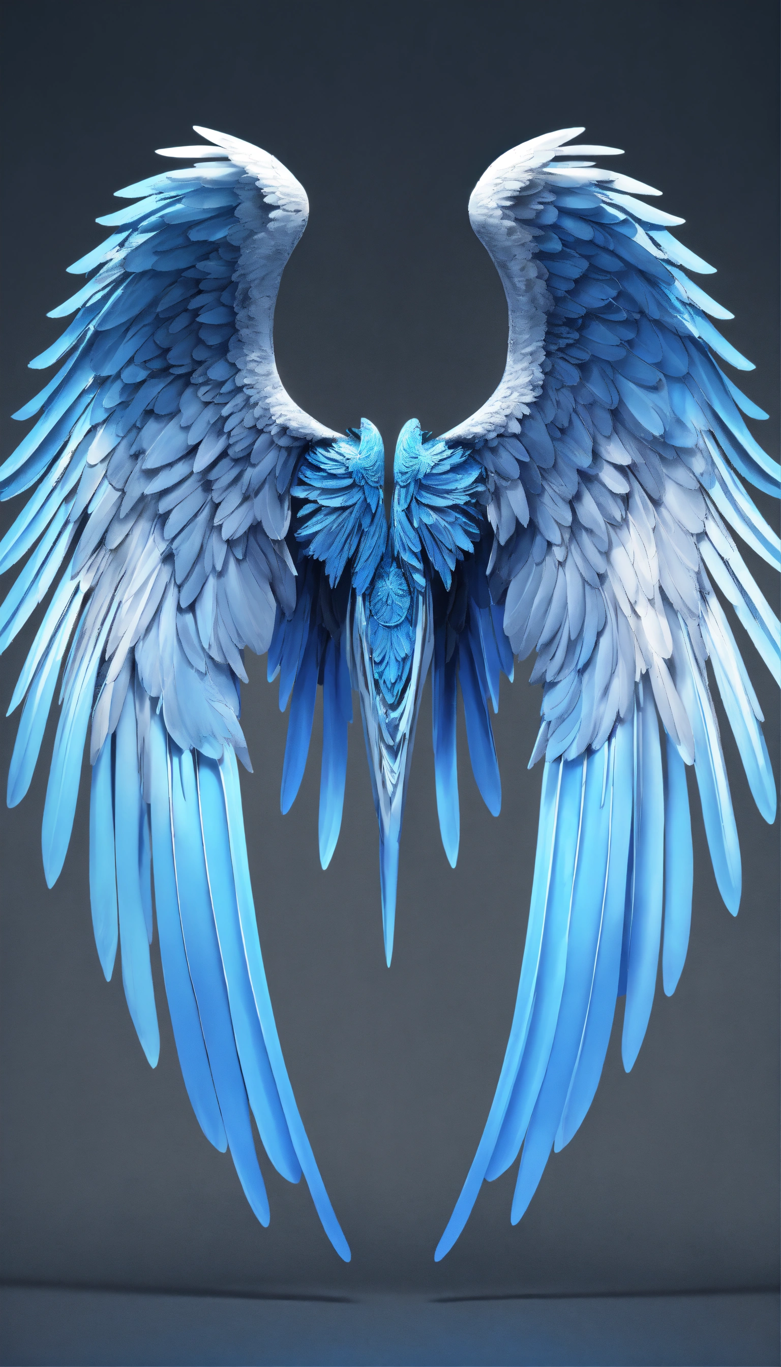 Beautiful and perfect angel wings of strong blue and light blue color with minimalistic decoration in shades of blue and silver. just a pair of big, full blue gradient color wings. wings with a defined late color. wings complete both the right wing and the left wing, 3d, masterpiece. hd. realism. high resolution. high quality. digital art. 8k