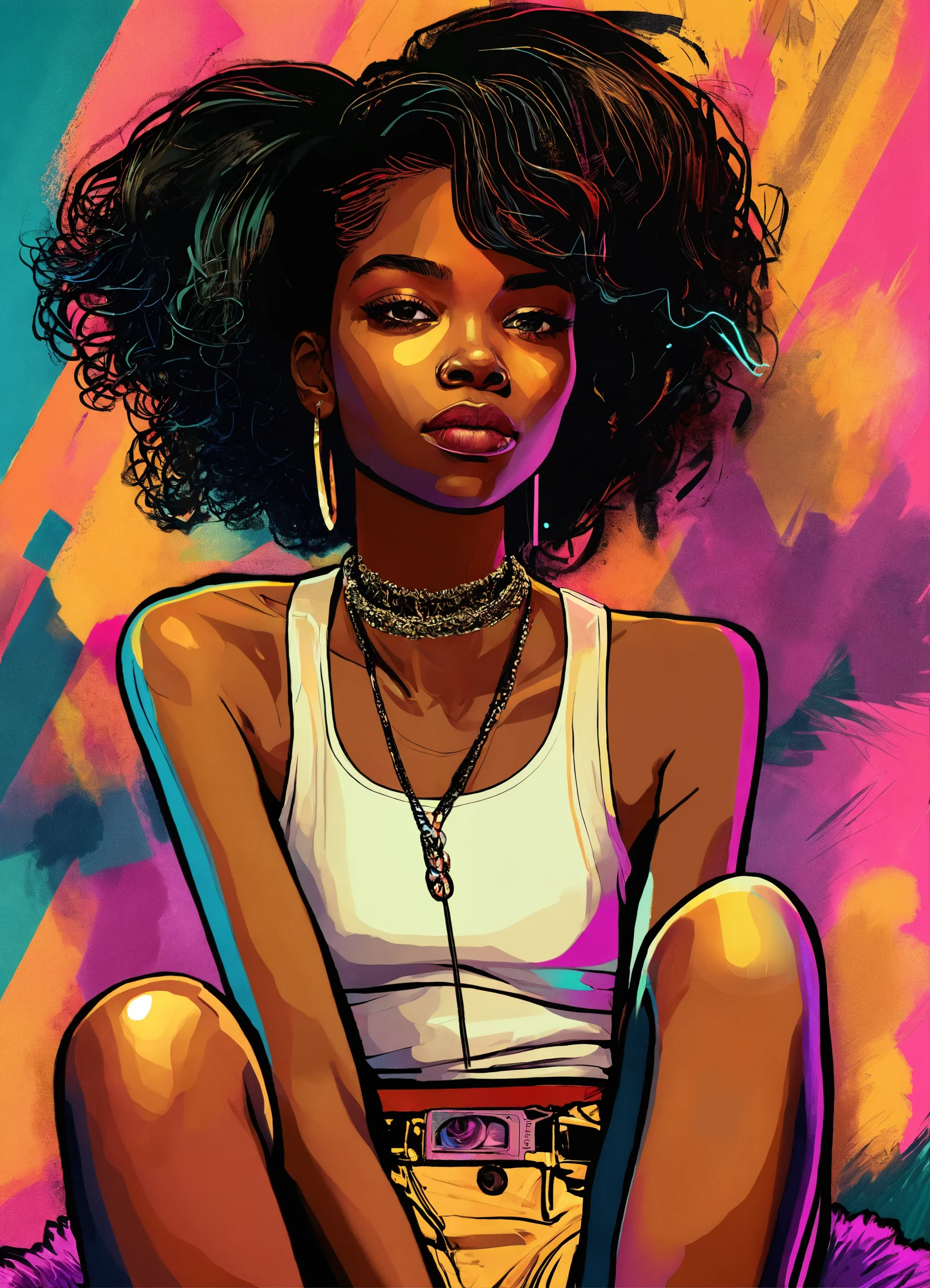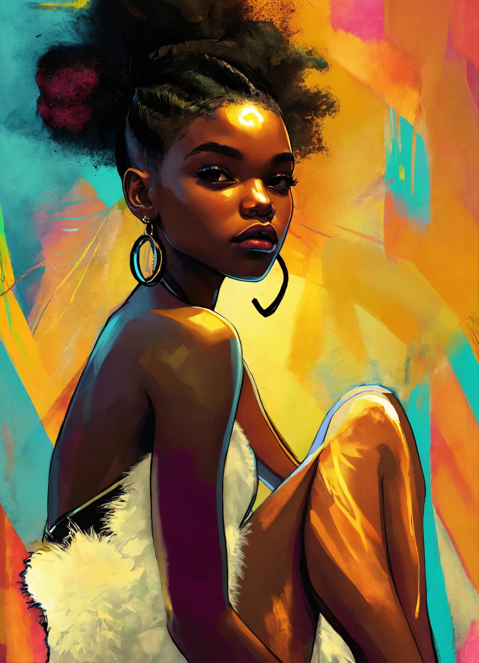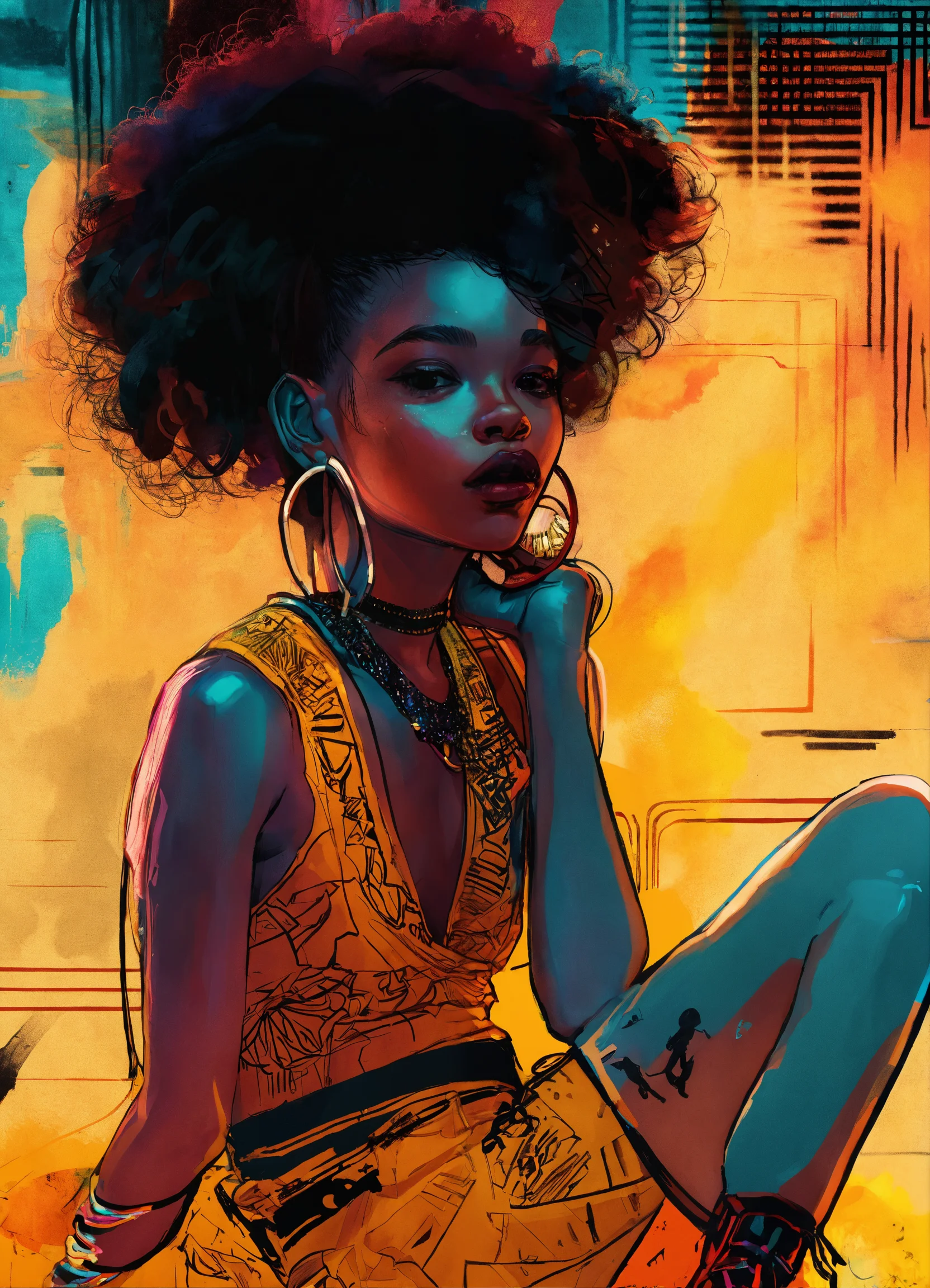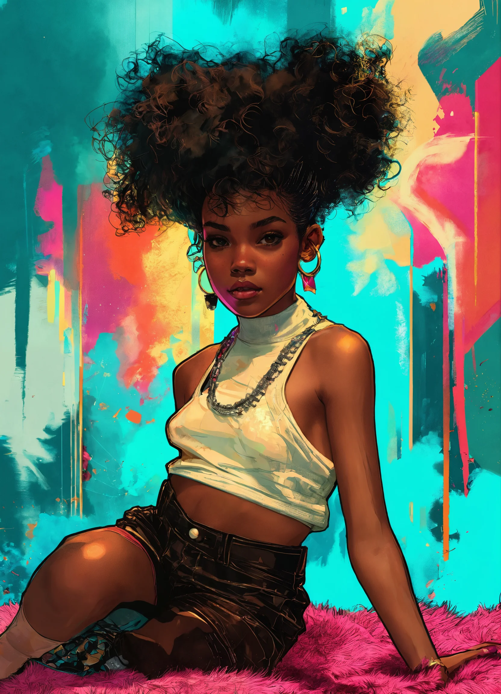 Create a vibrant and dynamic digital drawing of a young black female character on a fluffy carpet. incorporate elements of art deco, punk & gritty, retro, surrealist, pop art, luminous & bioluminescent, neo-expressionist, and fashion & design. focus on epic composition, warm tones, and full body.