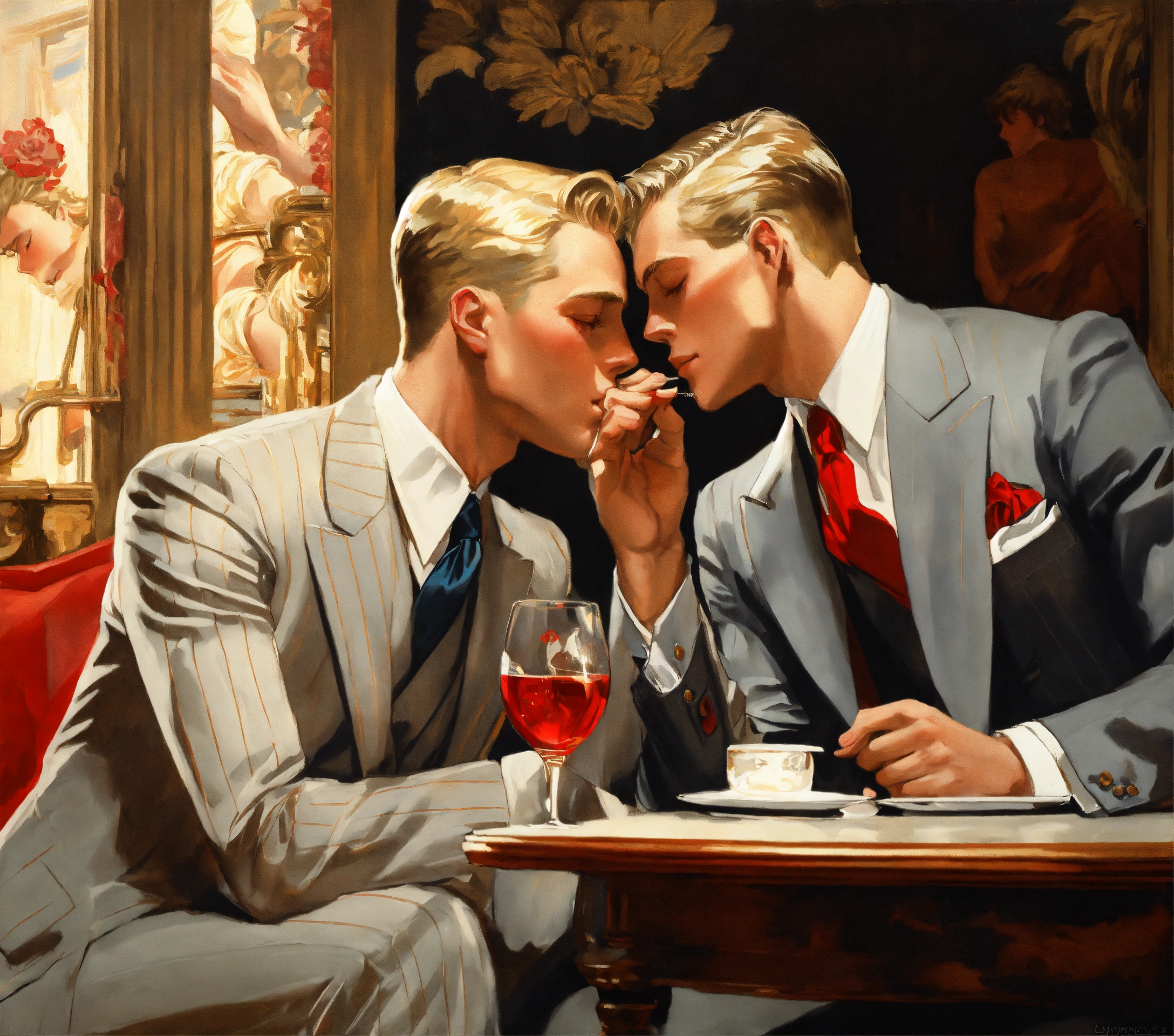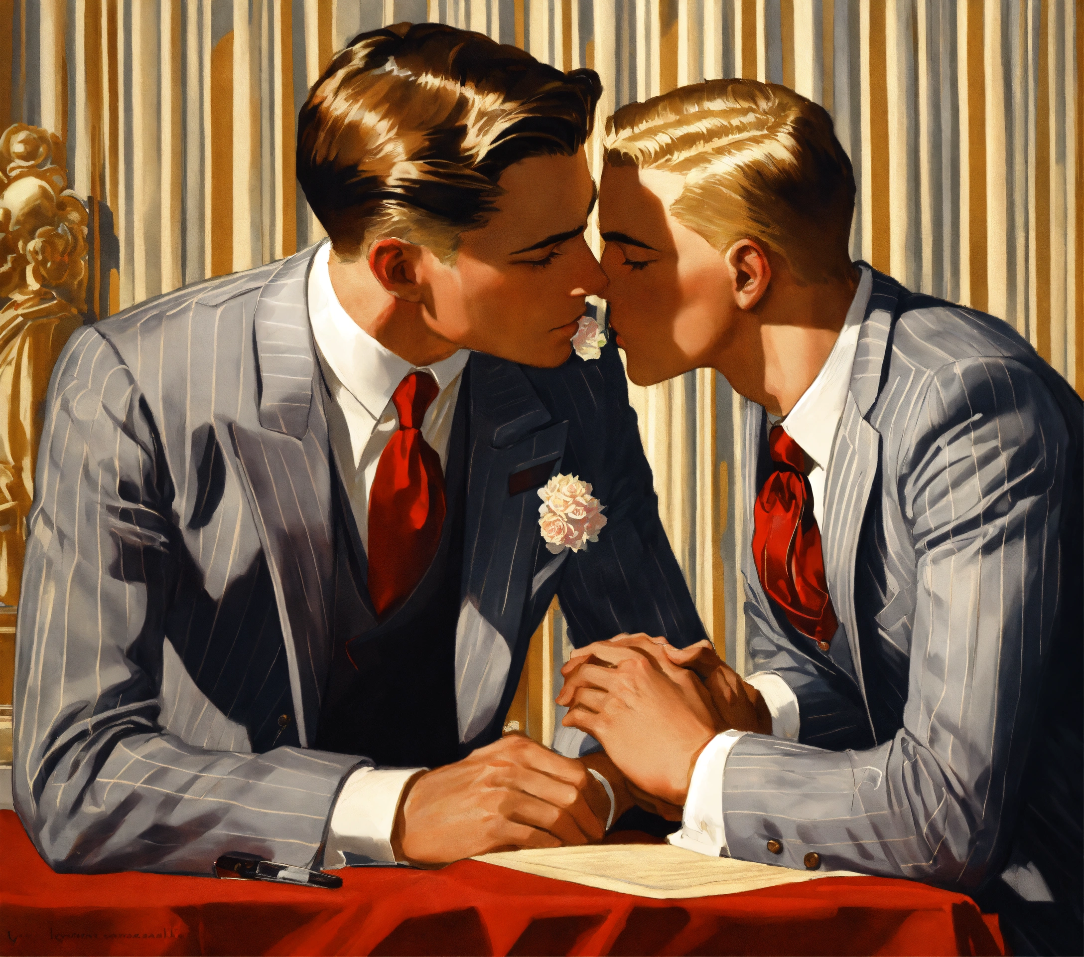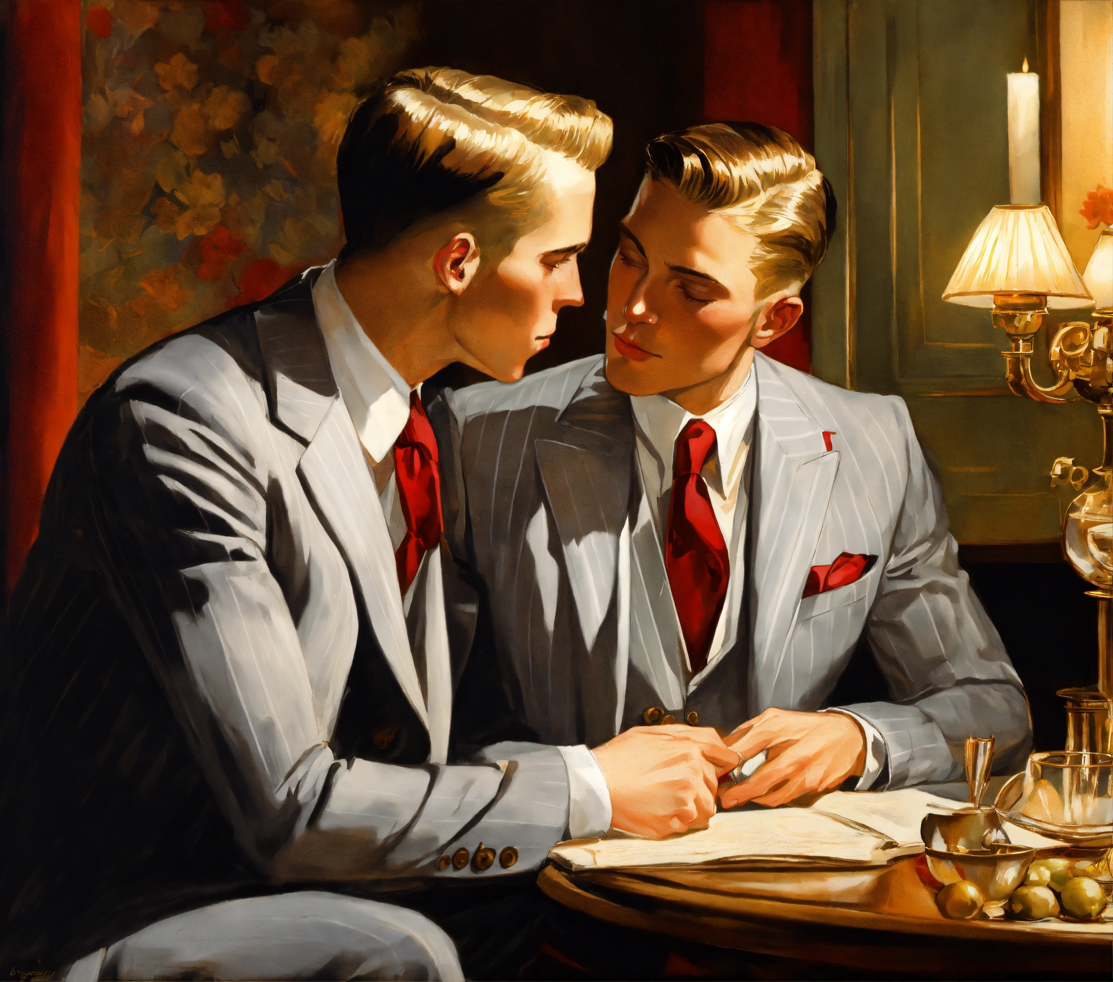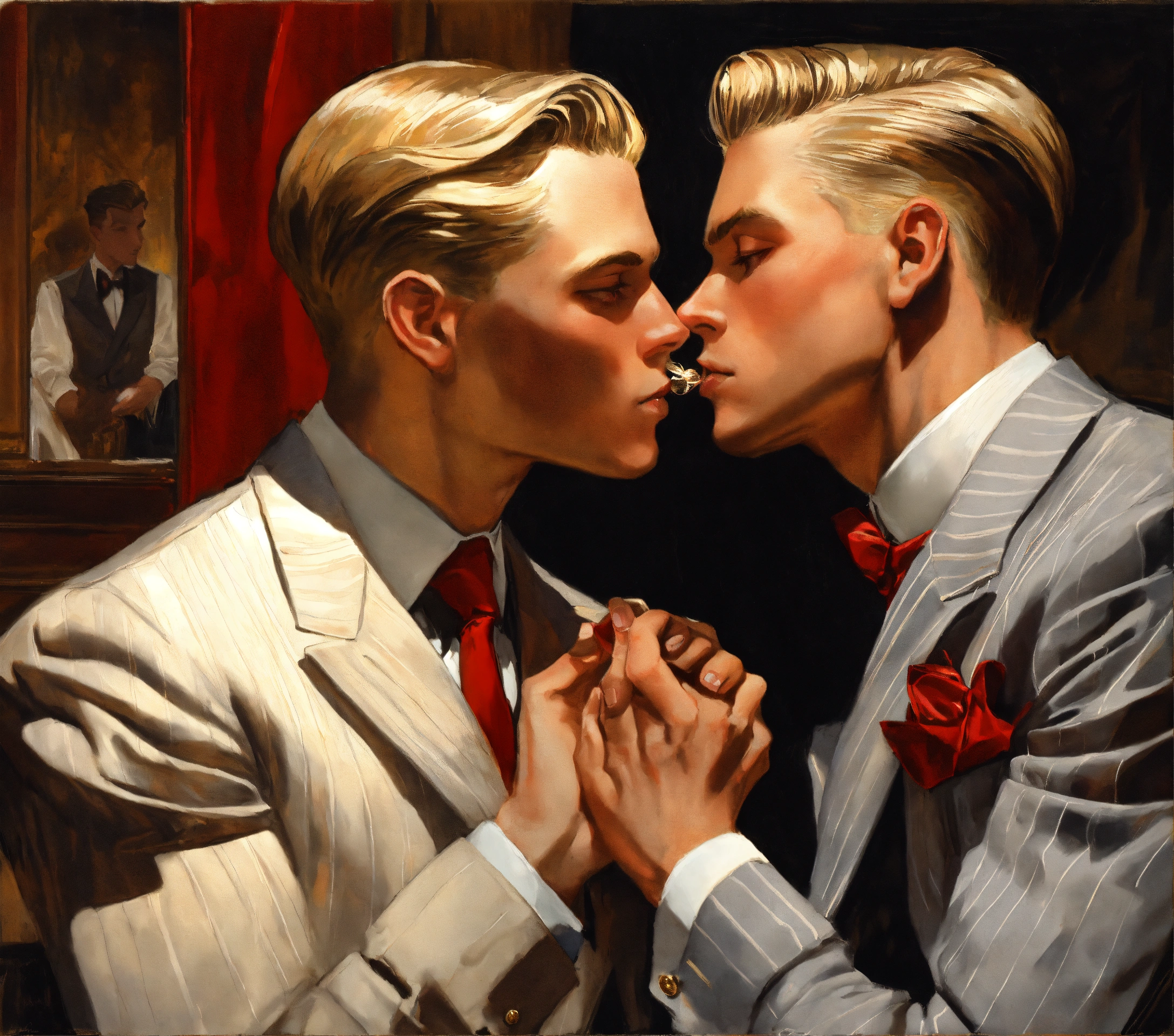 A blonde gentleman in light grey pinstripe vested suit, red tie, kissing the hand of his boyfriend, leyendecker style