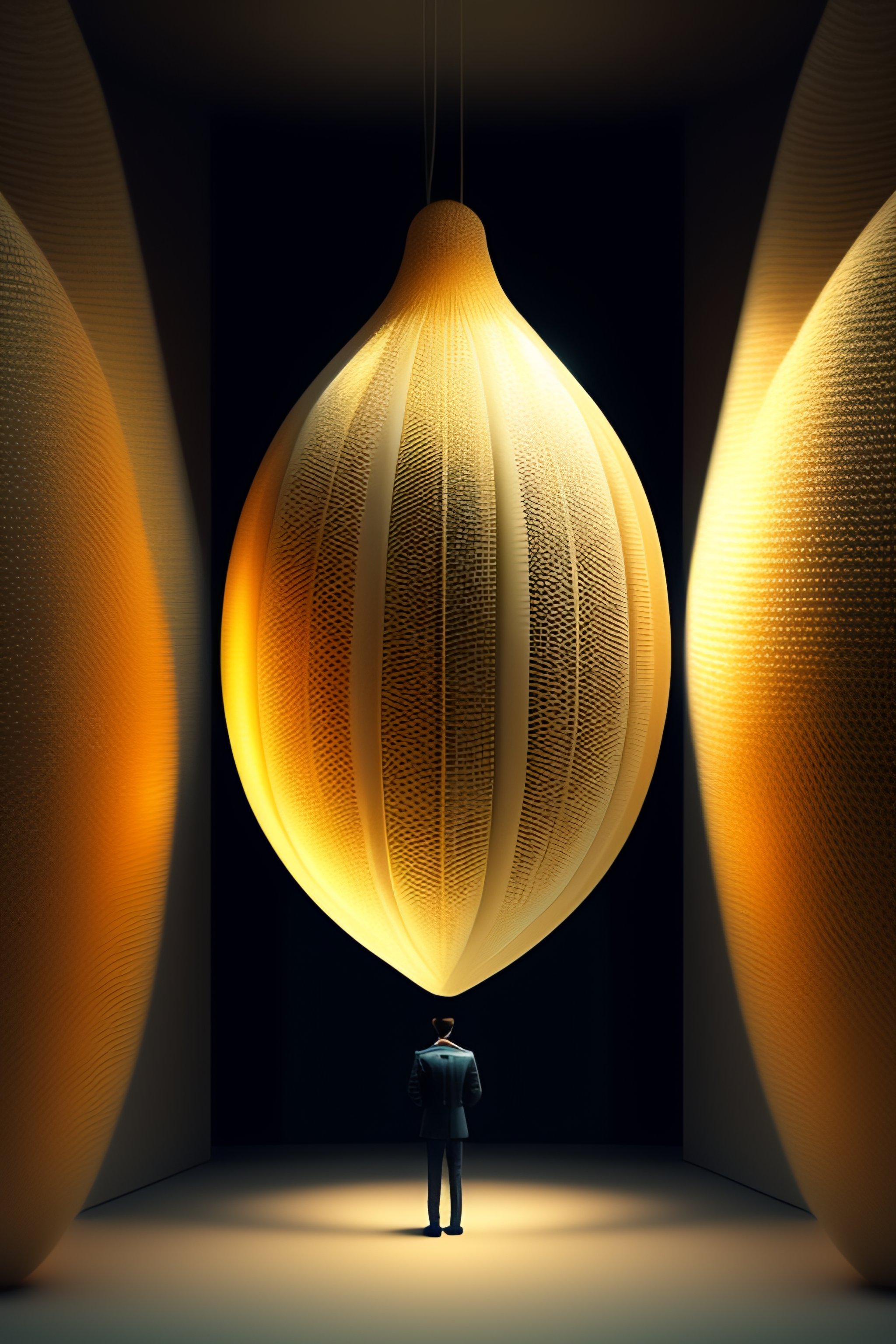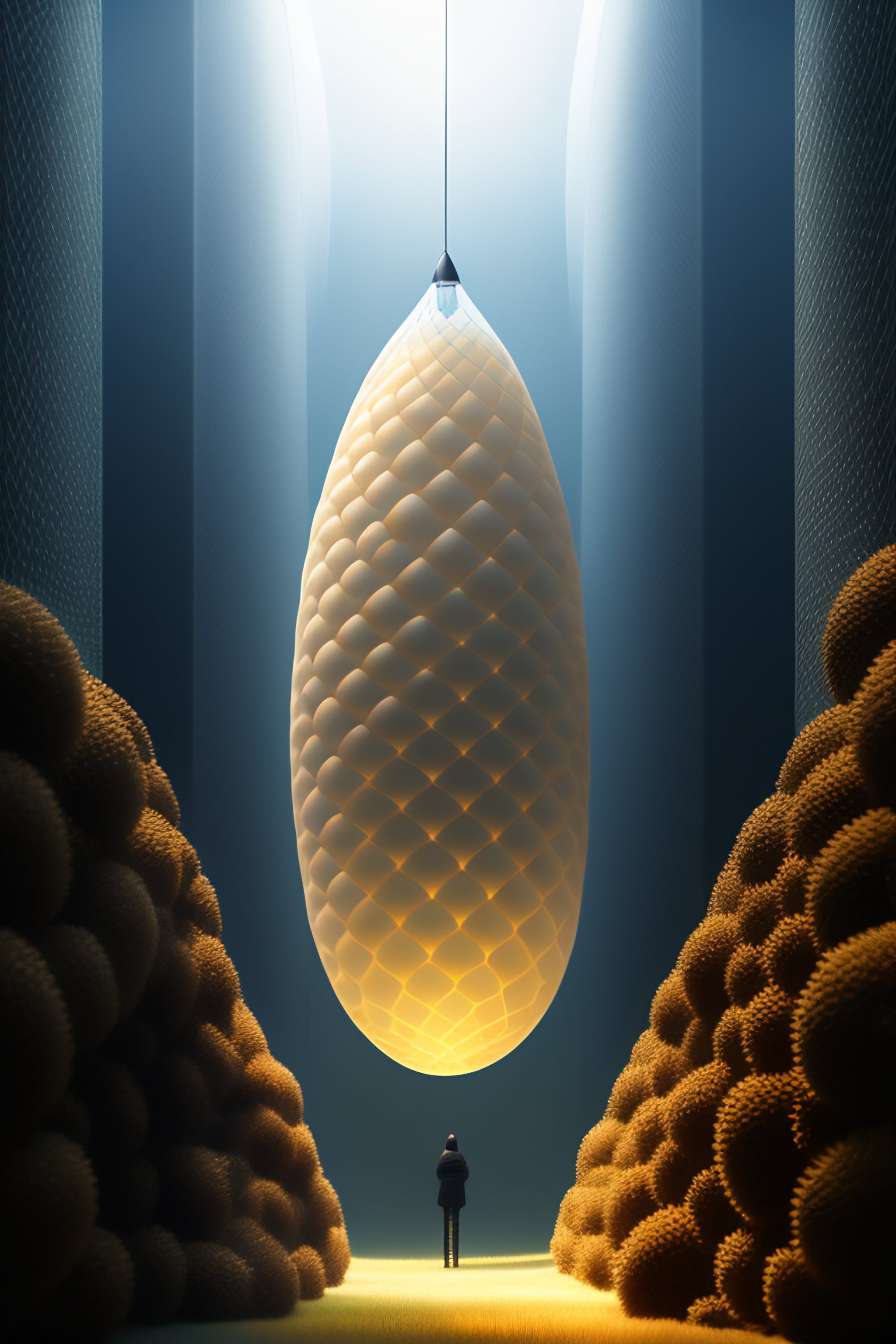 Many small cocoon matrix arrangement; the cocoon is fuzzy; a person standing in a cocoon; the environment is lifeless