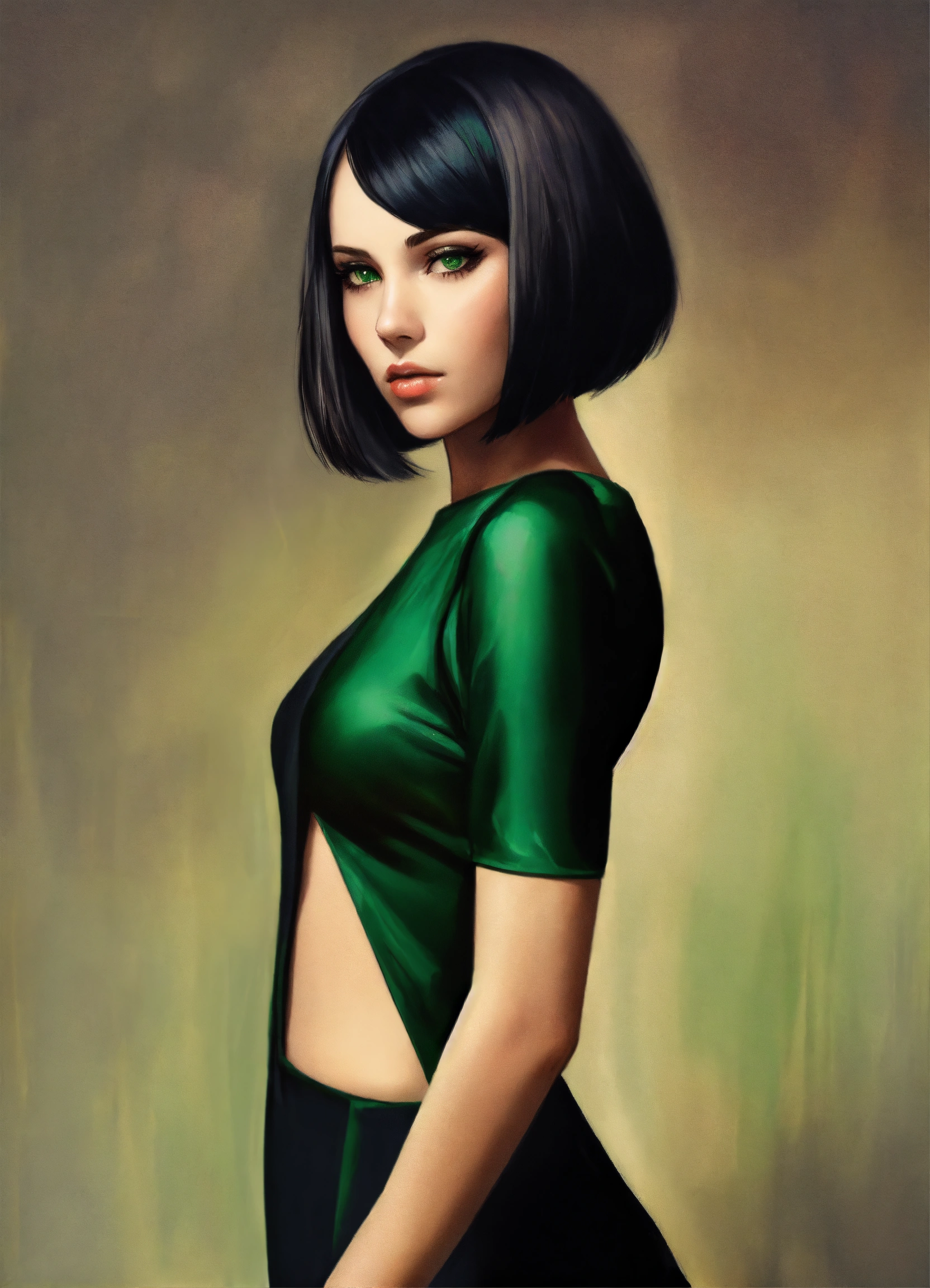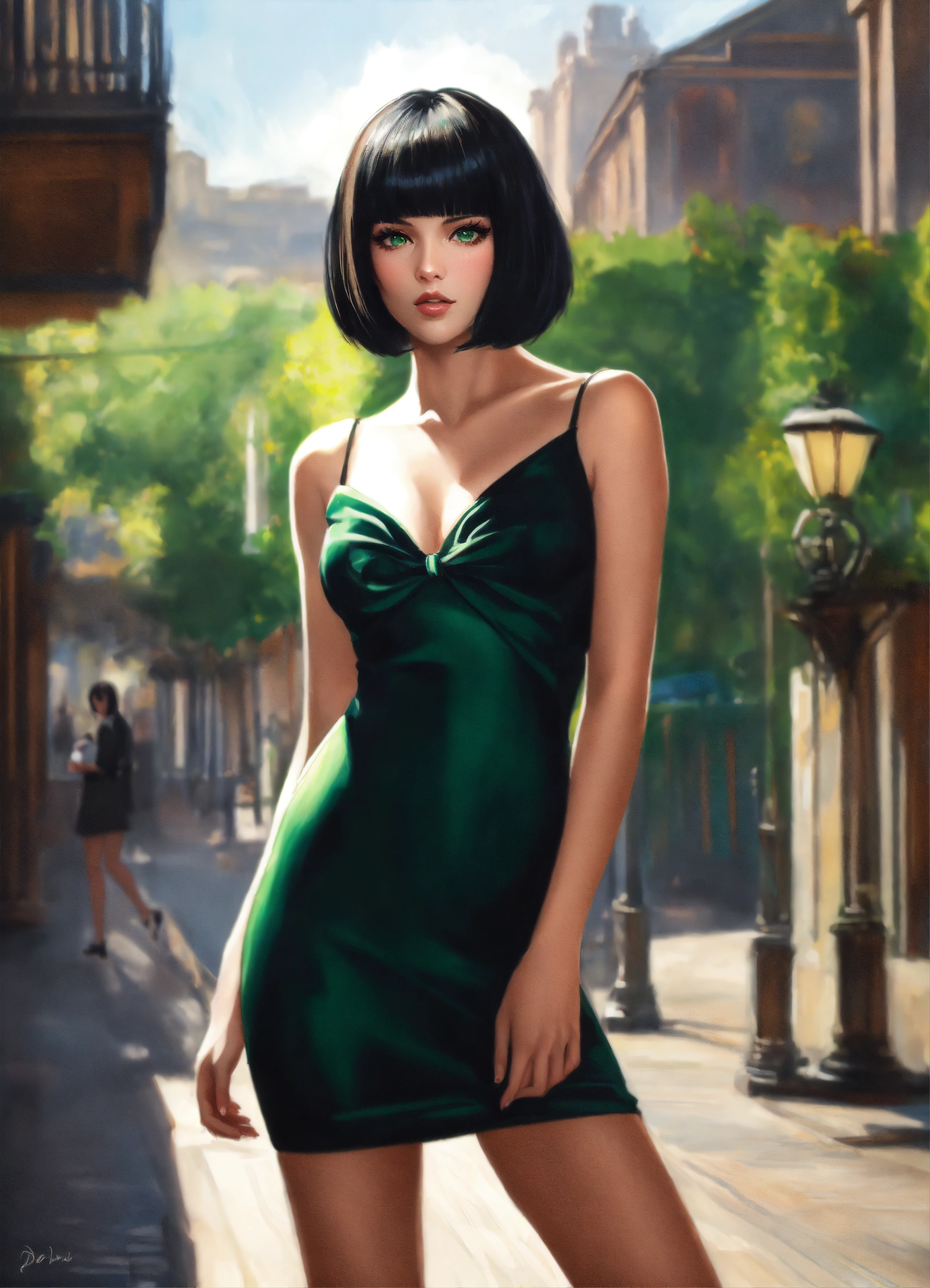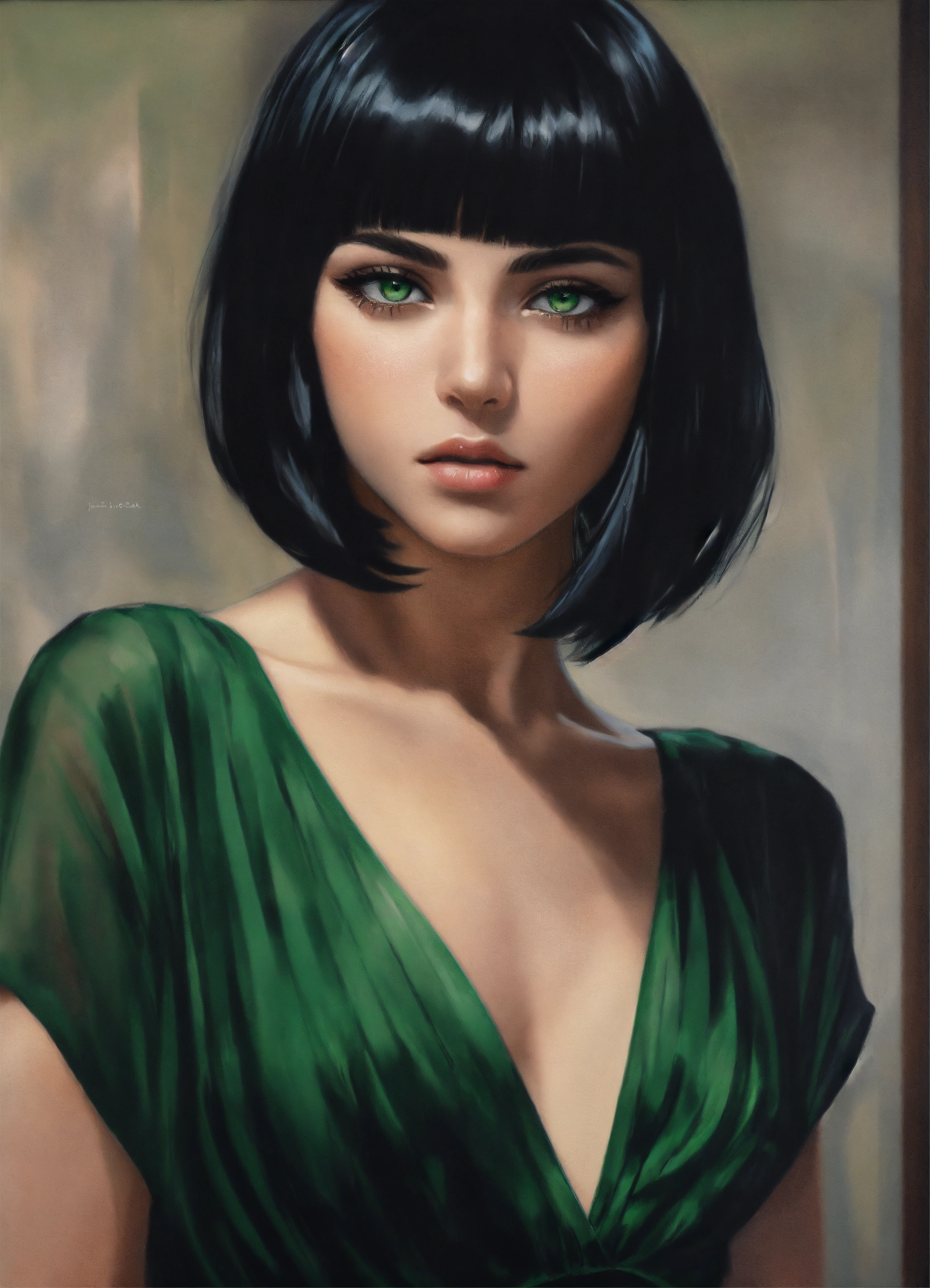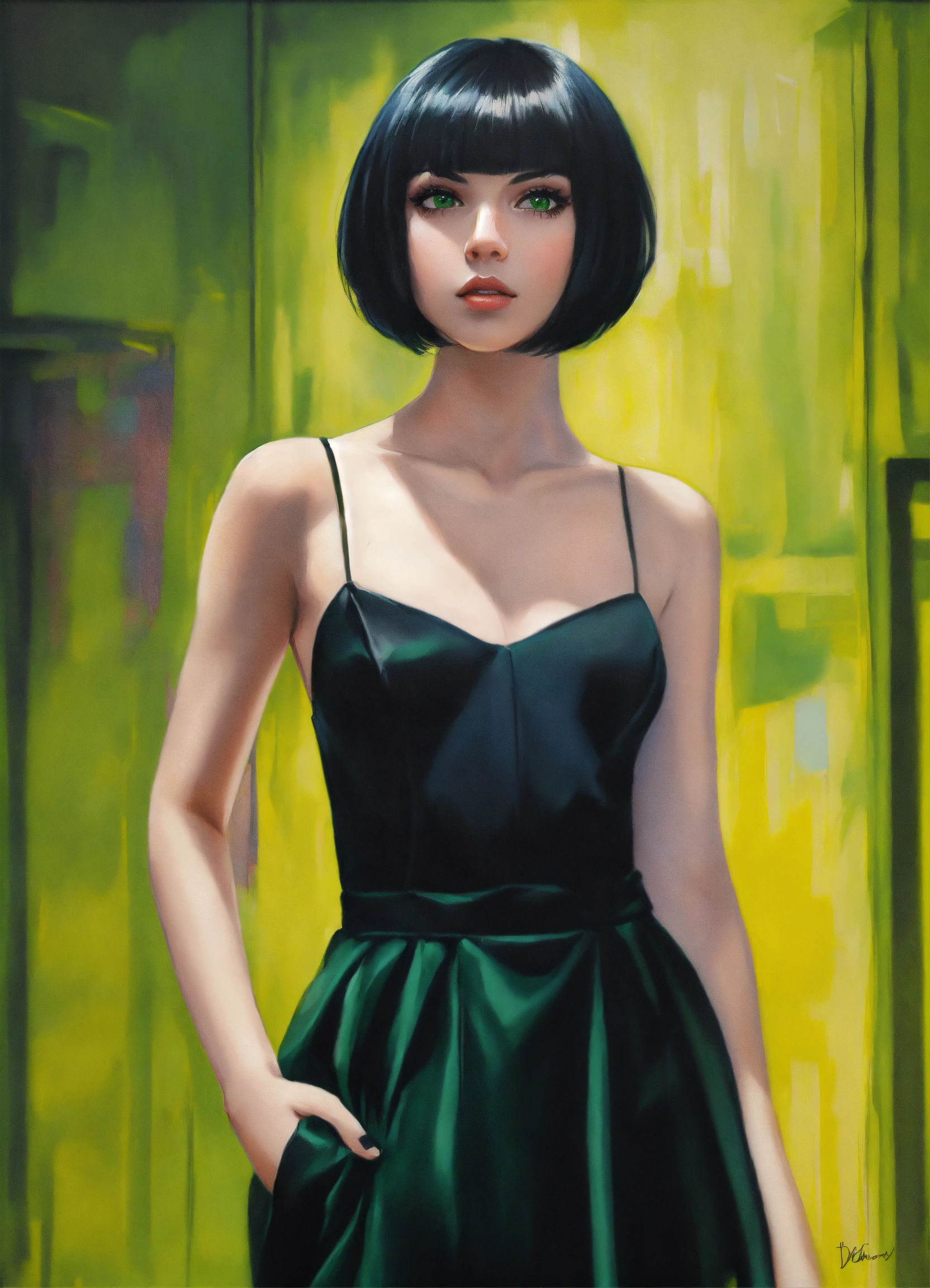 Photorealistic, drawing, a girl with a green eyes, deep black bob-wig hair wearing form-fitting short deep cut black dress, ballroom, full body